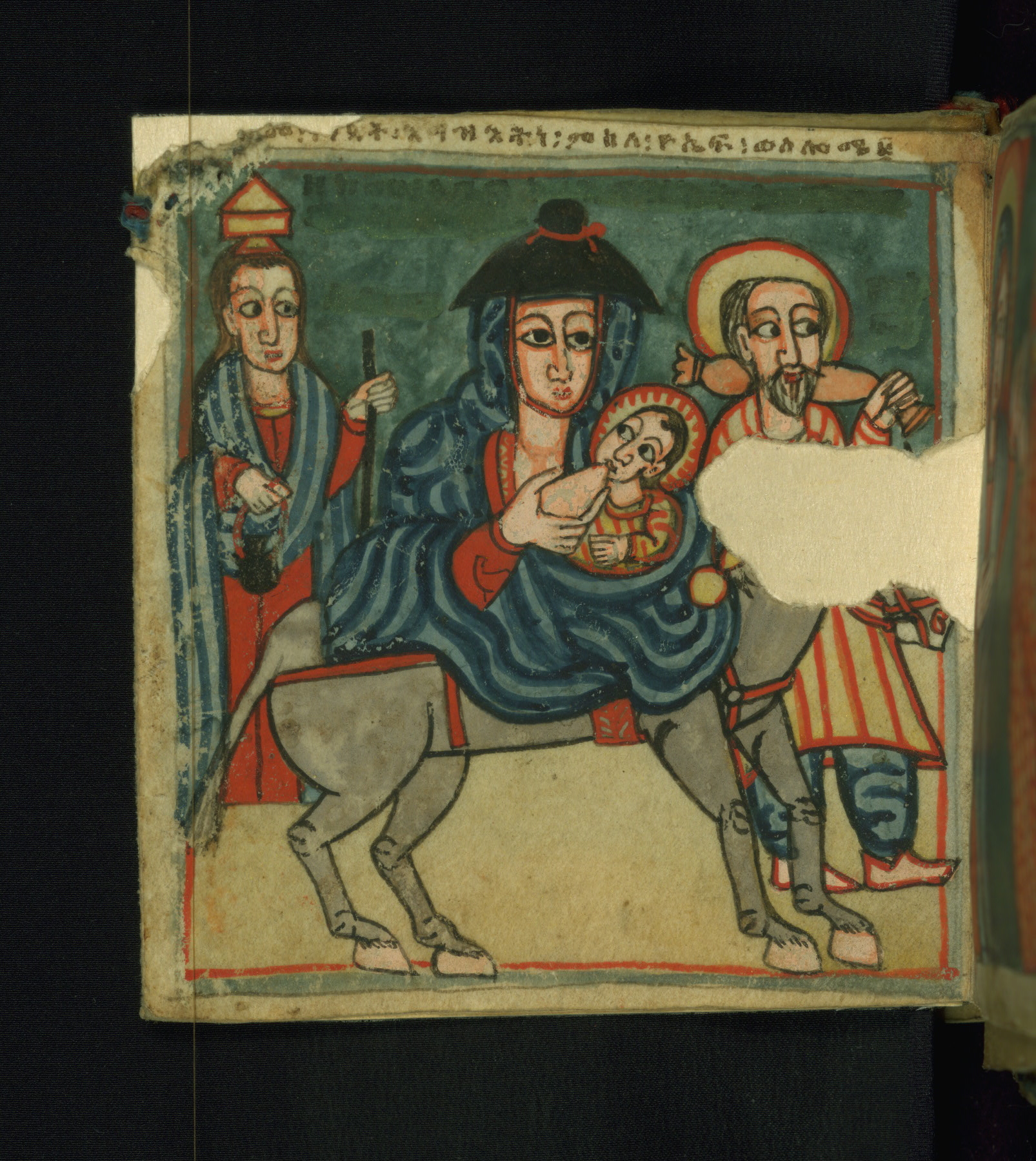 The inscription on the top reads: "[ዘከ]መ፡ [ተሰ]ደት፡ እግዝእትነ፡ ምስለ፡ ዮሴፍ፡ ወሰሎሜ።," or "How Our Lady fled with Joseph and Salome."