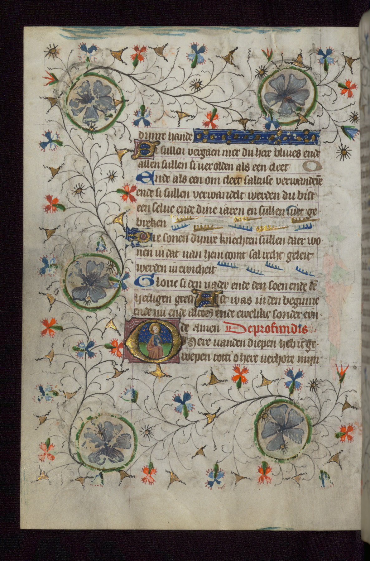 - Decoration note: Twenty full-page miniatures, one large historiated initial (7 lines), three small historiated initials (3-5 lines), one large decorated initial (9 lines); foliate margins with five medallions per page (3-4 lines) containing saints, grotesques, flowers and peacocks (true of almost entire manuscript, with main exception being margins around full-page miniatures); small decorated initials (1-3 lines) and geometric line fillers throughout in gold, blue and pink with white accents; rubrics in red, text in brown ink