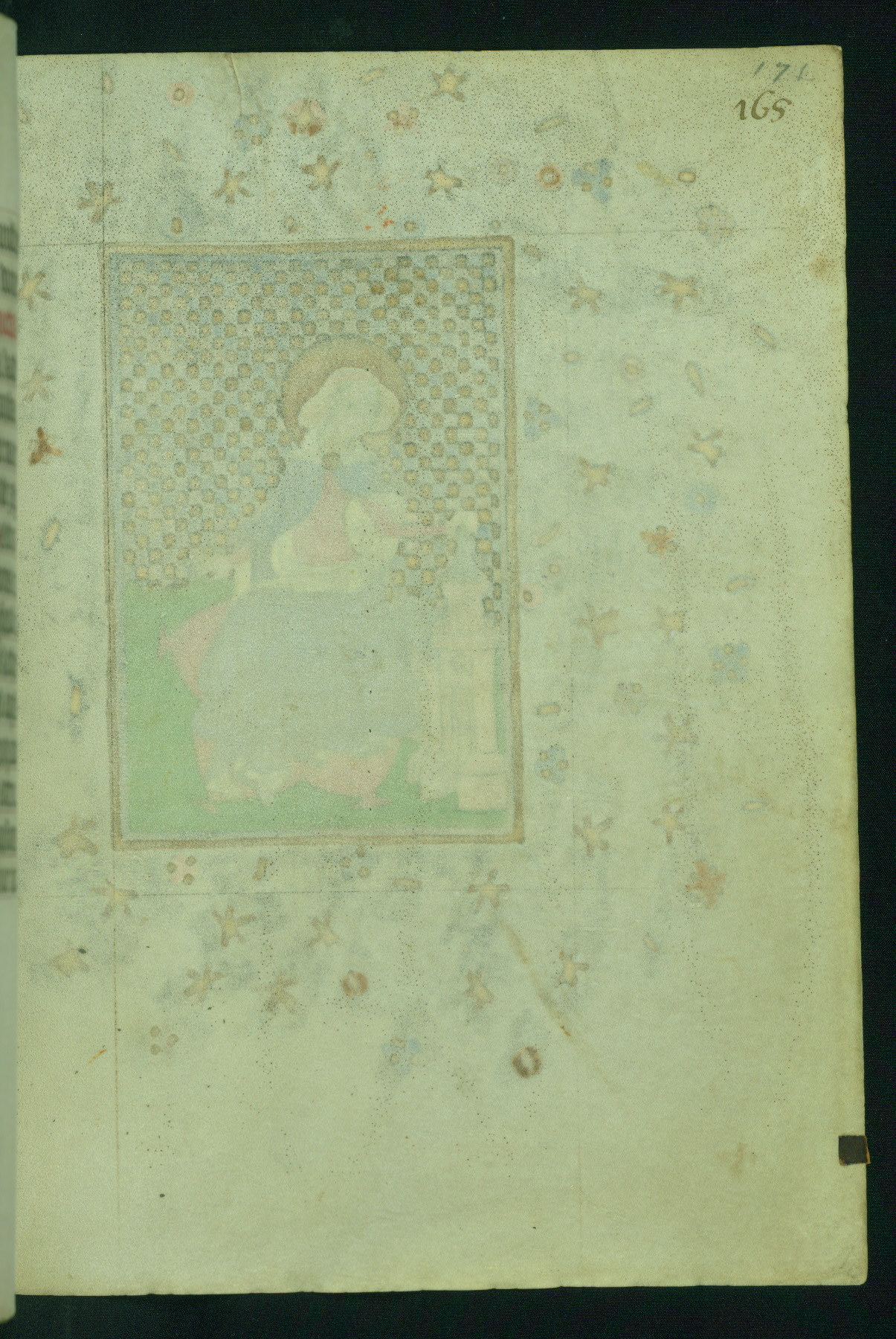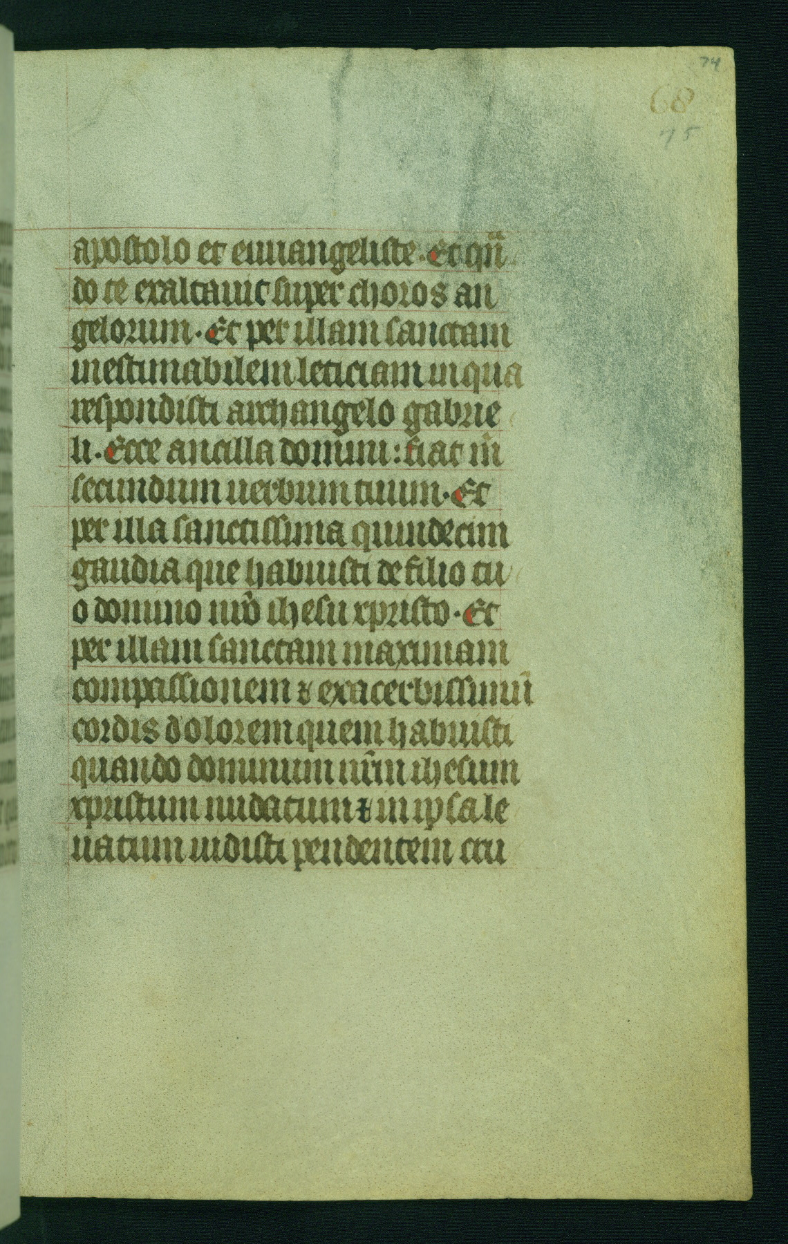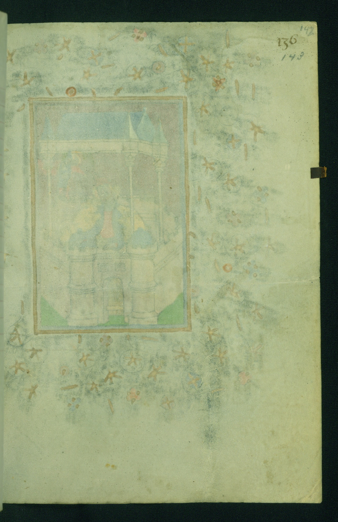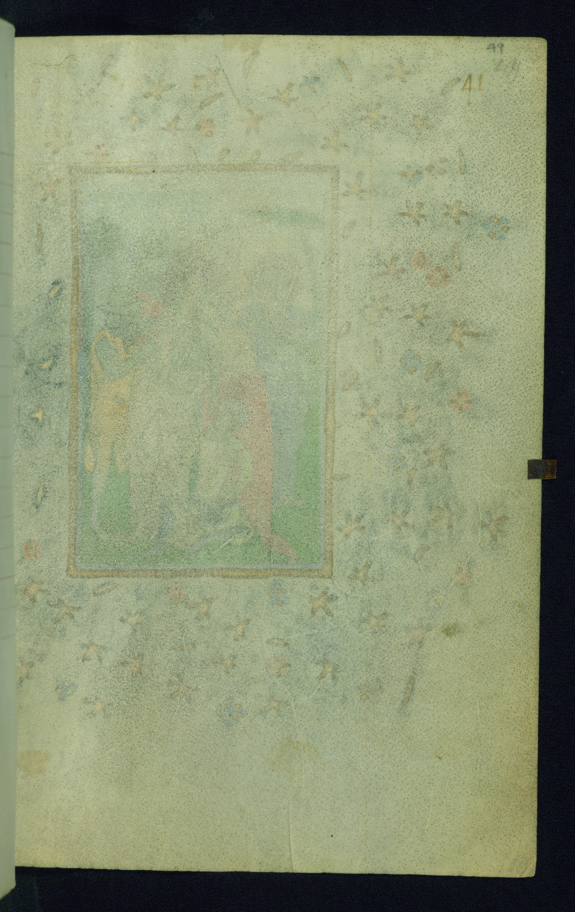This Book of Hours was originally completed ca. 1430-1440 but has since been reconstructed, with several prayers and suffrages having been added to it over time. The miniatures were illuminated under the influence of the Master of Guillebert de Mets. Both the original and a subsequent owner are depicted in prayer on fols. 9v and 165v, respectively. The book was rebound by Joris de Gavere of Ghent ca. 1525-1535. The manuscript was rebacked in the modern period, but the sixteenth-century boards remain. Both contain stamped panels depicting angels playing instruments, and a band of fantastic animals depicted in profile. An inscription cites Joris de Gavere as the maker and asks the angels for their prayers.