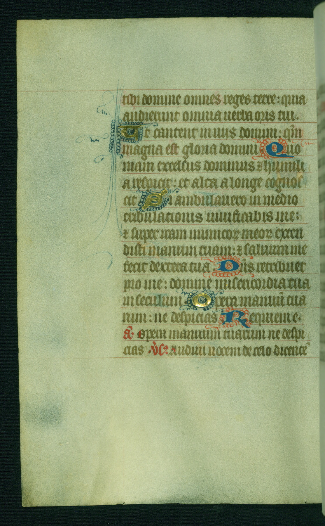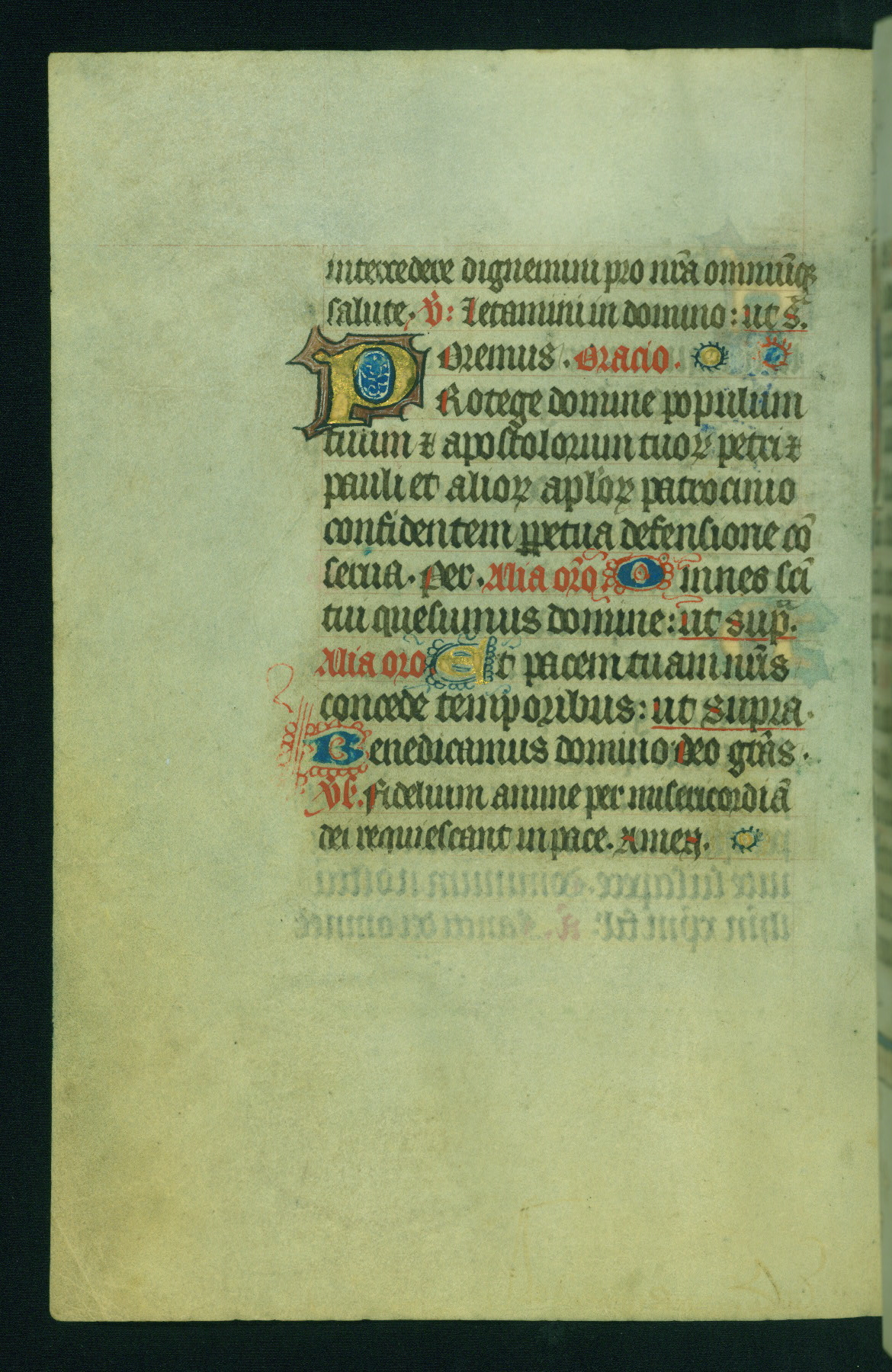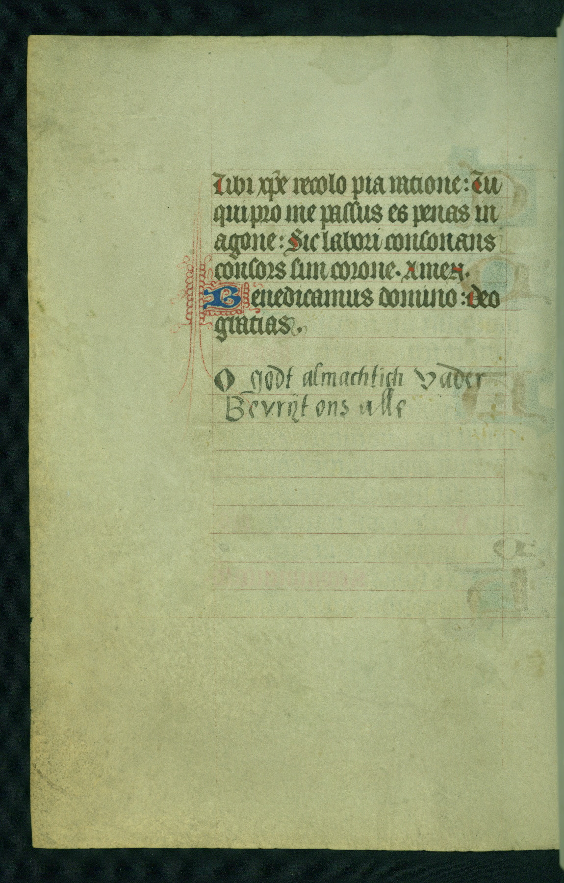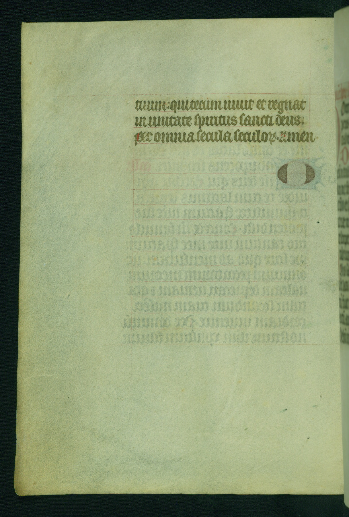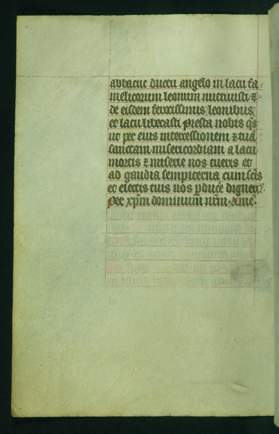 This Book of Hours was originally completed ca. 1430-1440 but has since been reconstructed, with several prayers and suffrages having been added to it over time. The miniatures were illuminated under the influence of the Master of Guillebert de Mets. Both the original and a subsequent owner are depicted in prayer on fols. 9v and 165v, respectively. The book was rebound by Joris de Gavere of Ghent ca. 1525-1535. The manuscript was rebacked in the modern period, but the sixteenth-century boards remain. Both contain stamped panels depicting angels playing instruments, and a band of fantastic animals depicted in profile. An inscription cites Joris de Gavere as the maker and asks the angels for their prayers.