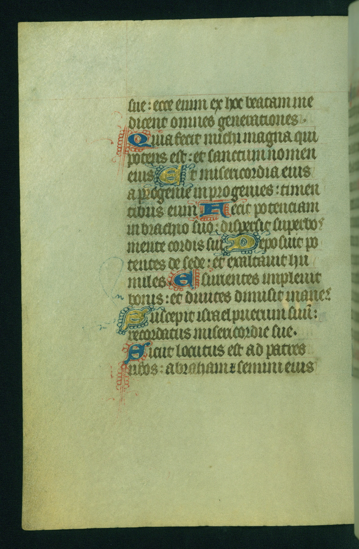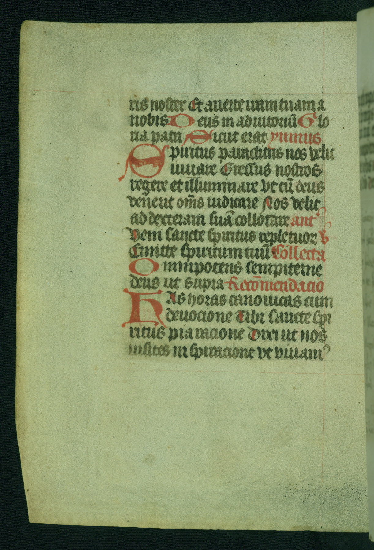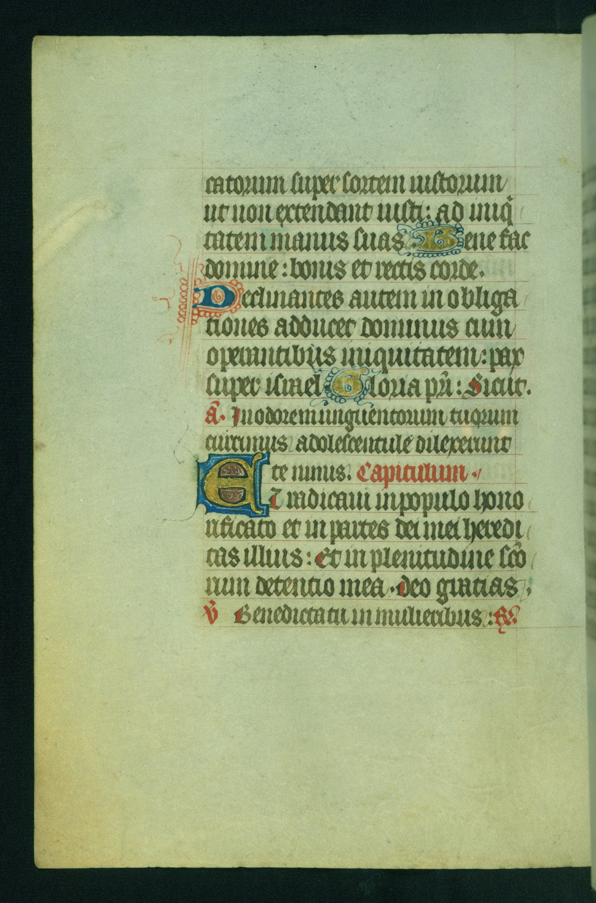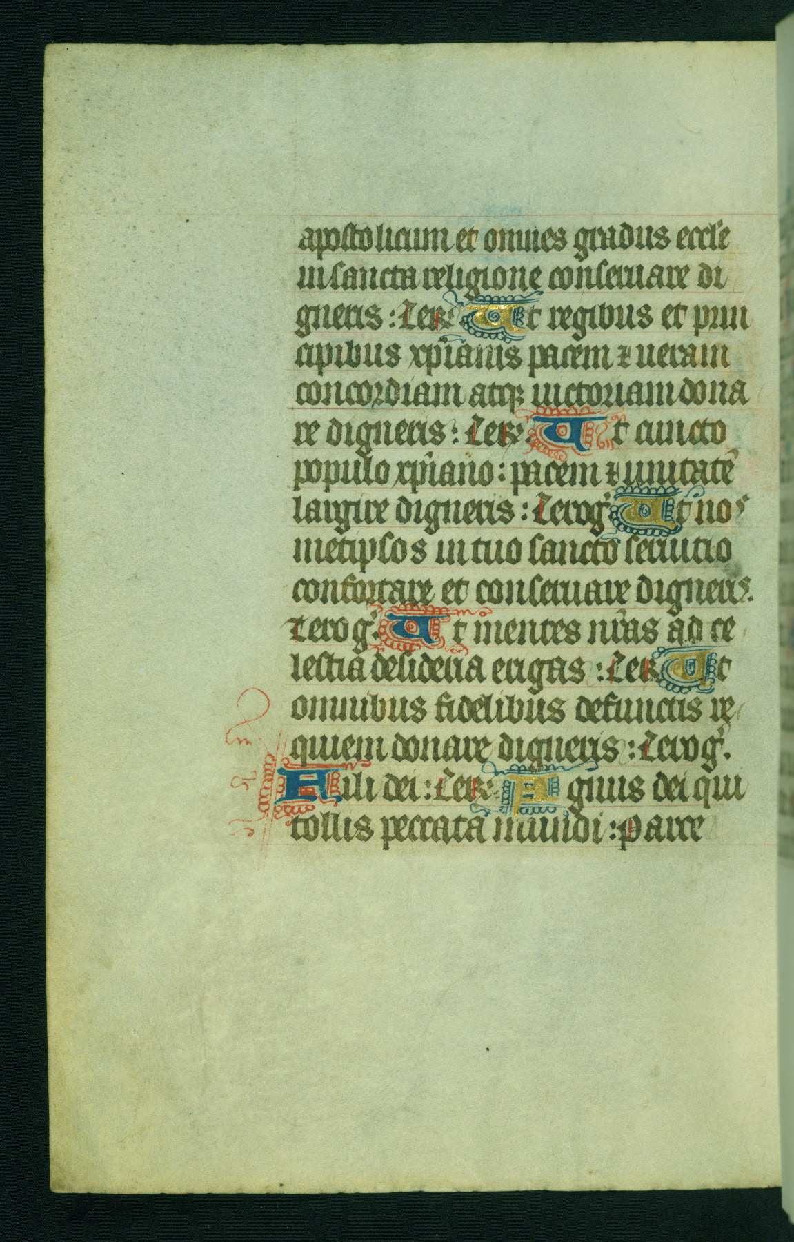 This Book of Hours was originally completed ca. 1430-1440 but has since been reconstructed, with several prayers and suffrages having been added to it over time. The miniatures were illuminated under the influence of the Master of Guillebert de Mets. Both the original and a subsequent owner are depicted in prayer on fols. 9v and 165v, respectively. The book was rebound by Joris de Gavere of Ghent ca. 1525-1535. The manuscript was rebacked in the modern period, but the sixteenth-century boards remain. Both contain stamped panels depicting angels playing instruments, and a band of fantastic animals depicted in profile. An inscription cites Joris de Gavere as the maker and asks the angels for their prayers.
