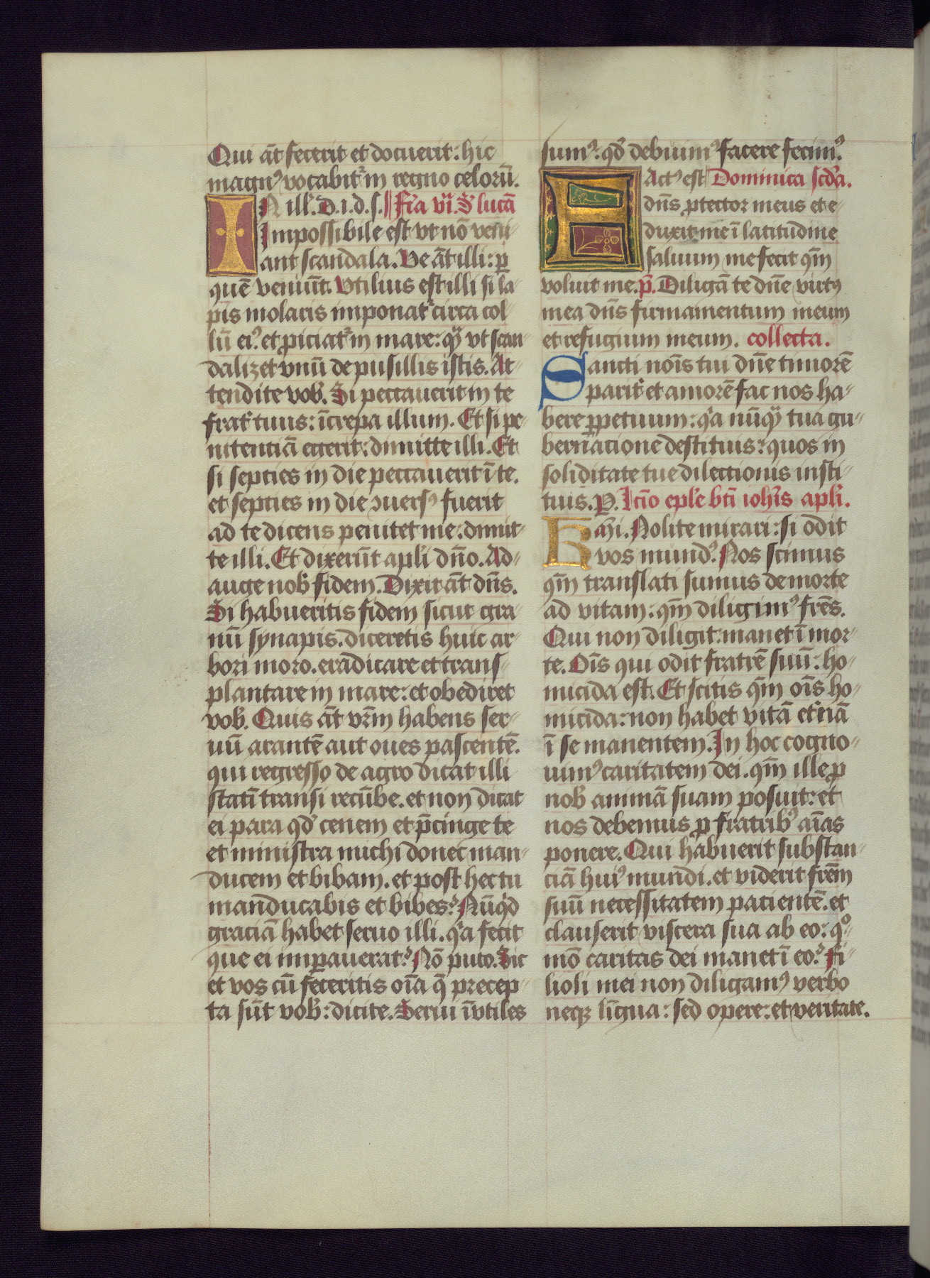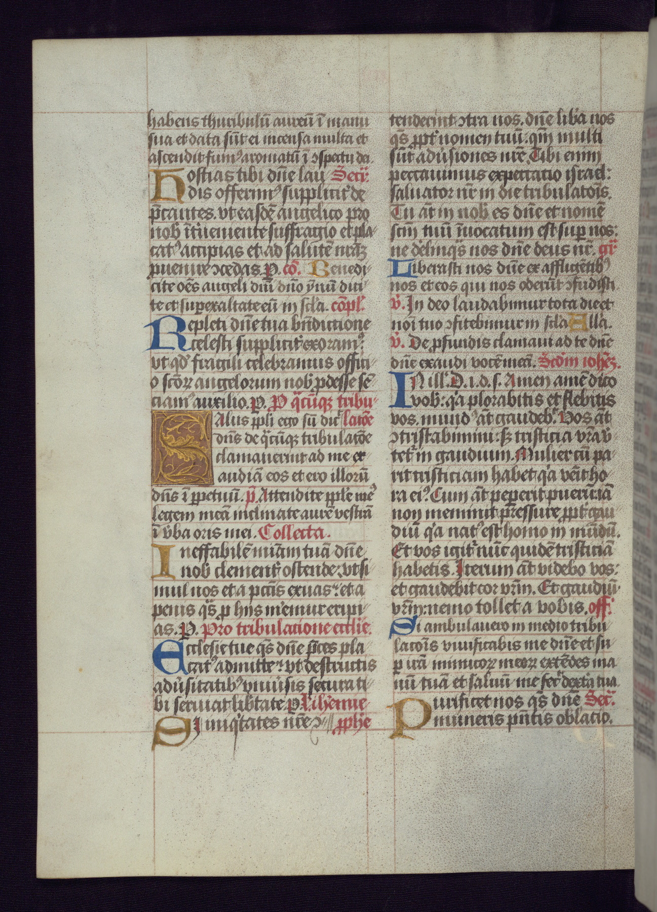 This Latin Missal was written in Utrecht, Netherlands, ca. 1500. Portraits of the original owners, whose names are not recorded, are accompanied by heraldry indicating that the husband was of the family of St. Férréol of Dauphiné; the wife was of the Cambronne of Ponthieu family. The manuscript is heavily illuminated with more than fifty historiated initials and miniatures by a group of artists known in scholarship as the "Masters of the Dark Eyes." The marginal decoration is also notable, for along with naturalistic flowers, insects, and jewels, there are several instances where the margin itself is historiated. This Missal provides an excellent example of the "Masters of the Dark Eyes" style, and there are a number of related manuscripts that have been identified by these same artists, including two at The Hague: KB, 76 G 9, and KB, 135 E 19.