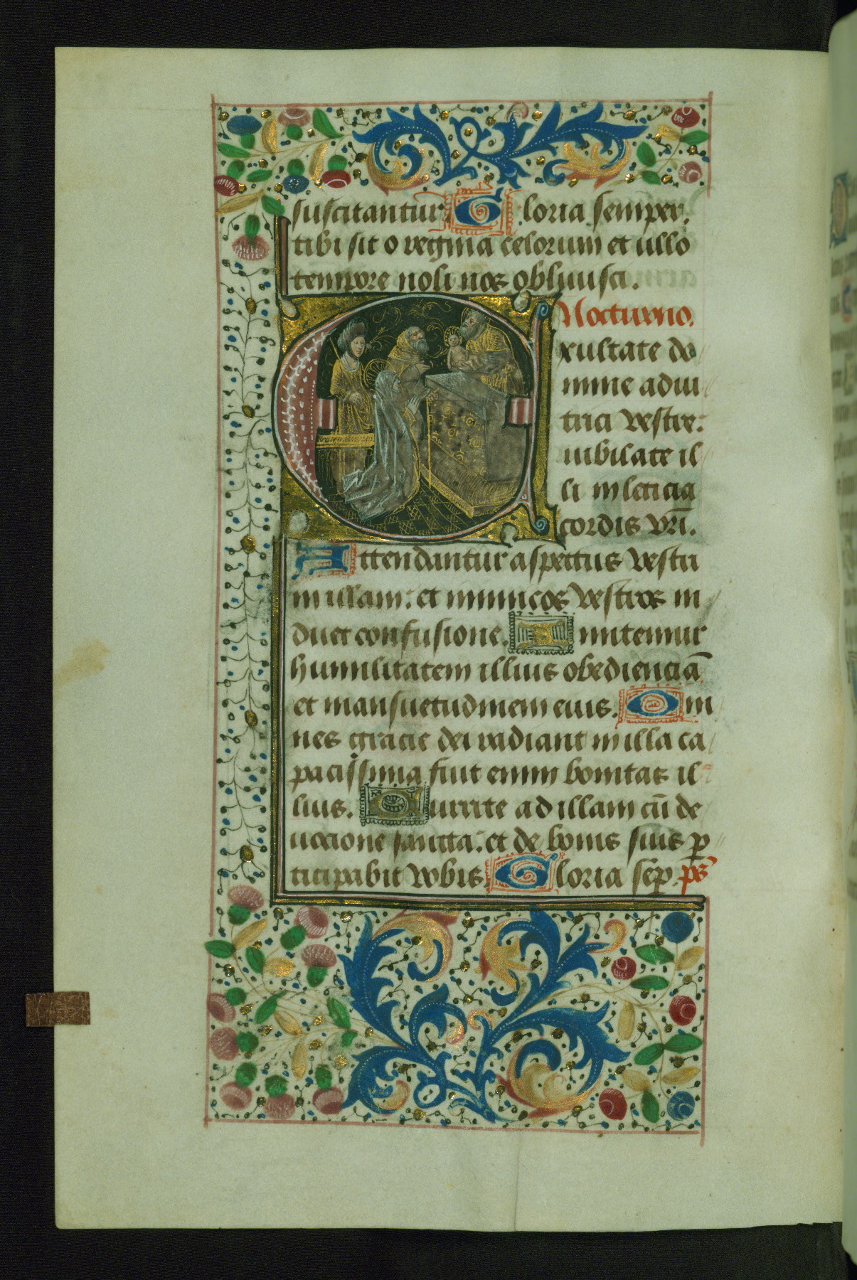 - Decoration note: Nine full-page miniatures with floral borders accompanying them; seven historiated initials; gold, rose, and blue decorated initials for secondary text divisions (2 lines); flourished initials in alternating blue and gold for versals (1 line); rubrics in red; text in black or dark brown ink