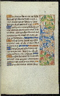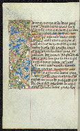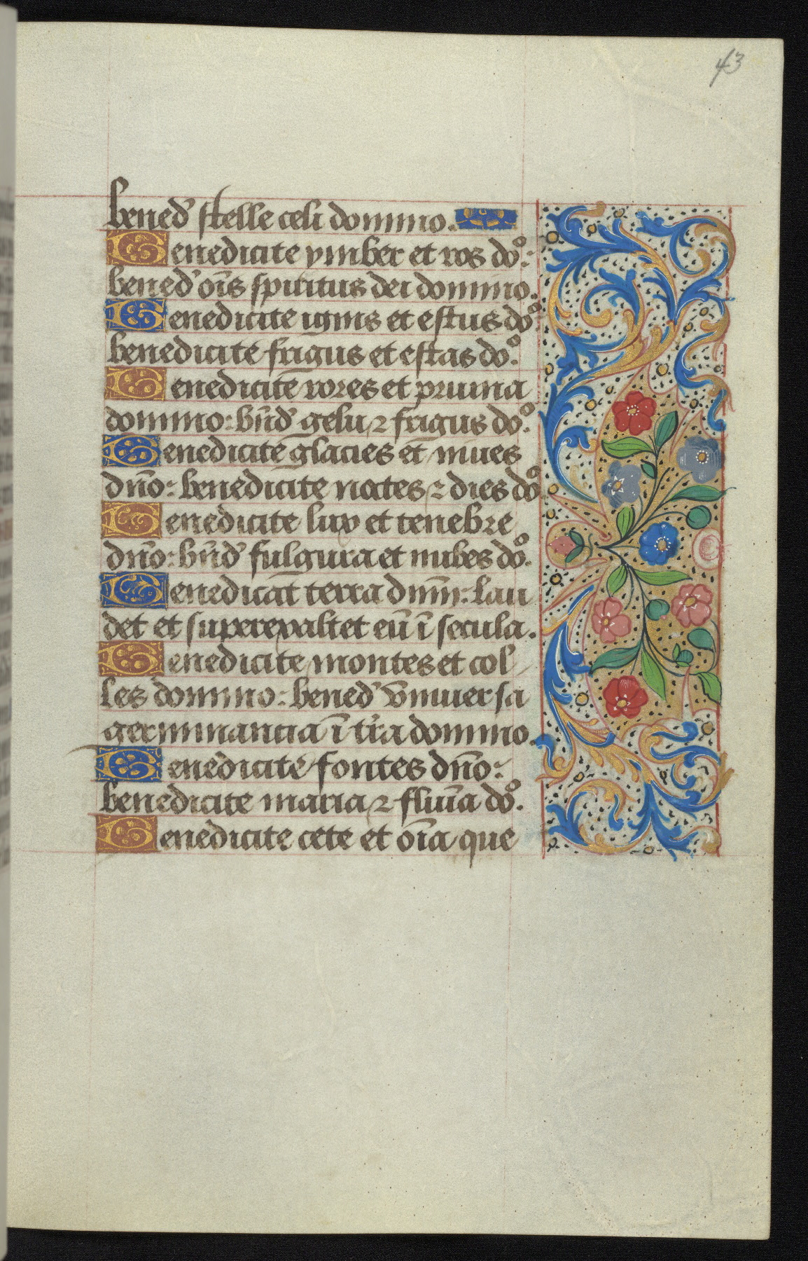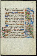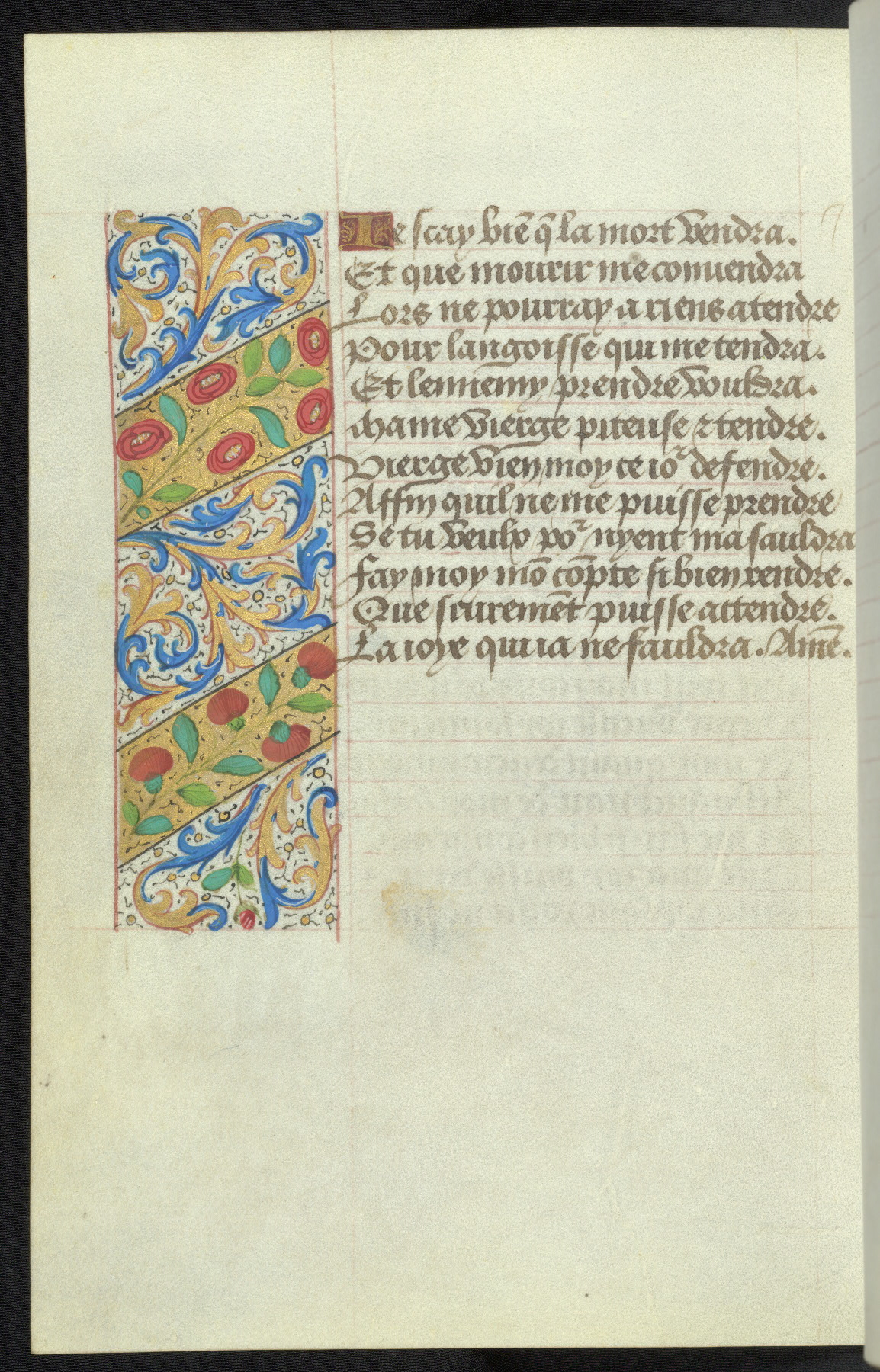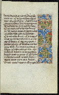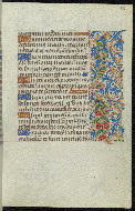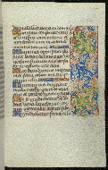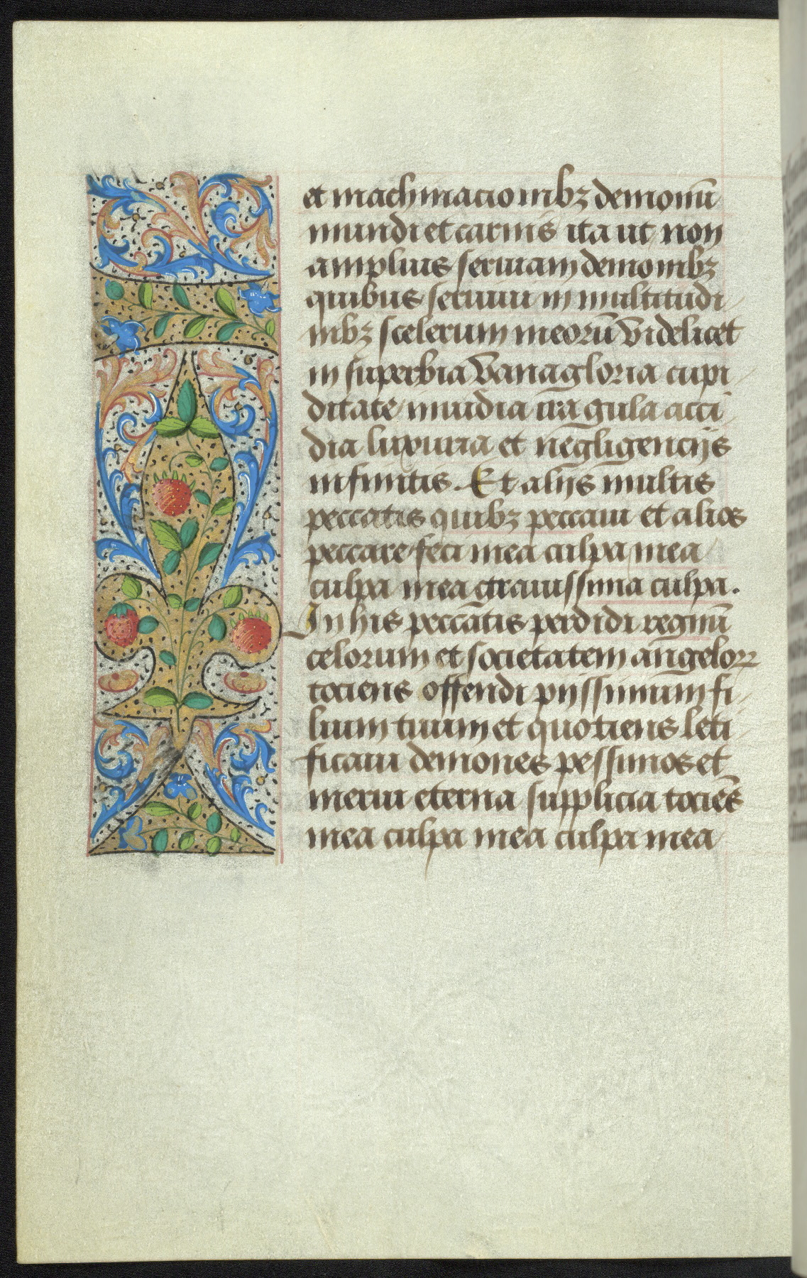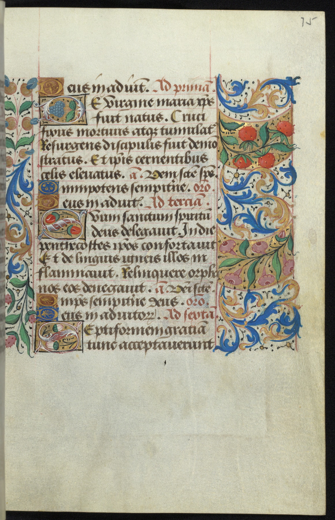 This Book of Hours was completed for the Use of Rouen in the last quarter of the fifteenth century. The original female owner is depicted in a donor portrait kneeling at the right of the Pietà on the last illuminated page of the book (fol. 114r). Marked prominence is given to this female worshiper as her scale exceeds that of the Virgin as well as SS. John the Evangelist and Mary Magdalene. The Pentecost miniature on fol. 74r exemplifies the interest during that period in replacing the traditional central perspective with a diagonally conceived composition. This off-center orientation highlighting St. Peter rather than the Virgin was a popular theme in contemporary Books of Hours from Rouen.