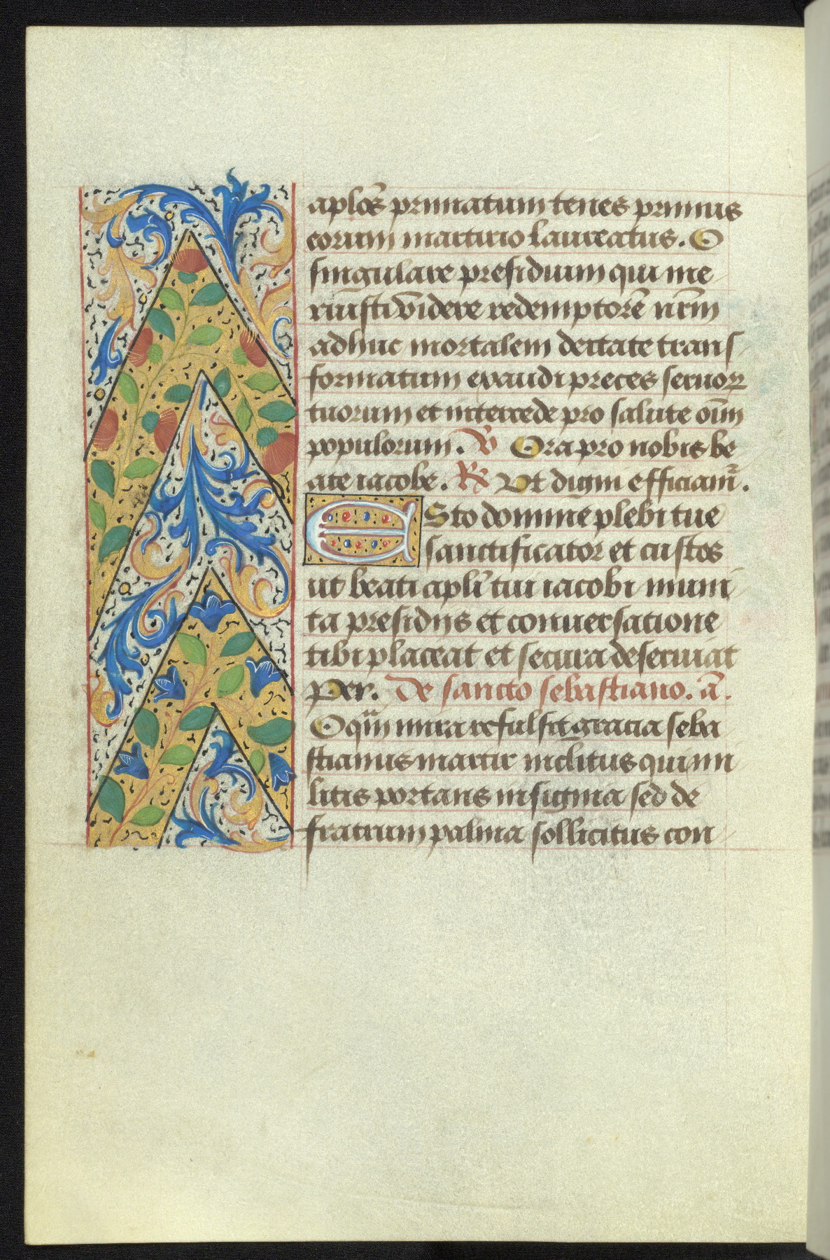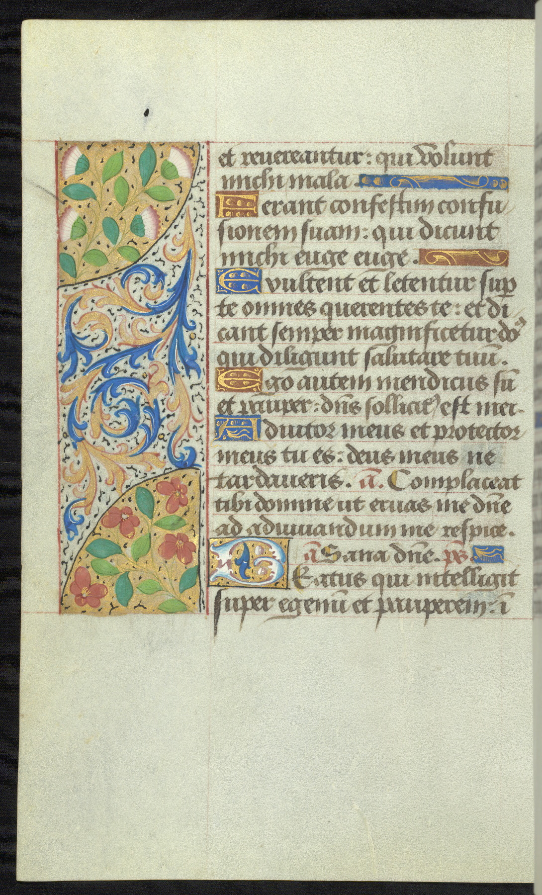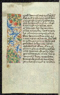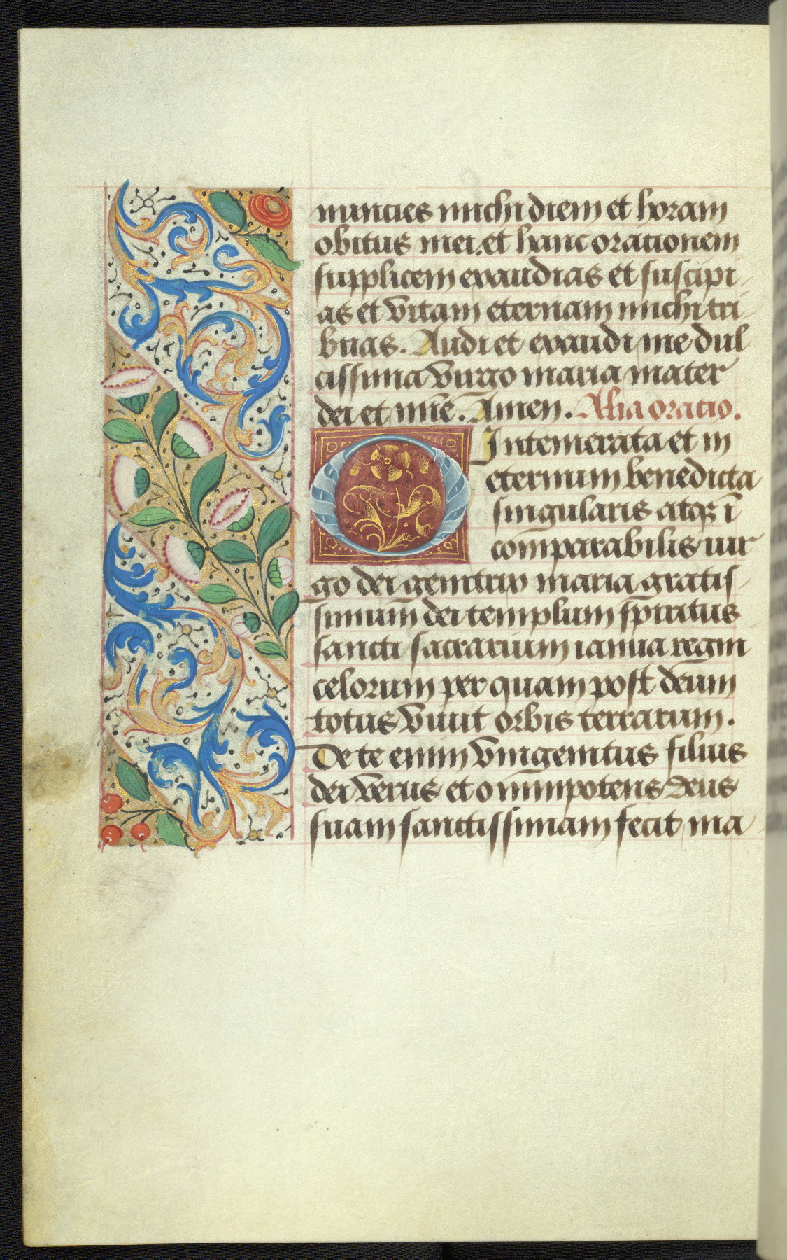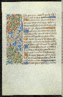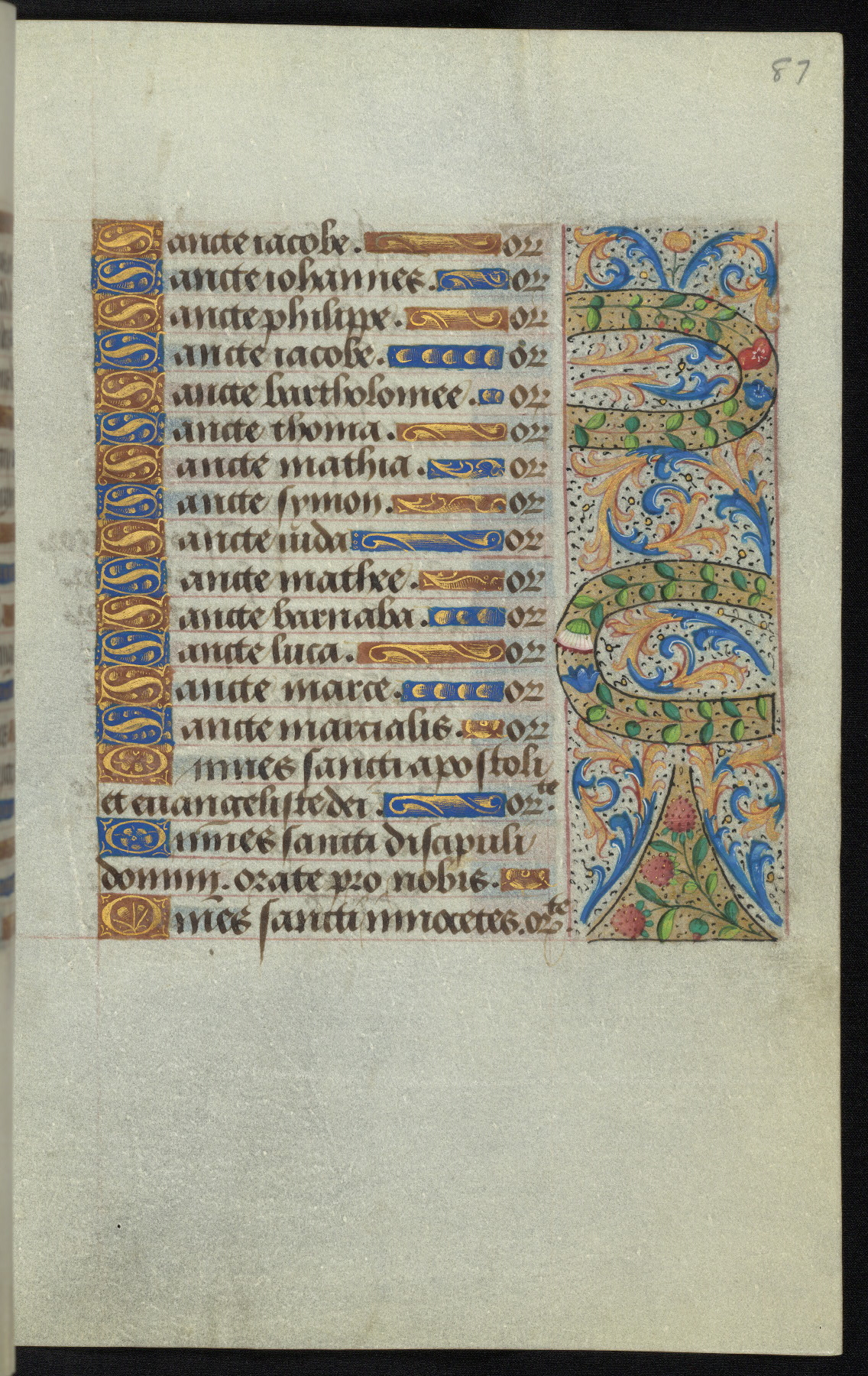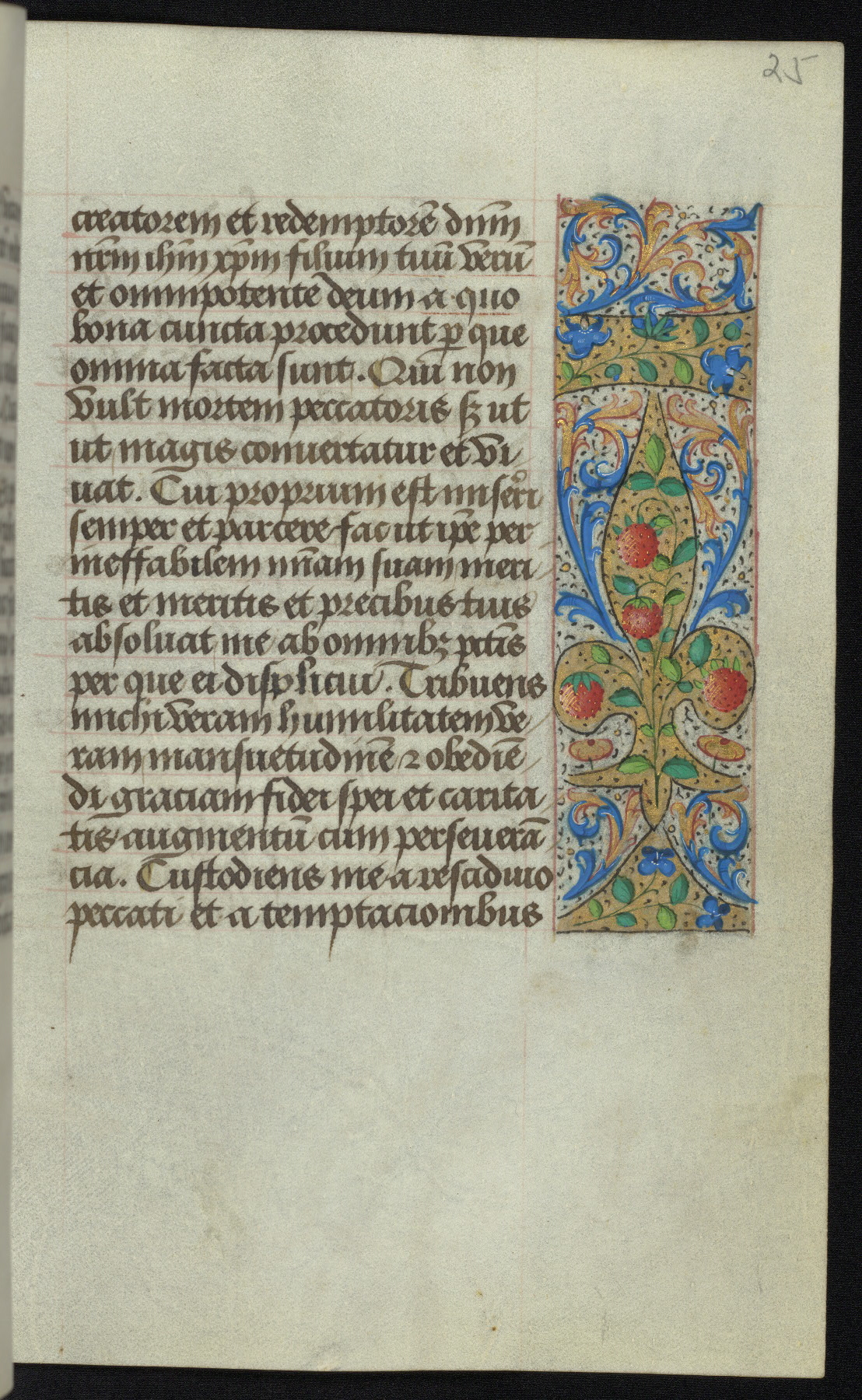 This Book of Hours was completed for the Use of Rouen in the last quarter of the fifteenth century. The original female owner is depicted in a donor portrait kneeling at the right of the Pietà on the last illuminated page of the book (fol. 114r). Marked prominence is given to this female worshiper as her scale exceeds that of the Virgin as well as SS. John the Evangelist and Mary Magdalene. The Pentecost miniature on fol. 74r exemplifies the interest during that period in replacing the traditional central perspective with a diagonally conceived composition. This off-center orientation highlighting St. Peter rather than the Virgin was a popular theme in contemporary Books of Hours from Rouen.