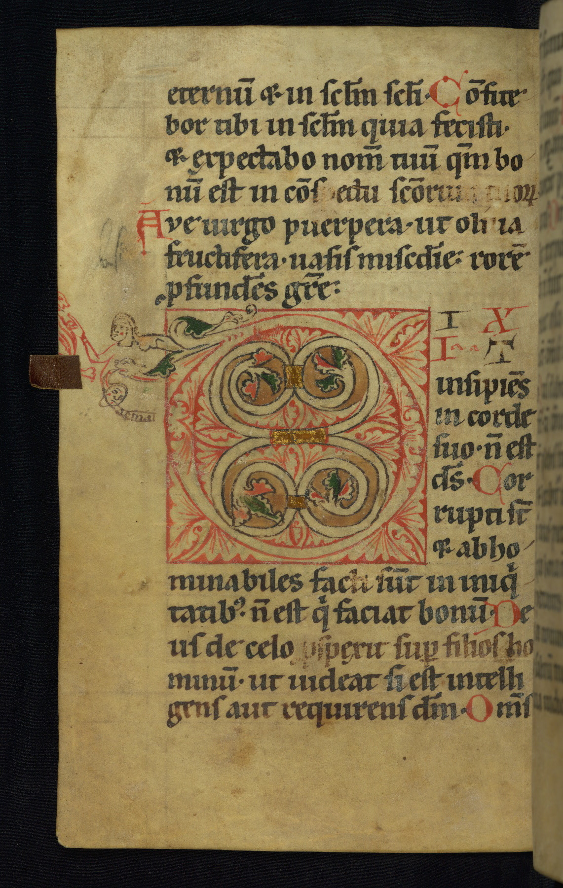 - Decoration note: Seven inhabited and two historiated initials with beasts and human figures (7-15 lines); two foliate initials (9-10 lines); initials drawn in black and red pen, often with gold or yellow wash backgrounds and red and green accents; Psalms begin with red pen-drawn decorative initials with blue or green flourishes (3-8 lines); Psalm verses begin with red initials (1 line high); rubrics in red, text in black ink