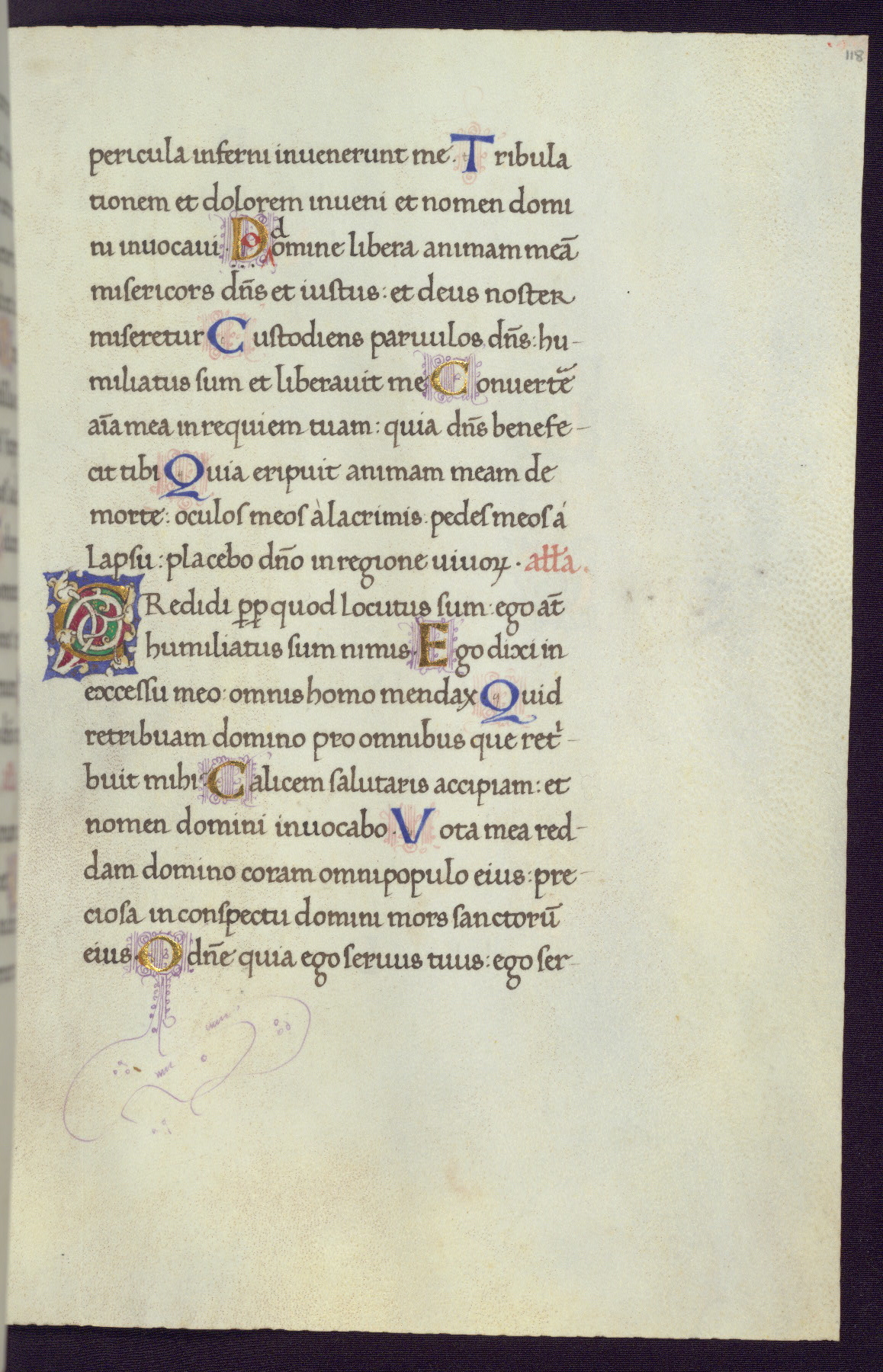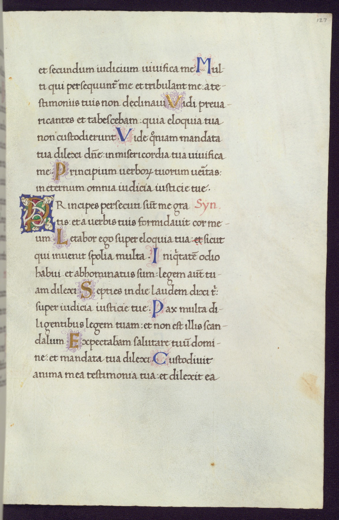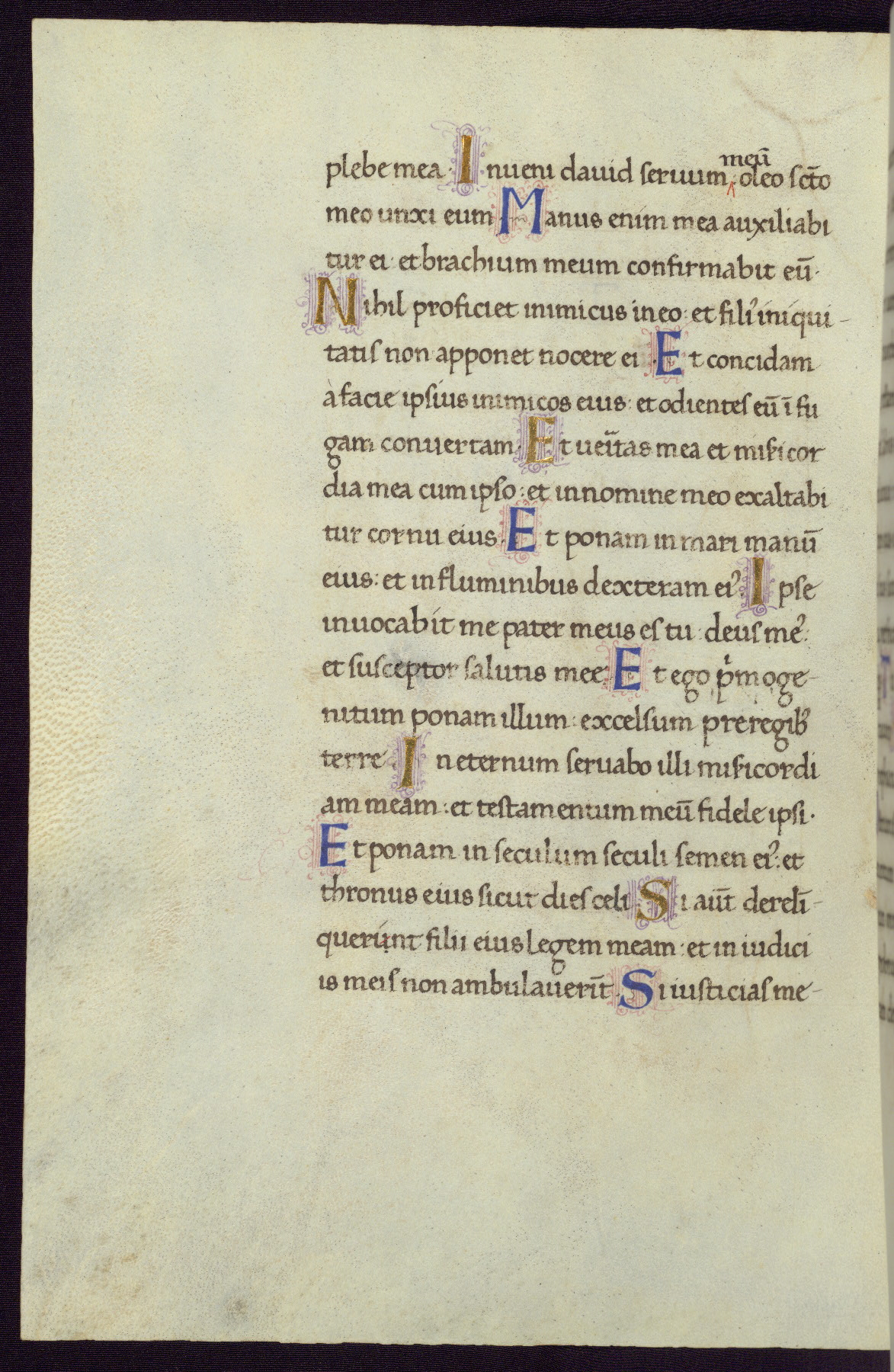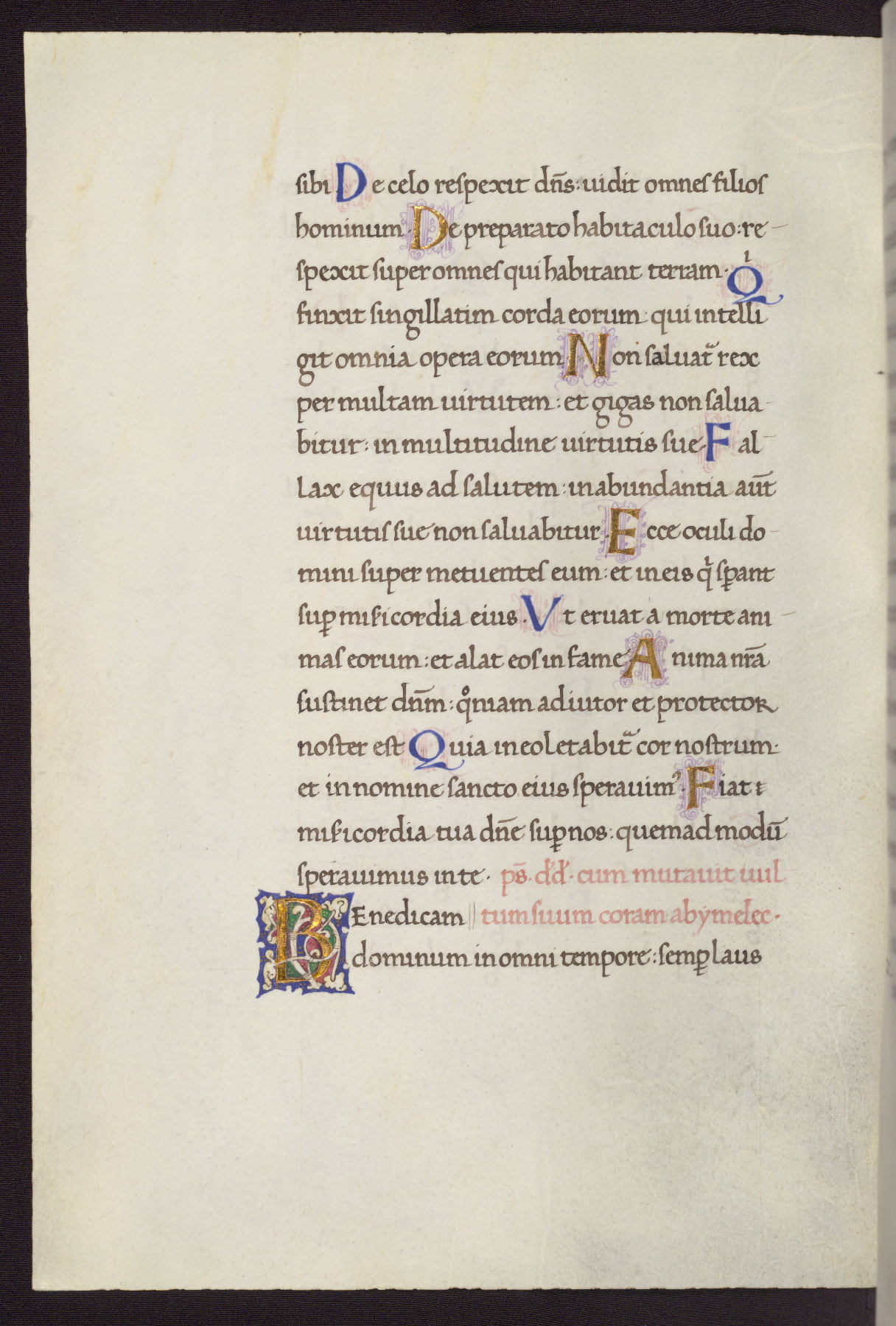 This Psalter was created in Southern Italy, likely Naples, in the last quarter of the fifteenth century. The litany (fols. 158v - 161r) suggests it was for Cistercian use. It contains six high-quality miniatures attributed to the Neopolitan illuminator Cristoforo Magorana (though the historiated initial of David playing a psaltry on fol. 15r may have been done by another hand), who from 1480-1492 worked at the court of Ferdinand I of Aragon. To date, almost forty manuscripts have been attributed to the artist. The Walters manuscript contains two full-page miniatures, one showing the Tree of Jesse and the other the Man of Sorrows. The Tree of Jesse (described in Isaiah 1:11) shows the ancestry of Christ rising from Jesse of Bethlehem, the father of King David who is depicted on the facing folio (171r). In this depiction Jesse is shown on the trunk of the tree, but it actually rises from Abraham. Surrounding Abraham is a crowd of Prophets each with scrolls with verses believed to prophecy the coming of Christ. The miniature with the Man of Sorrows shows Christ standing in his tomb and surrounded by the objects associated with the Passion (arma Christi). The miniature follows a specific Man of Sorrows iconography that originated in an early-fourteenth century mosaic icon from Constantinople that most likely arrived in Italy ca. 1380. The mosaic panel was believed to be an authentic representation of St. Gregory's vision of Christ as the Man of Sorrows, and this type of image encouraged the viewer to meditate on the suffering of Christ while reading the Passion narratives that follow. The humanist script and white-vine initials place the Walters Psalter firmly within the Humanist tradition of the late fifteenth century. Remnants of black velvet suggest this book once had a chemise binding, comparable to W.294 and W.480. Peter Kidd has suggested that the manuscript may have been written by Pietro Ursuleo of Capua (d. 1483).