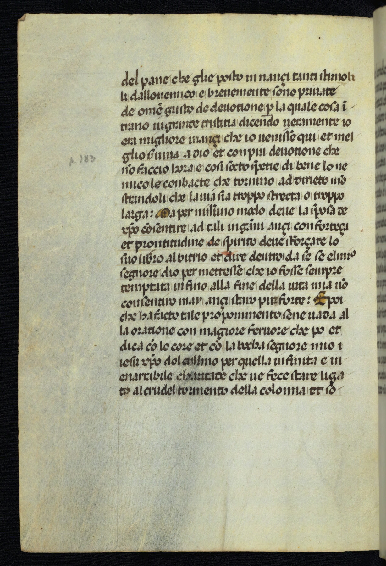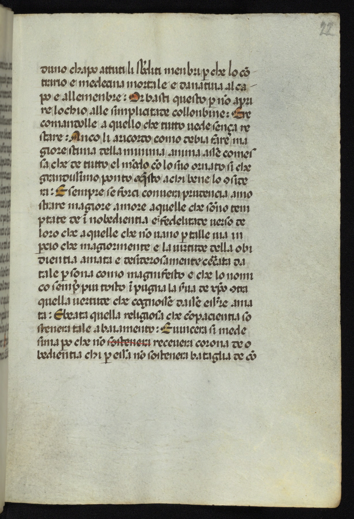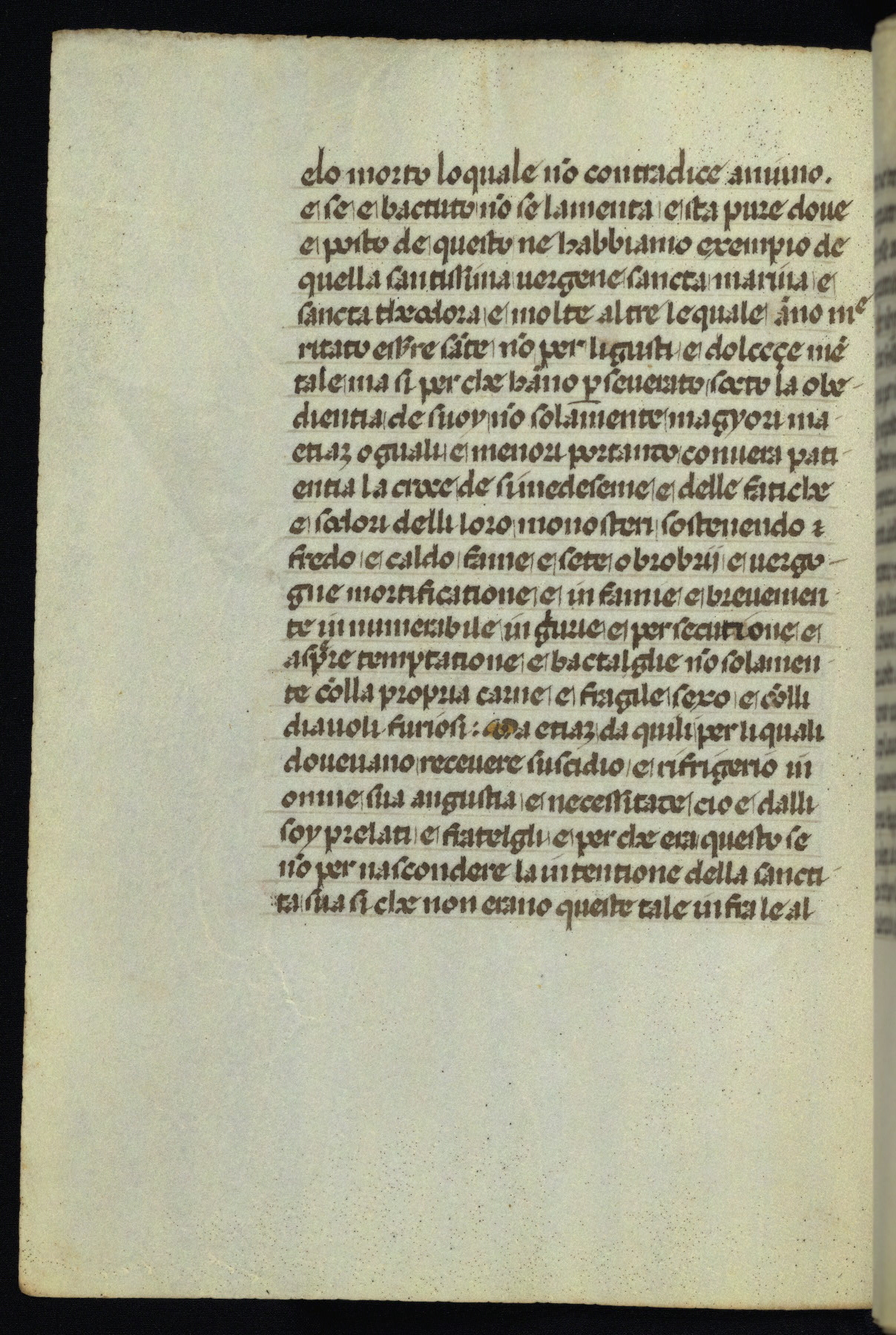 St. Catherine of Bologna (1413-1463), also known as Catherine de' Vigr, was an Italian nun from the order of the Poor Clares. She was born to a fairly wealthy family and spent time as a young woman at the court of Niccolò III d'Este (1383-1441), the Marquess of Ferrara. Catherine became jaded with court life after Niccolò had his wife Parisina executed for adultery in 1425. In In 1455 she left Ferrara to become the abbess of a new convent, Corpus Domini in Bologna. Her most famous work is Seven Spiritual Weapons Necessary for Spiritual Warfare (Le Sette Armi Spirituali), which she wrote in 1438, then edited between 1450 and 1456. The text encourages the reader to take up the cross as a kind of spiritual arms. According to the colophon on fol. 62r-v, the Walters copy was written in 1466 at the monastery of Corpus Christi in Ferrara by the nun Beata Illuminata Bembo, a companion of St. Catherine. It was copied from St. Catherine's own manuscript found in her cell at the time of her death in 1463 by Father Batista da Modena. Especially wonderful is the sensitively painted portrait of St. Catherine on fol. 1v, which was created in her memory shortly after her death by her friend Beata, and which may therefore offer a lovingly personalized portrait of the saint by someone who knew her well.