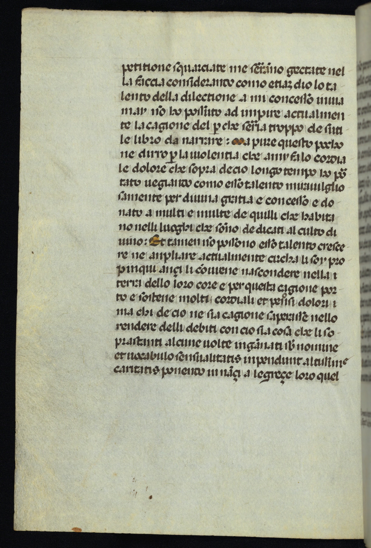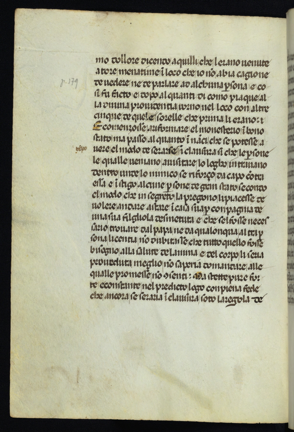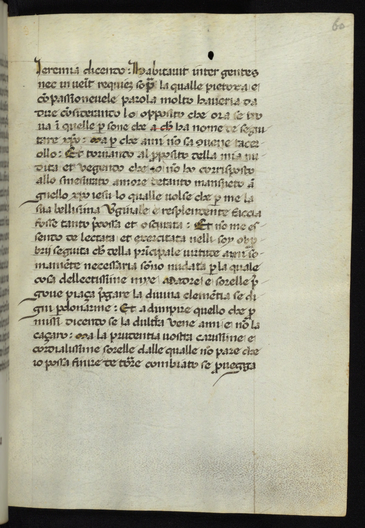 St. Catherine of Bologna (1413-1463), also known as Catherine de' Vigr, was an Italian nun from the order of the Poor Clares. She was born to a fairly wealthy family and spent time as a young woman at the court of Niccolò III d'Este (1383-1441), the Marquess of Ferrara. Catherine became jaded with court life after Niccolò had his wife Parisina executed for adultery in 1425. In In 1455 she left Ferrara to become the abbess of a new convent, Corpus Domini in Bologna. Her most famous work is Seven Spiritual Weapons Necessary for Spiritual Warfare (Le Sette Armi Spirituali), which she wrote in 1438, then edited between 1450 and 1456. The text encourages the reader to take up the cross as a kind of spiritual arms. According to the colophon on fol. 62r-v, the Walters copy was written in 1466 at the monastery of Corpus Christi in Ferrara by the nun Beata Illuminata Bembo, a companion of St. Catherine. It was copied from St. Catherine's own manuscript found in her cell at the time of her death in 1463 by Father Batista da Modena. Especially wonderful is the sensitively painted portrait of St. Catherine on fol. 1v, which was created in her memory shortly after her death by her friend Beata, and which may therefore offer a lovingly personalized portrait of the saint by someone who knew her well.