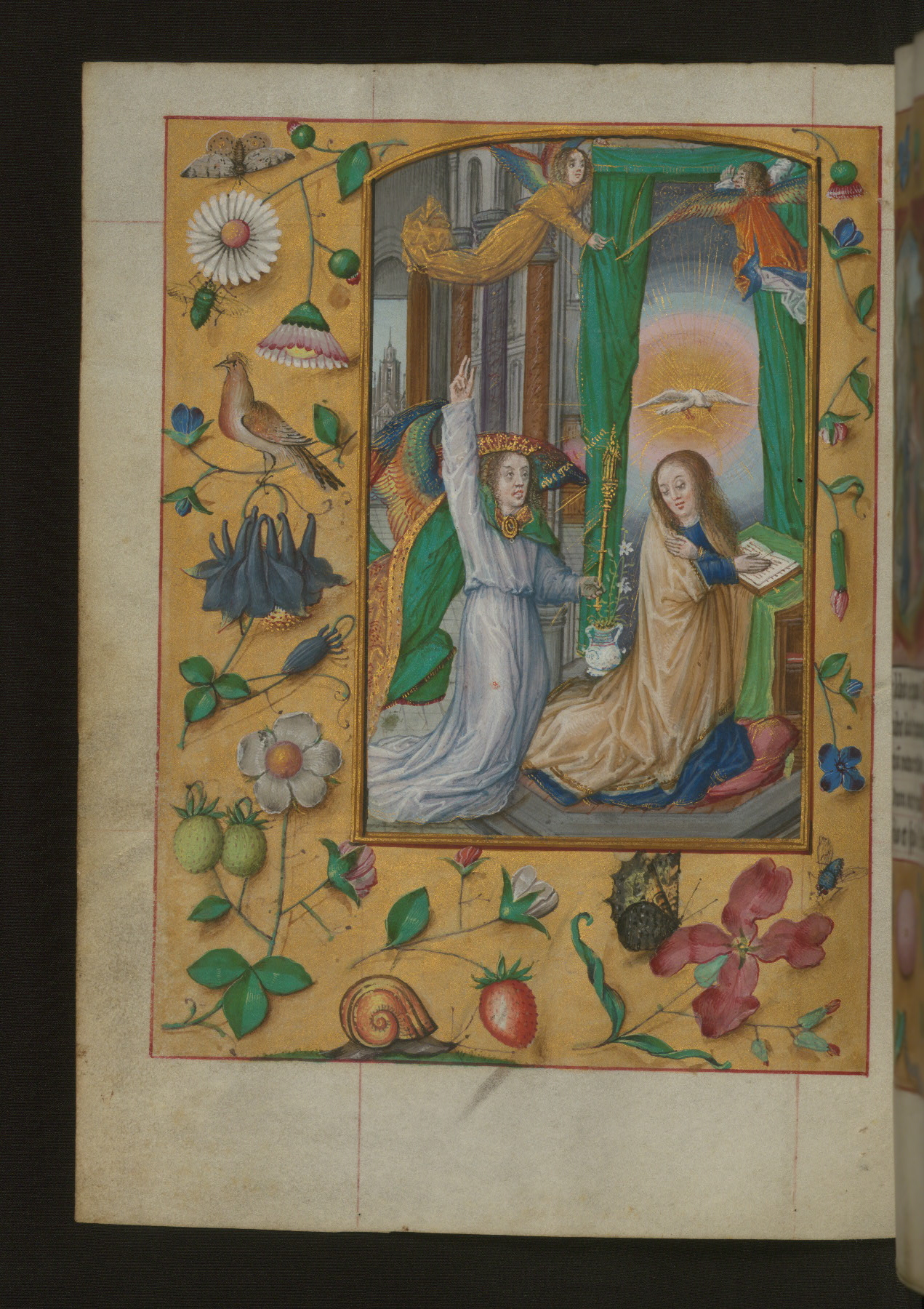 This early sixteenth-century book of hours was made for the Aussem family in Cologne, Germany, a provenance proclaimed through family heraldry within the manuscript, as well as the arms of Cologne stamped on its original leather binding. Lavishly illuminated throughout with full-page miniatures and historiated initials, the manuscript is just as notable for the marginal decorations that surround the figurative scenes. Illusionistic jewelry, architecture, texts, flowers, and insects abound.