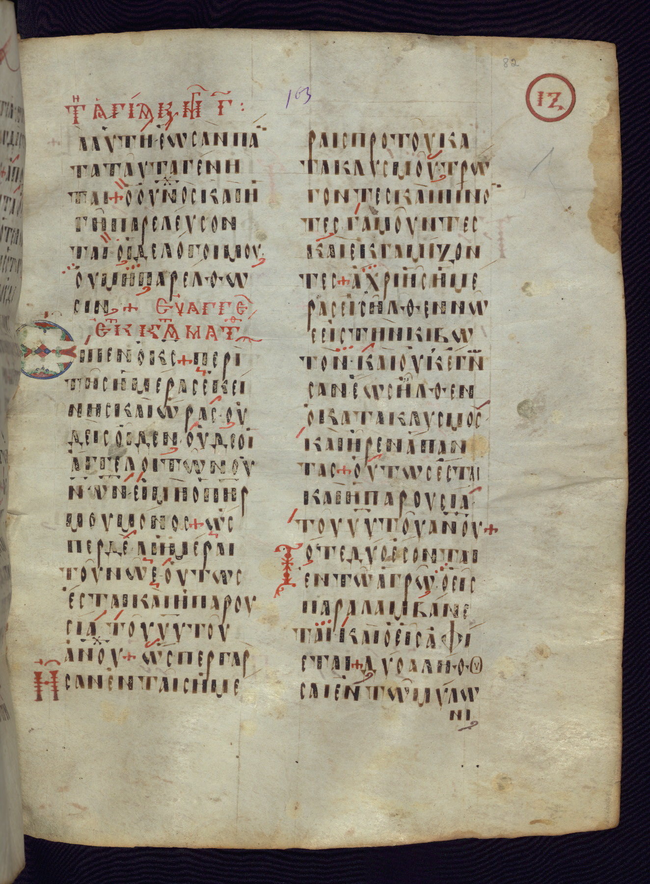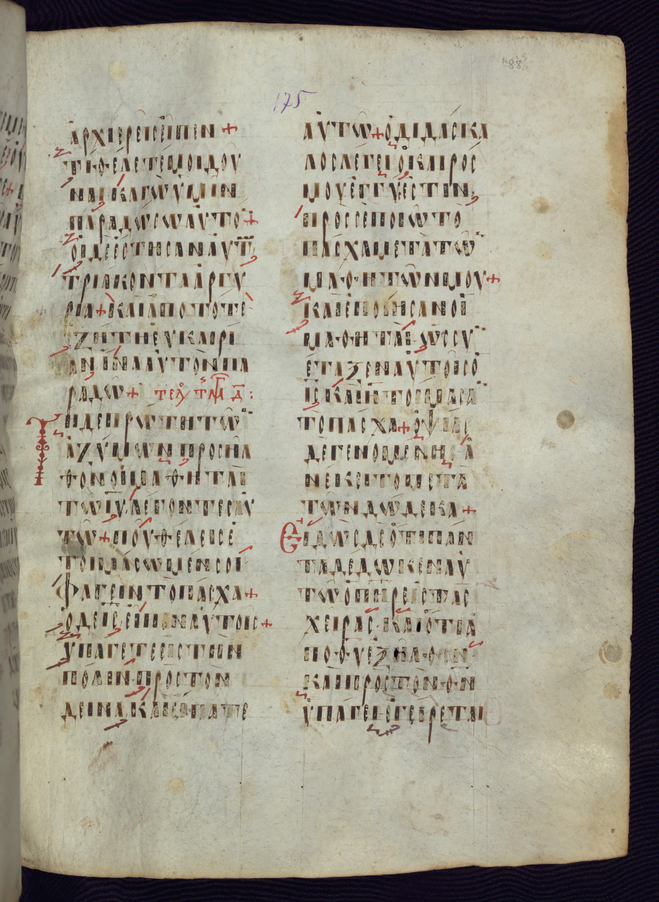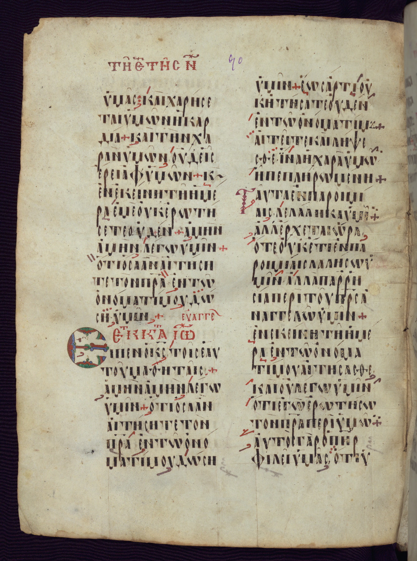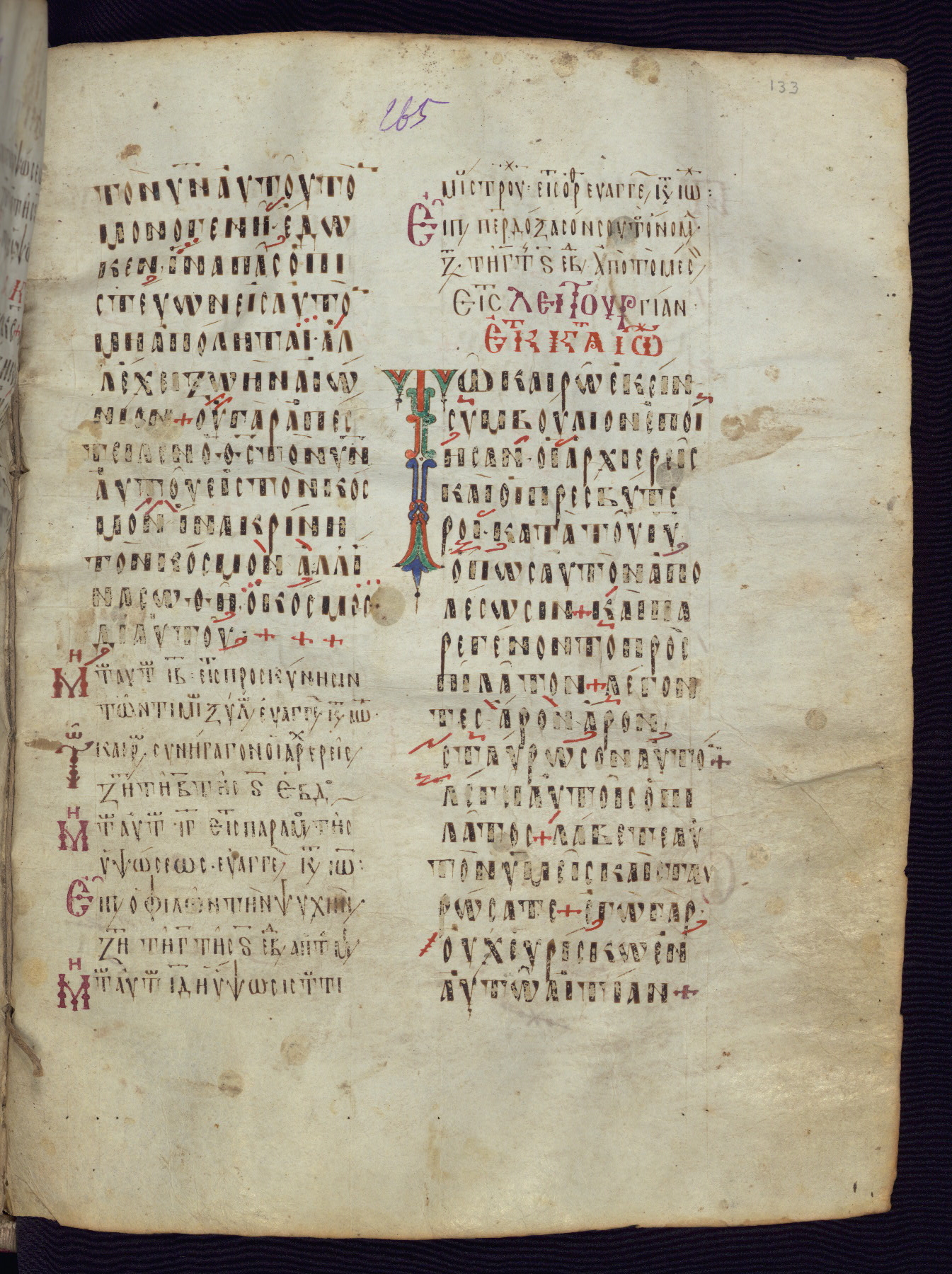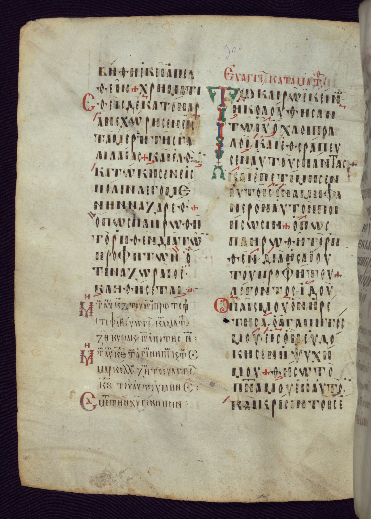 This is an example of a Gospel Lectionary written in the archaic, majuscule form of Greek letters. Liturgical books were inherently conservative and therefore commonly retained such antiquated writing. The scribe, a certain monk Theodore, has recorded his name in a verse at the end of the volume (fol. 179v). A leaf removed from this manuscript ca. 1900 is now in Sofia, National Library of Republic of Bulgaria NBKM Gr. 2.