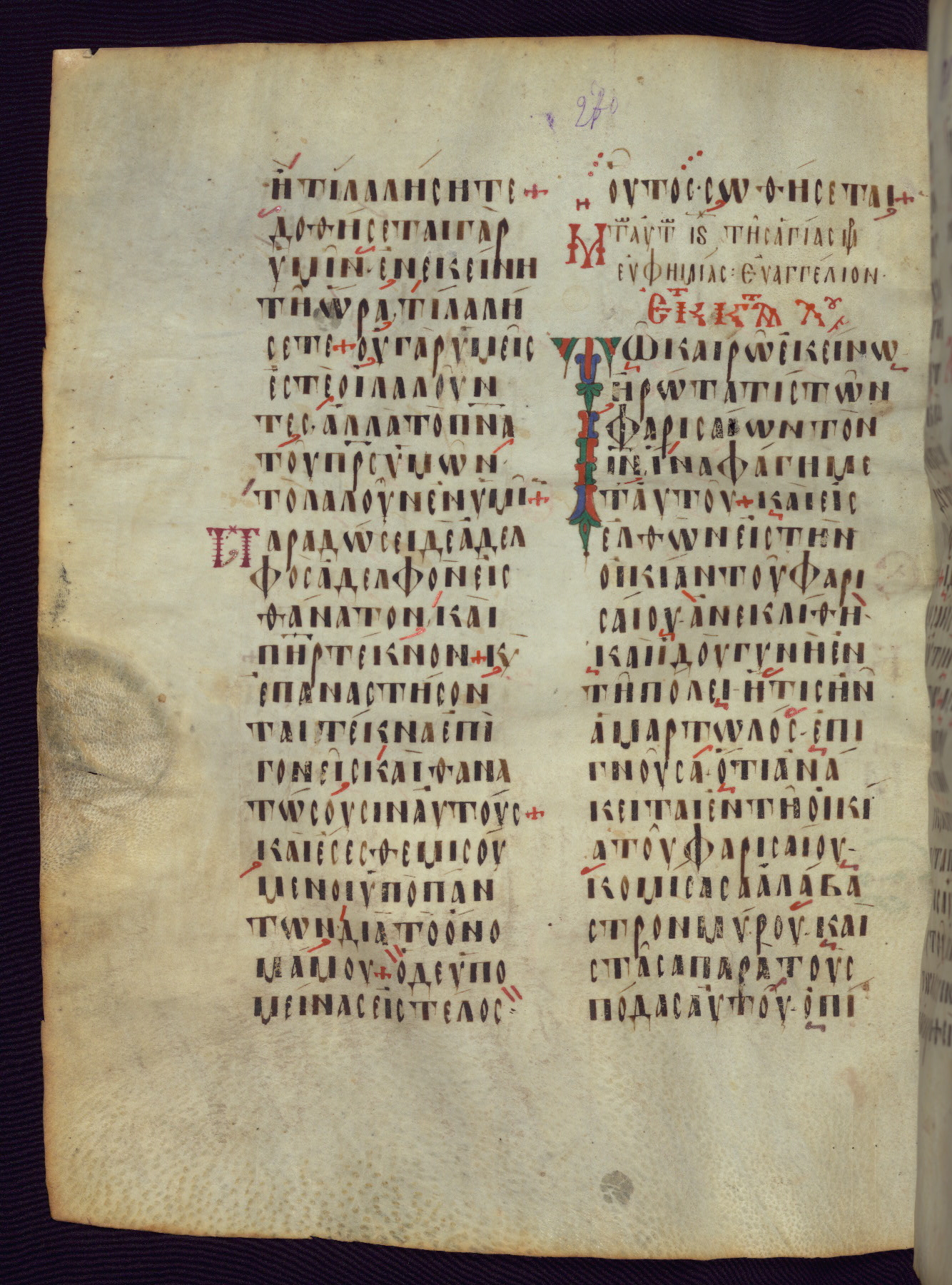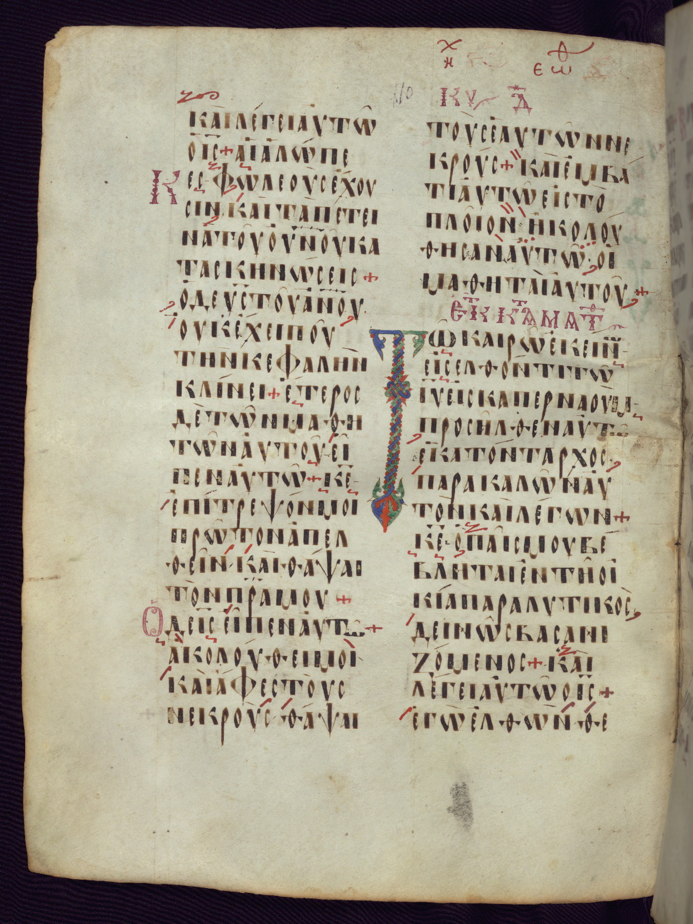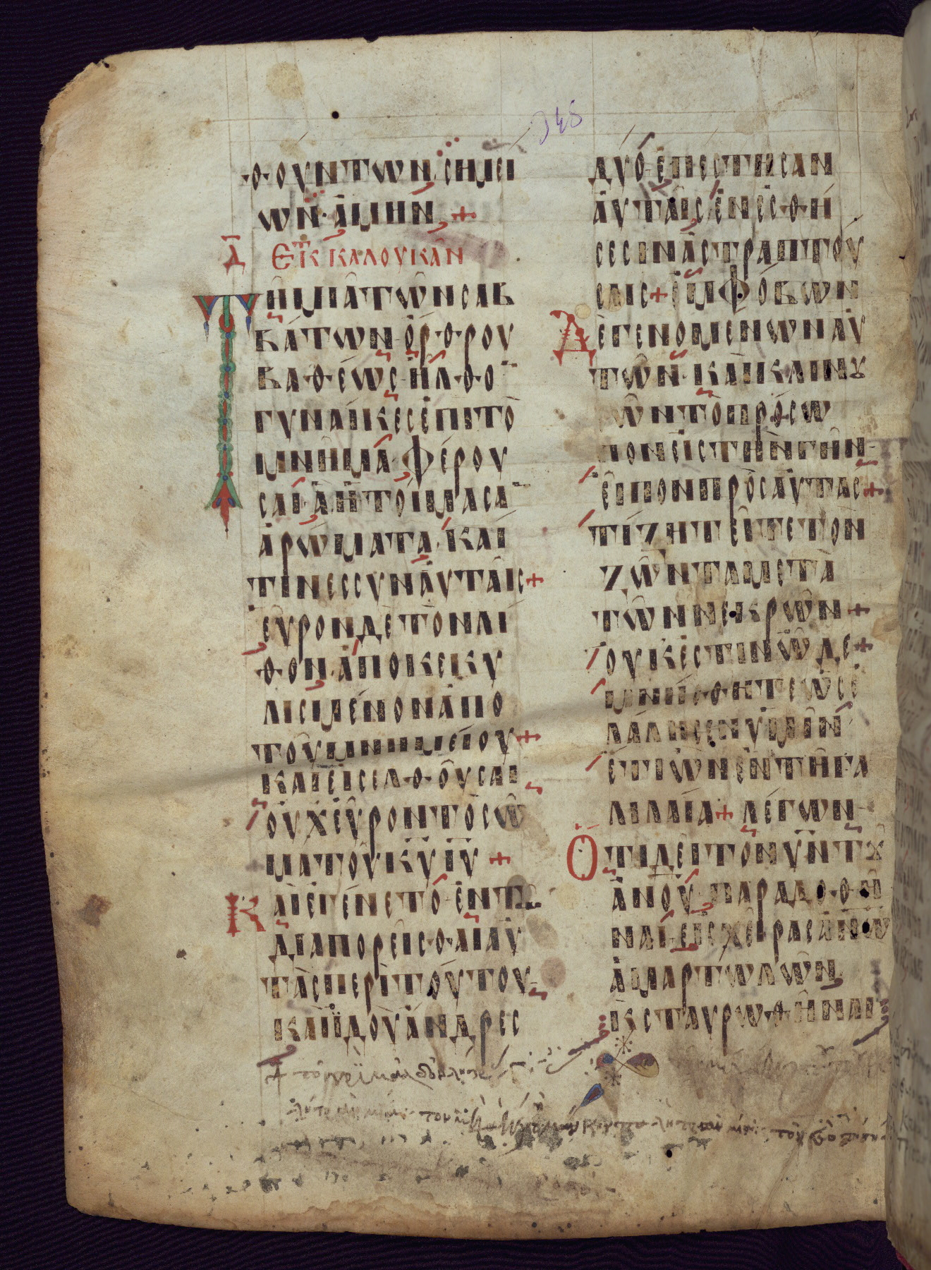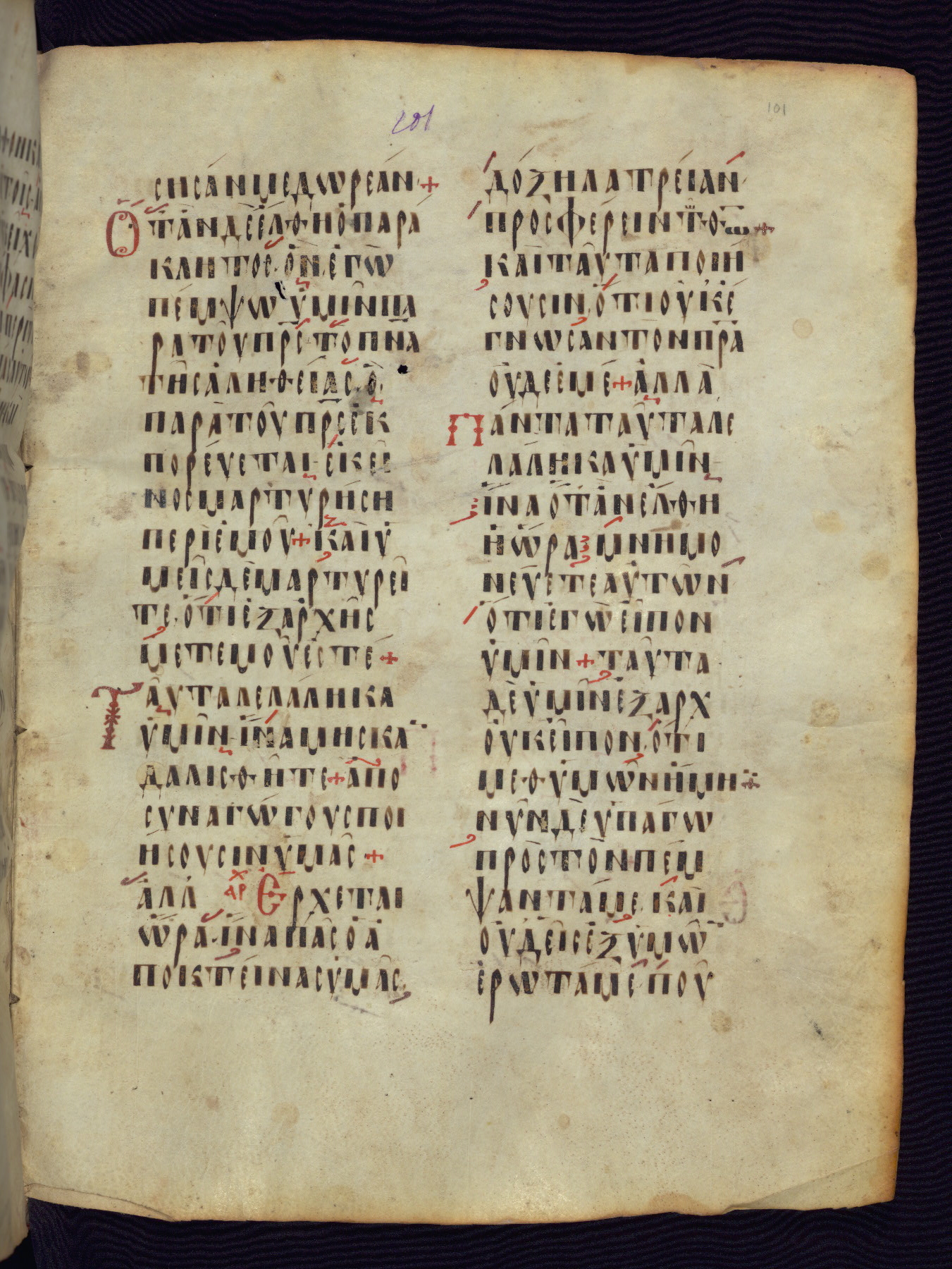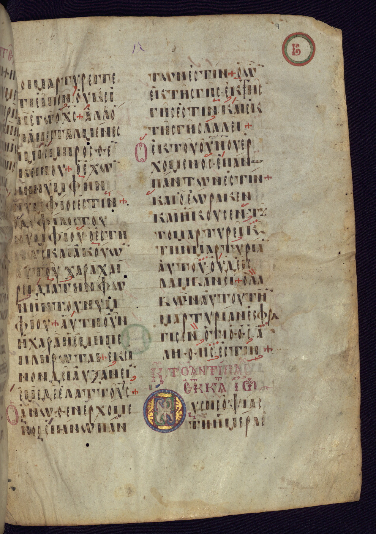This is an example of a Gospel Lectionary written in the archaic, majuscule form of Greek letters. Liturgical books were inherently conservative and therefore commonly retained such antiquated writing. The scribe, a certain monk Theodore, has recorded his name in a verse at the end of the volume (fol. 179v). A leaf removed from this manuscript ca. 1900 is now in Sofia, National Library of Republic of Bulgaria NBKM Gr. 2.