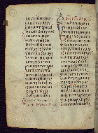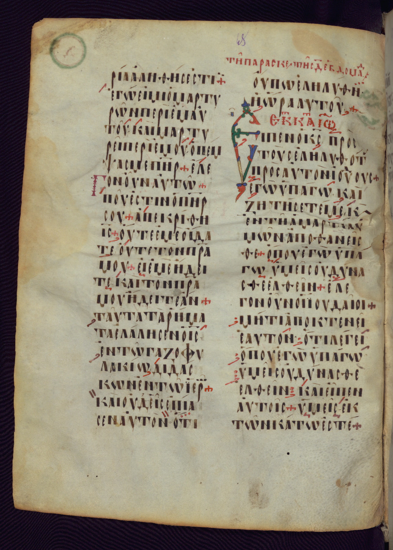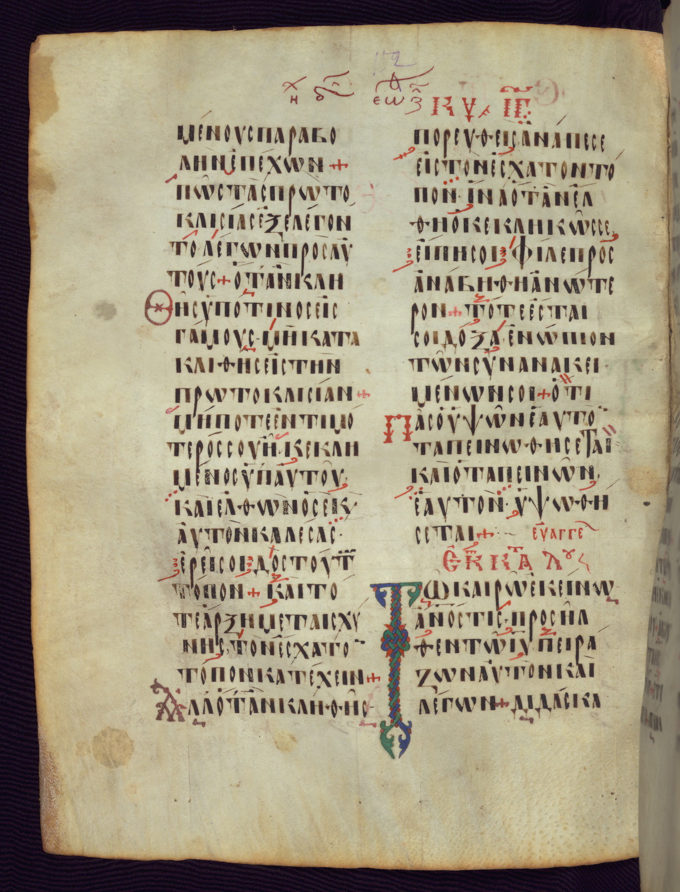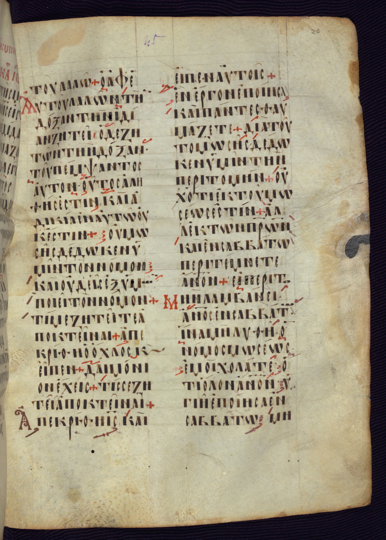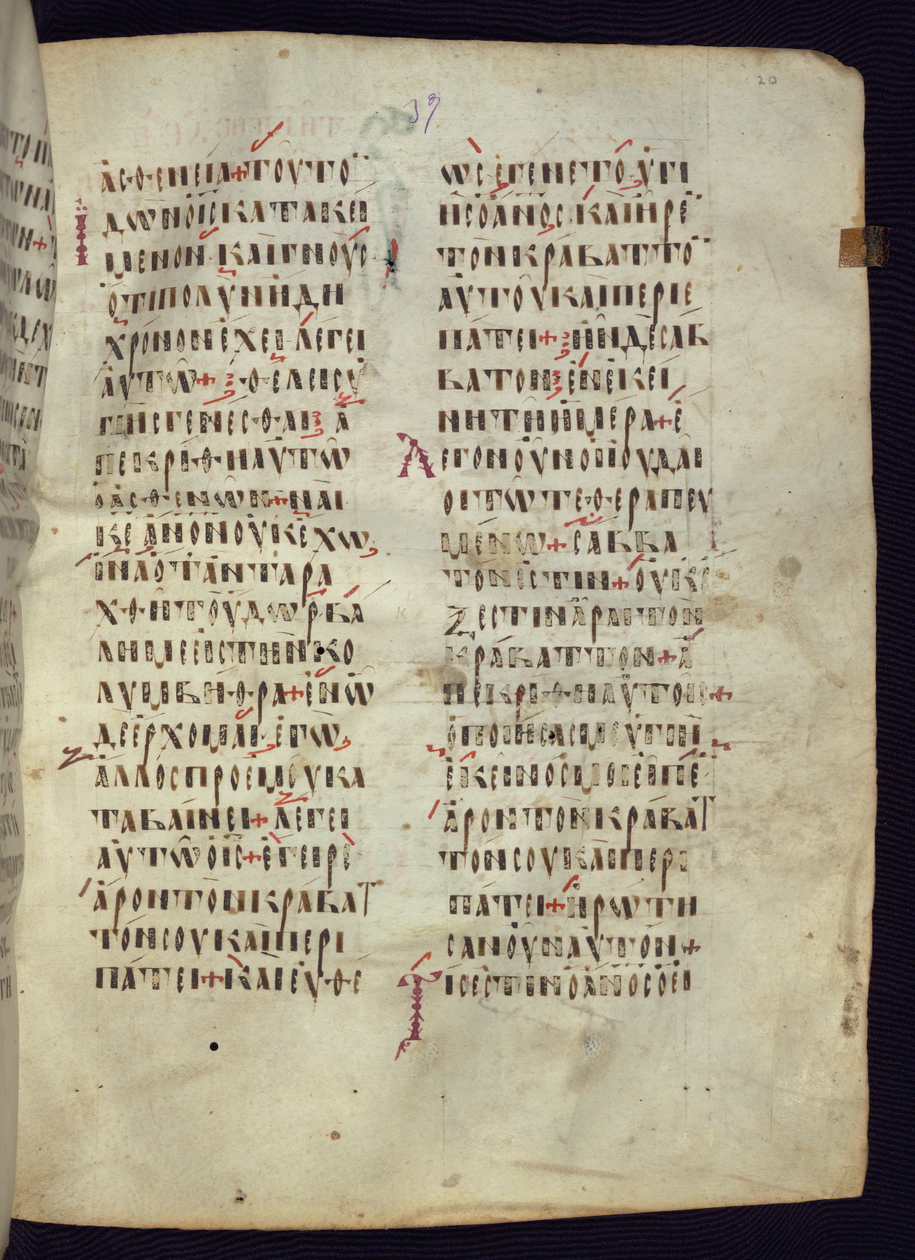 This is an example of a Gospel Lectionary written in the archaic, majuscule form of Greek letters. Liturgical books were inherently conservative and therefore commonly retained such antiquated writing. The scribe, a certain monk Theodore, has recorded his name in a verse at the end of the volume (fol. 179v). A leaf removed from this manuscript ca. 1900 is now in Sofia, National Library of Republic of Bulgaria NBKM Gr. 2.