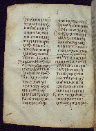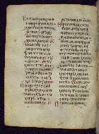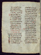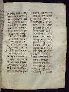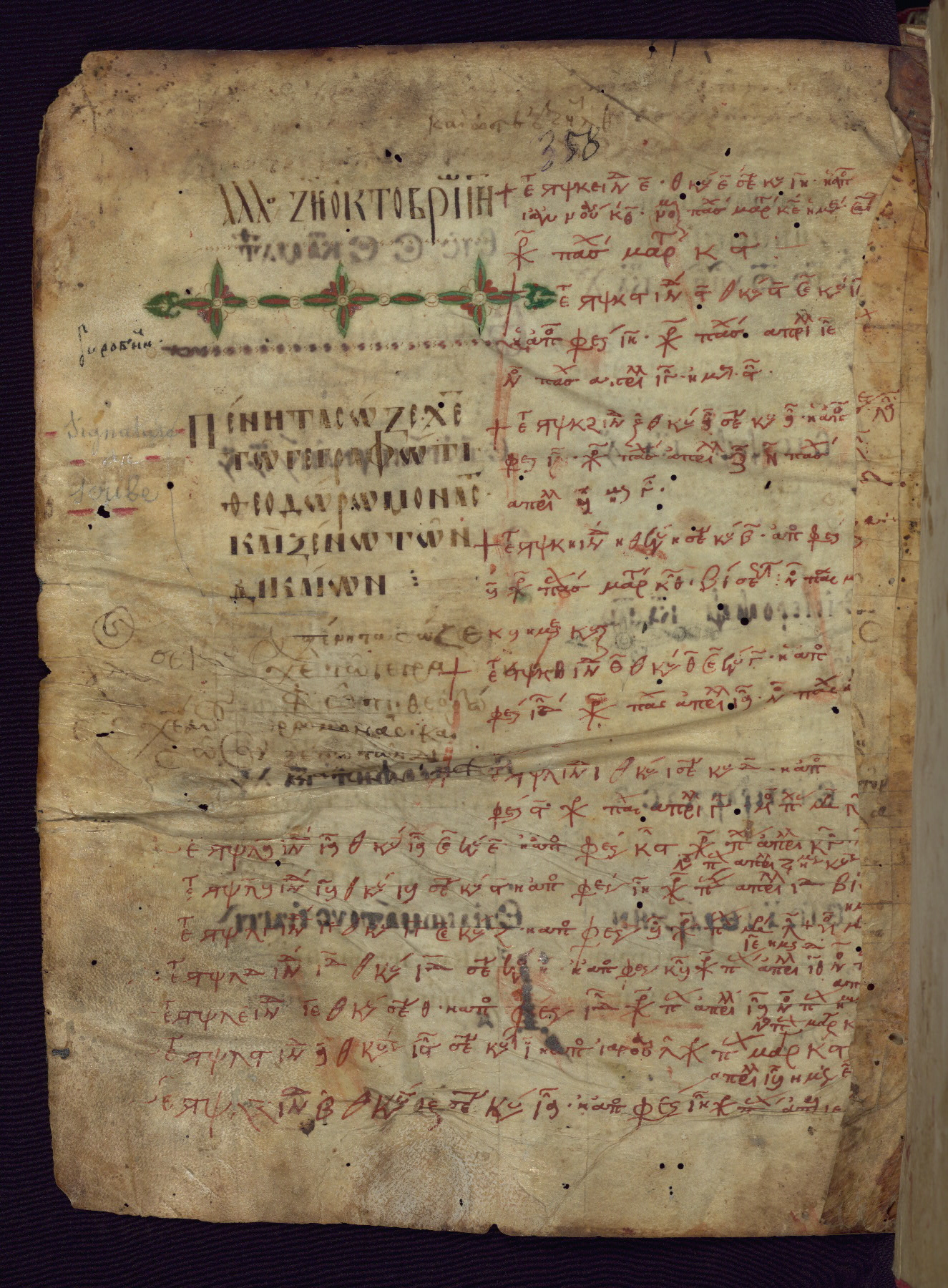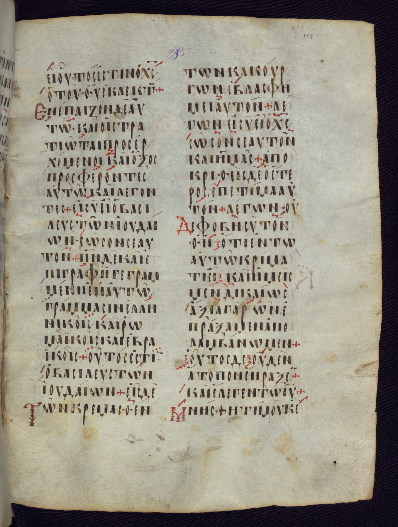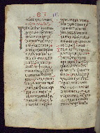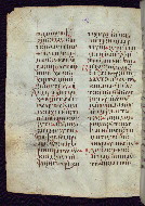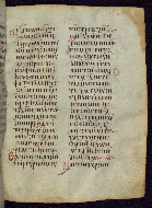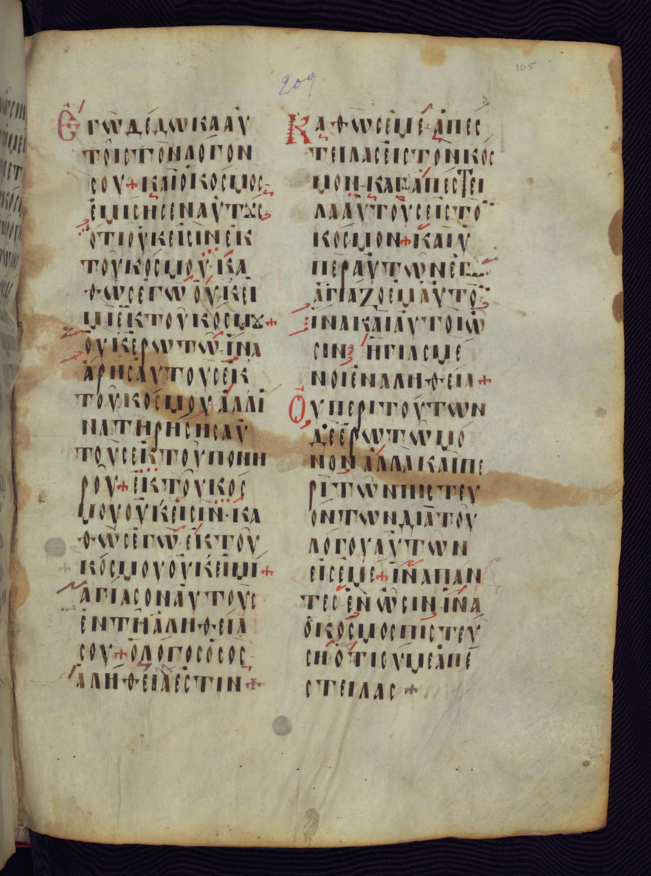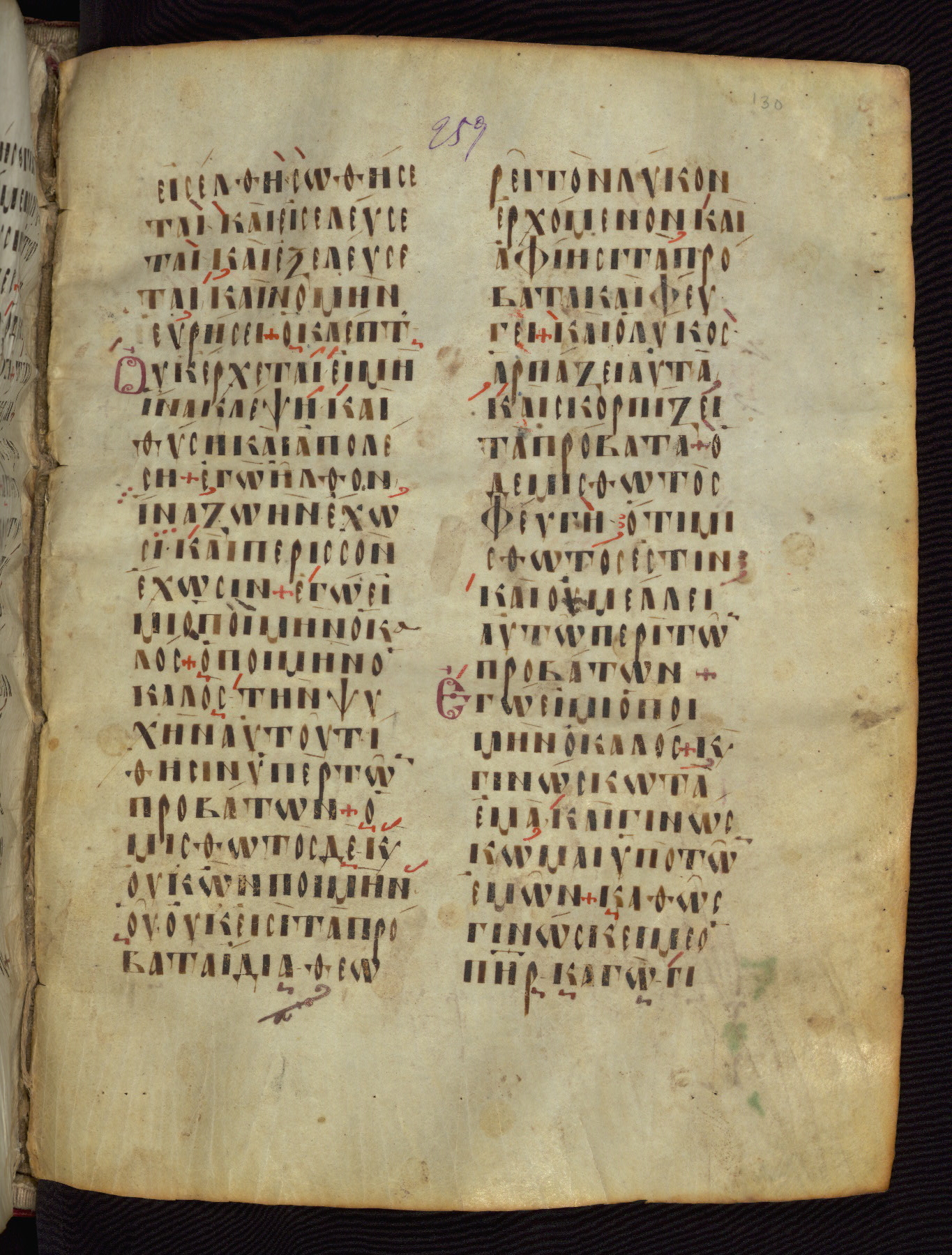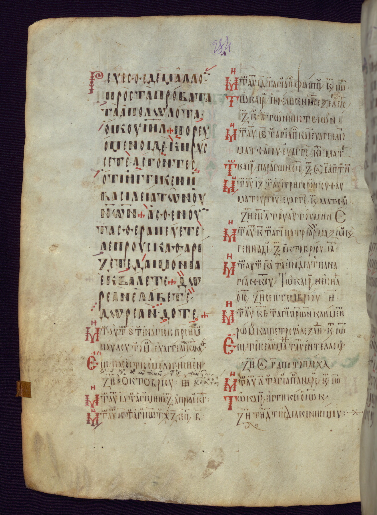This is an example of a Gospel Lectionary written in the archaic, majuscule form of Greek letters. Liturgical books were inherently conservative and therefore commonly retained such antiquated writing. The scribe, a certain monk Theodore, has recorded his name in a verse at the end of the volume (fol. 179v). A leaf removed from this manuscript ca. 1900 is now in Sofia, National Library of Republic of Bulgaria NBKM Gr. 2.