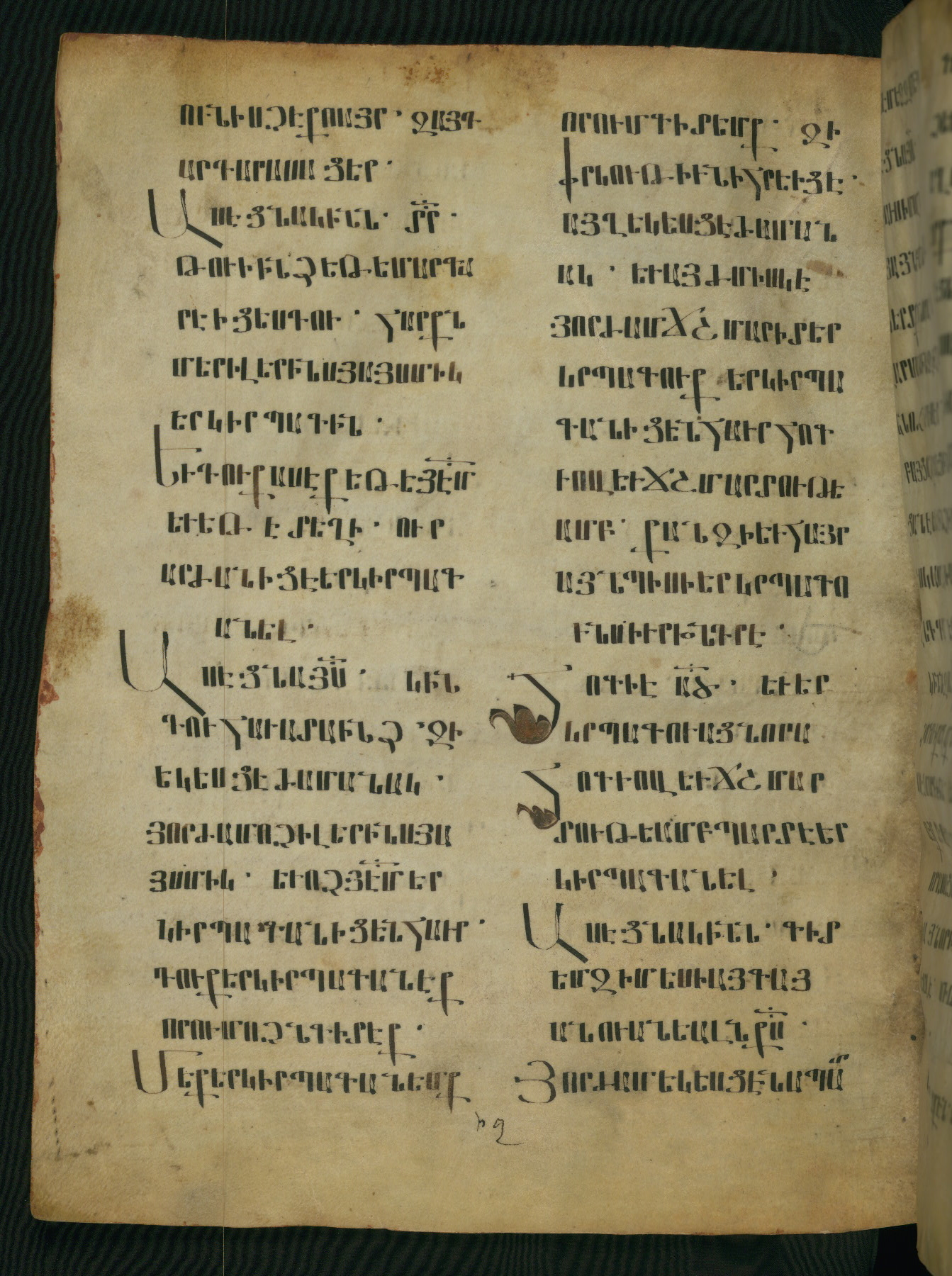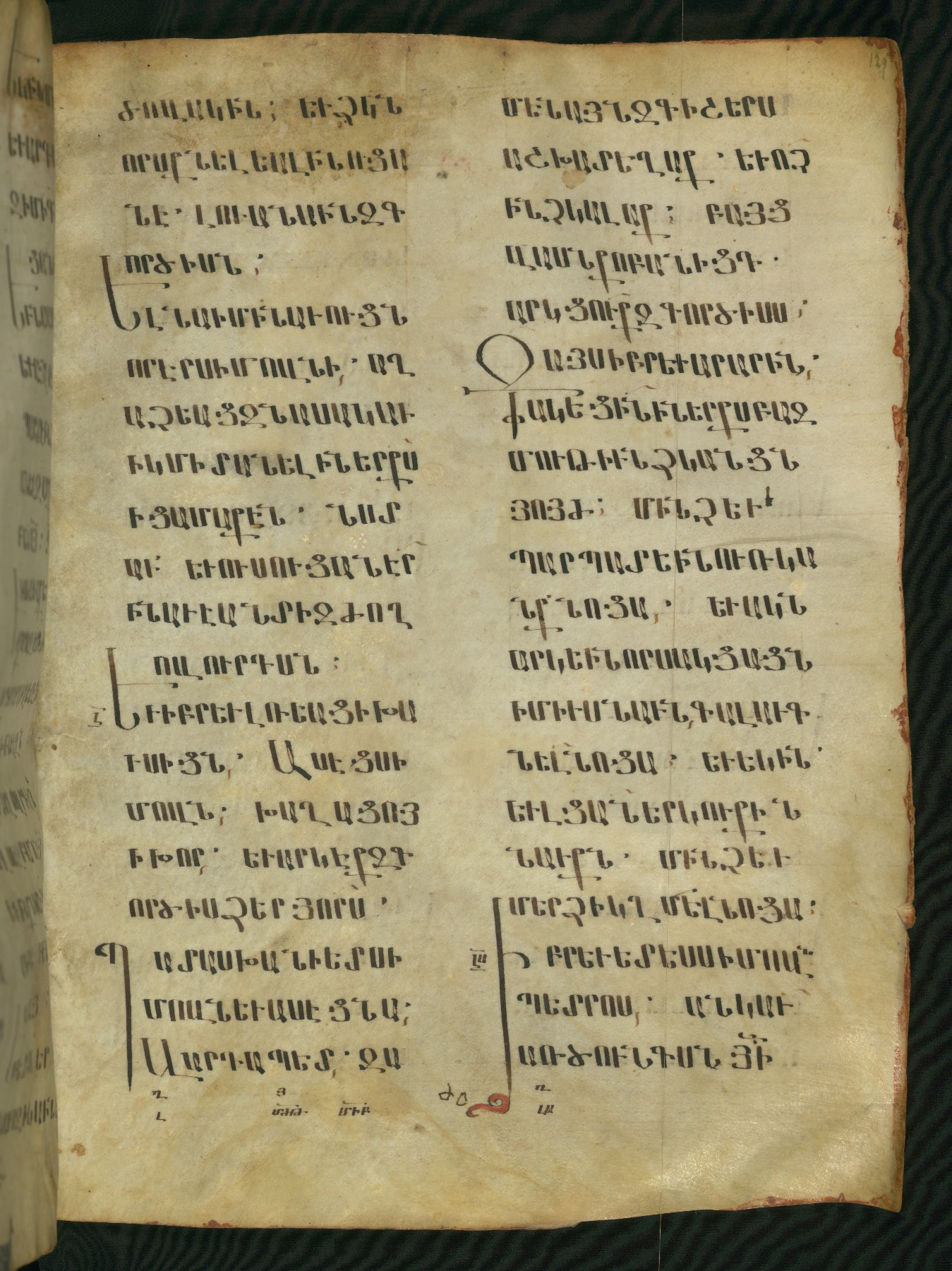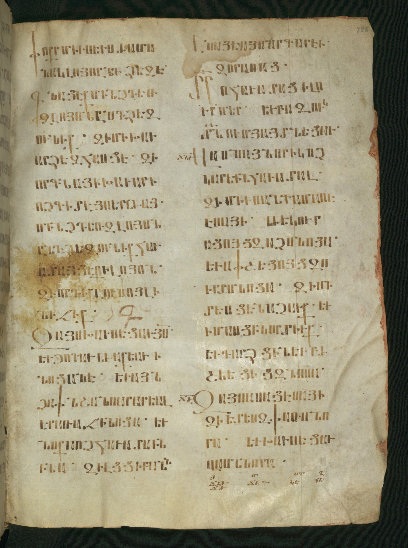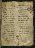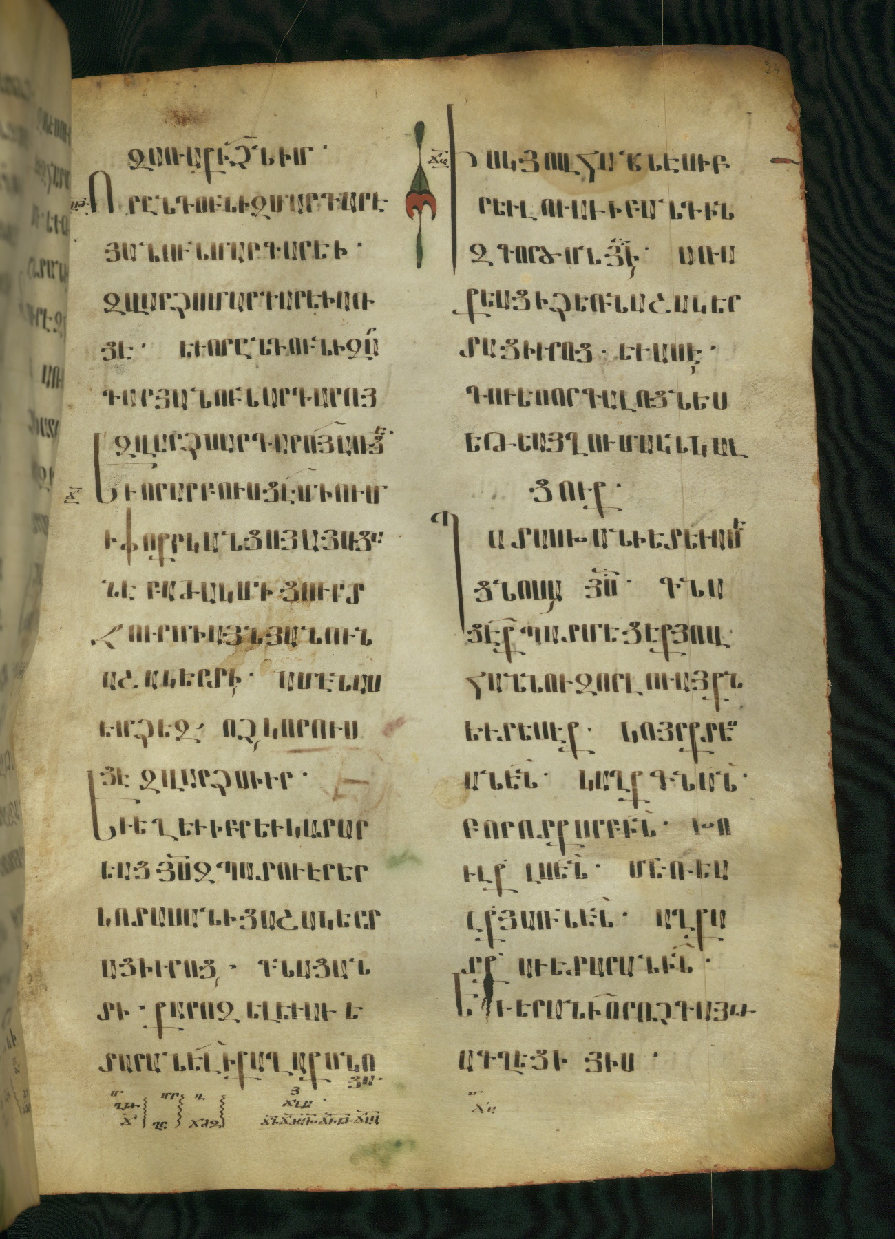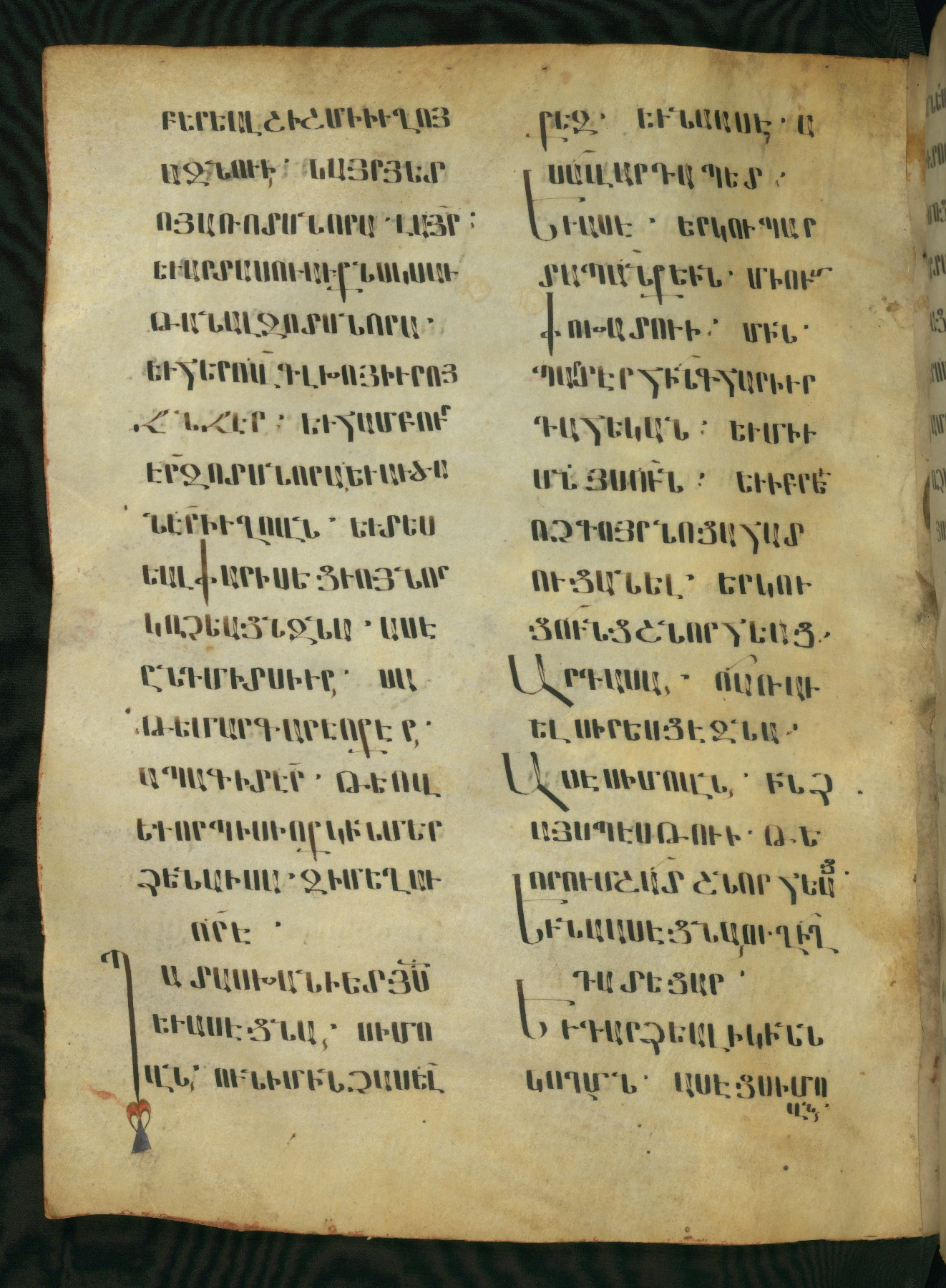 Dated to the tenth century, this manuscript is the oldest Armenian codex in North America and the fifth oldest among documented Armenian Gospel Books. The principal colophon on fol. 2v records that Sargis the Priest completed the text in 415 [966 CE]. Within the framed area, the commission of the codex is described: a priest, whose name was replaced by the later owner T’oros, commissioned the work "as decoration and for the splendor of [the] holy church and for the pleasure of the congregation of Rznēr." As the codex was written and commissioned by priests, the manuscript is referred to as the “Gospels of the Priest.” It was formerly known as the “Gospels of the Translators,” as, following the date 415, someone erased the formula “of the Armenian era” and replaced it with “of our Lord,” suggesting an earlier date and implying that the text was based on the original translation of the Gospels into Armenian during the fifth century. The text is copied in large angular erkat‘agir script. The full-page paintings and marginal ornaments bear stylistic characteristics of Armenian illumination of the tenth and eleventh centuries associated with non-royal patronage. The illustrations comprise the Canon Tables, with only the last two remaining; the Virgin and Child on a wheeled chariot; the framed colophon; ornamental cross with donor’s portrait; portraits of Mathew and Mark together (fol. 72v, at the end of Matthew) and Mark with Luke (fol. 114v, at the end of Mark); two final images depict unknown saints (fol. 192r, at the end of Luke). Marginalia are found throughout the text. It has been suggested that the scribe was also responsible for the illumination.