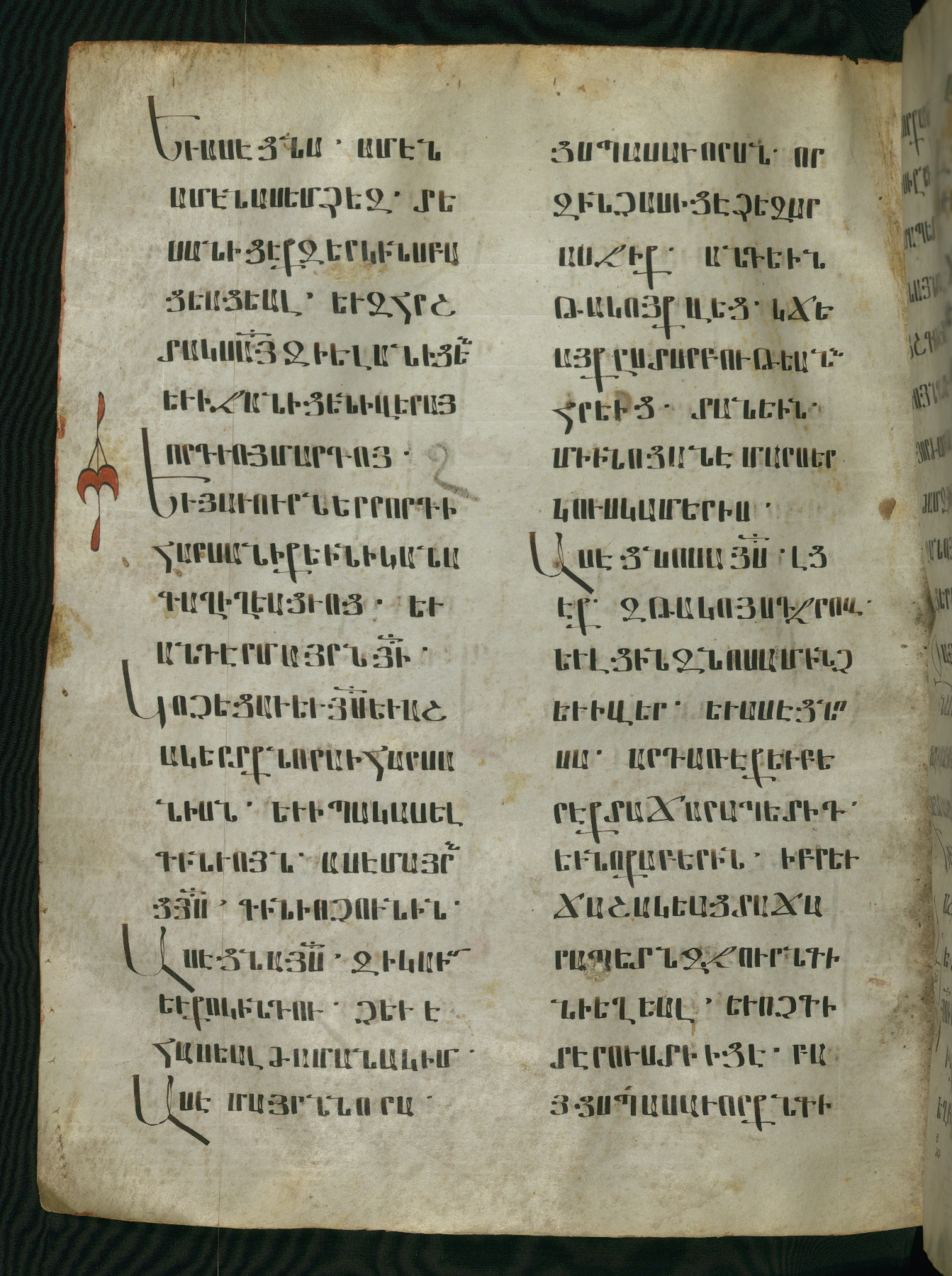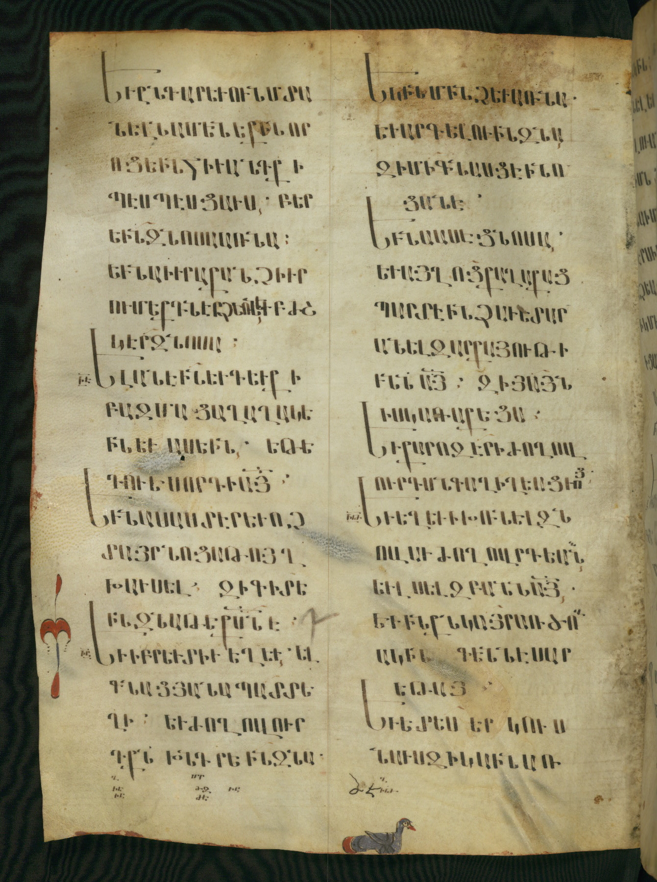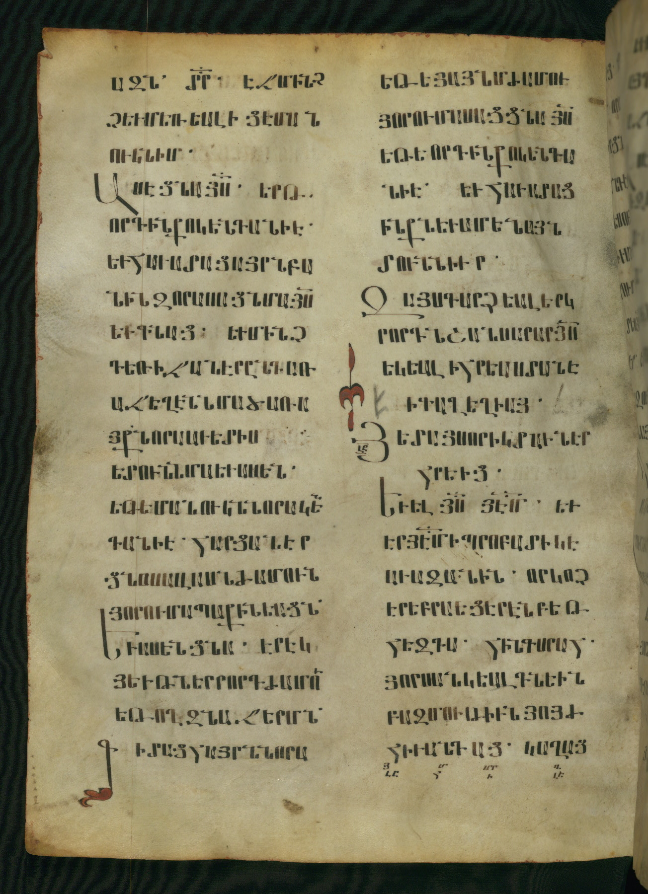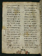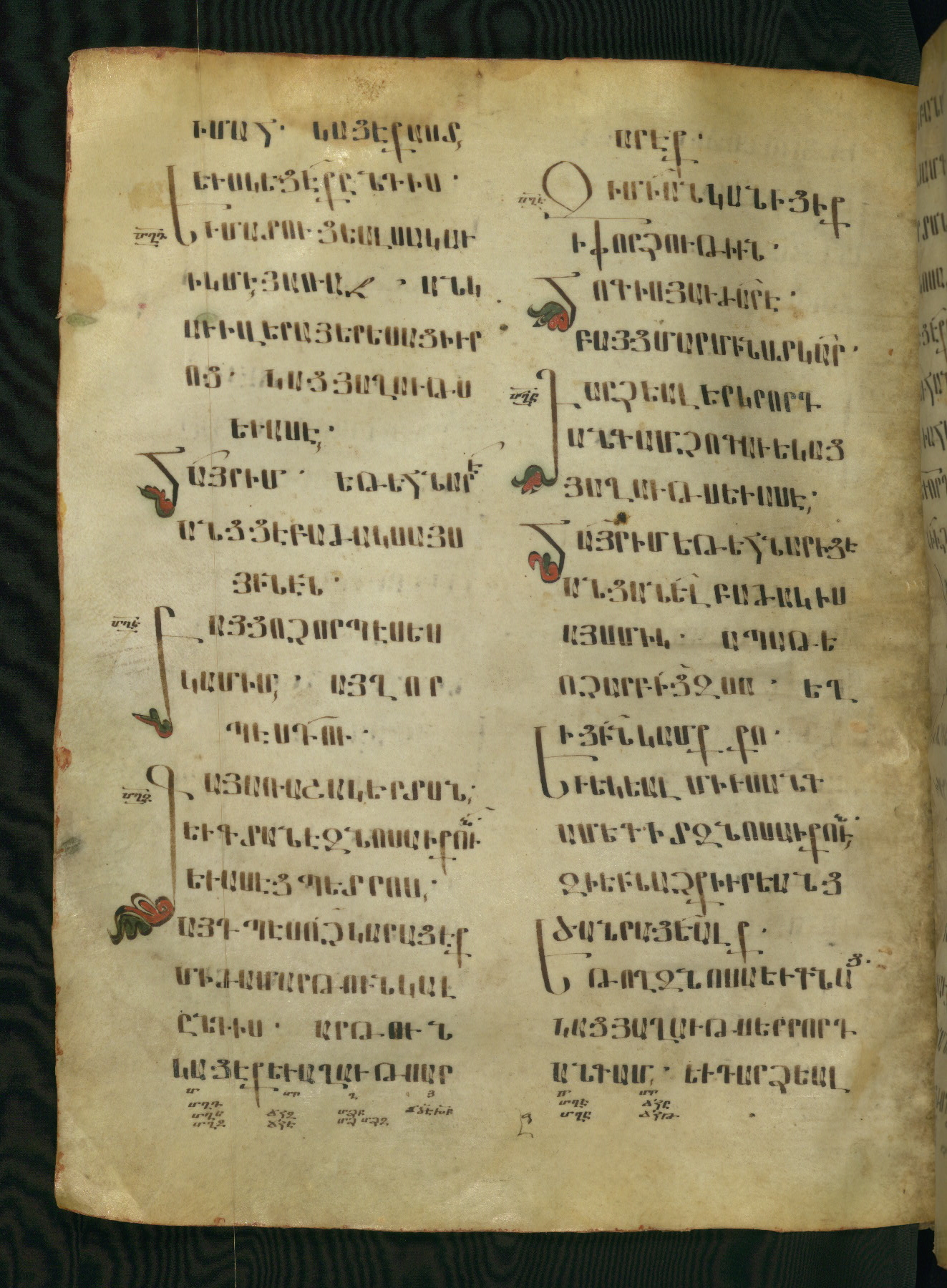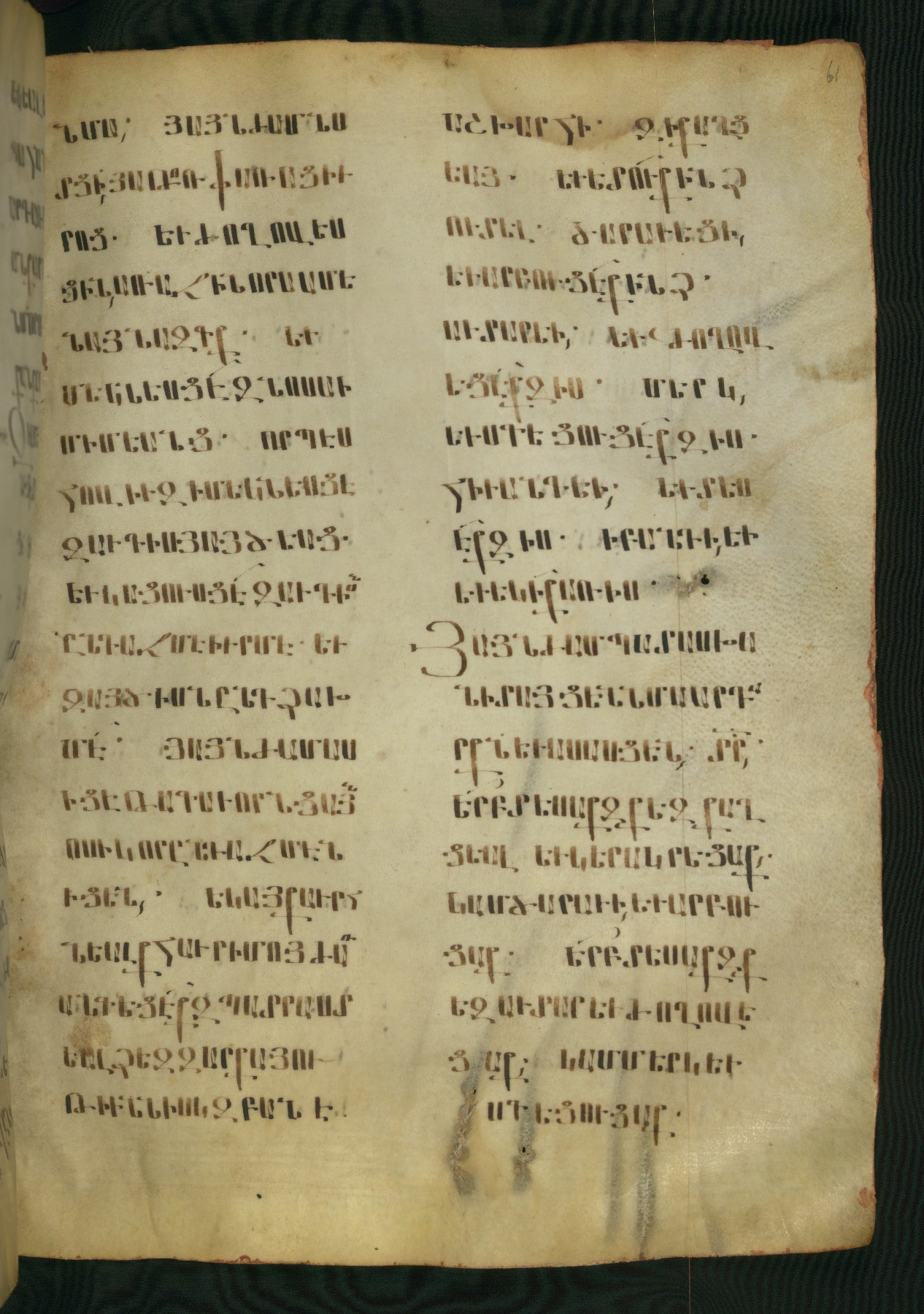 Dated to the tenth century, this manuscript is the oldest Armenian codex in North America and the fifth oldest among documented Armenian Gospel Books. The principal colophon on fol. 2v records that Sargis the Priest completed the text in 415 [966 CE]. Within the framed area, the commission of the codex is described: a priest, whose name was replaced by the later owner T’oros, commissioned the work "as decoration and for the splendor of [the] holy church and for the pleasure of the congregation of Rznēr." As the codex was written and commissioned by priests, the manuscript is referred to as the “Gospels of the Priest.” It was formerly known as the “Gospels of the Translators,” as, following the date 415, someone erased the formula “of the Armenian era” and replaced it with “of our Lord,” suggesting an earlier date and implying that the text was based on the original translation of the Gospels into Armenian during the fifth century. The text is copied in large angular erkat‘agir script. The full-page paintings and marginal ornaments bear stylistic characteristics of Armenian illumination of the tenth and eleventh centuries associated with non-royal patronage. The illustrations comprise the Canon Tables, with only the last two remaining; the Virgin and Child on a wheeled chariot; the framed colophon; ornamental cross with donor’s portrait; portraits of Mathew and Mark together (fol. 72v, at the end of Matthew) and Mark with Luke (fol. 114v, at the end of Mark); two final images depict unknown saints (fol. 192r, at the end of Luke). Marginalia are found throughout the text. It has been suggested that the scribe was also responsible for the illumination.
