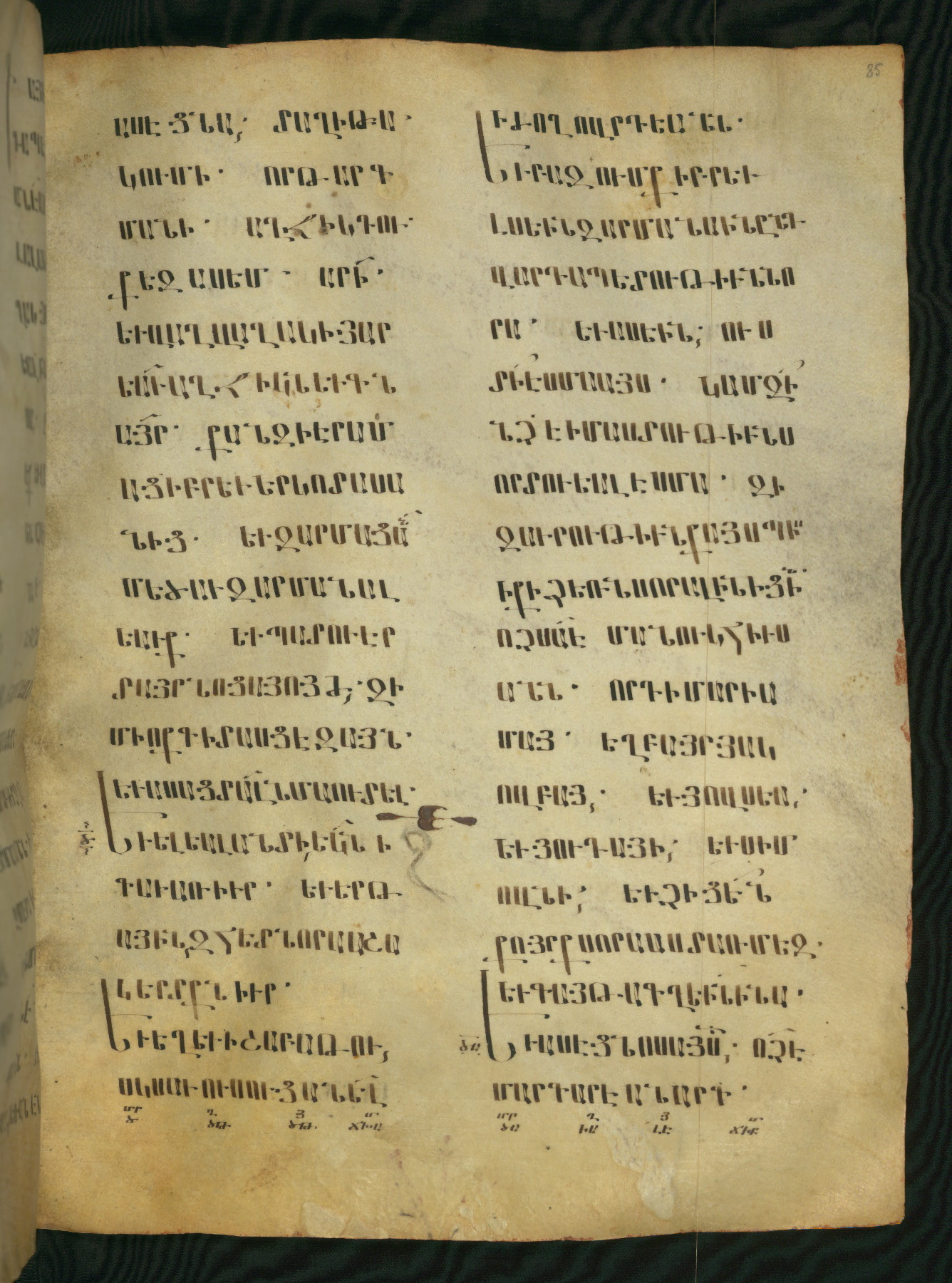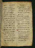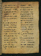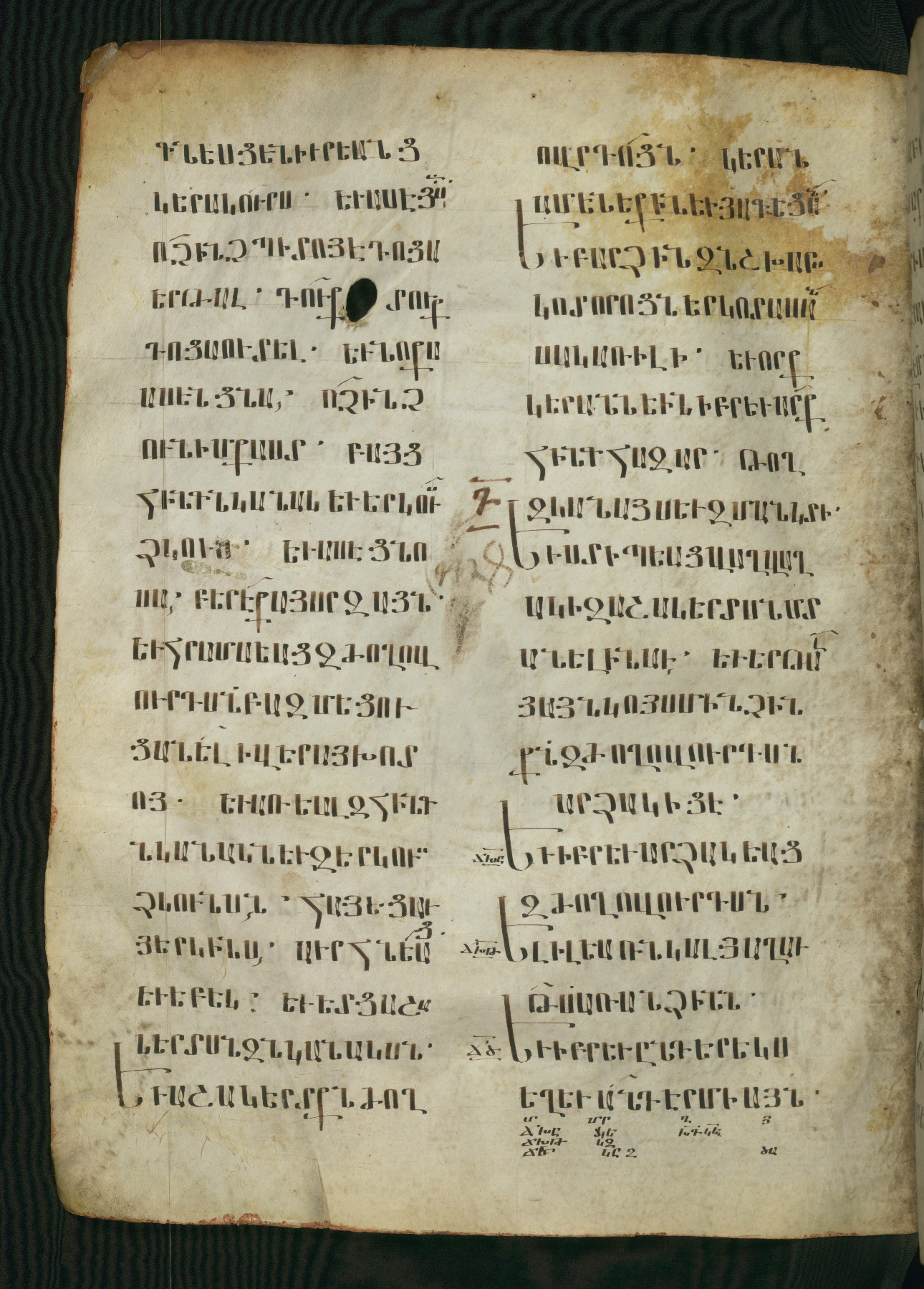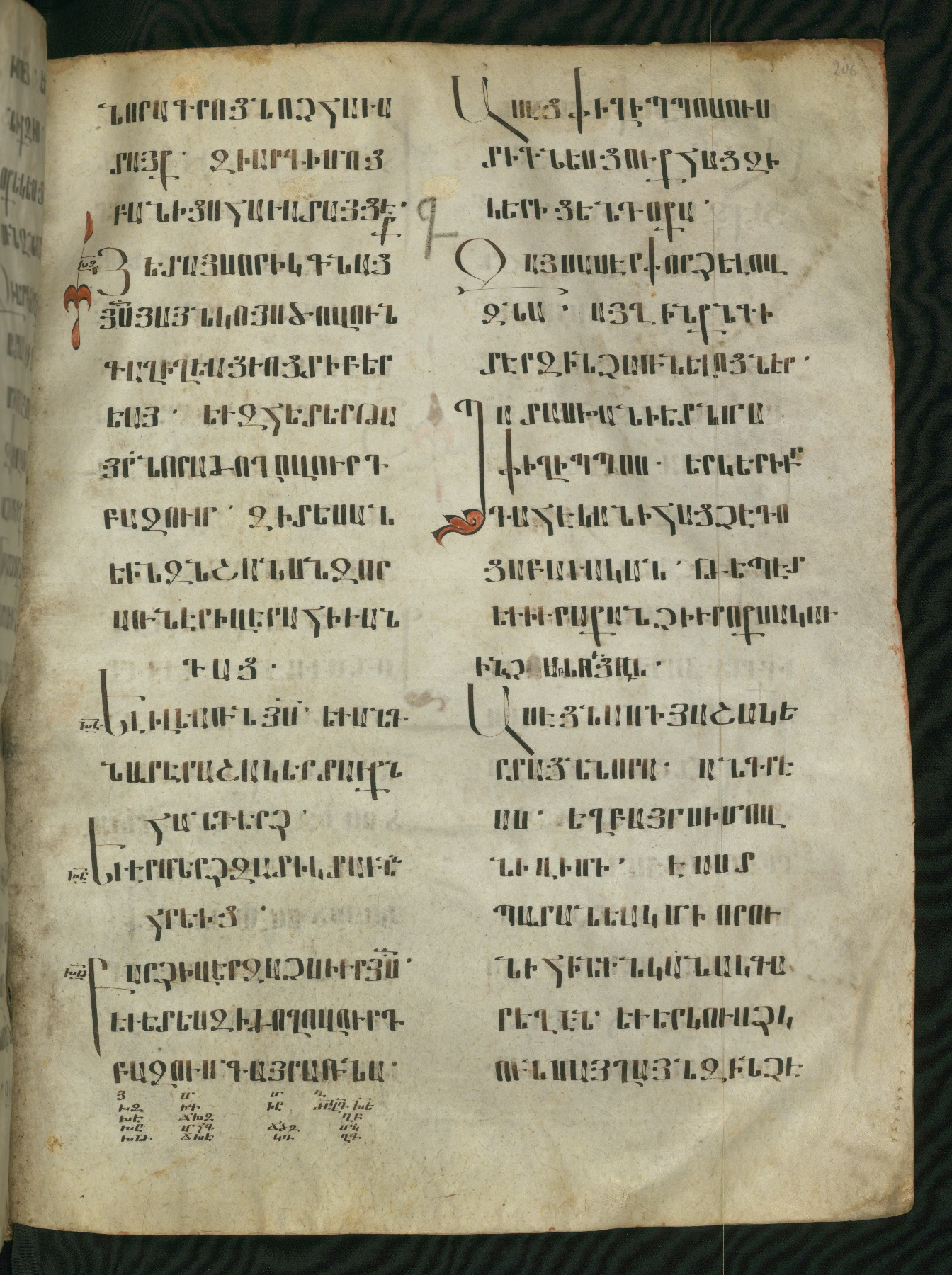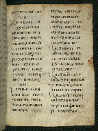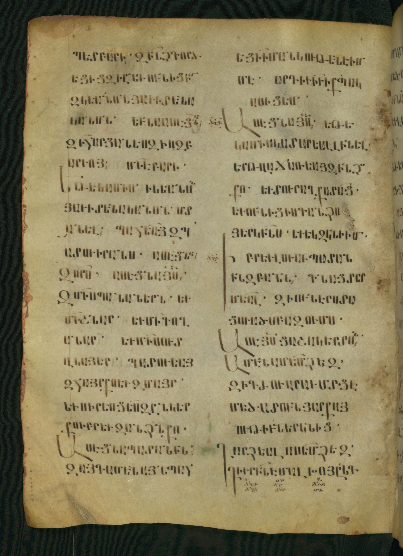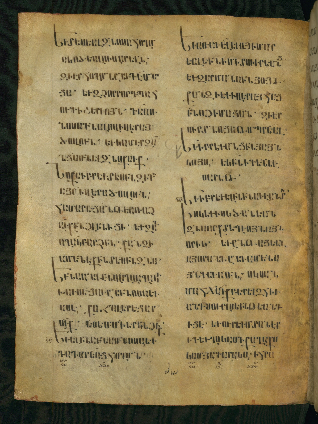 Dated to the tenth century, this manuscript is the oldest Armenian codex in North America and the fifth oldest among documented Armenian Gospel Books. The principal colophon on fol. 2v records that Sargis the Priest completed the text in 415 [966 CE]. Within the framed area, the commission of the codex is described: a priest, whose name was replaced by the later owner T’oros, commissioned the work "as decoration and for the splendor of [the] holy church and for the pleasure of the congregation of Rznēr." As the codex was written and commissioned by priests, the manuscript is referred to as the “Gospels of the Priest.” It was formerly known as the “Gospels of the Translators,” as, following the date 415, someone erased the formula “of the Armenian era” and replaced it with “of our Lord,” suggesting an earlier date and implying that the text was based on the original translation of the Gospels into Armenian during the fifth century. The text is copied in large angular erkat‘agir script. The full-page paintings and marginal ornaments bear stylistic characteristics of Armenian illumination of the tenth and eleventh centuries associated with non-royal patronage. The illustrations comprise the Canon Tables, with only the last two remaining; the Virgin and Child on a wheeled chariot; the framed colophon; ornamental cross with donor’s portrait; portraits of Mathew and Mark together (fol. 72v, at the end of Matthew) and Mark with Luke (fol. 114v, at the end of Mark); two final images depict unknown saints (fol. 192r, at the end of Luke). Marginalia are found throughout the text. It has been suggested that the scribe was also responsible for the illumination.