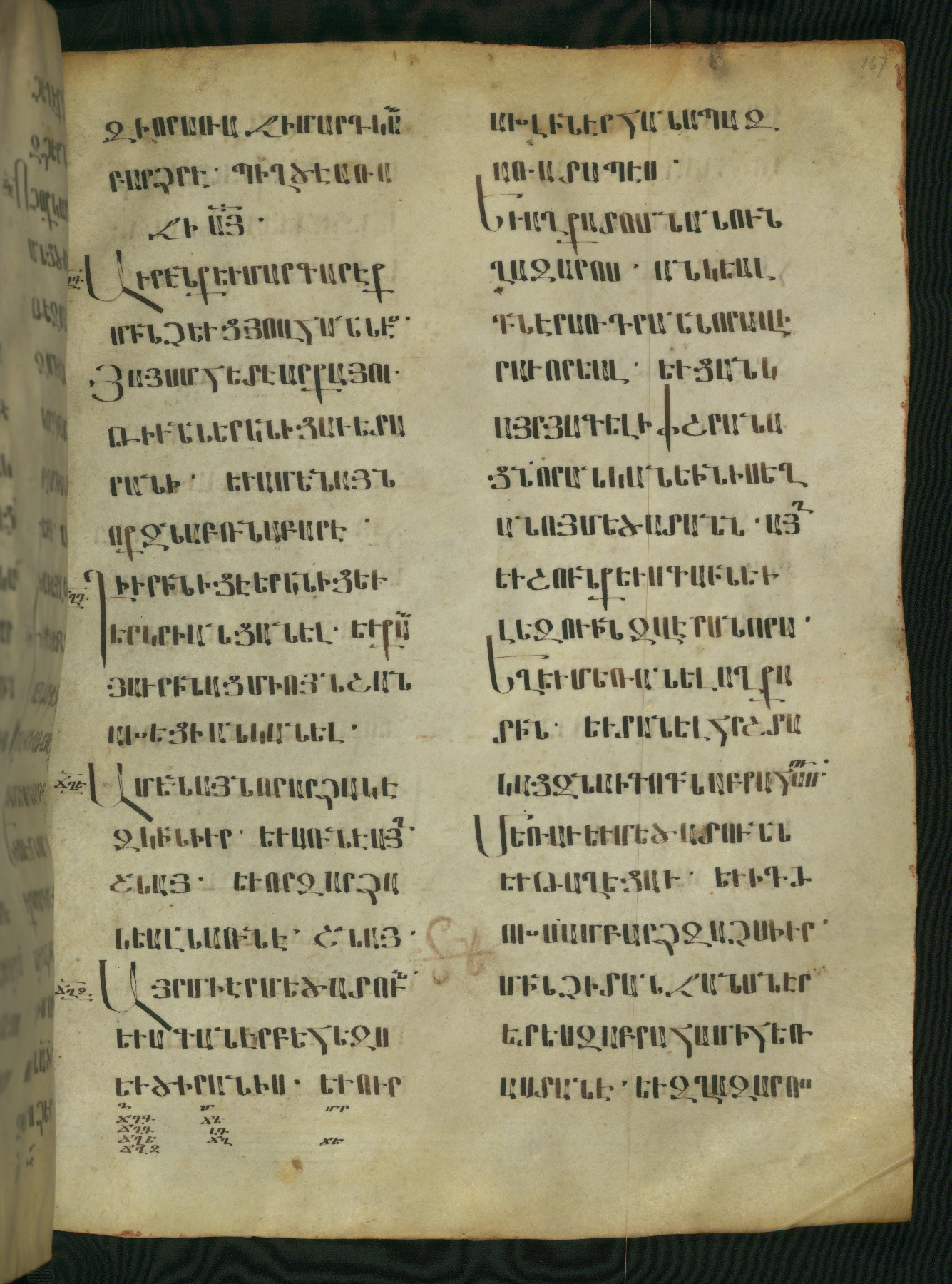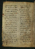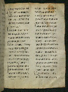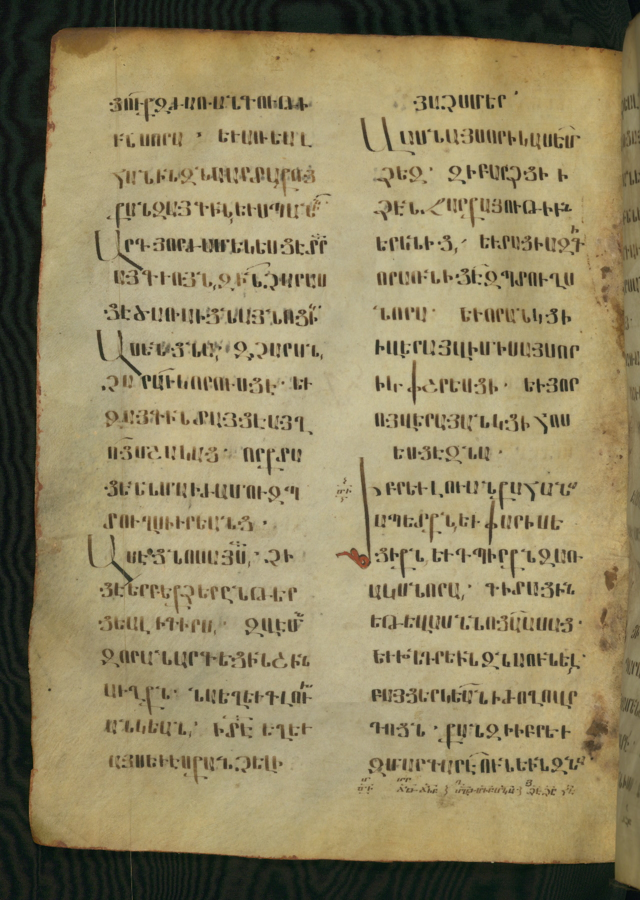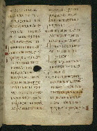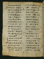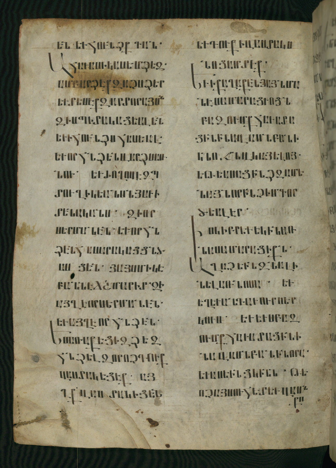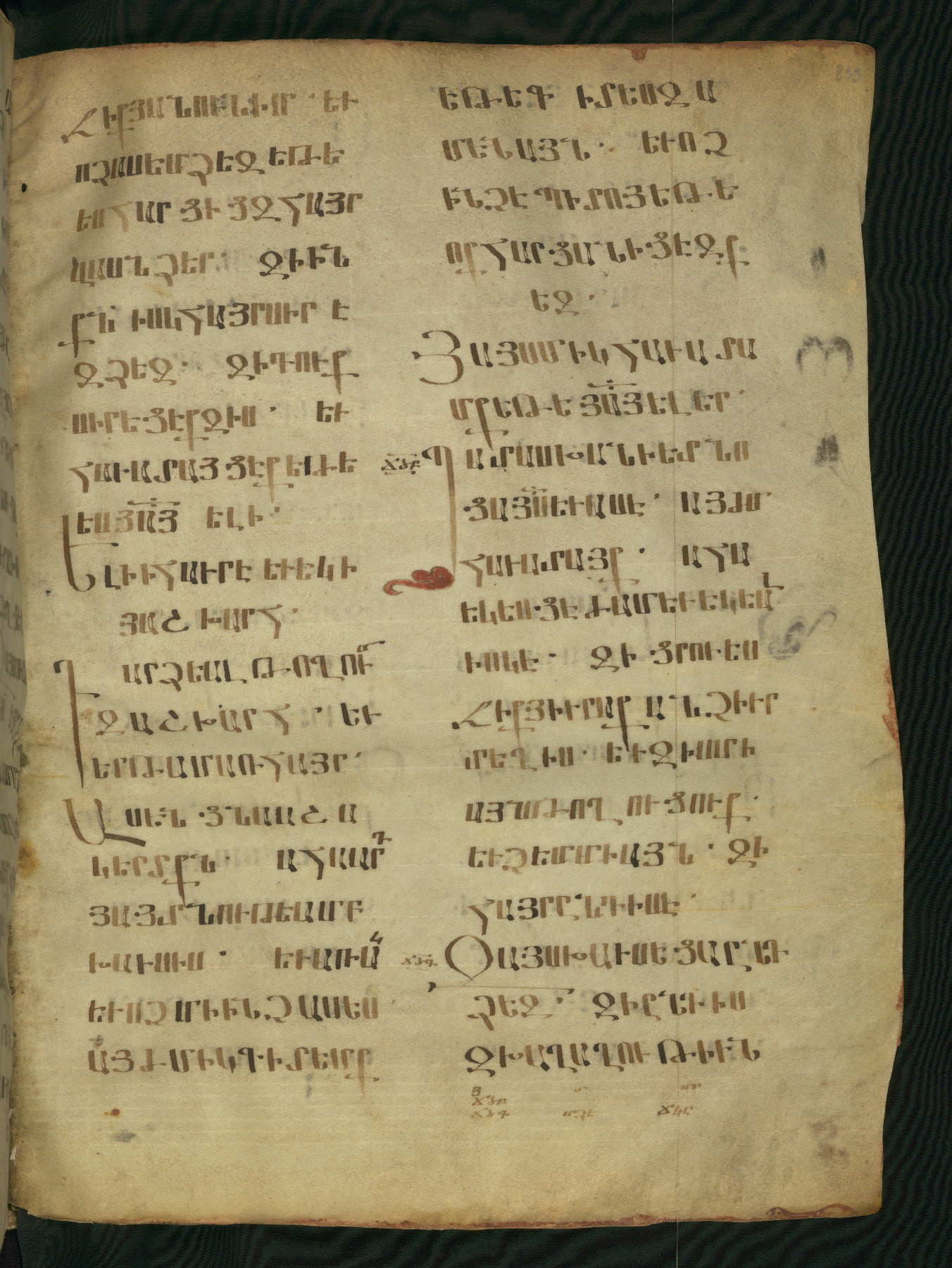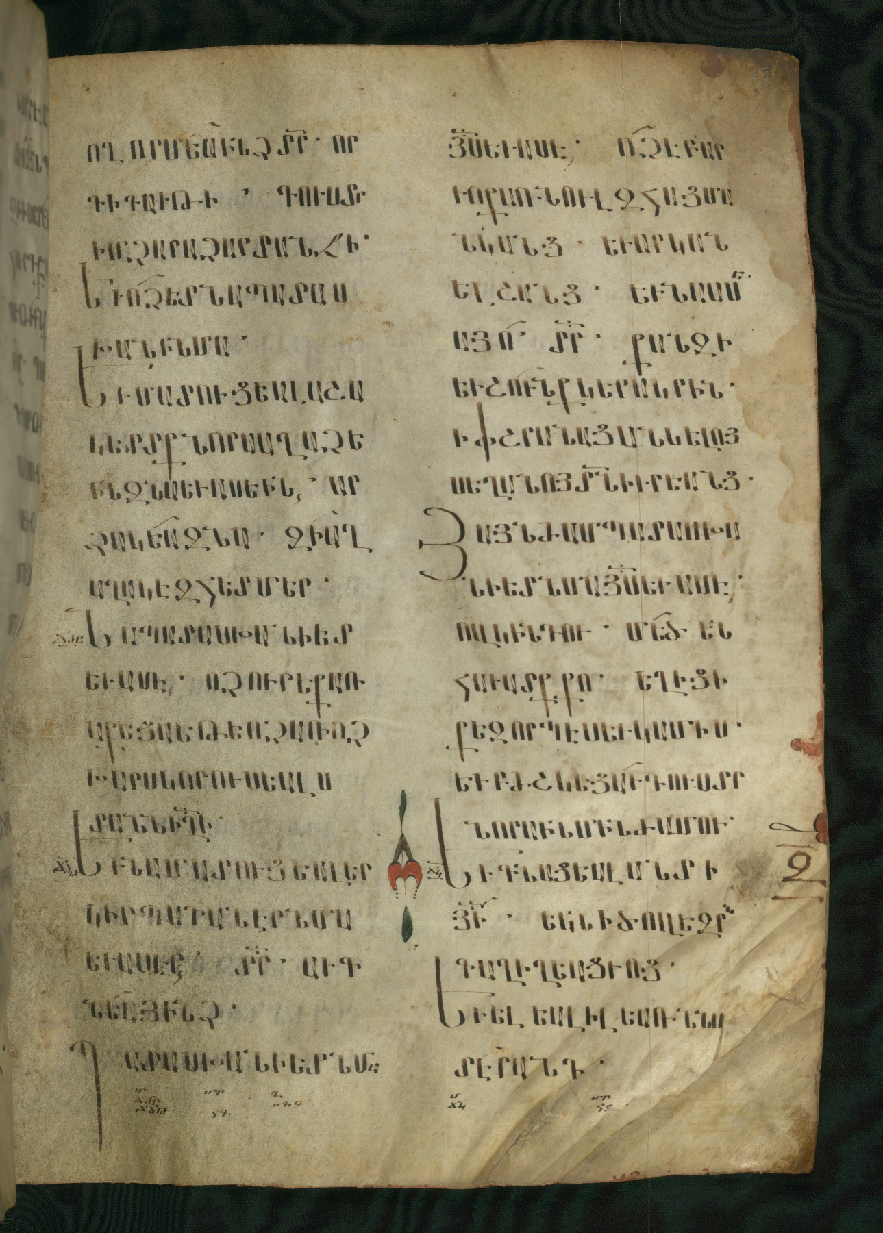 Dated to the tenth century, this manuscript is the oldest Armenian codex in North America and the fifth oldest among documented Armenian Gospel Books. The principal colophon on fol. 2v records that Sargis the Priest completed the text in 415 [966 CE]. Within the framed area, the commission of the codex is described: a priest, whose name was replaced by the later owner T’oros, commissioned the work "as decoration and for the splendor of [the] holy church and for the pleasure of the congregation of Rznēr." As the codex was written and commissioned by priests, the manuscript is referred to as the “Gospels of the Priest.” It was formerly known as the “Gospels of the Translators,” as, following the date 415, someone erased the formula “of the Armenian era” and replaced it with “of our Lord,” suggesting an earlier date and implying that the text was based on the original translation of the Gospels into Armenian during the fifth century. The text is copied in large angular erkat‘agir script. The full-page paintings and marginal ornaments bear stylistic characteristics of Armenian illumination of the tenth and eleventh centuries associated with non-royal patronage. The illustrations comprise the Canon Tables, with only the last two remaining; the Virgin and Child on a wheeled chariot; the framed colophon; ornamental cross with donor’s portrait; portraits of Mathew and Mark together (fol. 72v, at the end of Matthew) and Mark with Luke (fol. 114v, at the end of Mark); two final images depict unknown saints (fol. 192r, at the end of Luke). Marginalia are found throughout the text. It has been suggested that the scribe was also responsible for the illumination.