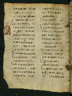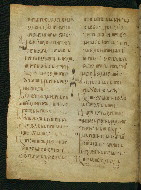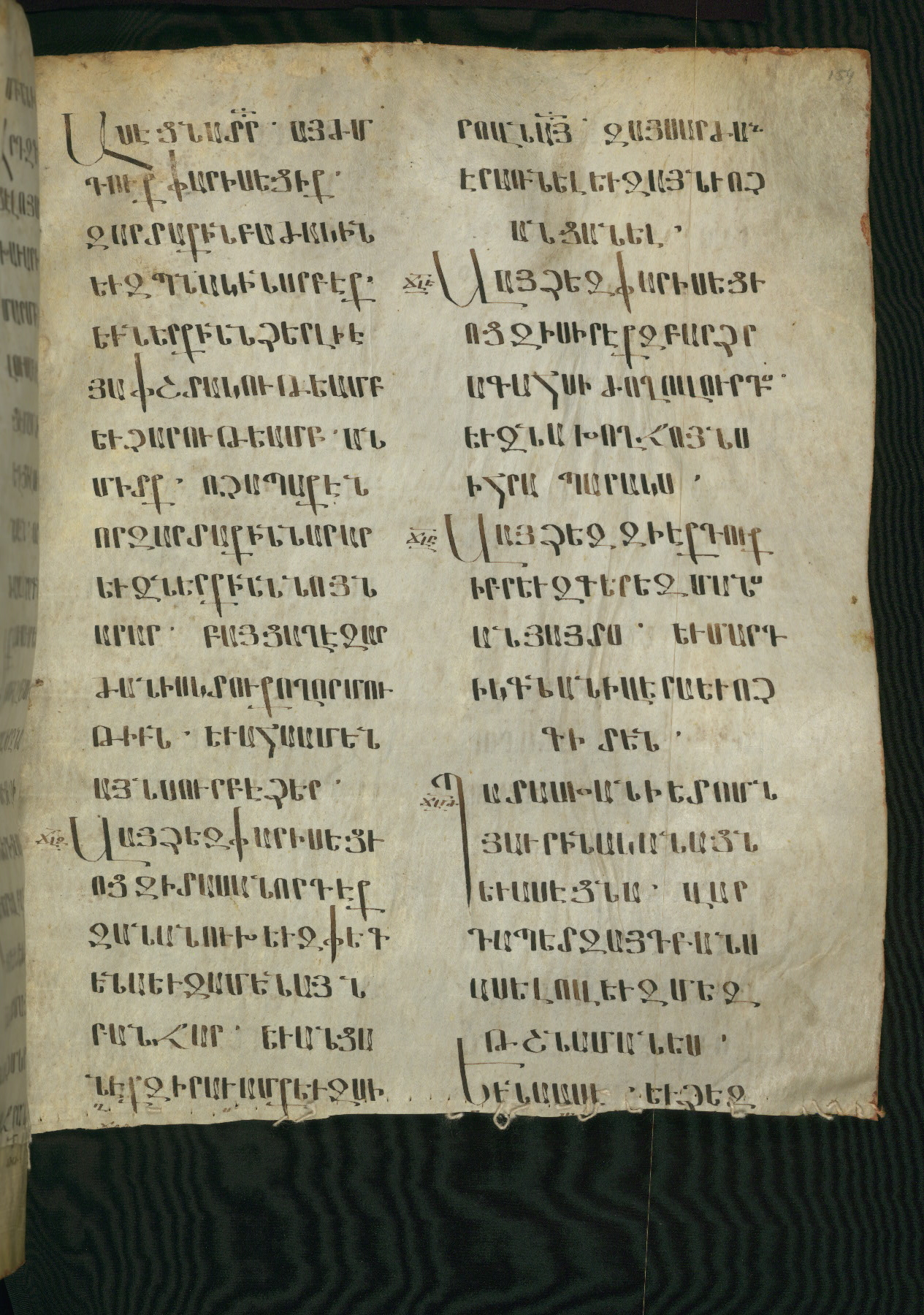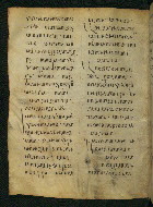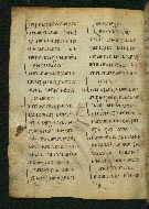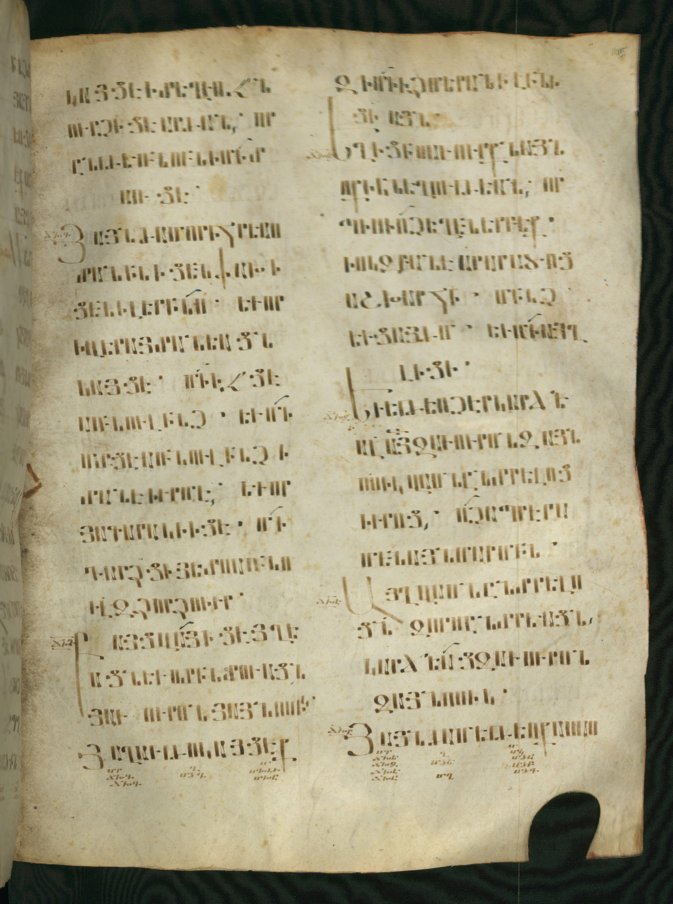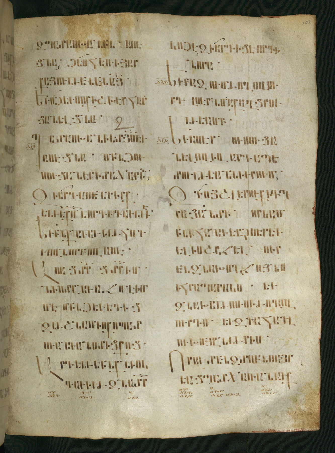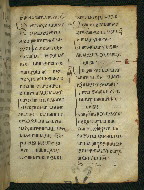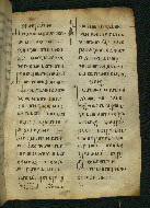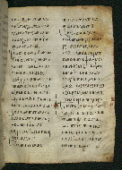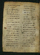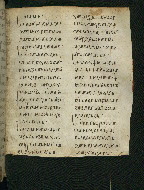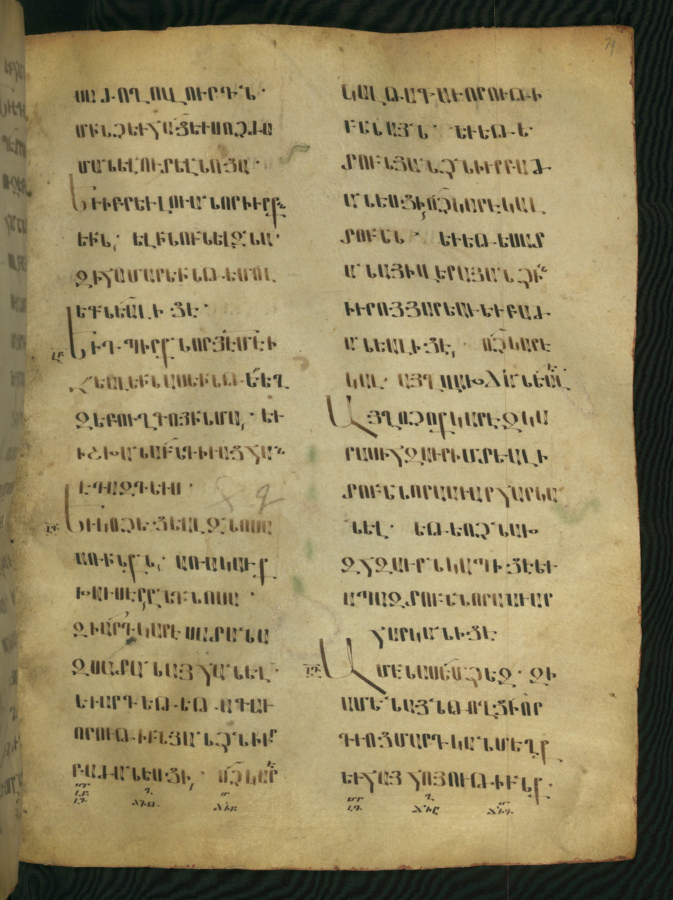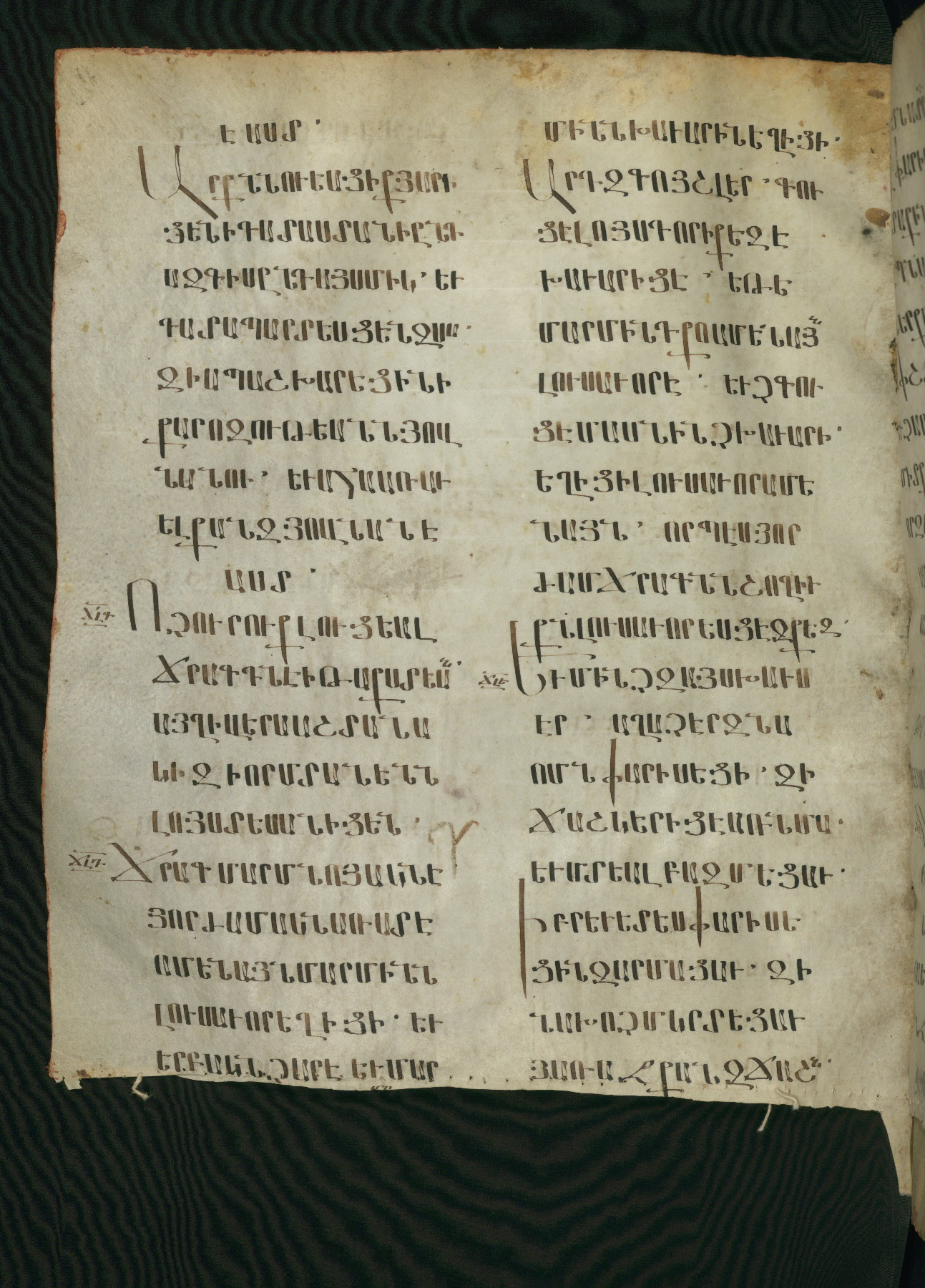 Dated to the tenth century, this manuscript is the oldest Armenian codex in North America and the fifth oldest among documented Armenian Gospel Books. The principal colophon on fol. 2v records that Sargis the Priest completed the text in 415 [966 CE]. Within the framed area, the commission of the codex is described: a priest, whose name was replaced by the later owner T’oros, commissioned the work "as decoration and for the splendor of [the] holy church and for the pleasure of the congregation of Rznēr." As the codex was written and commissioned by priests, the manuscript is referred to as the “Gospels of the Priest.” It was formerly known as the “Gospels of the Translators,” as, following the date 415, someone erased the formula “of the Armenian era” and replaced it with “of our Lord,” suggesting an earlier date and implying that the text was based on the original translation of the Gospels into Armenian during the fifth century. The text is copied in large angular erkat‘agir script. The full-page paintings and marginal ornaments bear stylistic characteristics of Armenian illumination of the tenth and eleventh centuries associated with non-royal patronage. The illustrations comprise the Canon Tables, with only the last two remaining; the Virgin and Child on a wheeled chariot; the framed colophon; ornamental cross with donor’s portrait; portraits of Mathew and Mark together (fol. 72v, at the end of Matthew) and Mark with Luke (fol. 114v, at the end of Mark); two final images depict unknown saints (fol. 192r, at the end of Luke). Marginalia are found throughout the text. It has been suggested that the scribe was also responsible for the illumination.
