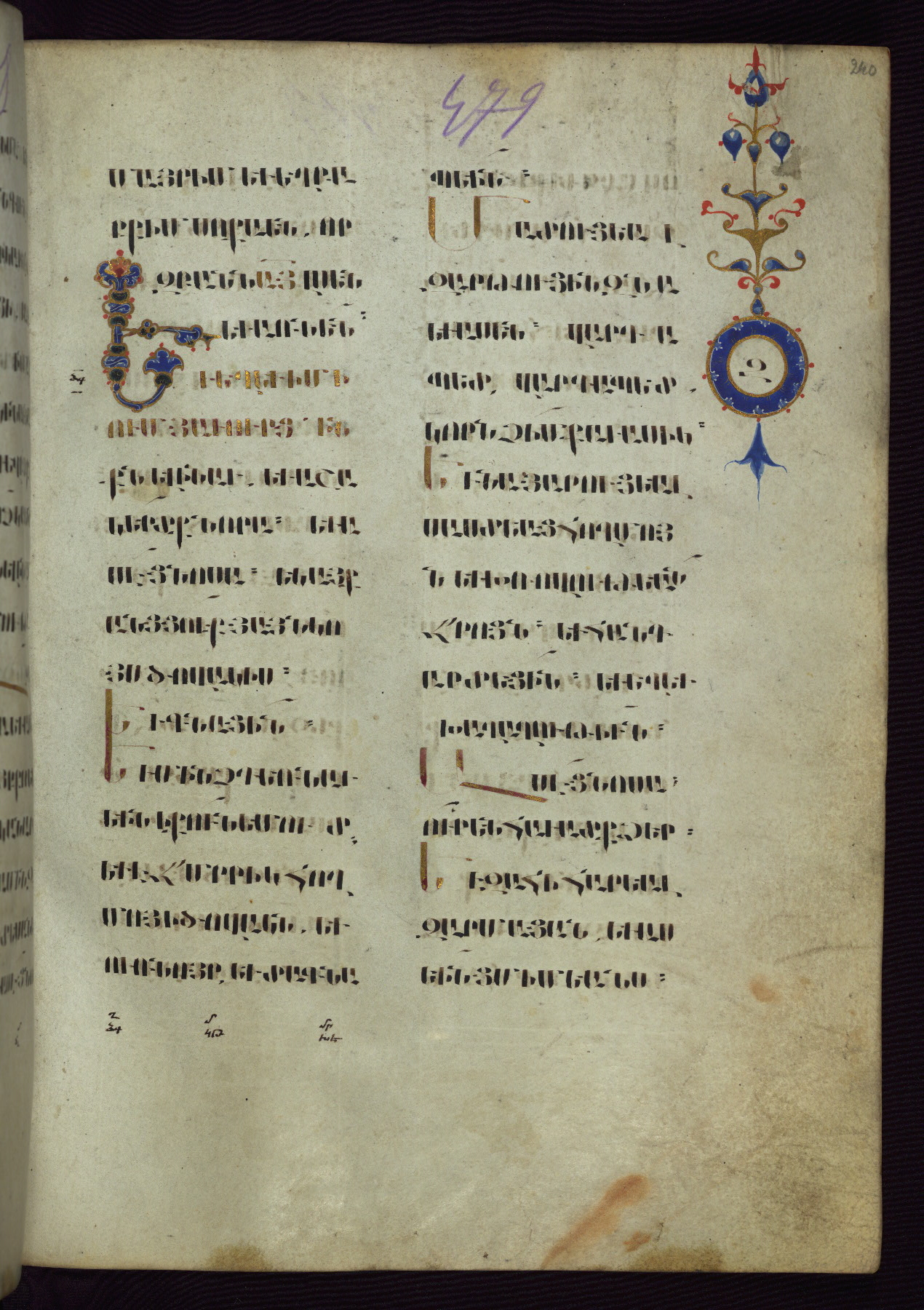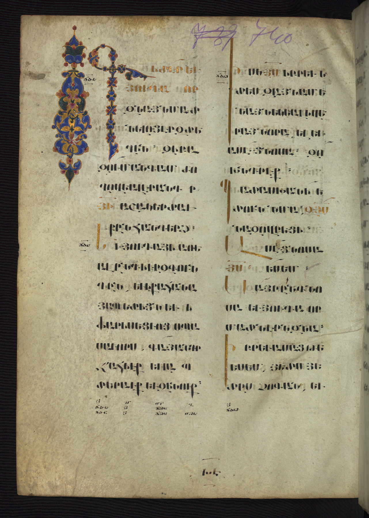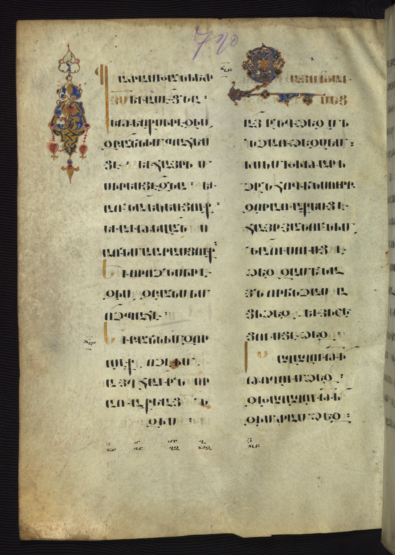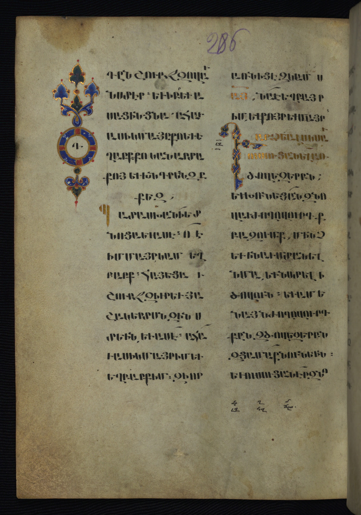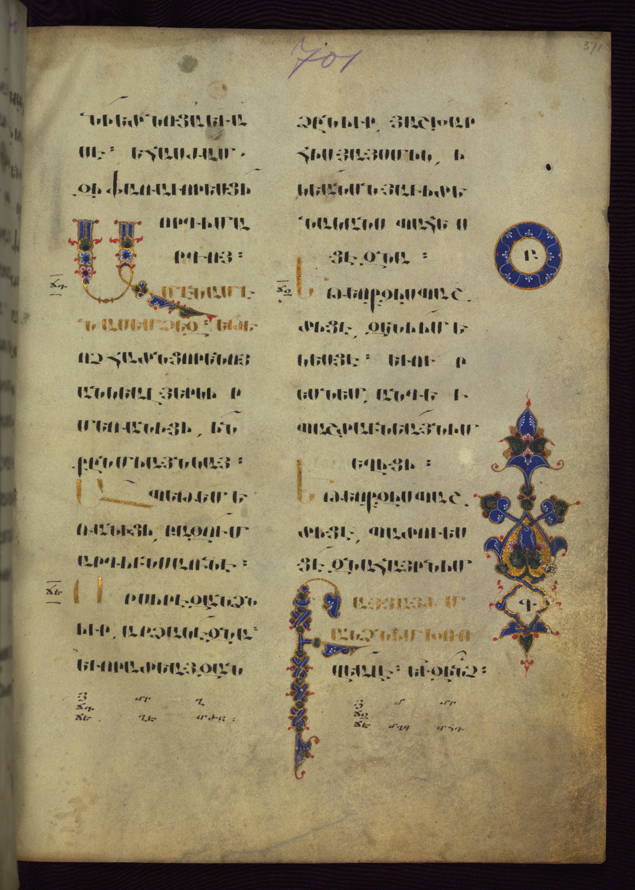 This manuscript was made in 1262 by T’oros Roslin, the celebrated illuminator who extended the iconographic repertoire by defining a narrative Gospel cycle beyond the traditional portraits of the Evangelists. This signed manuscript was created at the scriptorium of Hromkla, which became the leading artistic center of Armenian Cilicia under the rule of Catholicos Constantine I (1221-1267). As an extensive colophon starting on fol. 406v explains, T’oros created this manuscript under commission from the nephew of Constantine, a priest also named T’oros. It is one of seven known manuscripts bearing T’oros Roslin’s signature, and it is the most sumptuous of them all, with 15 miniatures and 67 smaller illustrations. The style of the images suggests that T’oros had several assistants helping with the illustrations, though the overall quality remains extremely high. The manuscript was long cherished within the Armenian church. Even in the seventeenth century, its illumination served as a model for Armenian scribes, particularly Bargham and his son Mik’ayel; see Jerusalem, Armenian Patriarchate, no. 3438 and Washington DC, Freer Gallery, Ms. 36.15; in the latter manuscript, Mik’ayel explicitly refers to “the excellent scribe T’oros, surnamed Roslin.”