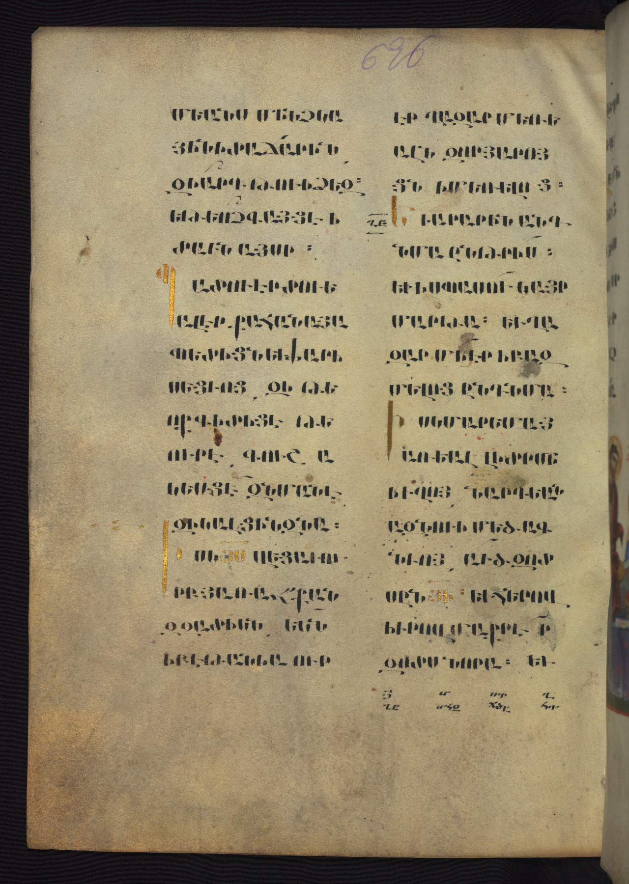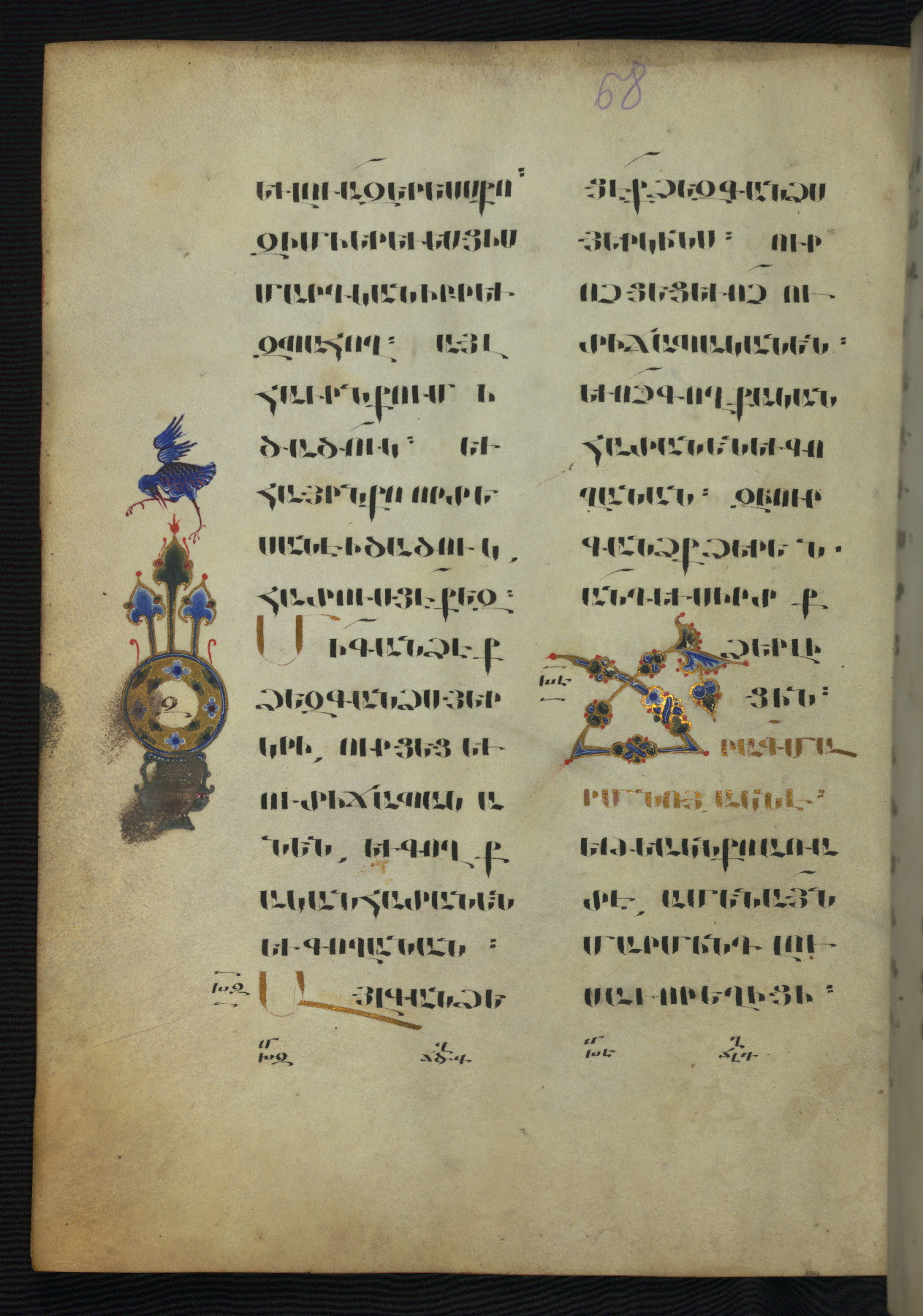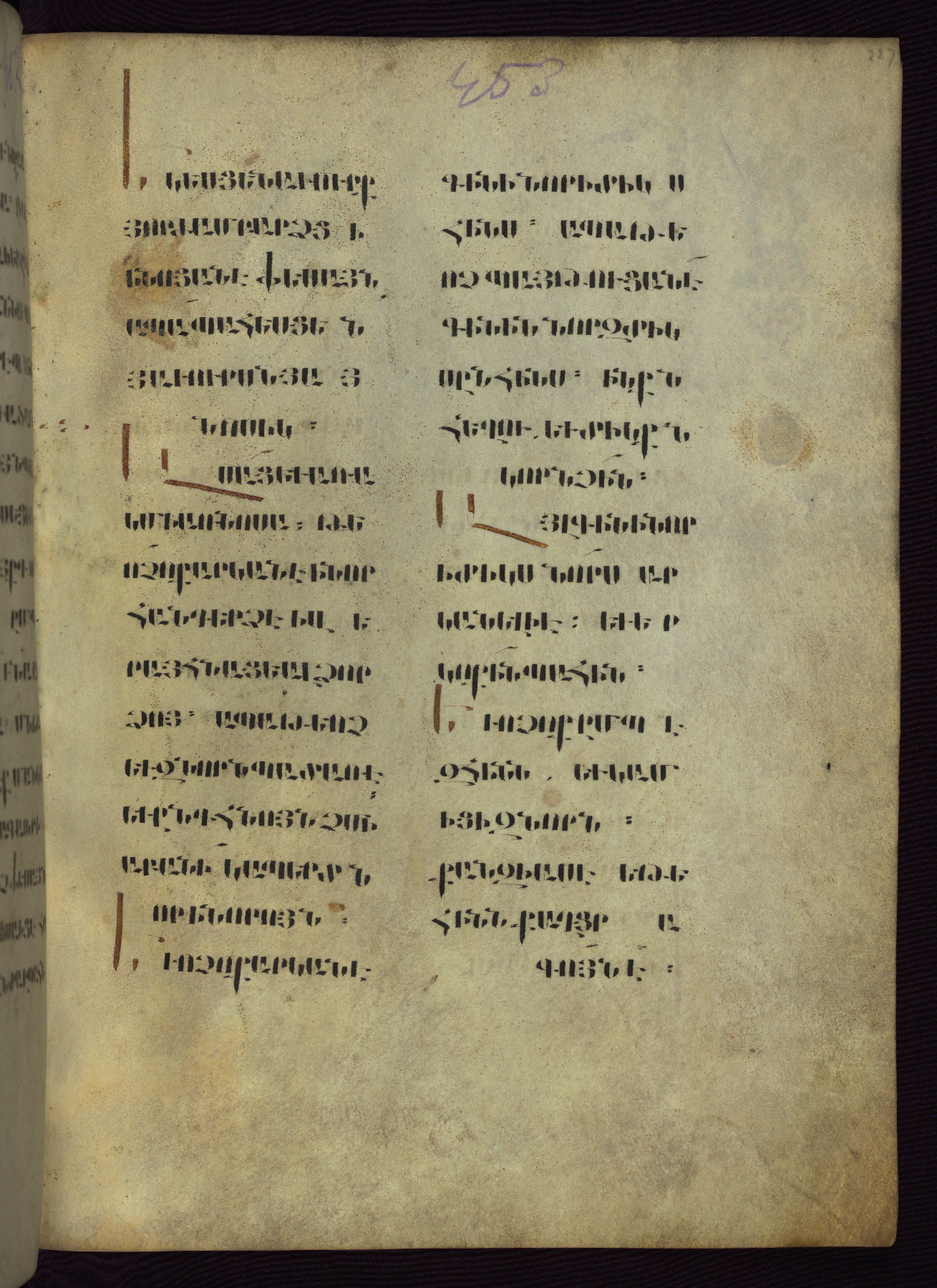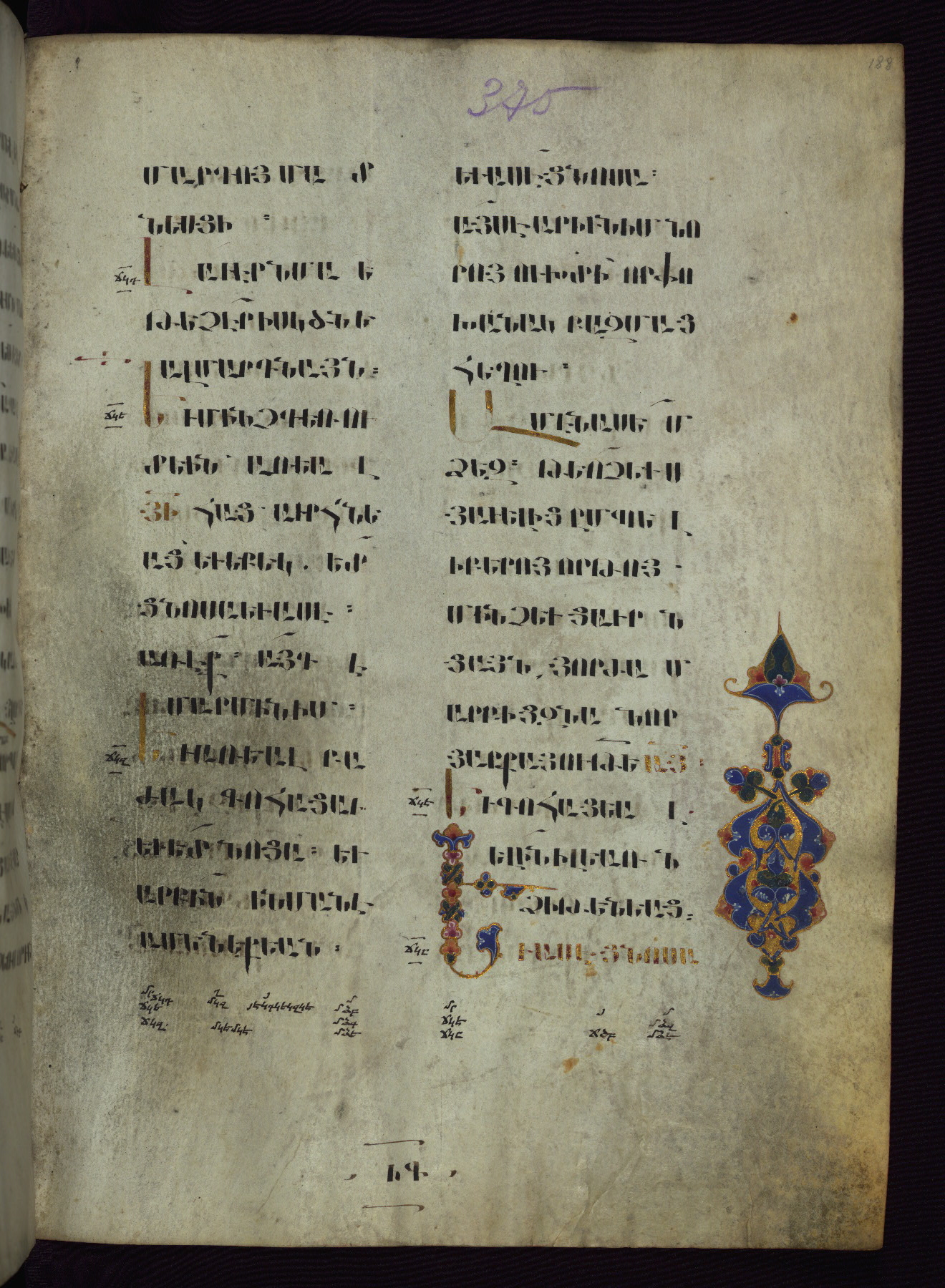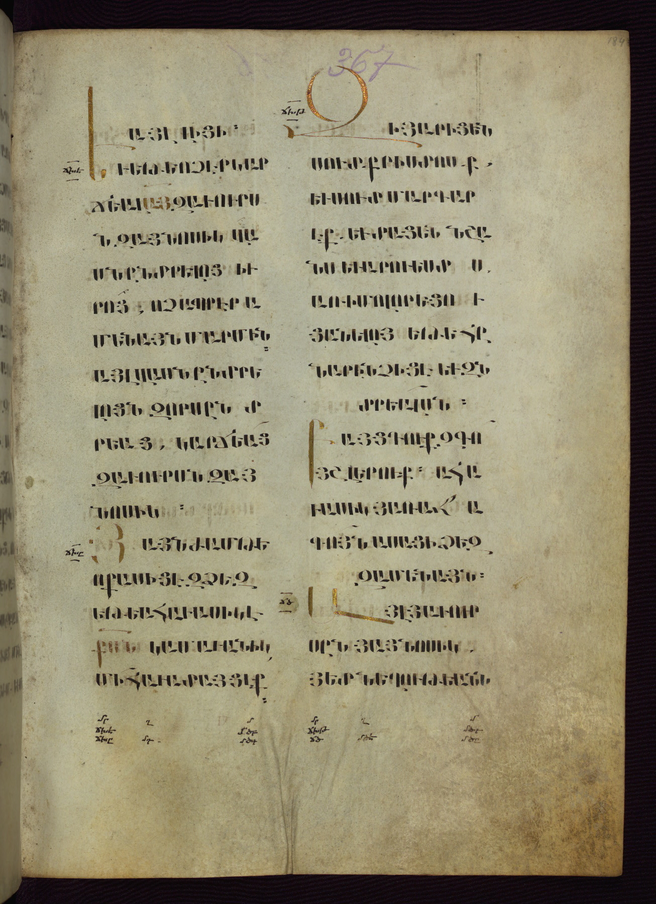 This manuscript was made in 1262 by T’oros Roslin, the celebrated illuminator who extended the iconographic repertoire by defining a narrative Gospel cycle beyond the traditional portraits of the Evangelists. This signed manuscript was created at the scriptorium of Hromkla, which became the leading artistic center of Armenian Cilicia under the rule of Catholicos Constantine I (1221-1267). As an extensive colophon starting on fol. 406v explains, T’oros created this manuscript under commission from the nephew of Constantine, a priest also named T’oros. It is one of seven known manuscripts bearing T’oros Roslin’s signature, and it is the most sumptuous of them all, with 15 miniatures and 67 smaller illustrations. The style of the images suggests that T’oros had several assistants helping with the illustrations, though the overall quality remains extremely high. The manuscript was long cherished within the Armenian church. Even in the seventeenth century, its illumination served as a model for Armenian scribes, particularly Bargham and his son Mik’ayel; see Jerusalem, Armenian Patriarchate, no. 3438 and Washington DC, Freer Gallery, Ms. 36.15; in the latter manuscript, Mik’ayel explicitly refers to “the excellent scribe T’oros, surnamed Roslin.”