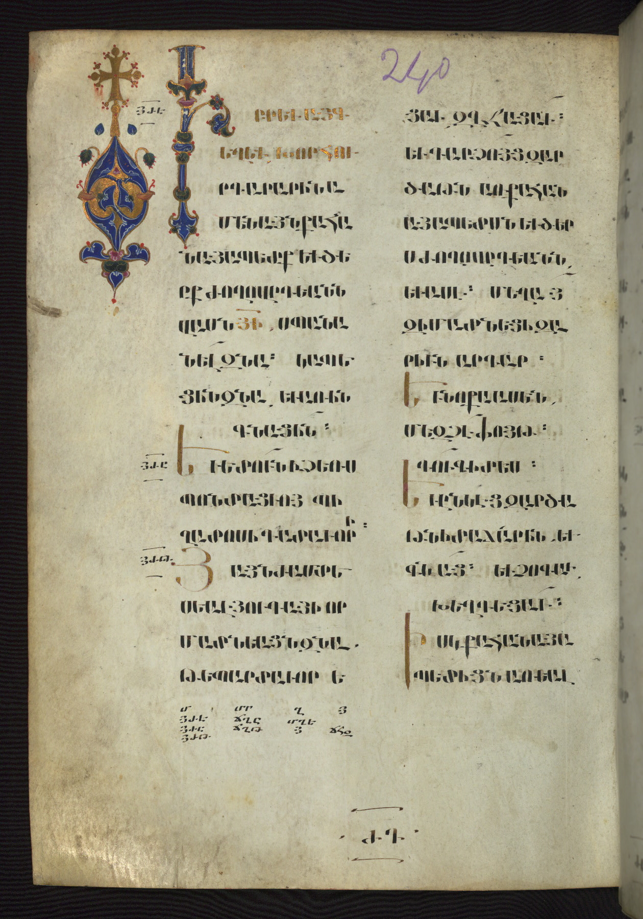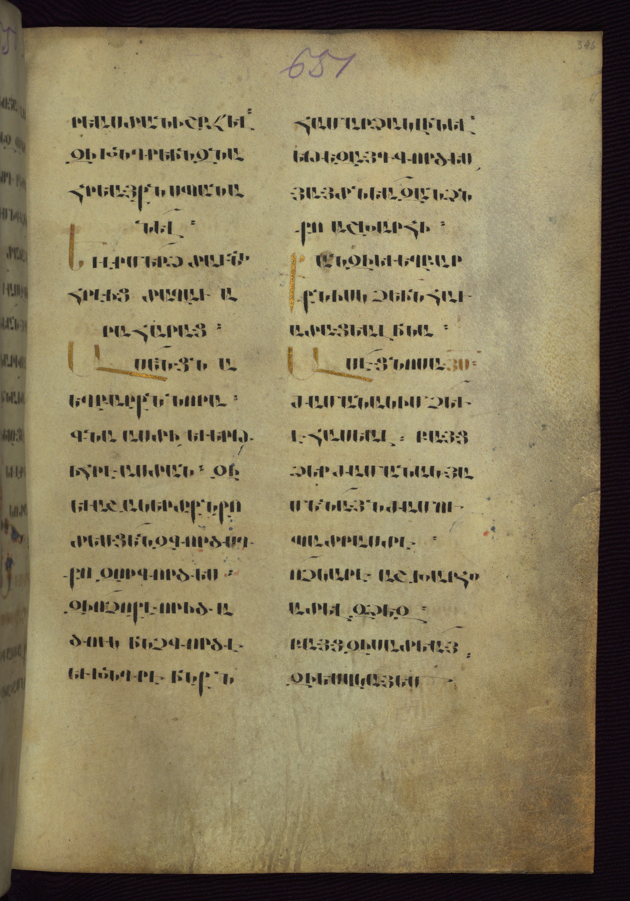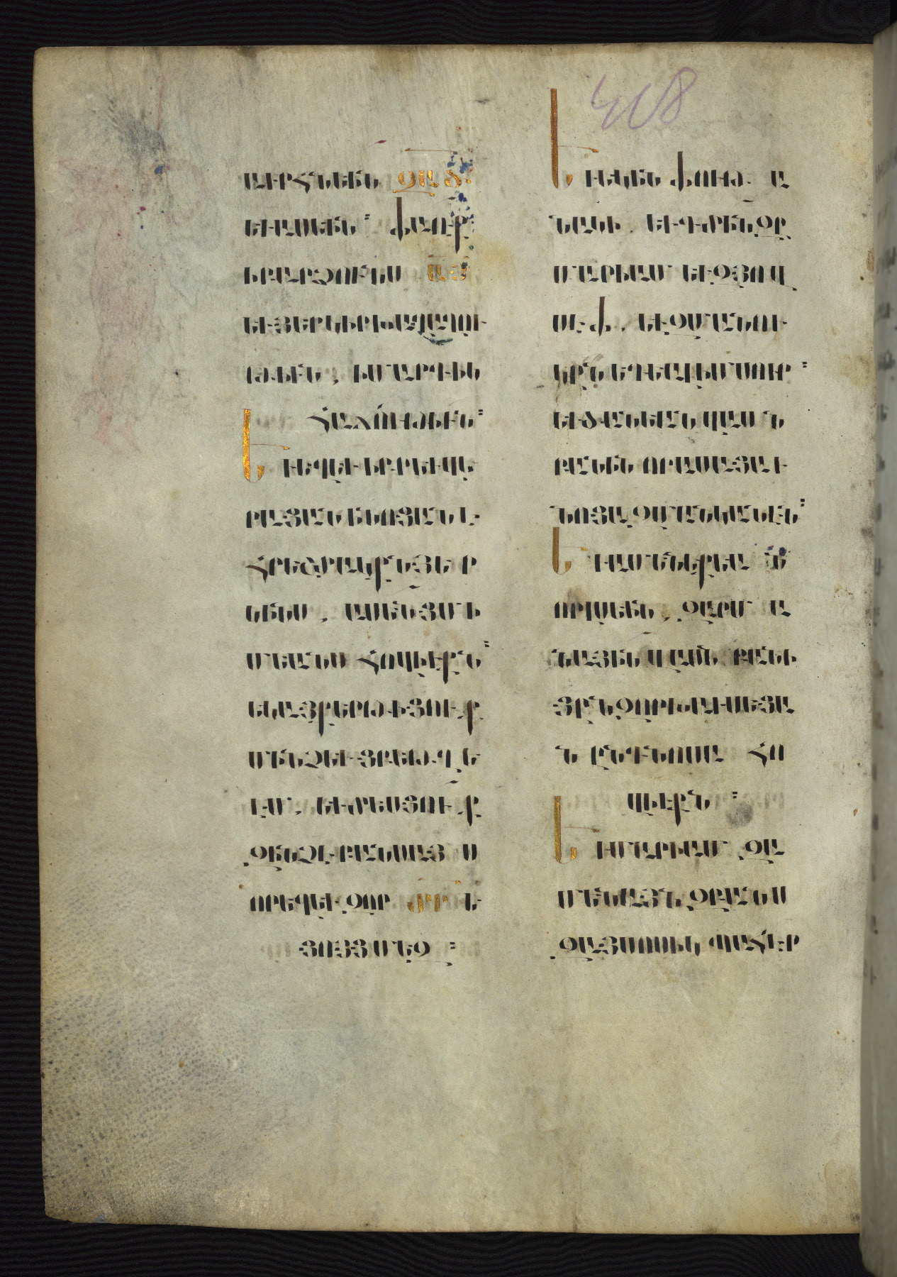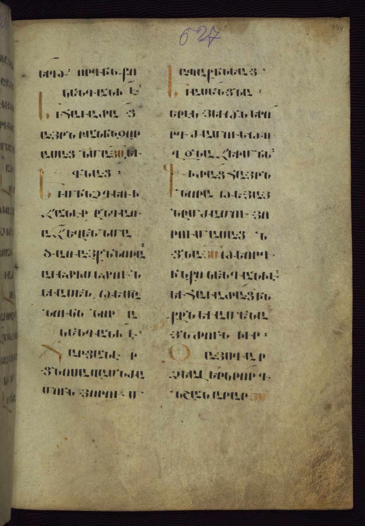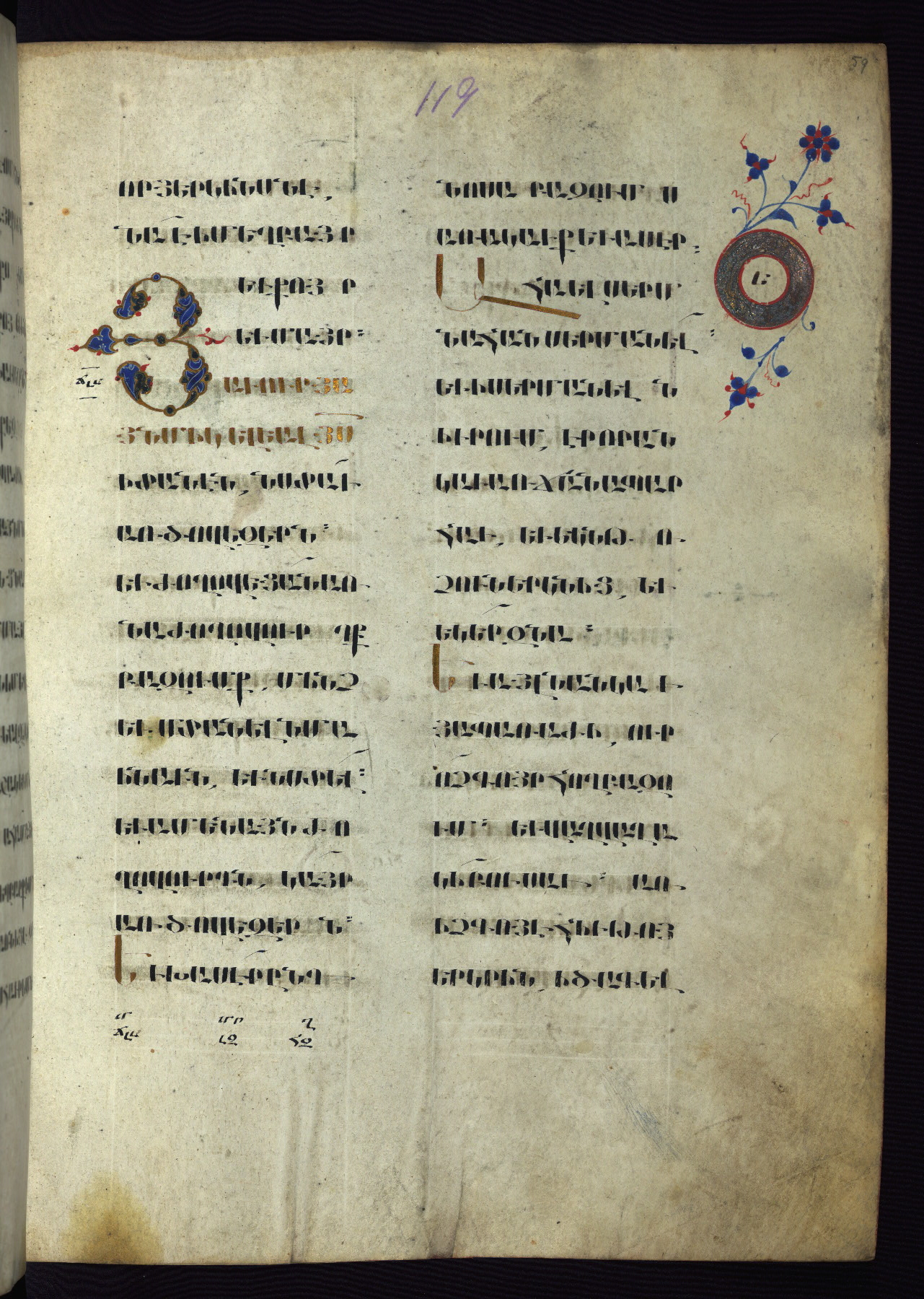 This manuscript was made in 1262 by T’oros Roslin, the celebrated illuminator who extended the iconographic repertoire by defining a narrative Gospel cycle beyond the traditional portraits of the Evangelists. This signed manuscript was created at the scriptorium of Hromkla, which became the leading artistic center of Armenian Cilicia under the rule of Catholicos Constantine I (1221-1267). As an extensive colophon starting on fol. 406v explains, T’oros created this manuscript under commission from the nephew of Constantine, a priest also named T’oros. It is one of seven known manuscripts bearing T’oros Roslin’s signature, and it is the most sumptuous of them all, with 15 miniatures and 67 smaller illustrations. The style of the images suggests that T’oros had several assistants helping with the illustrations, though the overall quality remains extremely high. The manuscript was long cherished within the Armenian church. Even in the seventeenth century, its illumination served as a model for Armenian scribes, particularly Bargham and his son Mik’ayel; see Jerusalem, Armenian Patriarchate, no. 3438 and Washington DC, Freer Gallery, Ms. 36.15; in the latter manuscript, Mik’ayel explicitly refers to “the excellent scribe T’oros, surnamed Roslin.”