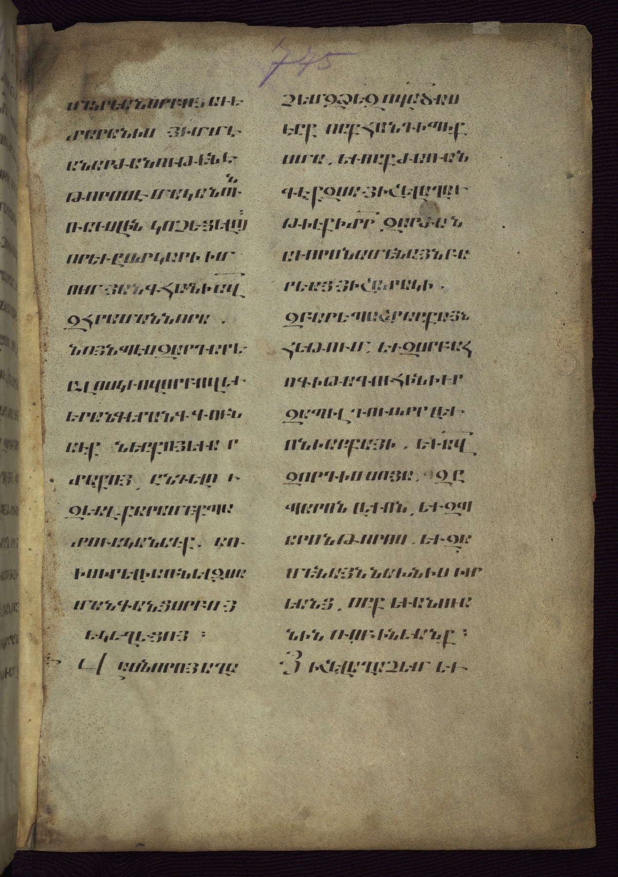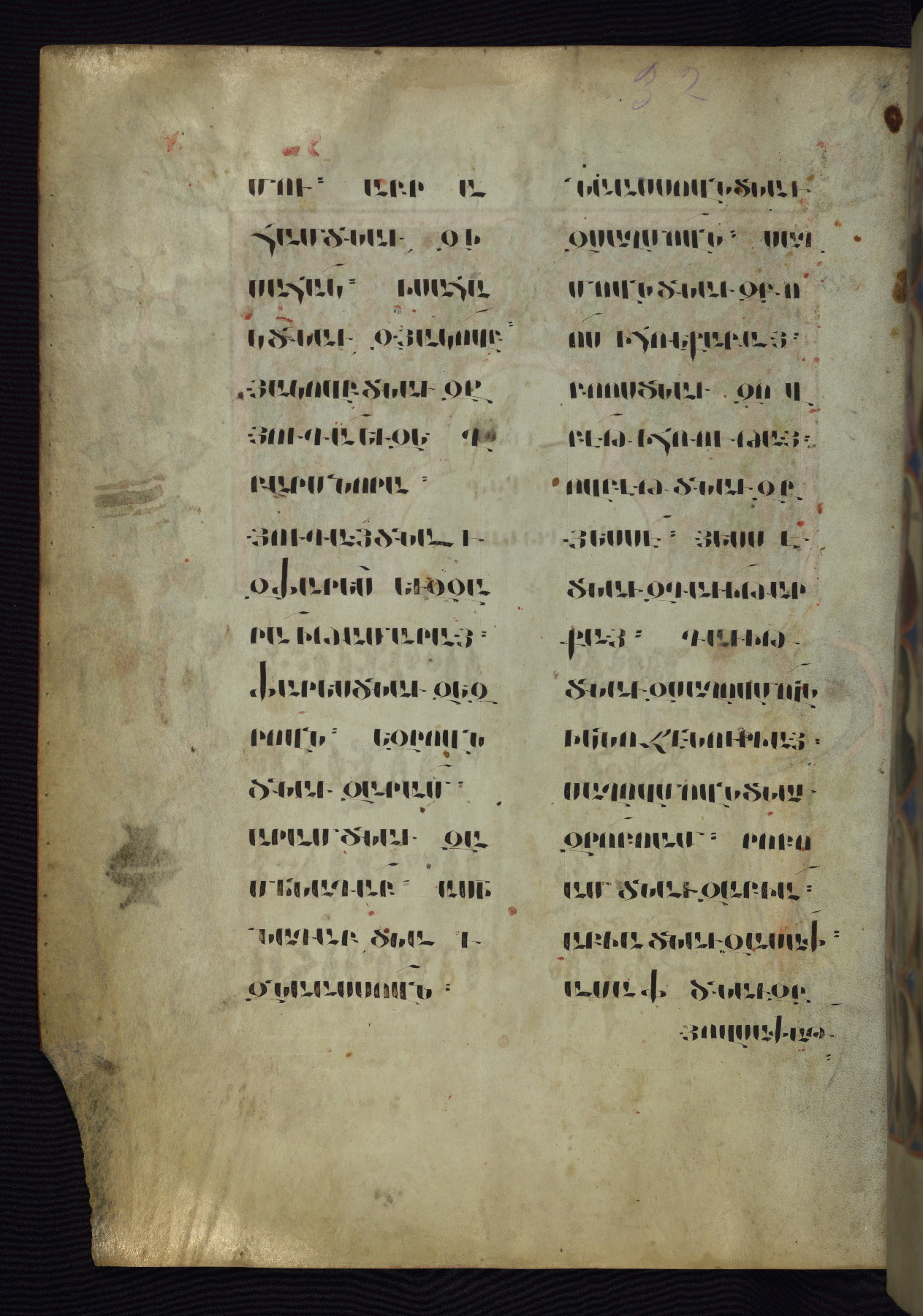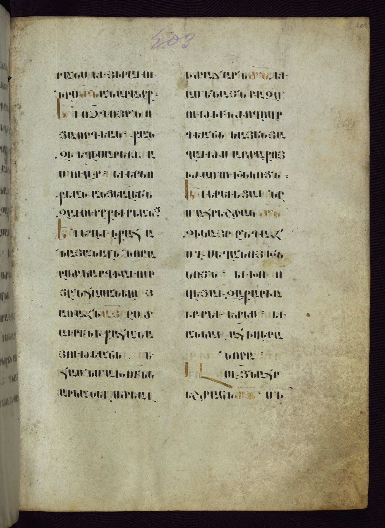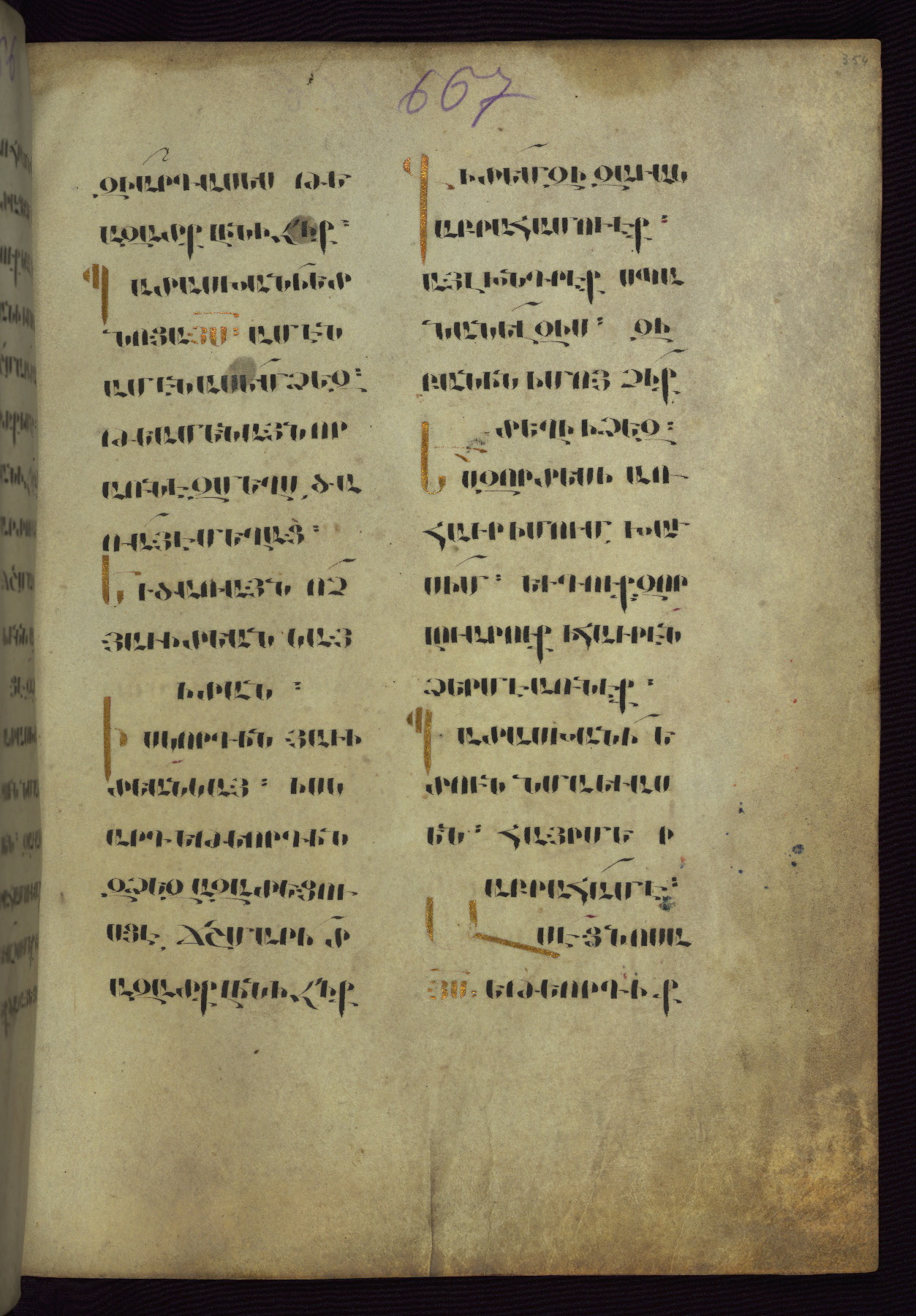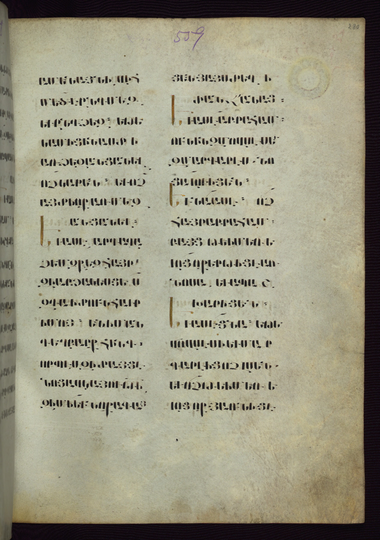 This manuscript was made in 1262 by T’oros Roslin, the celebrated illuminator who extended the iconographic repertoire by defining a narrative Gospel cycle beyond the traditional portraits of the Evangelists. This signed manuscript was created at the scriptorium of Hromkla, which became the leading artistic center of Armenian Cilicia under the rule of Catholicos Constantine I (1221-1267). As an extensive colophon starting on fol. 406v explains, T’oros created this manuscript under commission from the nephew of Constantine, a priest also named T’oros. It is one of seven known manuscripts bearing T’oros Roslin’s signature, and it is the most sumptuous of them all, with 15 miniatures and 67 smaller illustrations. The style of the images suggests that T’oros had several assistants helping with the illustrations, though the overall quality remains extremely high. The manuscript was long cherished within the Armenian church. Even in the seventeenth century, its illumination served as a model for Armenian scribes, particularly Bargham and his son Mik’ayel; see Jerusalem, Armenian Patriarchate, no. 3438 and Washington DC, Freer Gallery, Ms. 36.15; in the latter manuscript, Mik’ayel explicitly refers to “the excellent scribe T’oros, surnamed Roslin.”