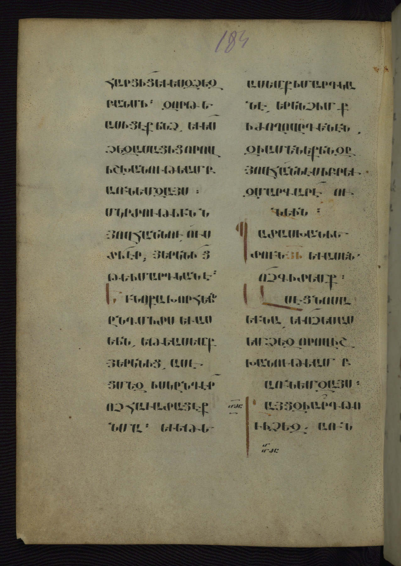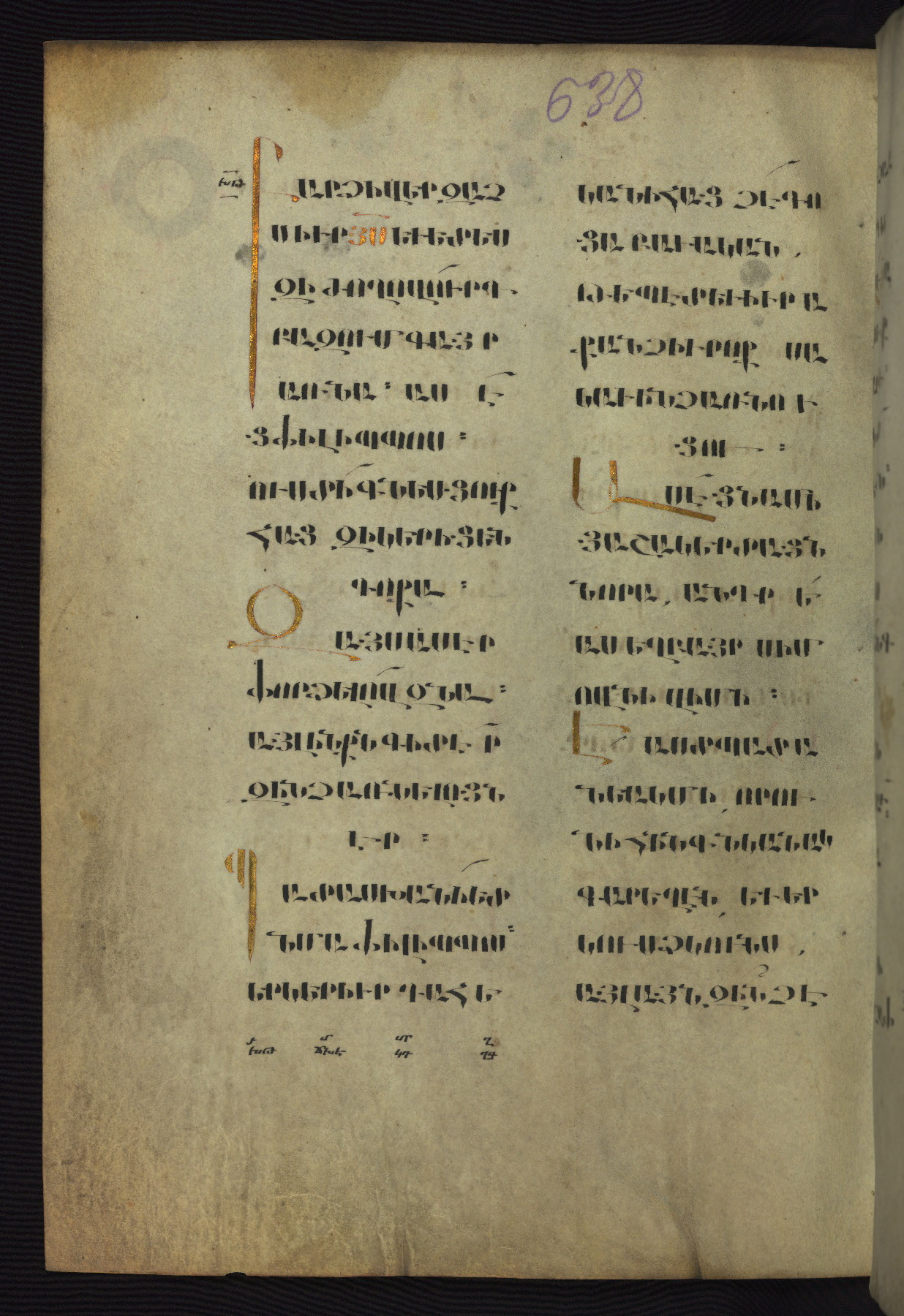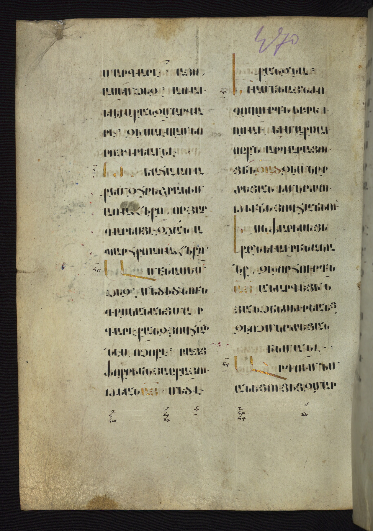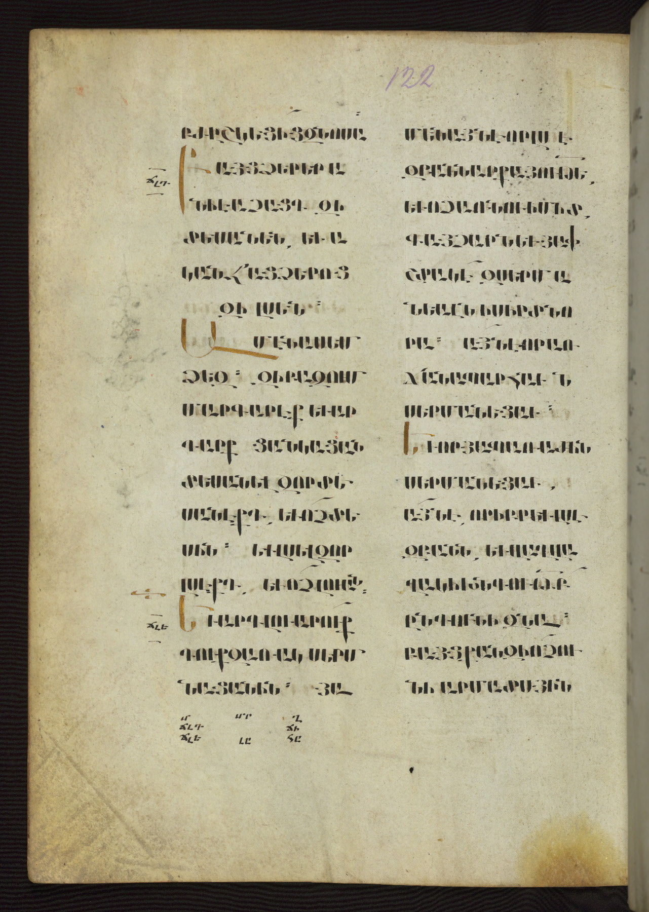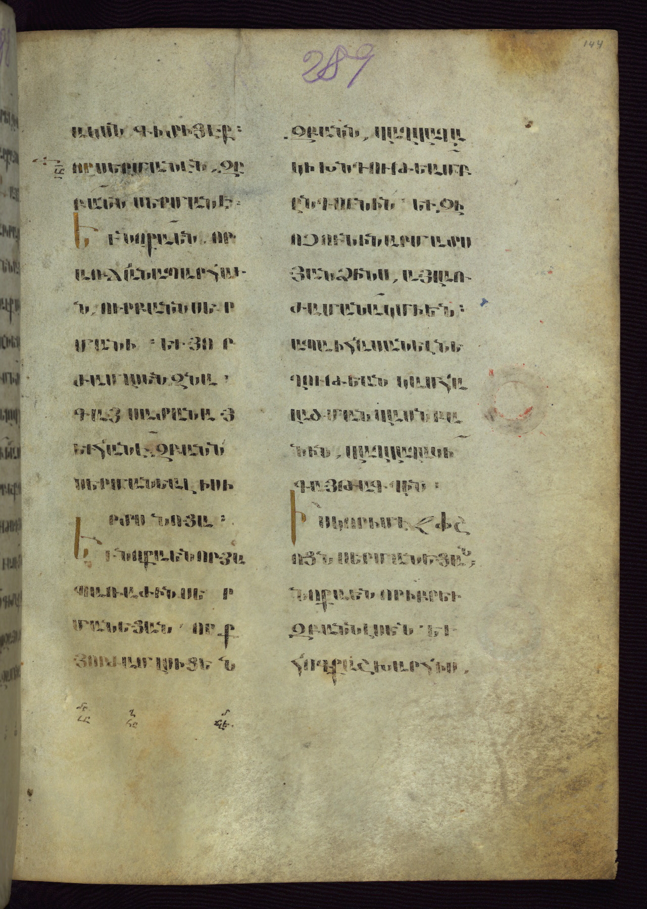 This manuscript was made in 1262 by T’oros Roslin, the celebrated illuminator who extended the iconographic repertoire by defining a narrative Gospel cycle beyond the traditional portraits of the Evangelists. This signed manuscript was created at the scriptorium of Hromkla, which became the leading artistic center of Armenian Cilicia under the rule of Catholicos Constantine I (1221-1267). As an extensive colophon starting on fol. 406v explains, T’oros created this manuscript under commission from the nephew of Constantine, a priest also named T’oros. It is one of seven known manuscripts bearing T’oros Roslin’s signature, and it is the most sumptuous of them all, with 15 miniatures and 67 smaller illustrations. The style of the images suggests that T’oros had several assistants helping with the illustrations, though the overall quality remains extremely high. The manuscript was long cherished within the Armenian church. Even in the seventeenth century, its illumination served as a model for Armenian scribes, particularly Bargham and his son Mik’ayel; see Jerusalem, Armenian Patriarchate, no. 3438 and Washington DC, Freer Gallery, Ms. 36.15; in the latter manuscript, Mik’ayel explicitly refers to “the excellent scribe T’oros, surnamed Roslin.”