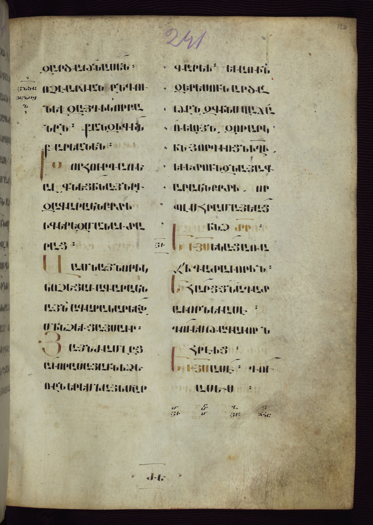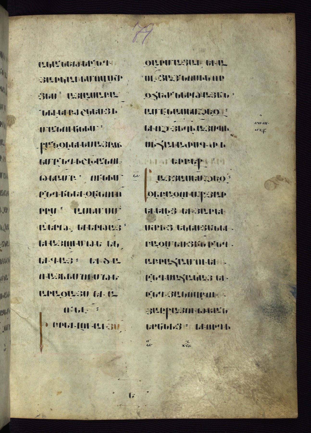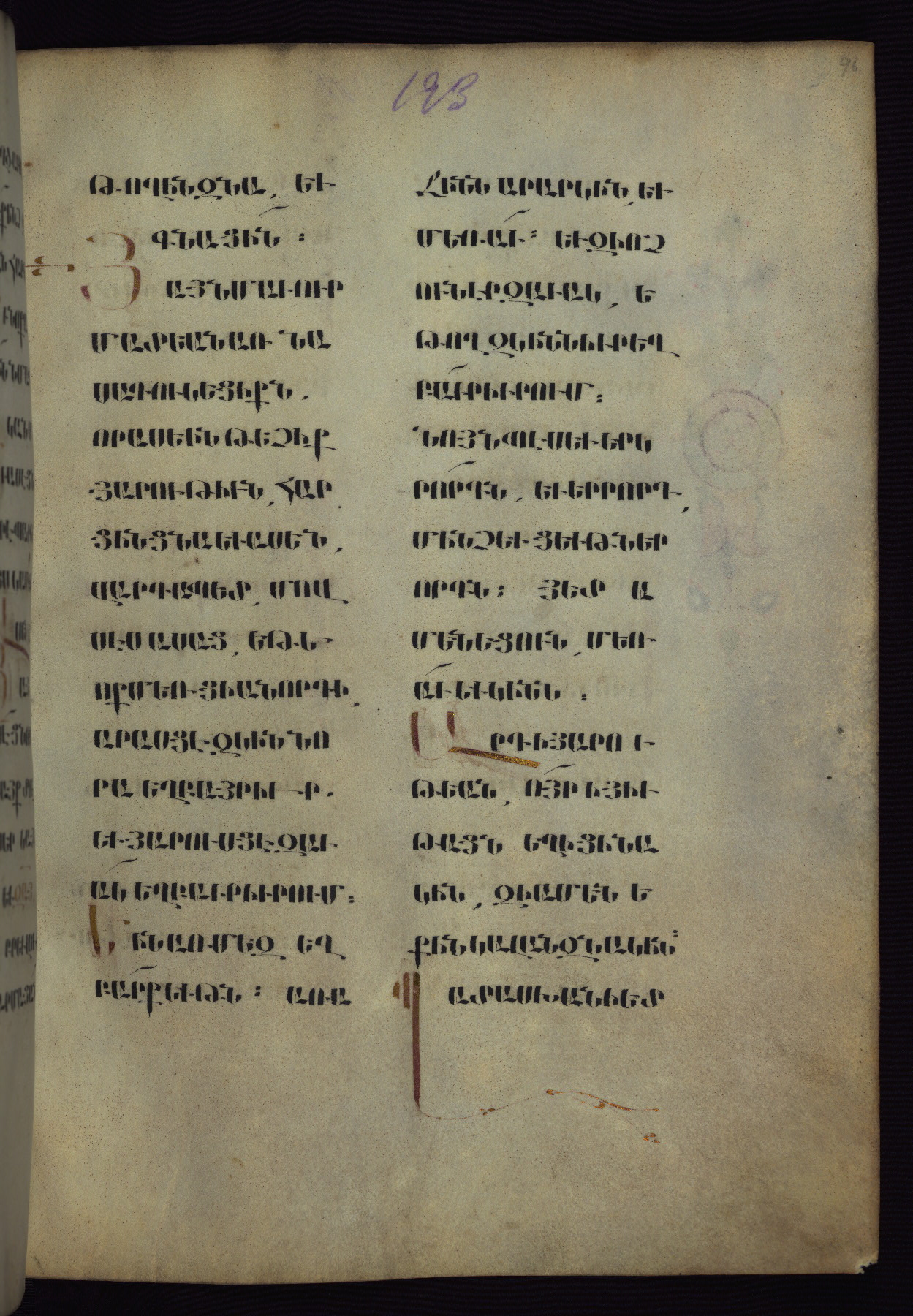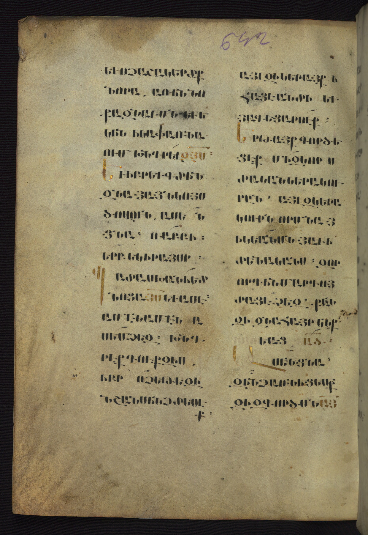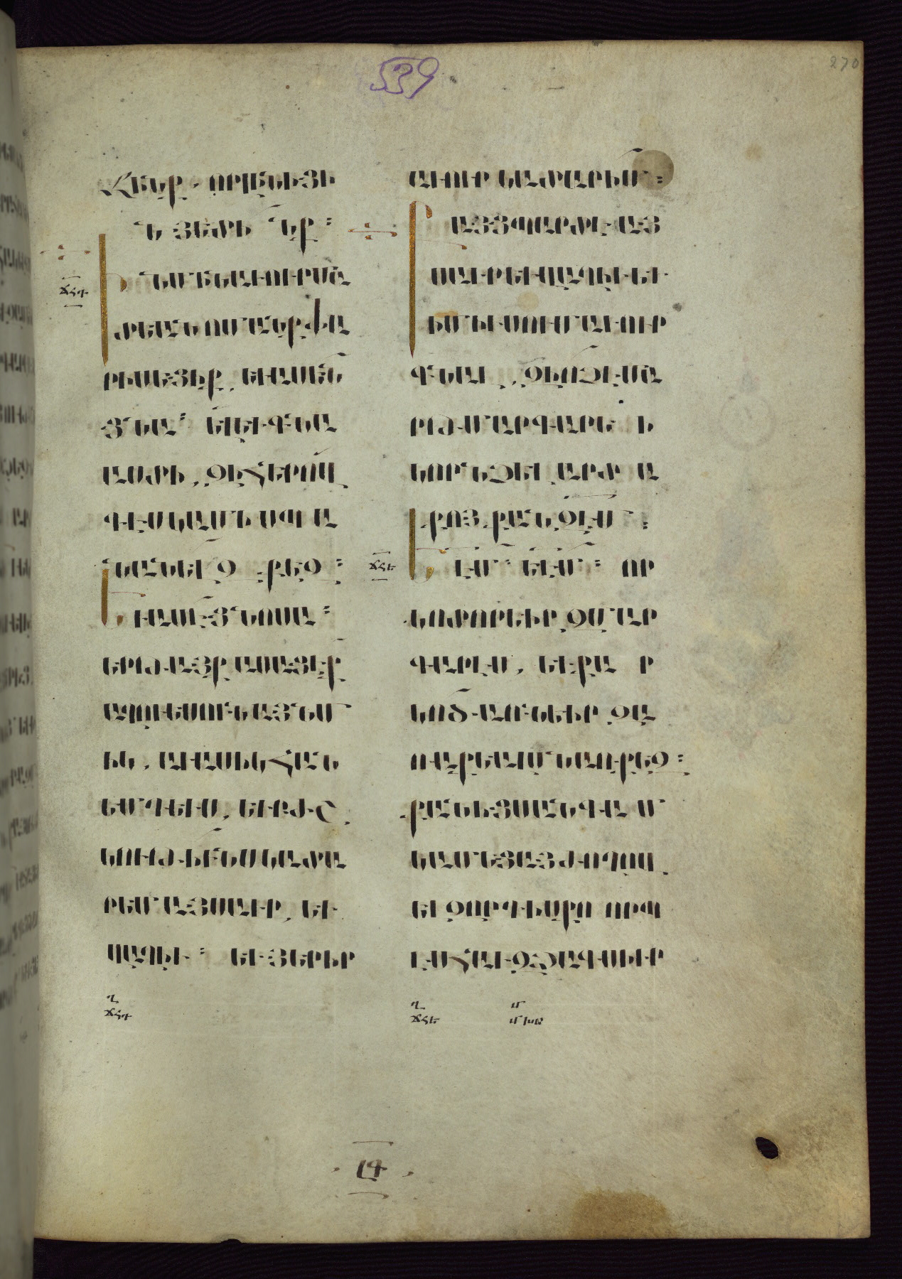 This manuscript was made in 1262 by T’oros Roslin, the celebrated illuminator who extended the iconographic repertoire by defining a narrative Gospel cycle beyond the traditional portraits of the Evangelists. This signed manuscript was created at the scriptorium of Hromkla, which became the leading artistic center of Armenian Cilicia under the rule of Catholicos Constantine I (1221-1267). As an extensive colophon starting on fol. 406v explains, T’oros created this manuscript under commission from the nephew of Constantine, a priest also named T’oros. It is one of seven known manuscripts bearing T’oros Roslin’s signature, and it is the most sumptuous of them all, with 15 miniatures and 67 smaller illustrations. The style of the images suggests that T’oros had several assistants helping with the illustrations, though the overall quality remains extremely high. The manuscript was long cherished within the Armenian church. Even in the seventeenth century, its illumination served as a model for Armenian scribes, particularly Bargham and his son Mik’ayel; see Jerusalem, Armenian Patriarchate, no. 3438 and Washington DC, Freer Gallery, Ms. 36.15; in the latter manuscript, Mik’ayel explicitly refers to “the excellent scribe T’oros, surnamed Roslin.”