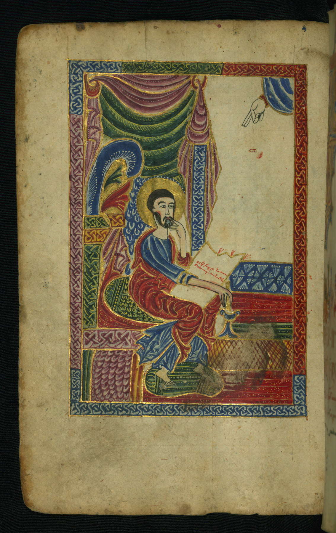 - Decoration note: Sixteen full-page polychrome miniatures from the life of Christ preceding the Gospels; four full-page Evangelist portraits; four full-page incipits; numerous marginal miniatures; and historiated, inhabited, or decorated initials for chapter divisions; canon table frames, rubrics, and verse divisions in red; Gospel text in black ink