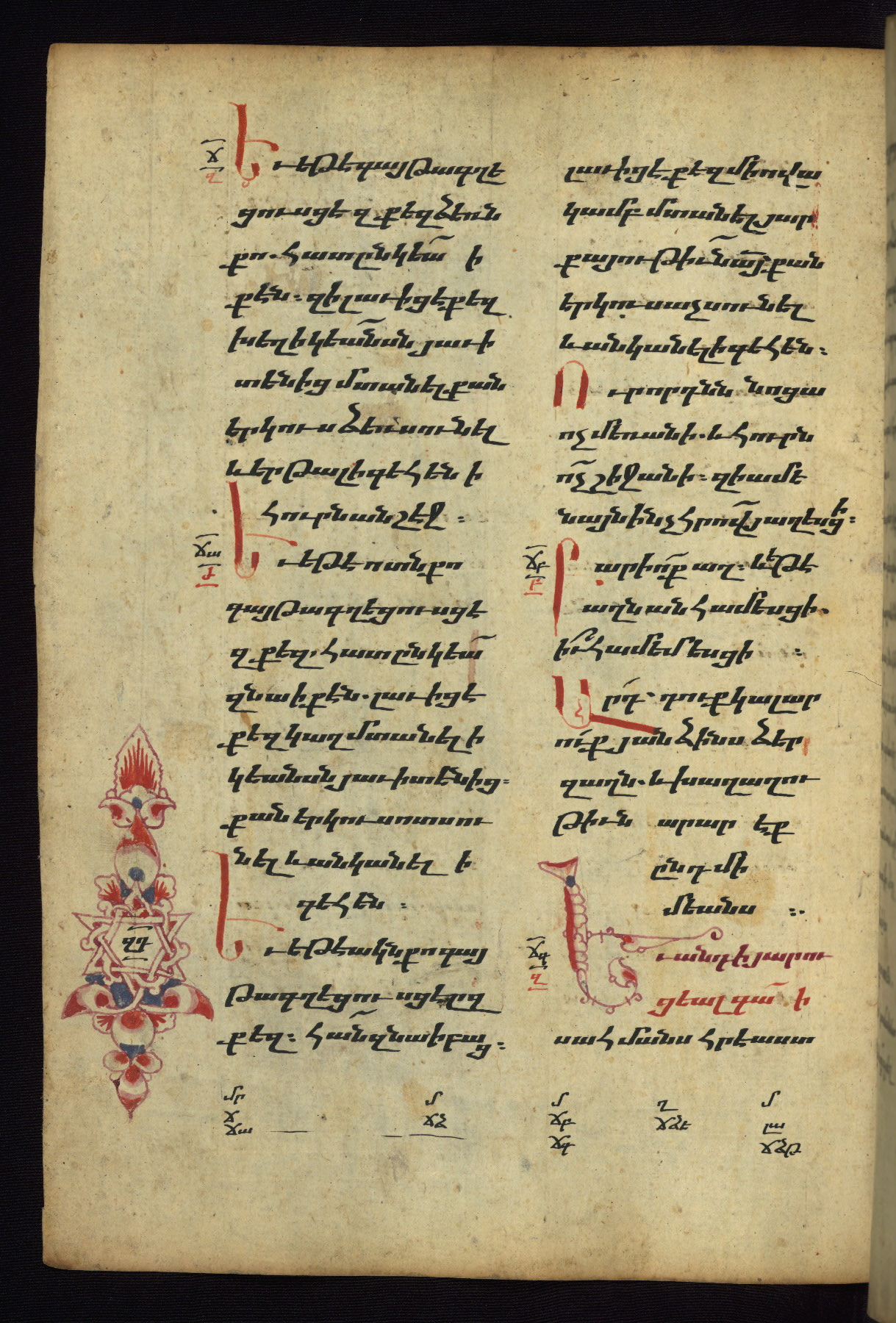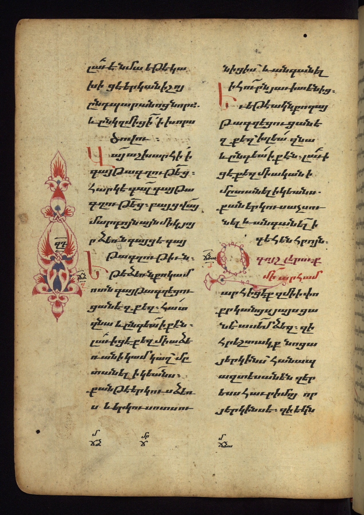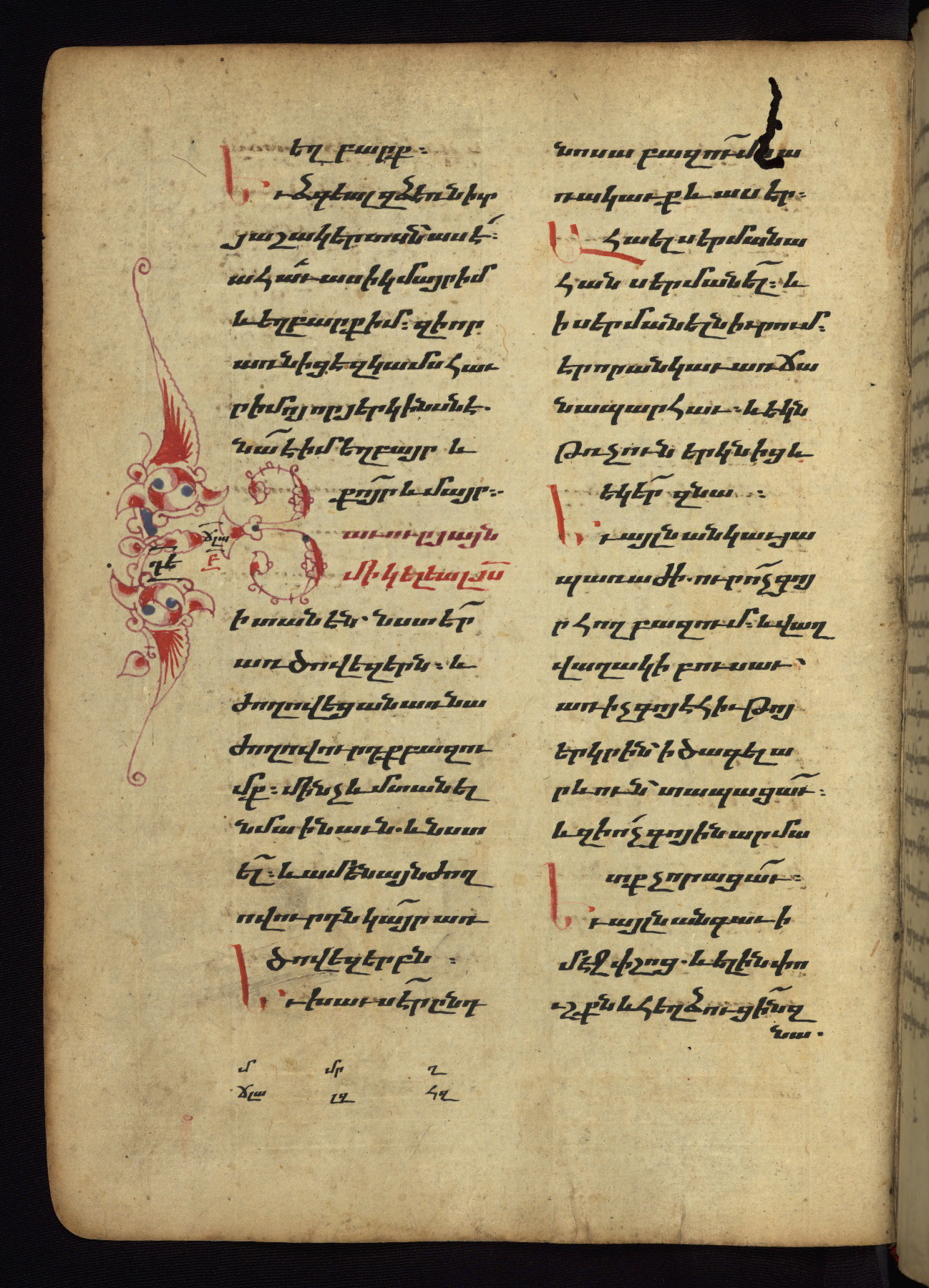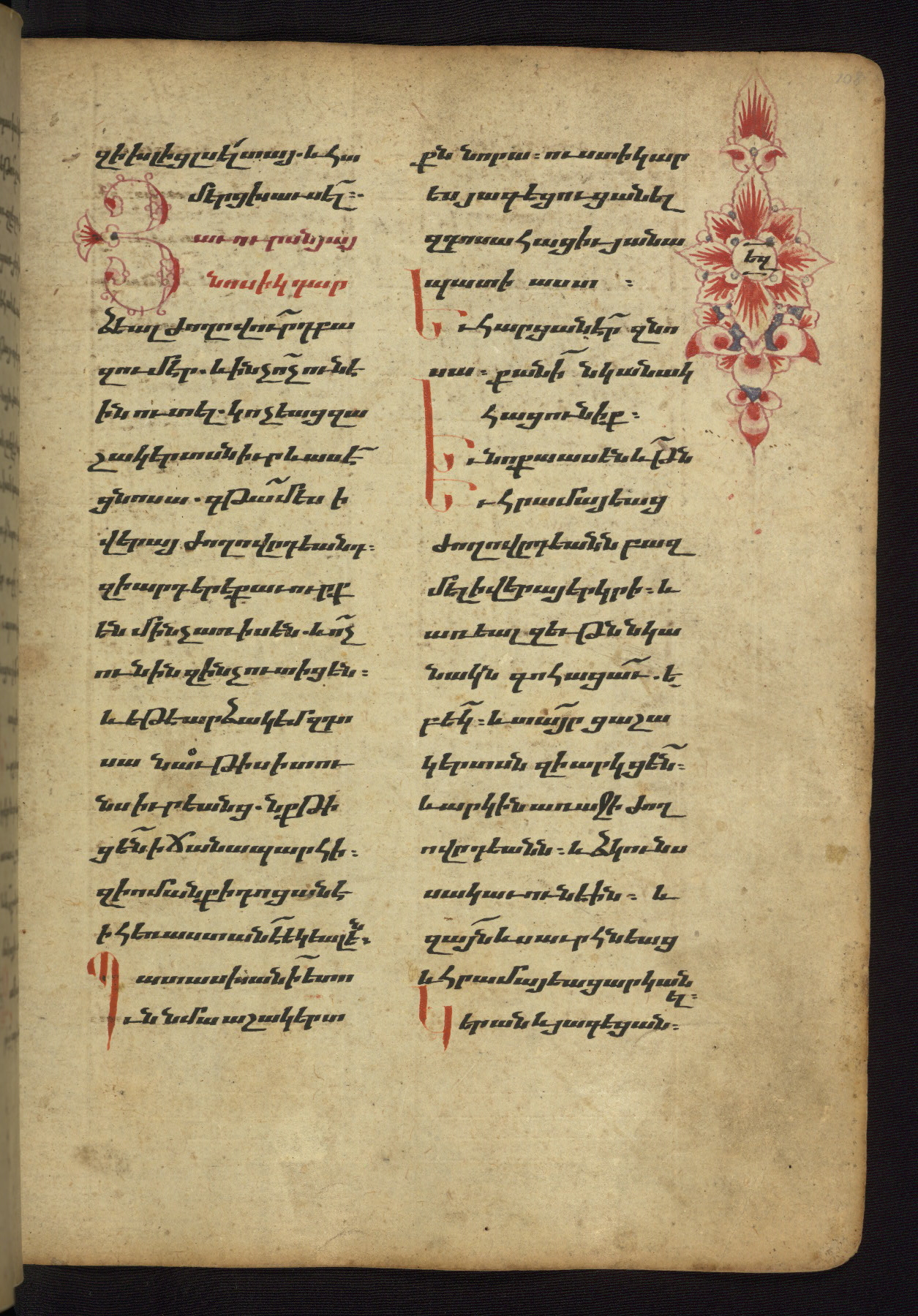 This Gospels manuscript was written in 937 of the Armenian era [1488 CE] in the province of Ekełeac' by the priest Łazar at the monastery of Surb Awgsend (St. Auxentius). Though the fifteenth-century manuscript was not a terribly costly production, it later came to be housed in a magnificent binding with large silver plaques showing the Presentation of the Christ Child in the Temple on the front and the Ascension on the back. This silver binding, which can be assigned to the seventeenth or early eighteenth century, was likely produced in Kayseri (Turkey). The manuscript's fifteenth-century Evangelist portraits show signs of Mongolian artistic influence, stemming from the time when Mongols had conquered the province. For a manuscript of similar style, see the Gospels in Jerusalem, no. 298, copied by Maghak’ia in 1497. The Walters' Silver Gospels was used over a long period by a succession of owners. Information about its history is given in its colophons and ownership inscriptions on the codex's final folios. One note indicates that the book was rebound in 1626, and offered to the church of Surb Astuacacin (Holy Theotokos) in memory of Caruk, Kirakos, and Girigor (fol. 280r). The last date given is the Armenian year 1161 (1712 CE), which may be when the manuscript was rebound.