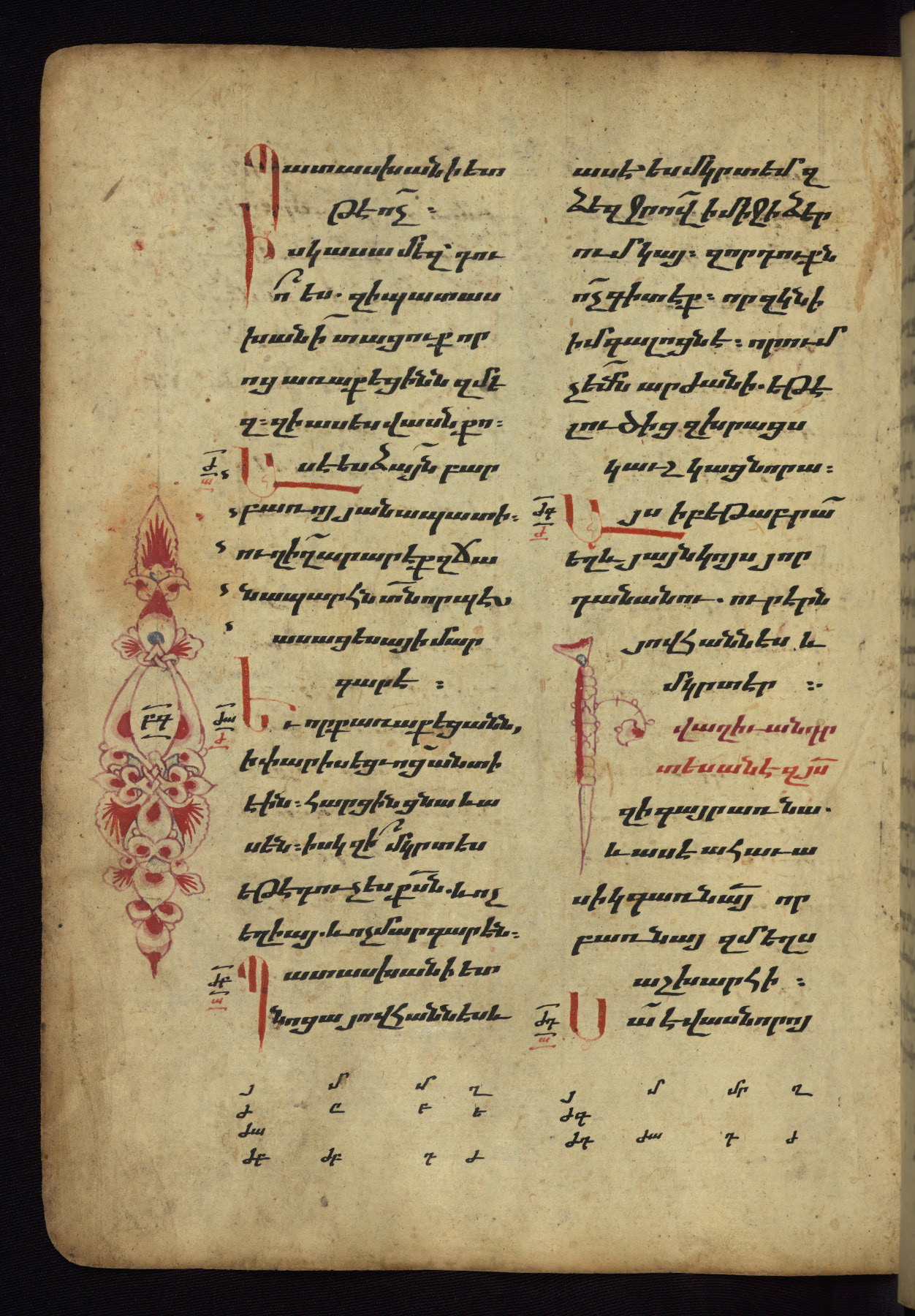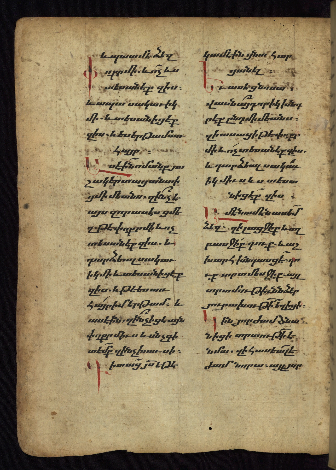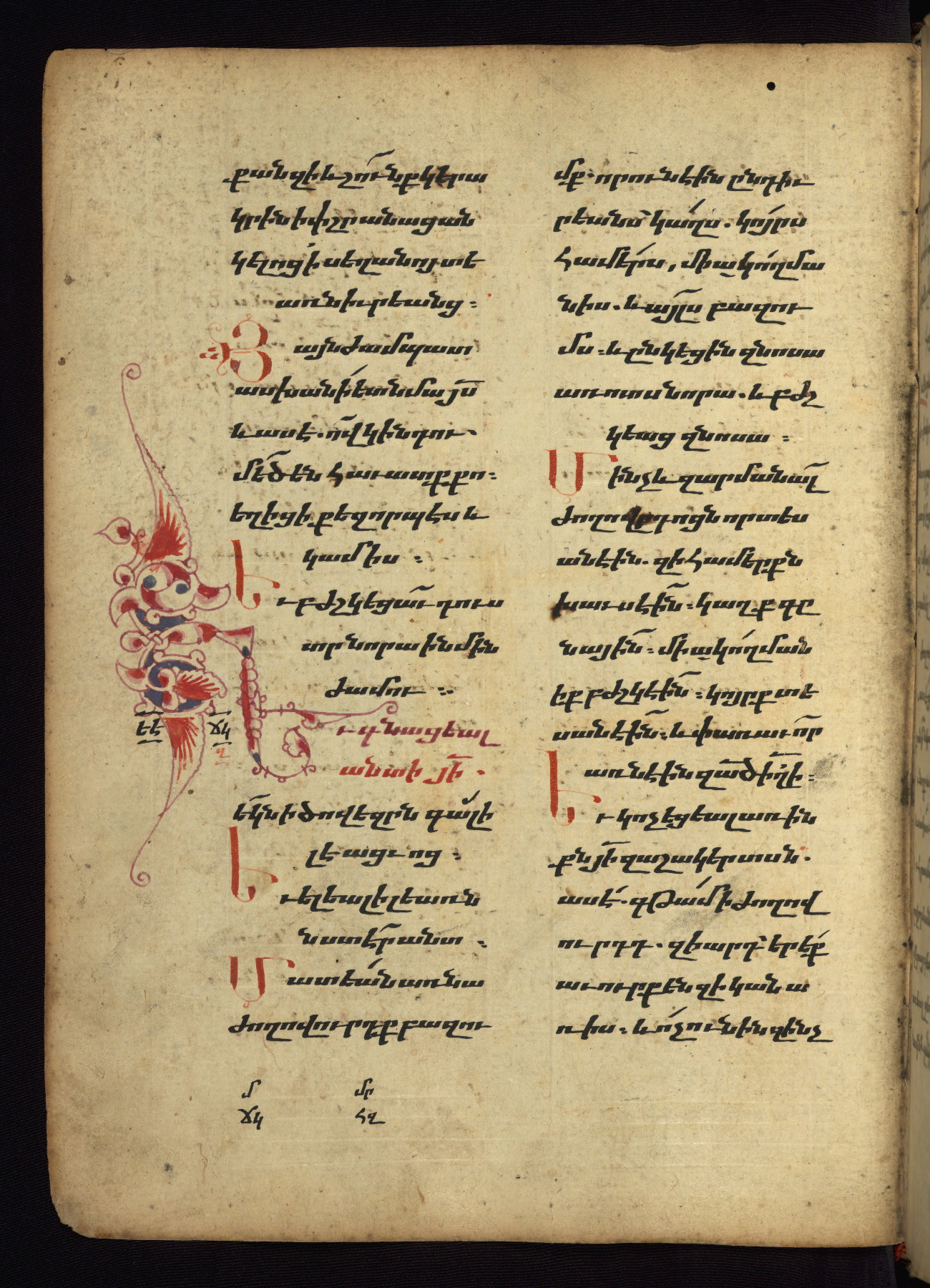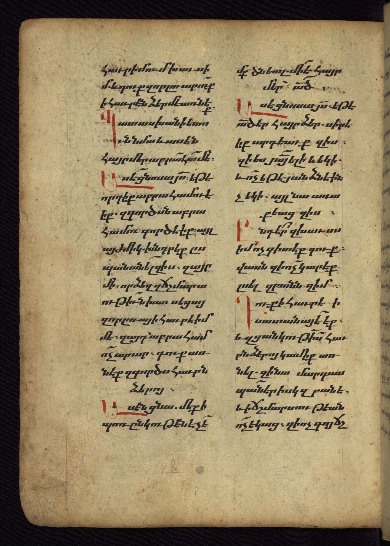 This Gospels manuscript was written in 937 of the Armenian era [1488 CE] in the province of Ekełeac' by the priest Łazar at the monastery of Surb Awgsend (St. Auxentius). Though the fifteenth-century manuscript was not a terribly costly production, it later came to be housed in a magnificent binding with large silver plaques showing the Presentation of the Christ Child in the Temple on the front and the Ascension on the back. This silver binding, which can be assigned to the seventeenth or early eighteenth century, was likely produced in Kayseri (Turkey). The manuscript's fifteenth-century Evangelist portraits show signs of Mongolian artistic influence, stemming from the time when Mongols had conquered the province. For a manuscript of similar style, see the Gospels in Jerusalem, no. 298, copied by Maghak’ia in 1497. The Walters' Silver Gospels was used over a long period by a succession of owners. Information about its history is given in its colophons and ownership inscriptions on the codex's final folios. One note indicates that the book was rebound in 1626, and offered to the church of Surb Astuacacin (Holy Theotokos) in memory of Caruk, Kirakos, and Girigor (fol. 280r). The last date given is the Armenian year 1161 (1712 CE), which may be when the manuscript was rebound.
