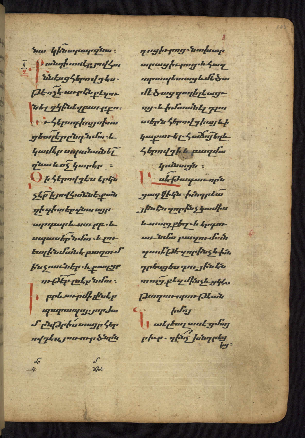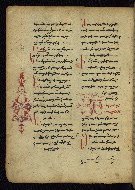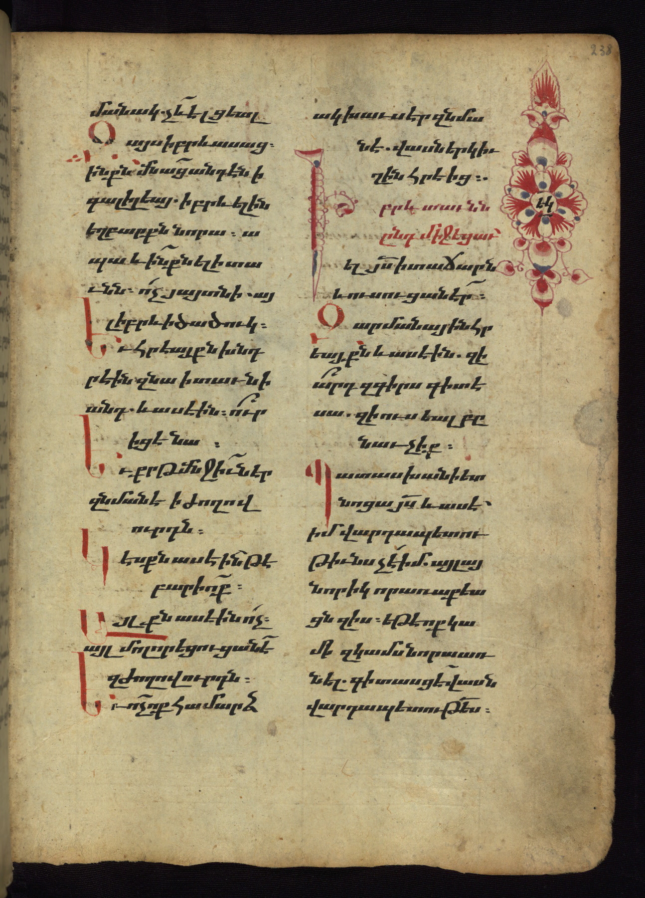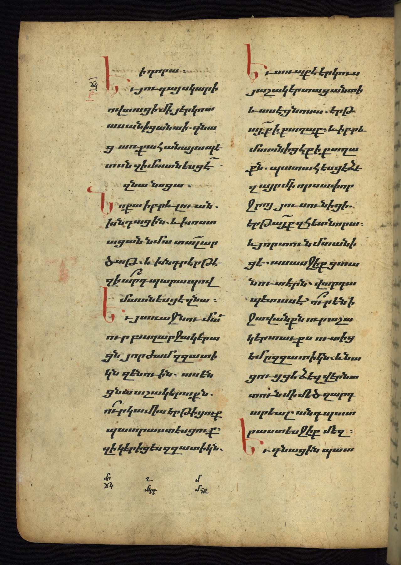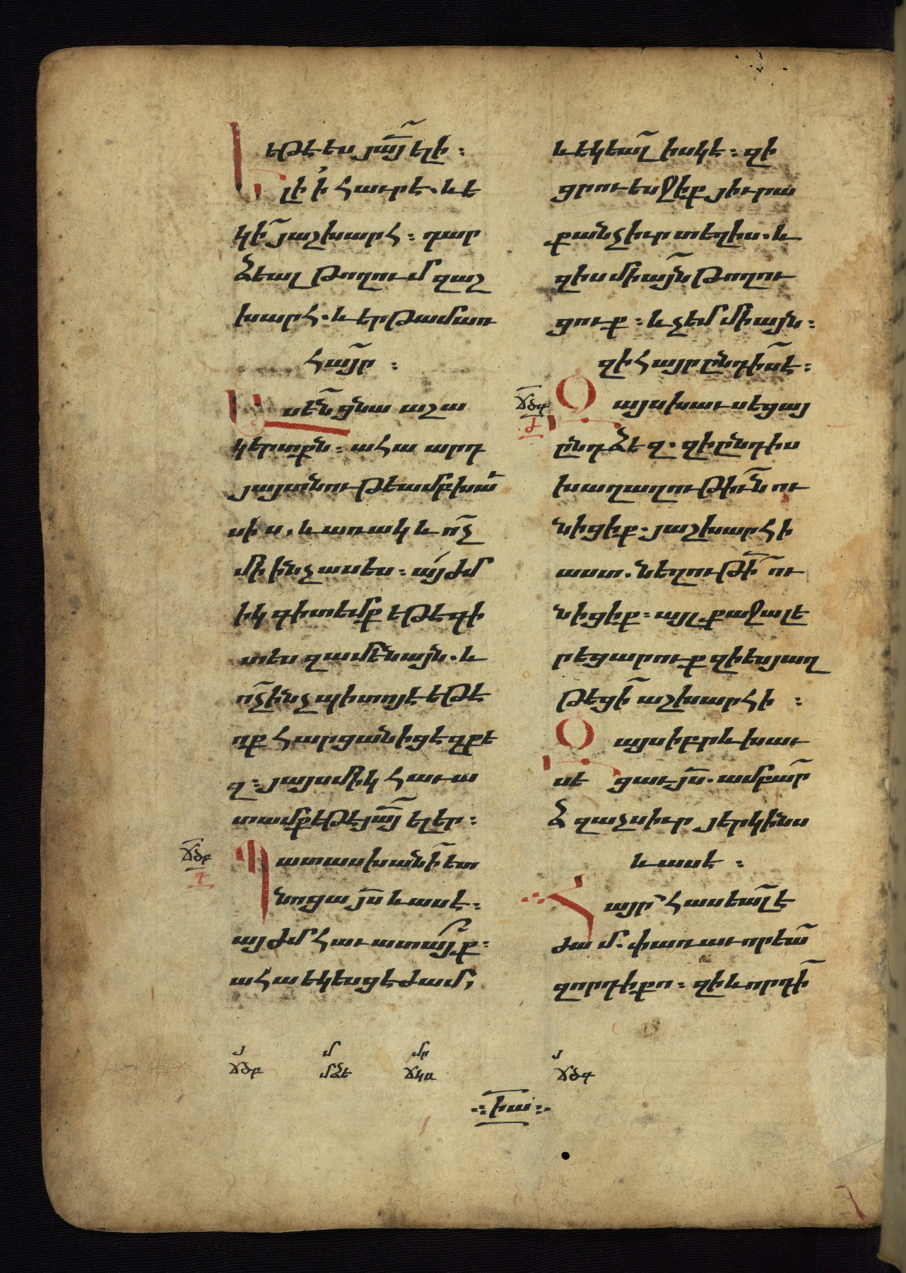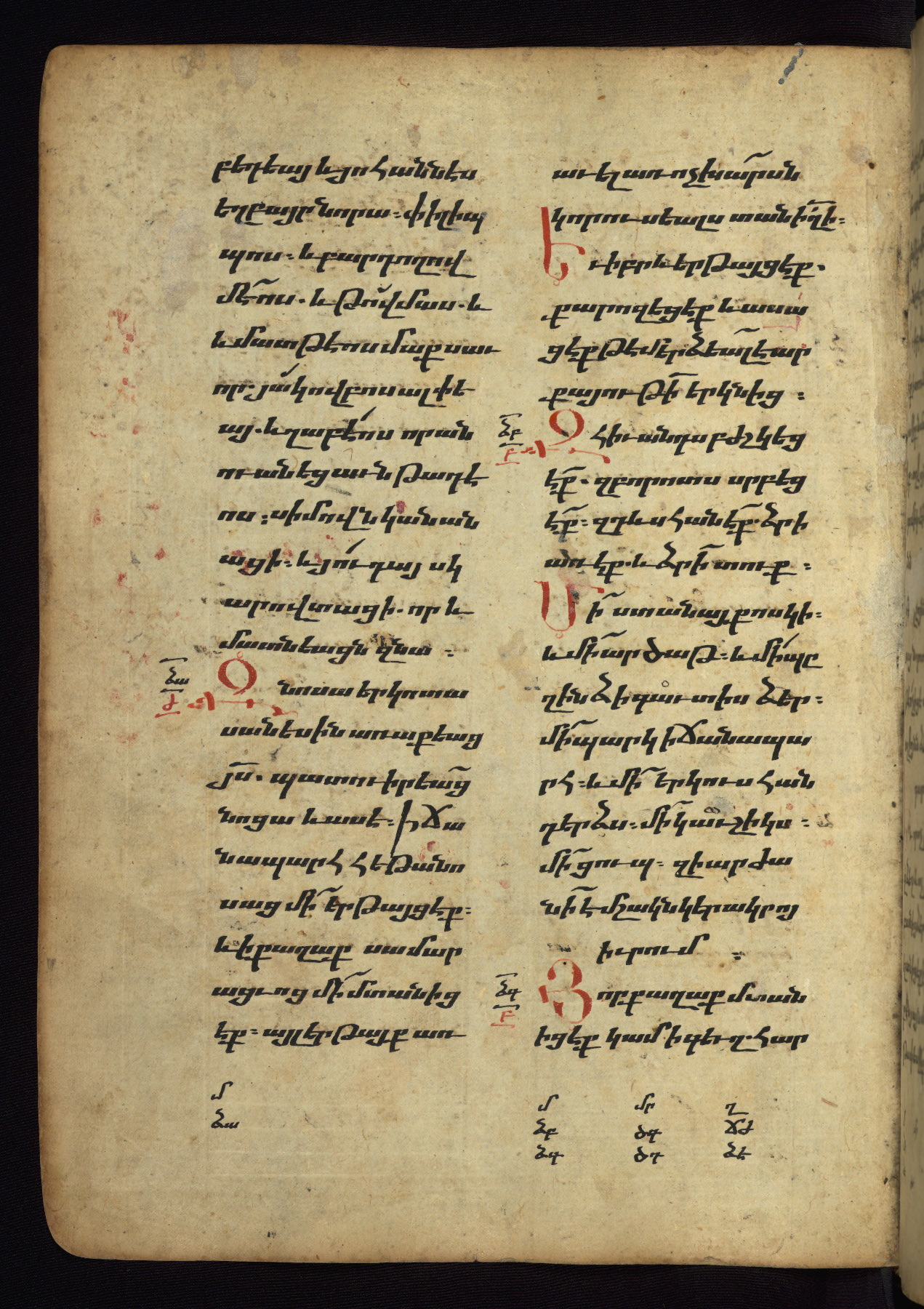 This Gospels manuscript was written in 937 of the Armenian era [1488 CE] in the province of Ekełeac' by the priest Łazar at the monastery of Surb Awgsend (St. Auxentius). Though the fifteenth-century manuscript was not a terribly costly production, it later came to be housed in a magnificent binding with large silver plaques showing the Presentation of the Christ Child in the Temple on the front and the Ascension on the back. This silver binding, which can be assigned to the seventeenth or early eighteenth century, was likely produced in Kayseri (Turkey). The manuscript's fifteenth-century Evangelist portraits show signs of Mongolian artistic influence, stemming from the time when Mongols had conquered the province. For a manuscript of similar style, see the Gospels in Jerusalem, no. 298, copied by Maghak’ia in 1497. The Walters' Silver Gospels was used over a long period by a succession of owners. Information about its history is given in its colophons and ownership inscriptions on the codex's final folios. One note indicates that the book was rebound in 1626, and offered to the church of Surb Astuacacin (Holy Theotokos) in memory of Caruk, Kirakos, and Girigor (fol. 280r). The last date given is the Armenian year 1161 (1712 CE), which may be when the manuscript was rebound.
