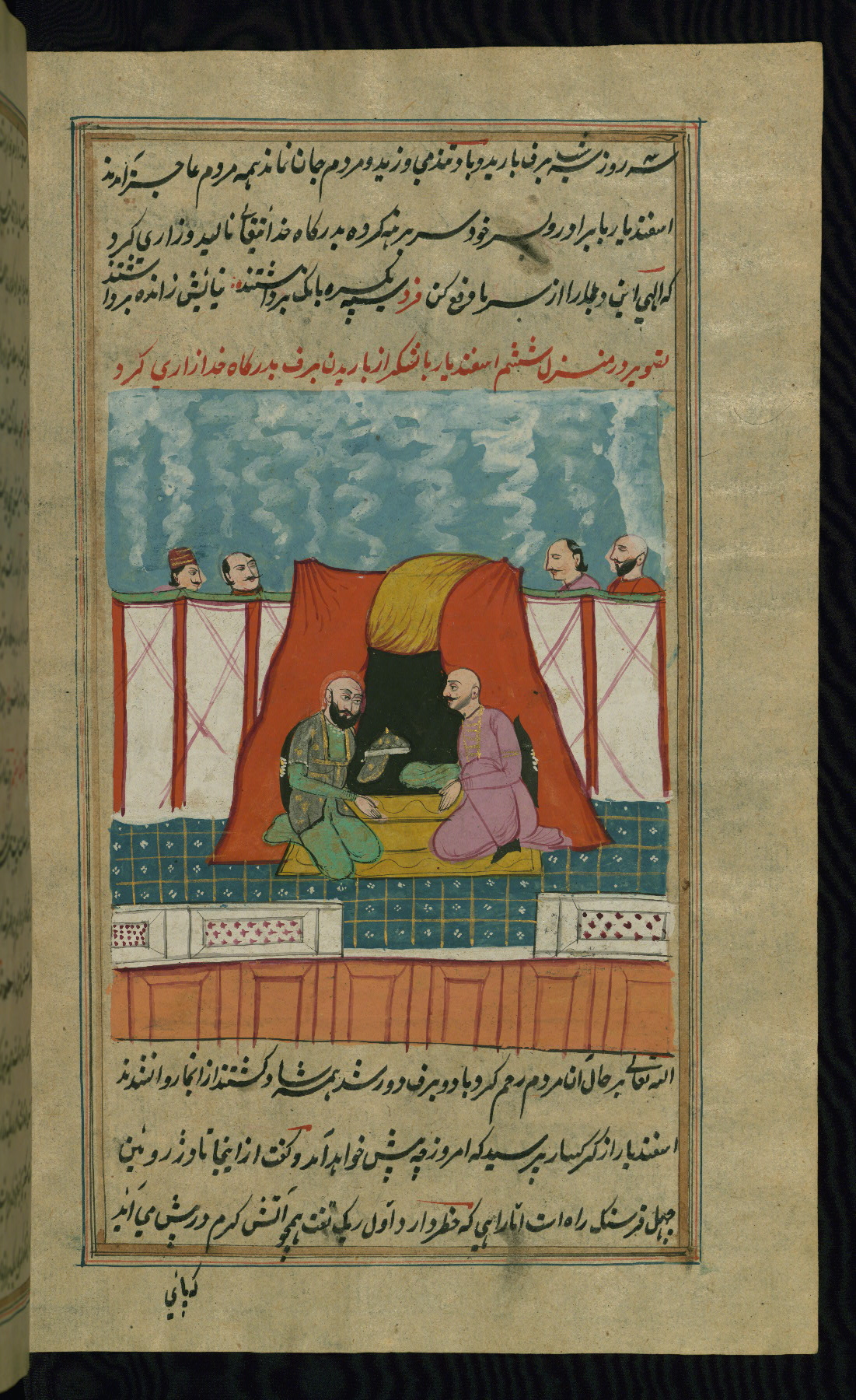 - Label: The subject of this scene, described in red nastaʿlīq script, is the killing of the legendary favorite son Īraj by his brother Tūr.