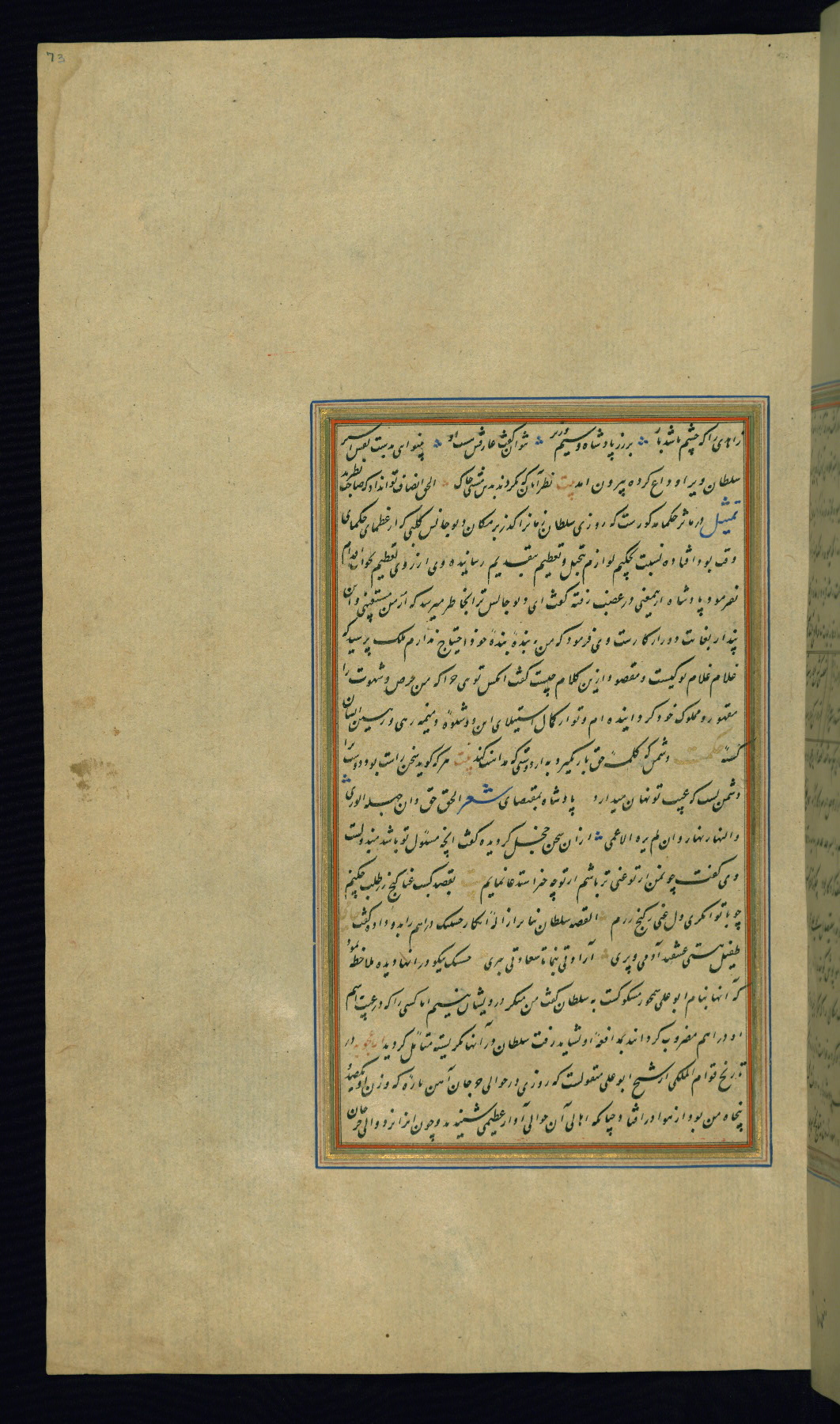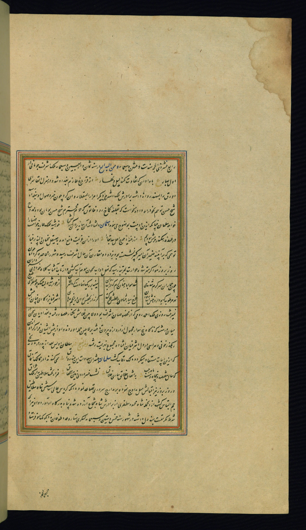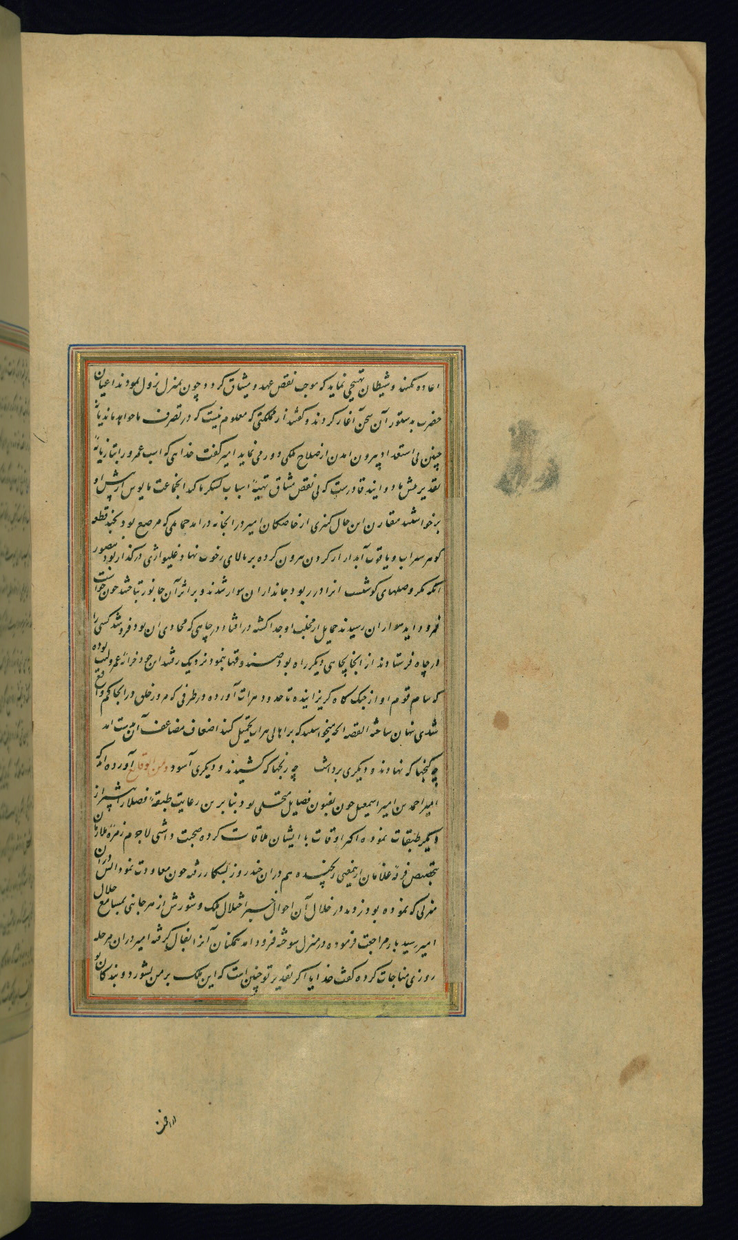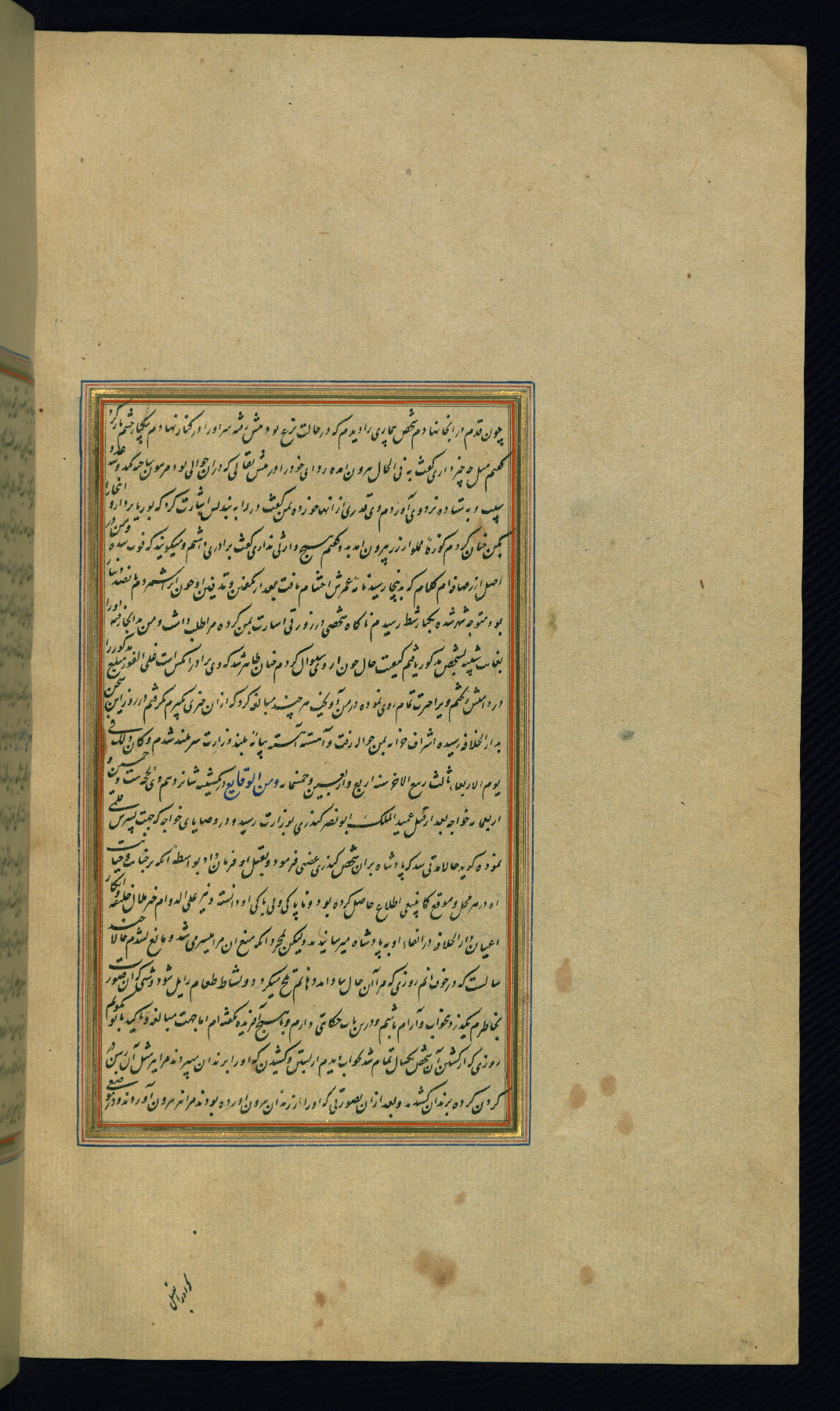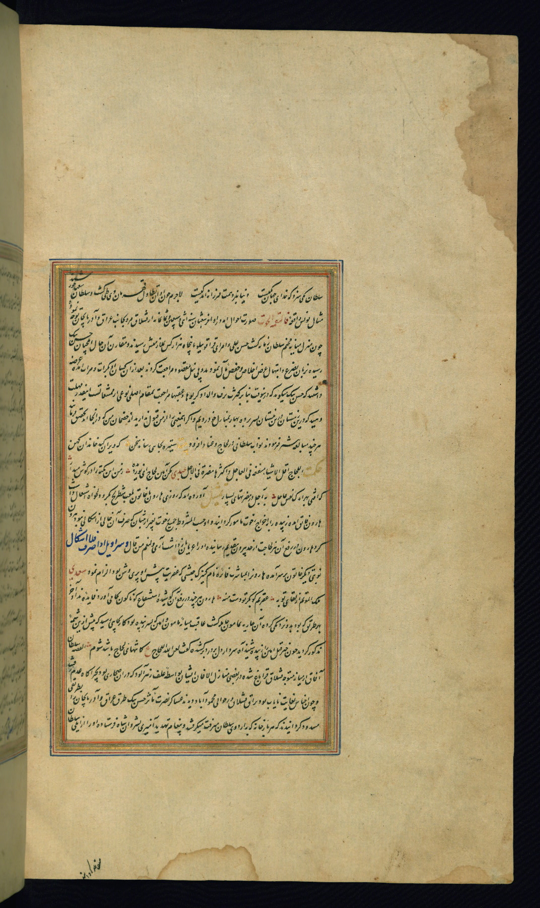 This is an illuminated and illustrated Safavid copy of the History of Nigaristan (Iran), known as Kitāb-i Nigāristān or Tārīkh-i Nigāristān by Ahmad Ghaffārī (d. 975 AH / 1567-8 CE). The colophon indicates that it was completed on 5 Shawwāl 976 AH / 1569 CE. The manuscript opens with a double-page illuminated frontispiece, and there are eight paintings illustrating the text in a style that has been associated with the school of painting at Shīrāz. The dark brown/black leather binding, which is contemporary with the manuscript, has a large central panel with oval and pendants. The border is comprised of cartouches alternating with roundels. All are gold-brushed and decorated with floral and cloud motifs.
