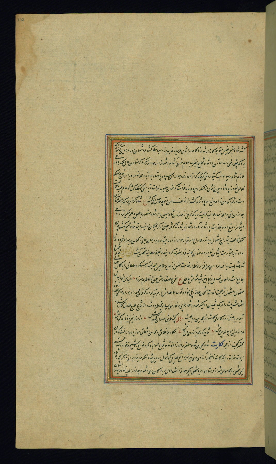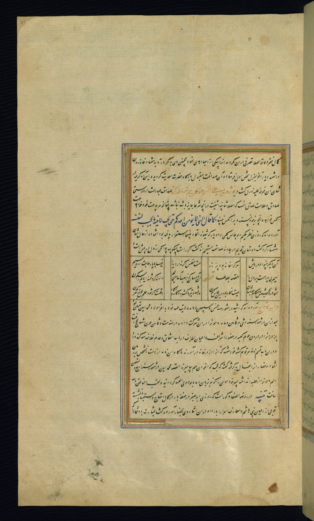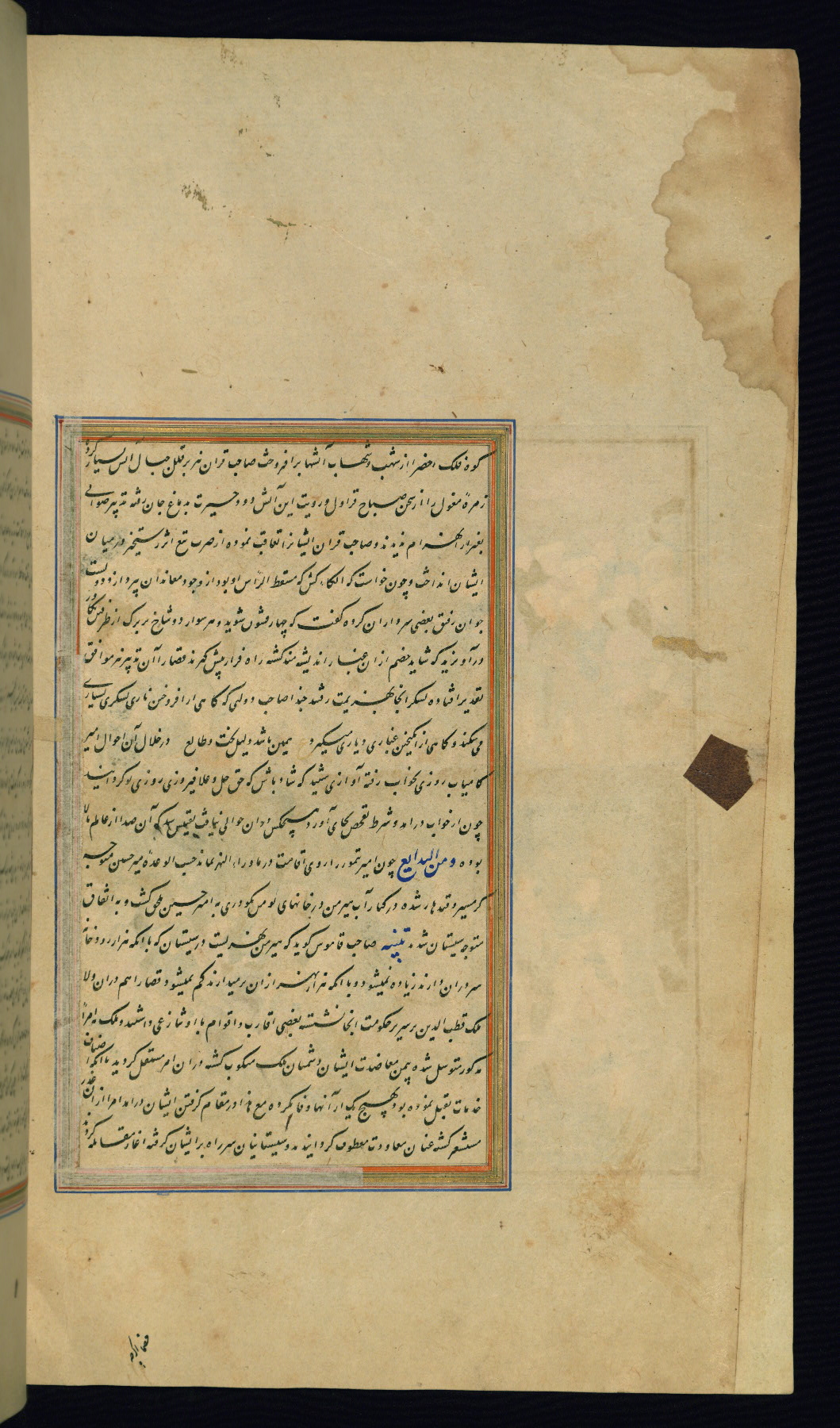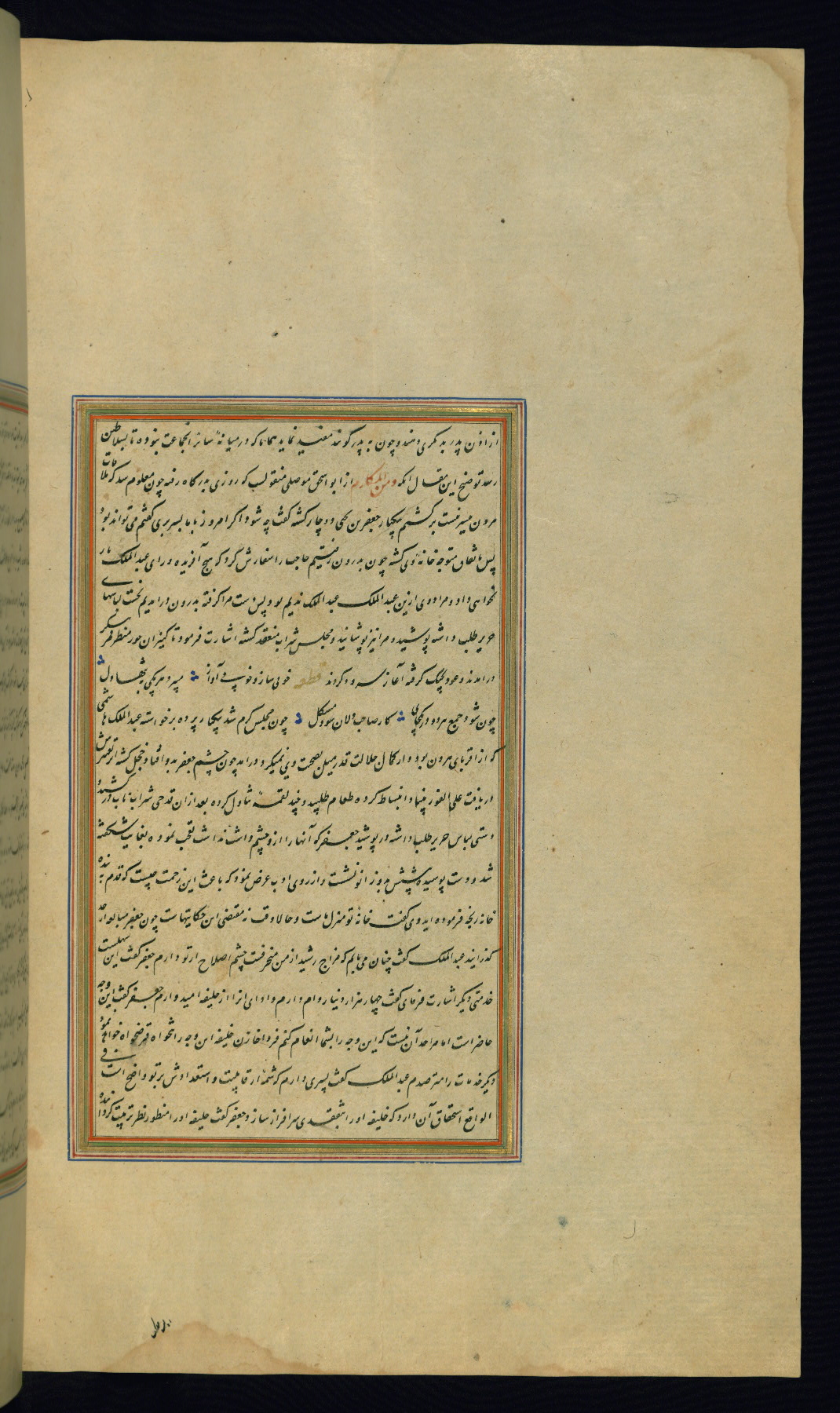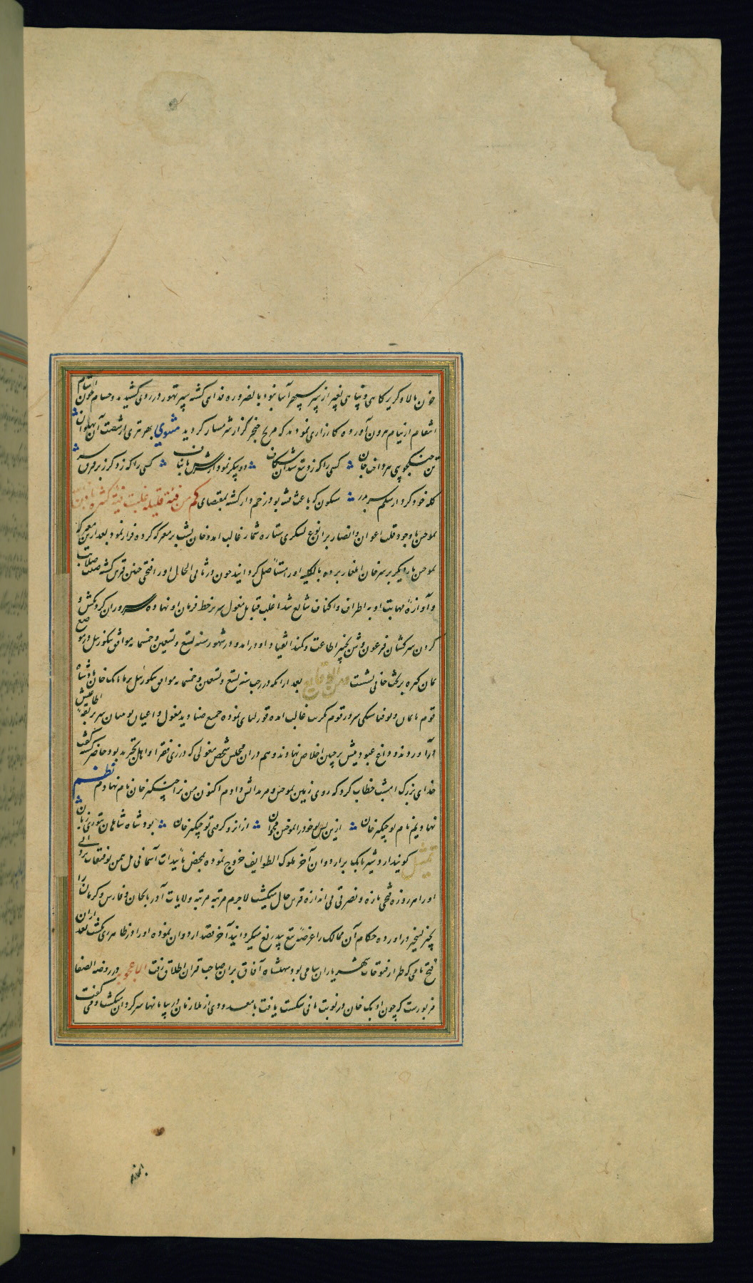 This is an illuminated and illustrated Safavid copy of the History of Nigaristan (Iran), known as Kitāb-i Nigāristān or Tārīkh-i Nigāristān by Ahmad Ghaffārī (d. 975 AH / 1567-8 CE). The colophon indicates that it was completed on 5 Shawwāl 976 AH / 1569 CE. The manuscript opens with a double-page illuminated frontispiece, and there are eight paintings illustrating the text in a style that has been associated with the school of painting at Shīrāz. The dark brown/black leather binding, which is contemporary with the manuscript, has a large central panel with oval and pendants. The border is comprised of cartouches alternating with roundels. All are gold-brushed and decorated with floral and cloud motifs.