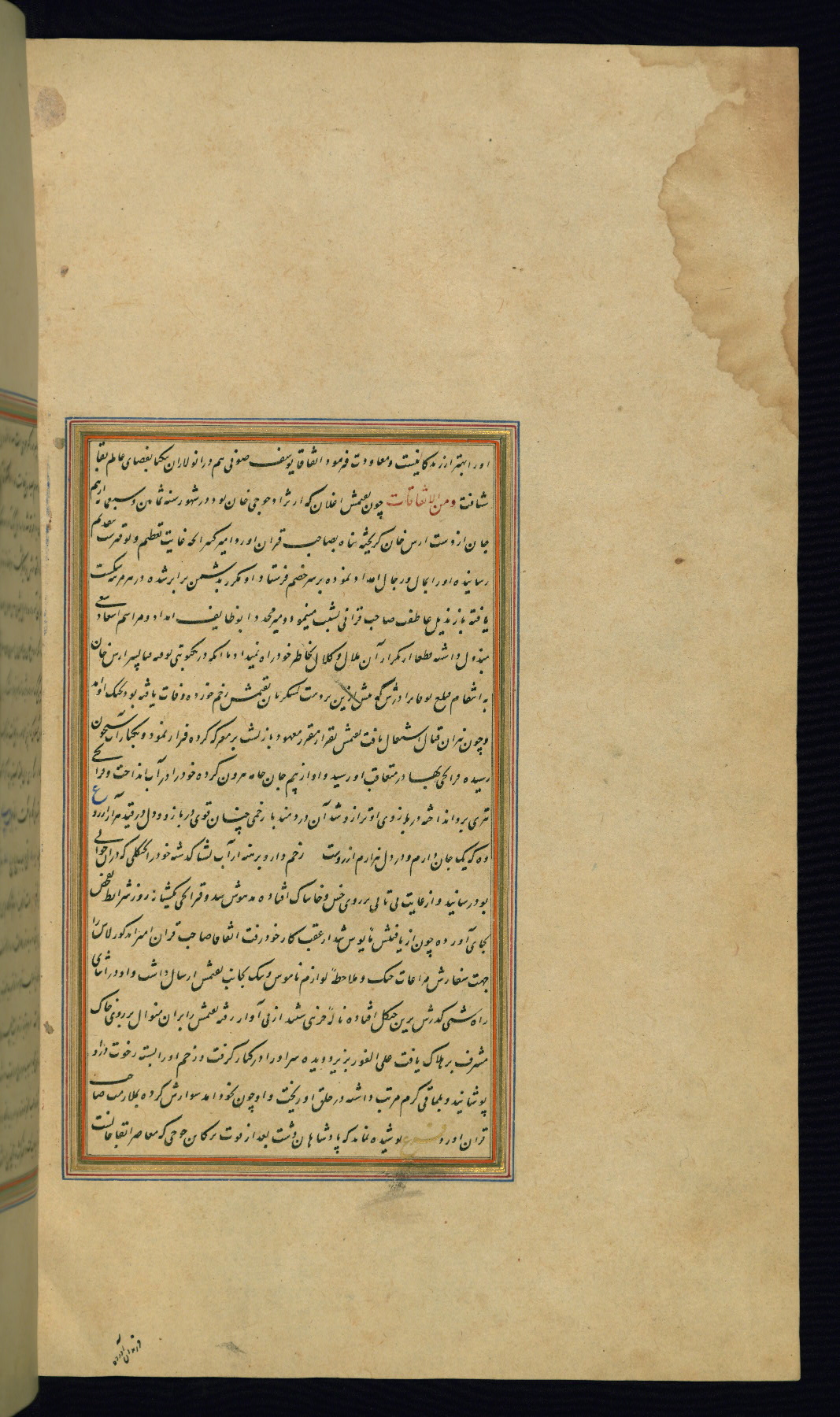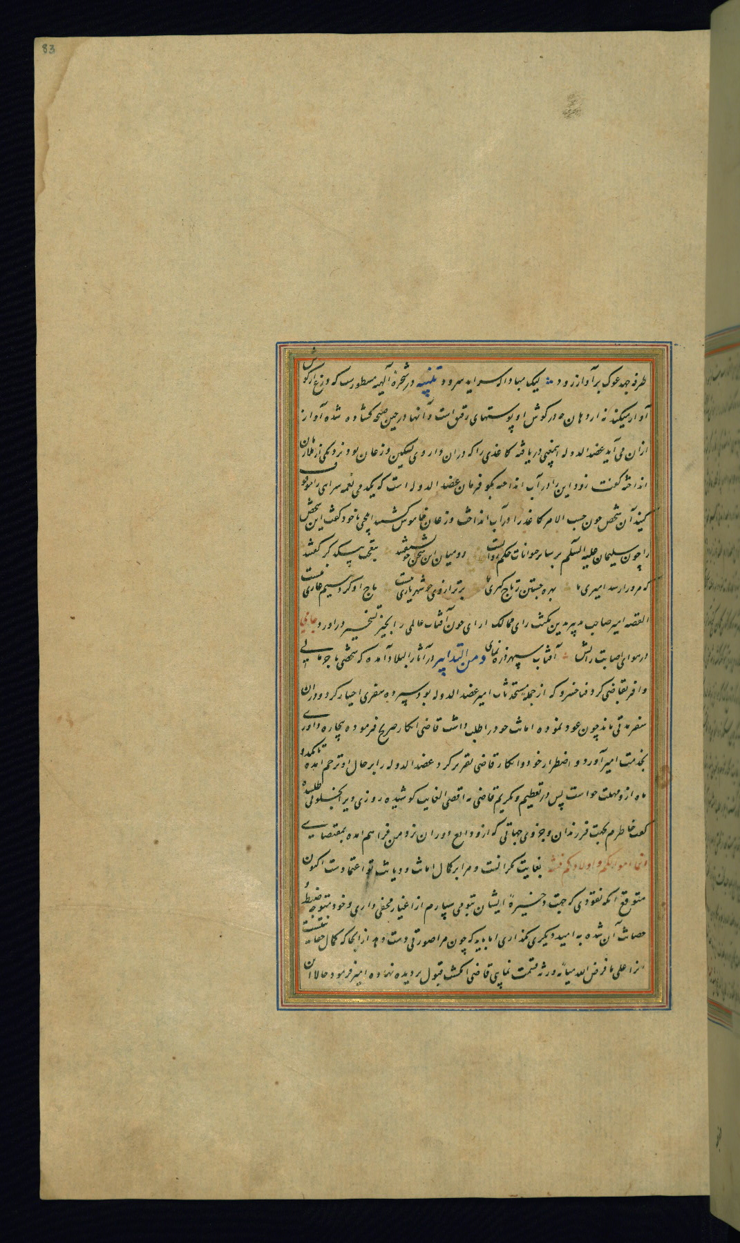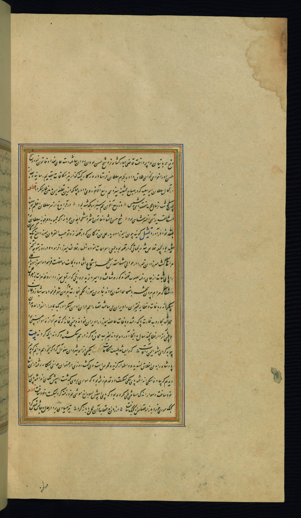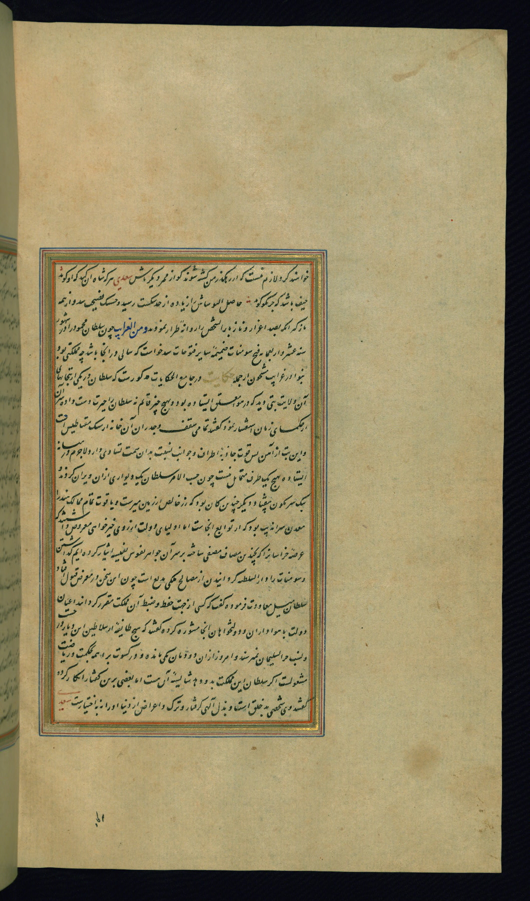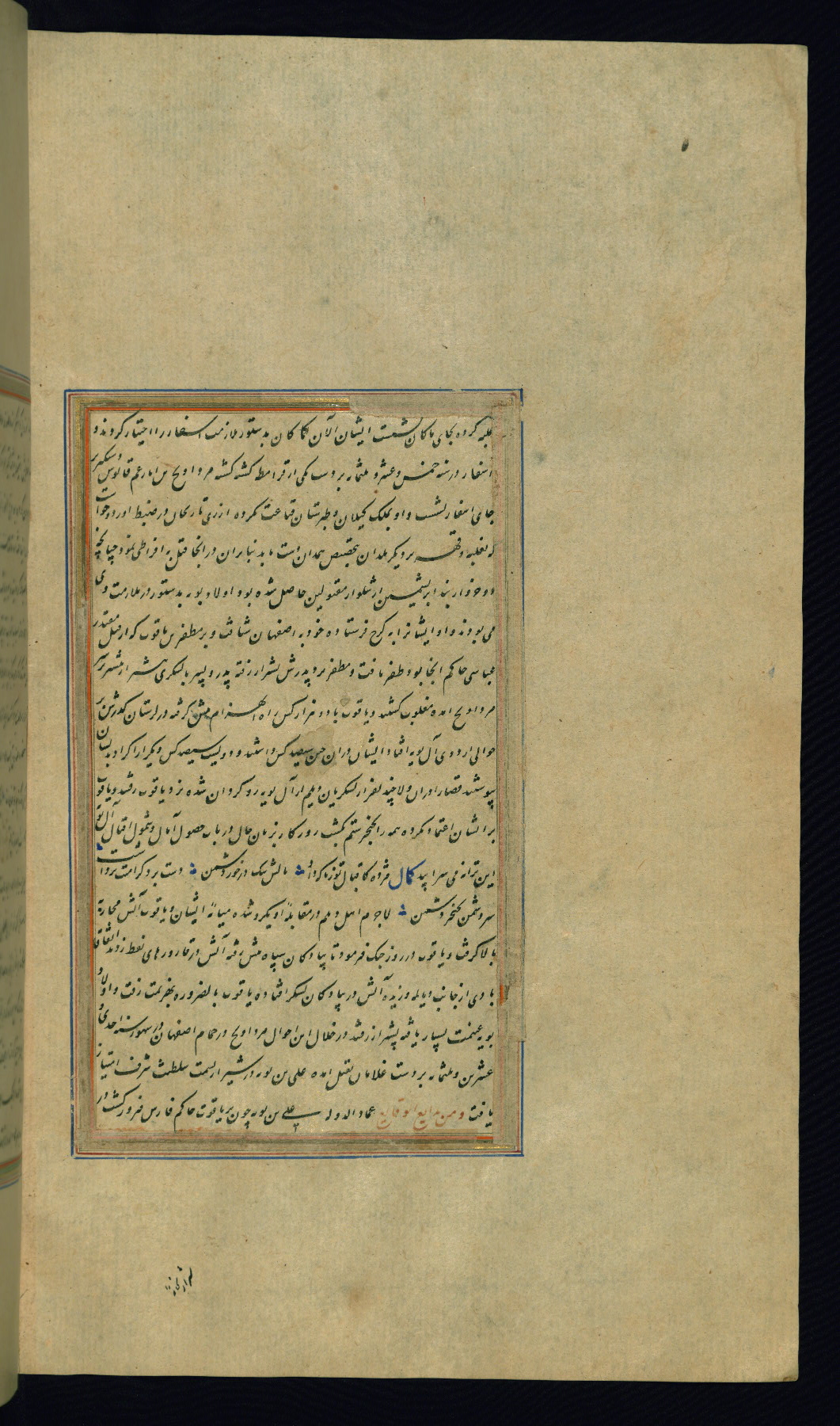 This is an illuminated and illustrated Safavid copy of the History of Nigaristan (Iran), known as Kitāb-i Nigāristān or Tārīkh-i Nigāristān by Ahmad Ghaffārī (d. 975 AH / 1567-8 CE). The colophon indicates that it was completed on 5 Shawwāl 976 AH / 1569 CE. The manuscript opens with a double-page illuminated frontispiece, and there are eight paintings illustrating the text in a style that has been associated with the school of painting at Shīrāz. The dark brown/black leather binding, which is contemporary with the manuscript, has a large central panel with oval and pendants. The border is comprised of cartouches alternating with roundels. All are gold-brushed and decorated with floral and cloud motifs.