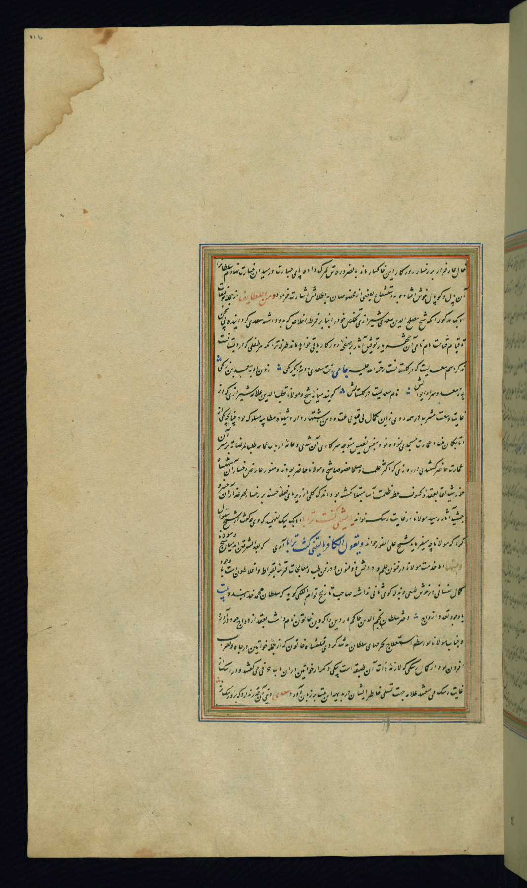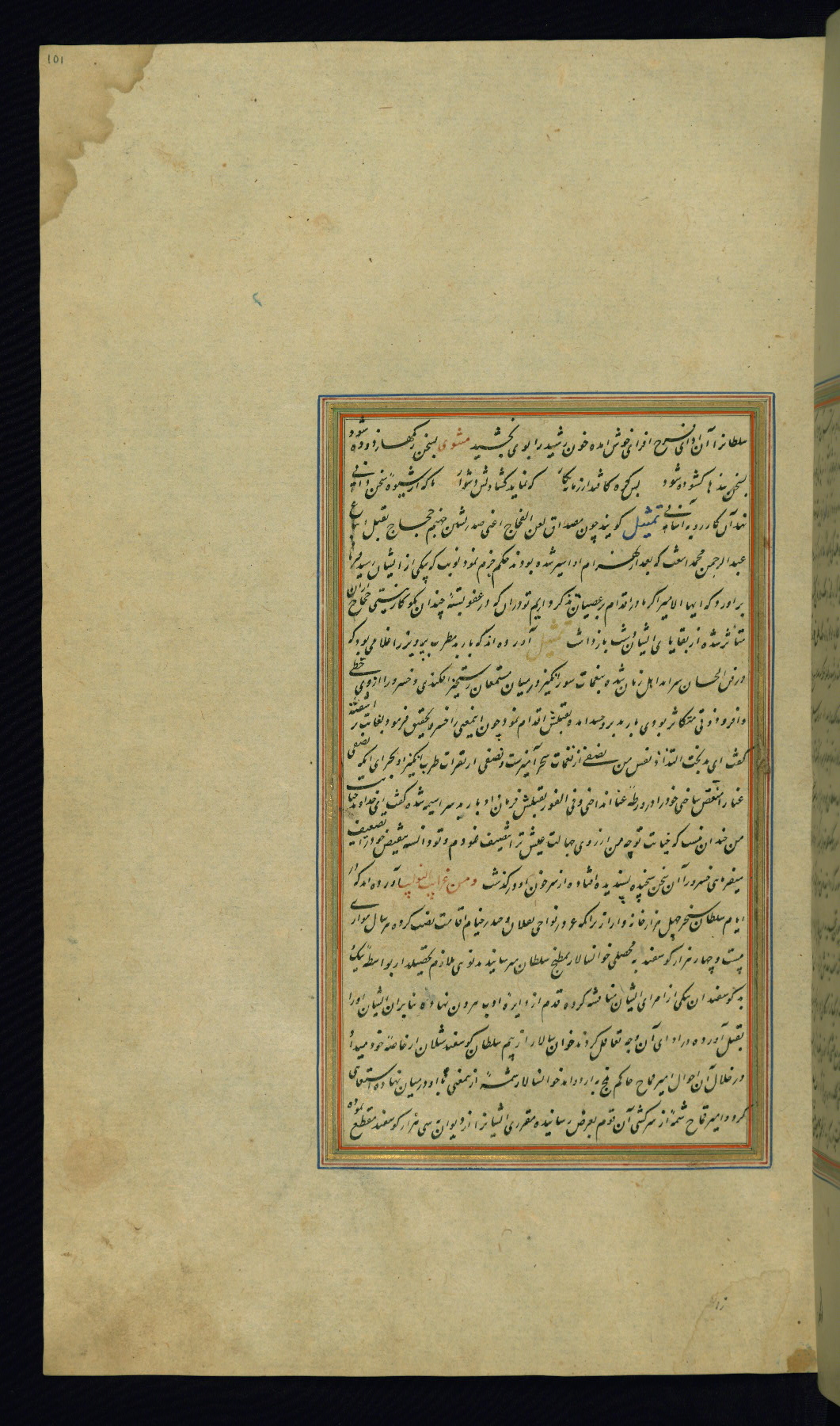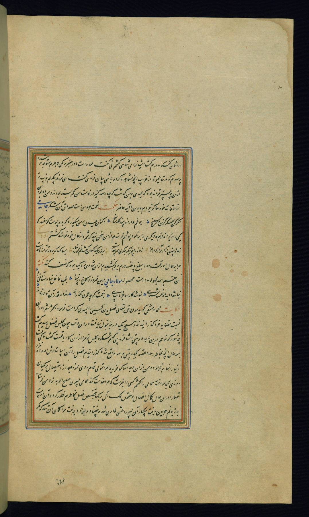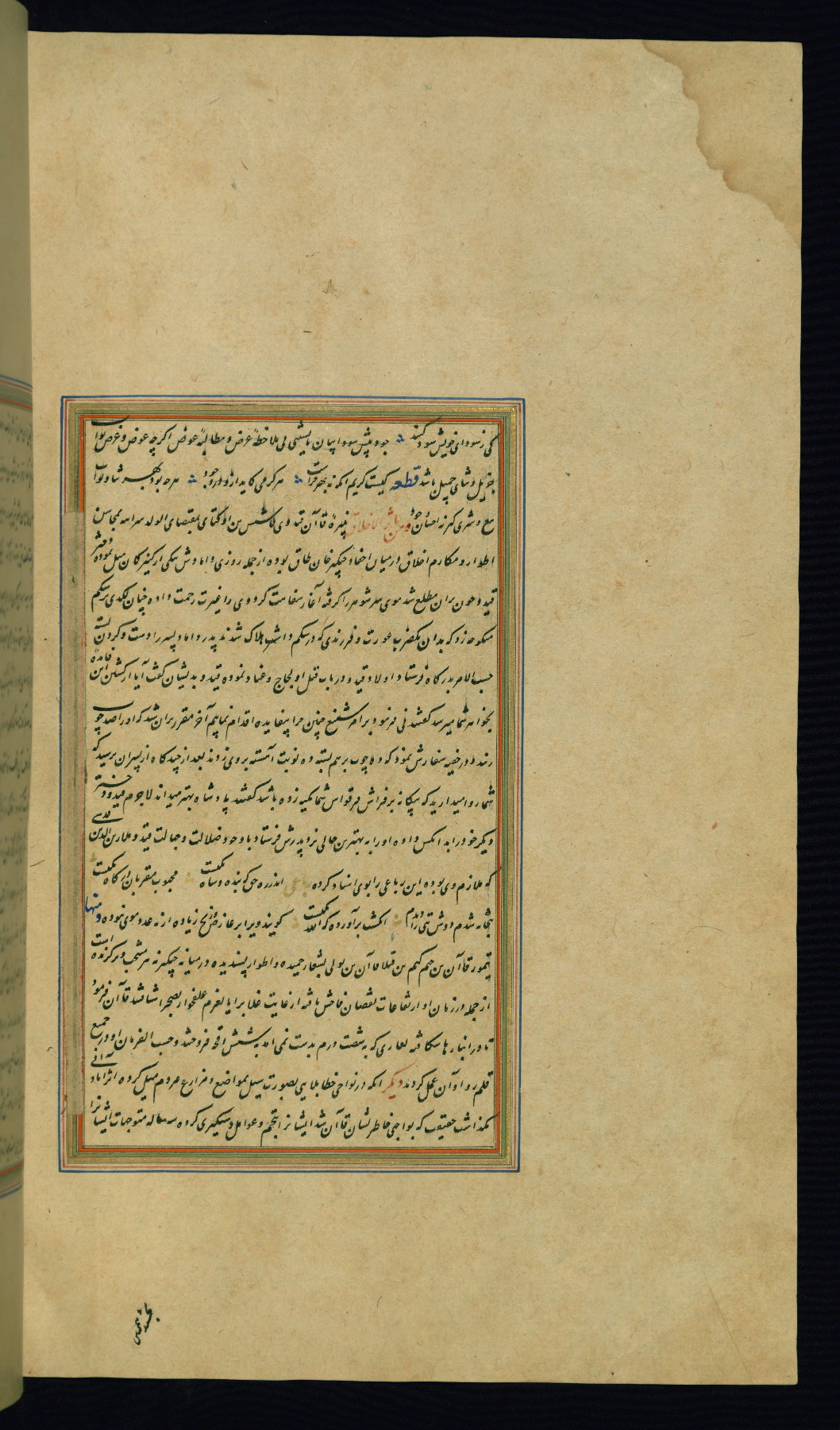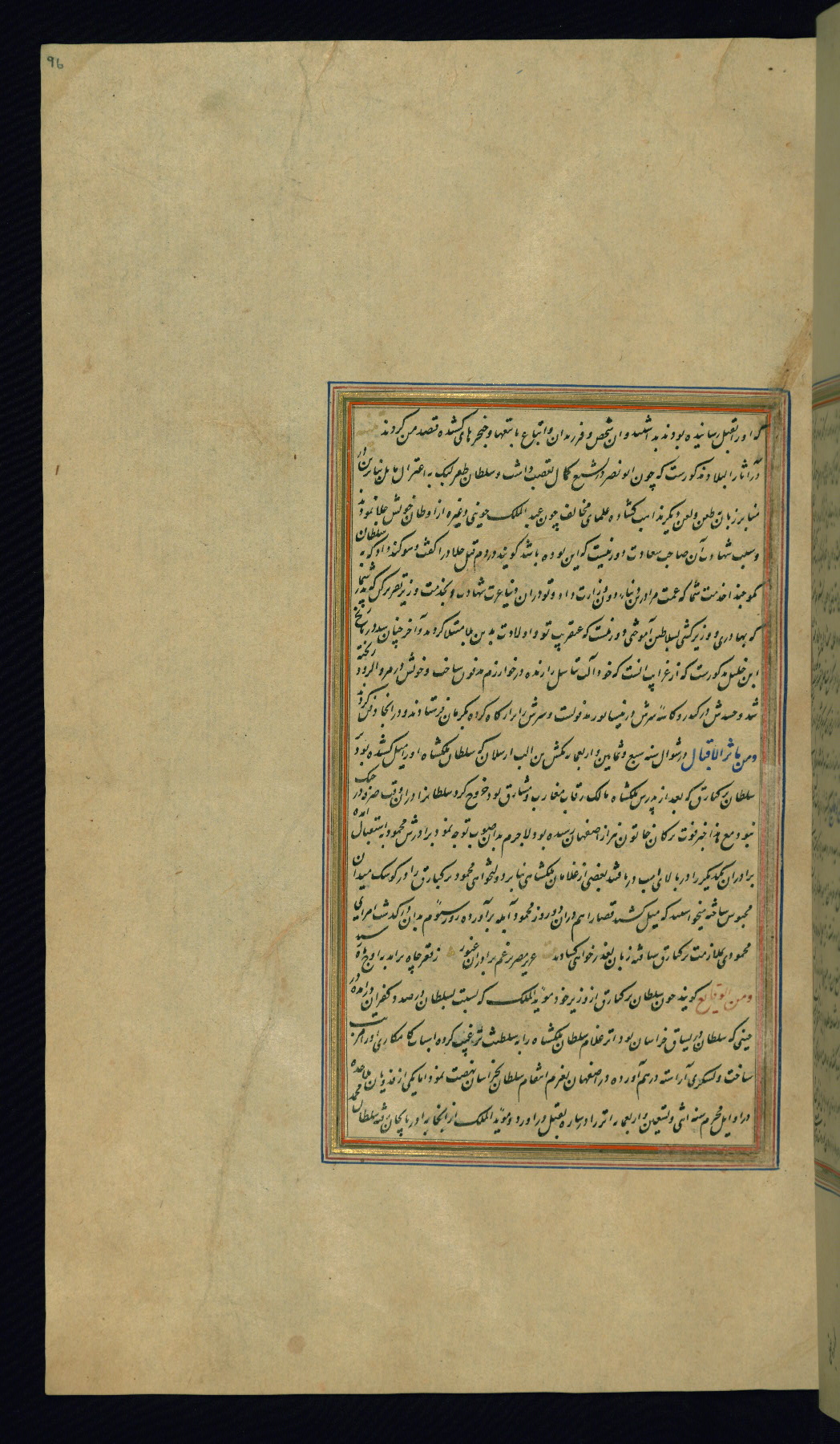 This is an illuminated and illustrated Safavid copy of the History of Nigaristan (Iran), known as Kitāb-i Nigāristān or Tārīkh-i Nigāristān by Ahmad Ghaffārī (d. 975 AH / 1567-8 CE). The colophon indicates that it was completed on 5 Shawwāl 976 AH / 1569 CE. The manuscript opens with a double-page illuminated frontispiece, and there are eight paintings illustrating the text in a style that has been associated with the school of painting at Shīrāz. The dark brown/black leather binding, which is contemporary with the manuscript, has a large central panel with oval and pendants. The border is comprised of cartouches alternating with roundels. All are gold-brushed and decorated with floral and cloud motifs.