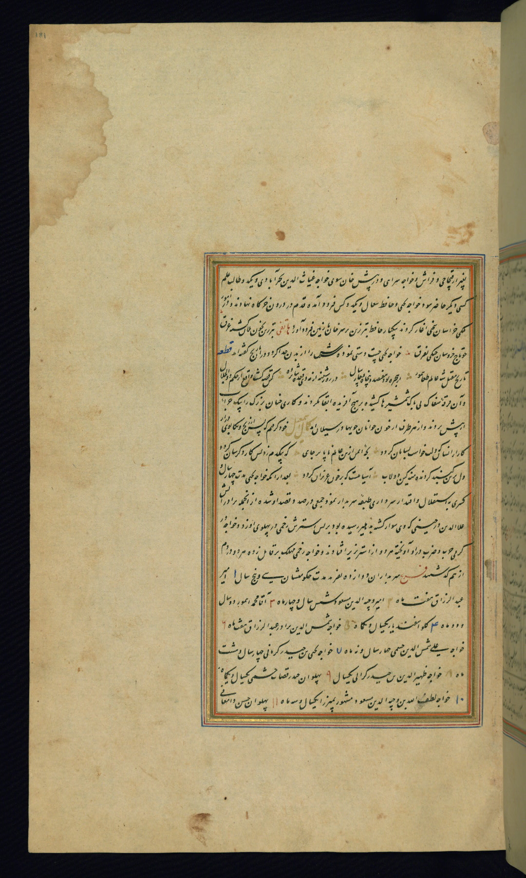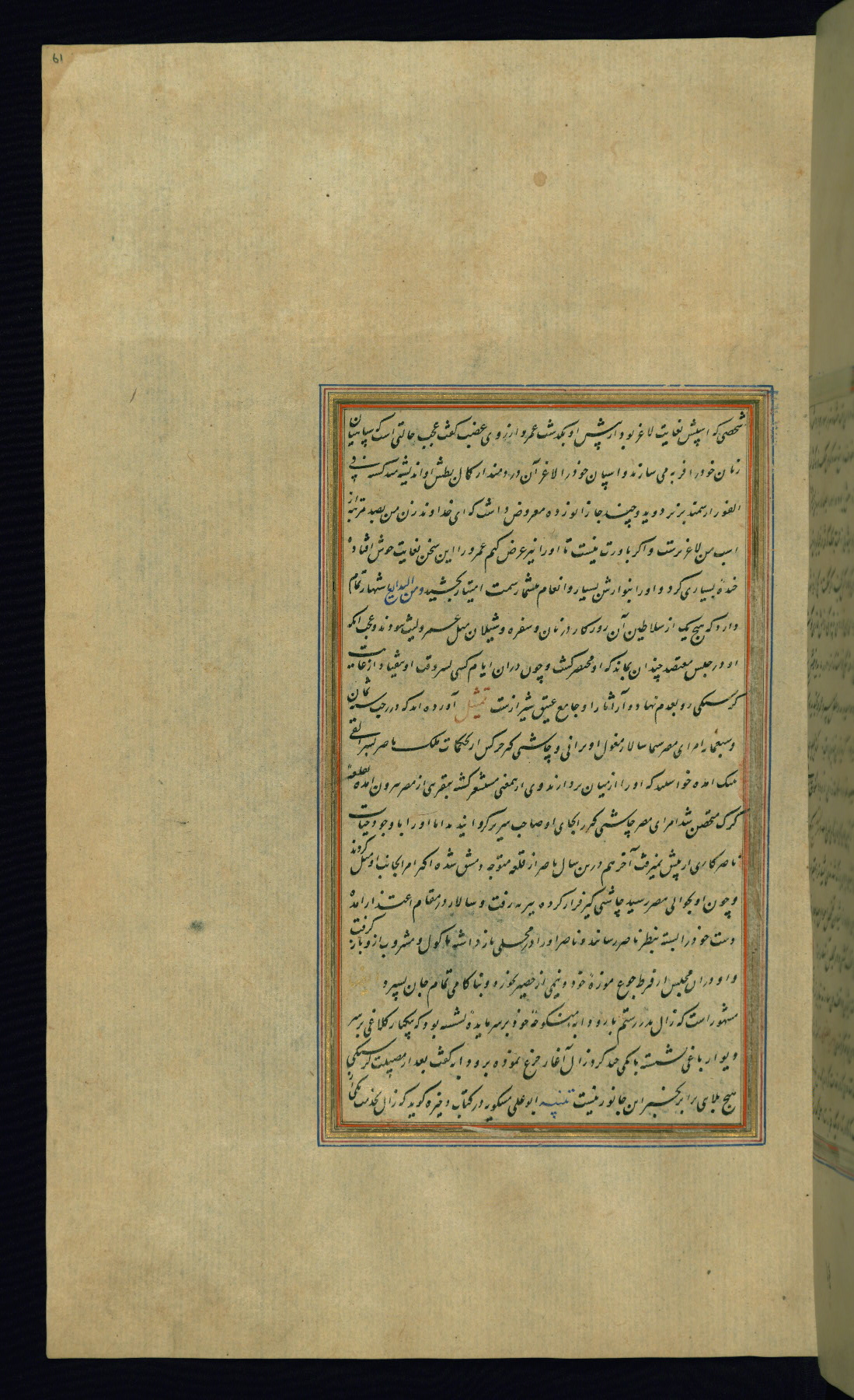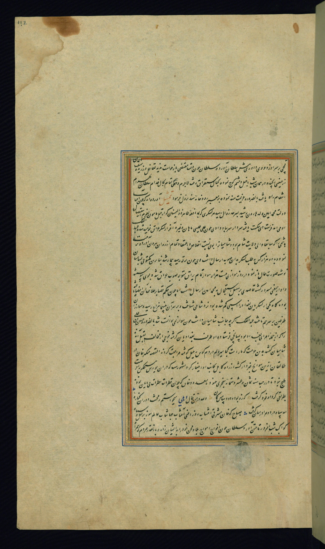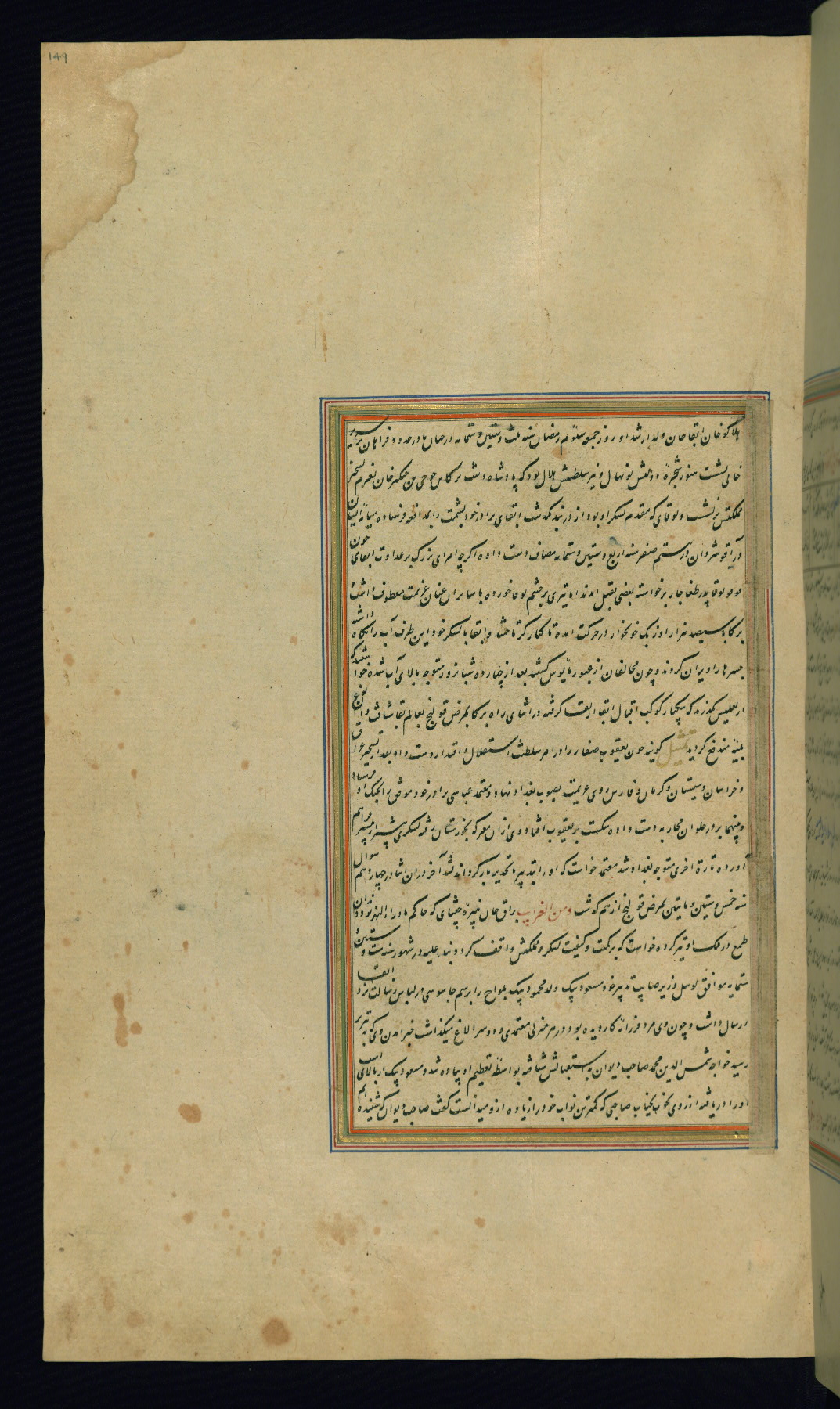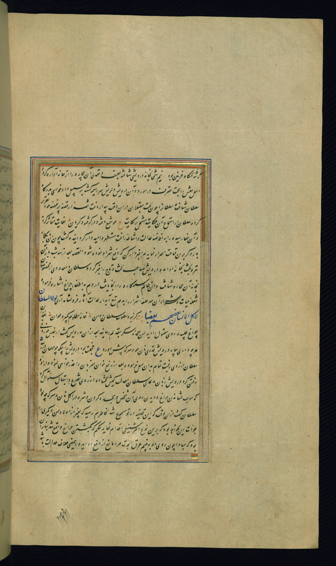 This is an illuminated and illustrated Safavid copy of the History of Nigaristan (Iran), known as Kitāb-i Nigāristān or Tārīkh-i Nigāristān by Ahmad Ghaffārī (d. 975 AH / 1567-8 CE). The colophon indicates that it was completed on 5 Shawwāl 976 AH / 1569 CE. The manuscript opens with a double-page illuminated frontispiece, and there are eight paintings illustrating the text in a style that has been associated with the school of painting at Shīrāz. The dark brown/black leather binding, which is contemporary with the manuscript, has a large central panel with oval and pendants. The border is comprised of cartouches alternating with roundels. All are gold-brushed and decorated with floral and cloud motifs.