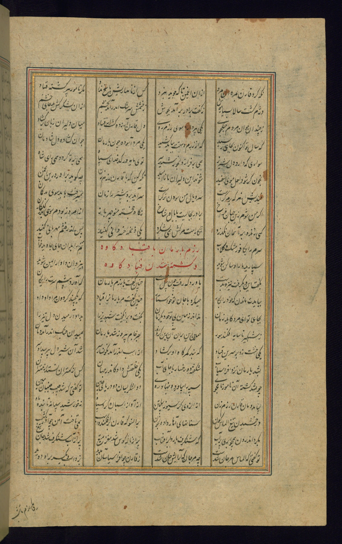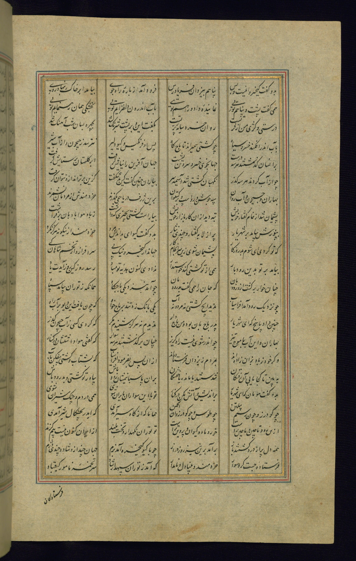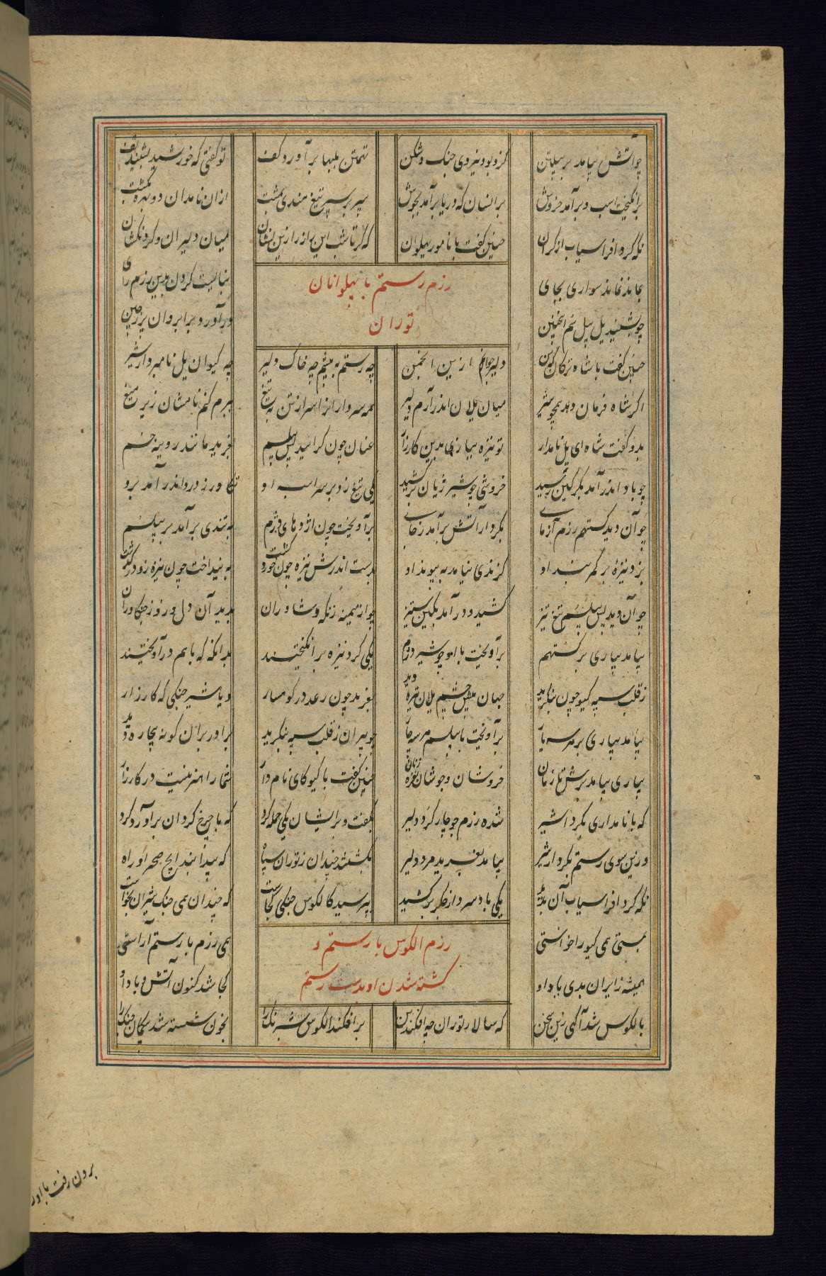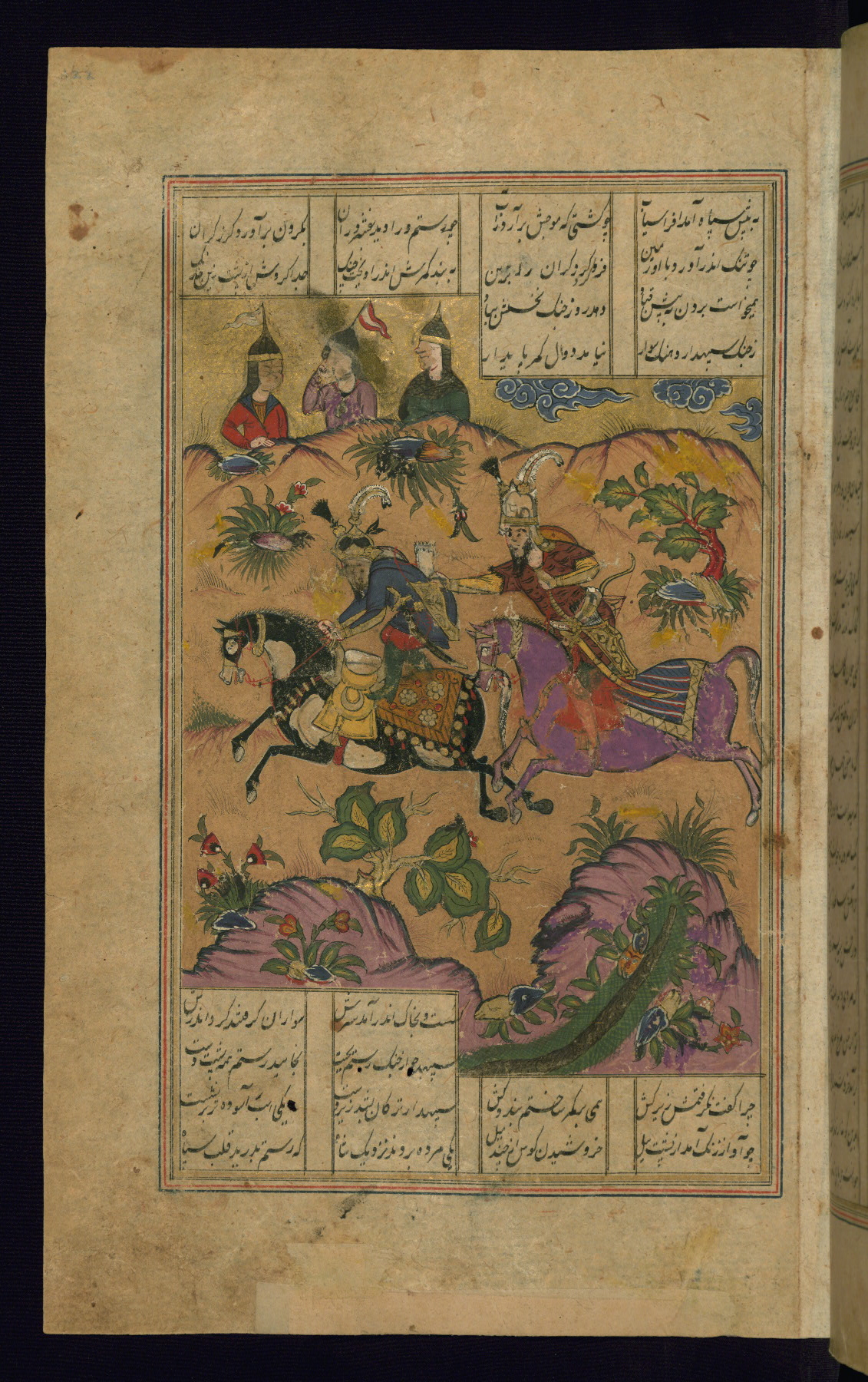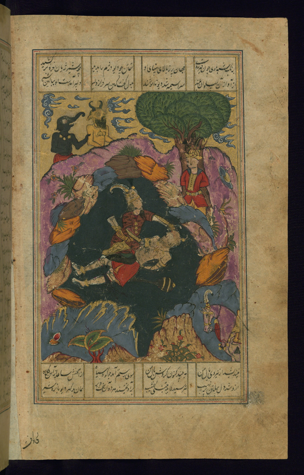 This is an illuminated and illustrated Safavid copy of the Shāhnāmah (Book of kings) by Firdawsī (d. 411 or 416 AH / 1020-5 CE), dated 1028 AH / 1618-9 CE. The text, which is incomplete, begins with the preface (dībāchah), composed on the order of Bāysunghur. It is written in black nastaʿlīq script with chapter/section headings in red. The manuscript contains fourteen illustrations that appear to be later additions, perhaps dating to the 13th century A.H./ 19th century C.E., and may have been executed in India or Iran. The black leather binding is modern.