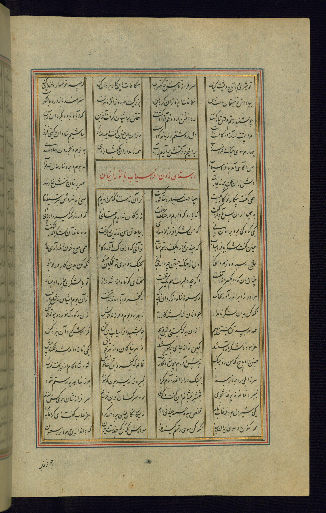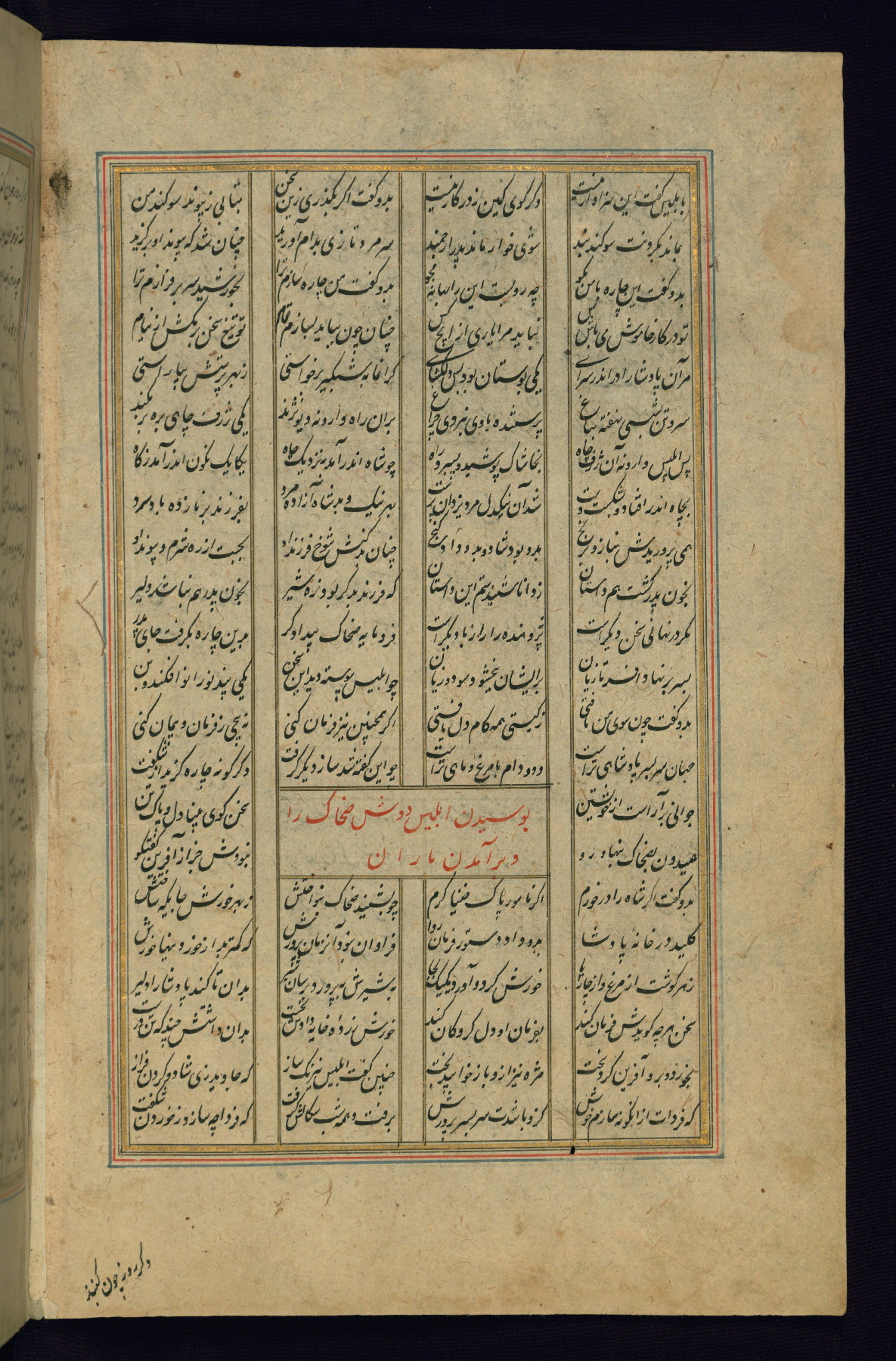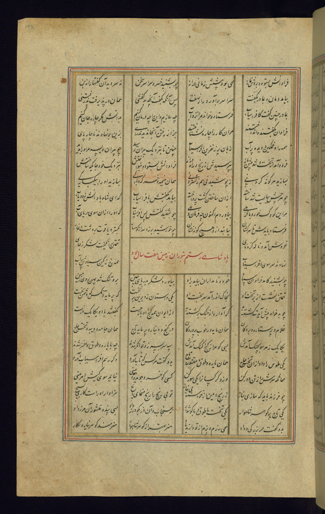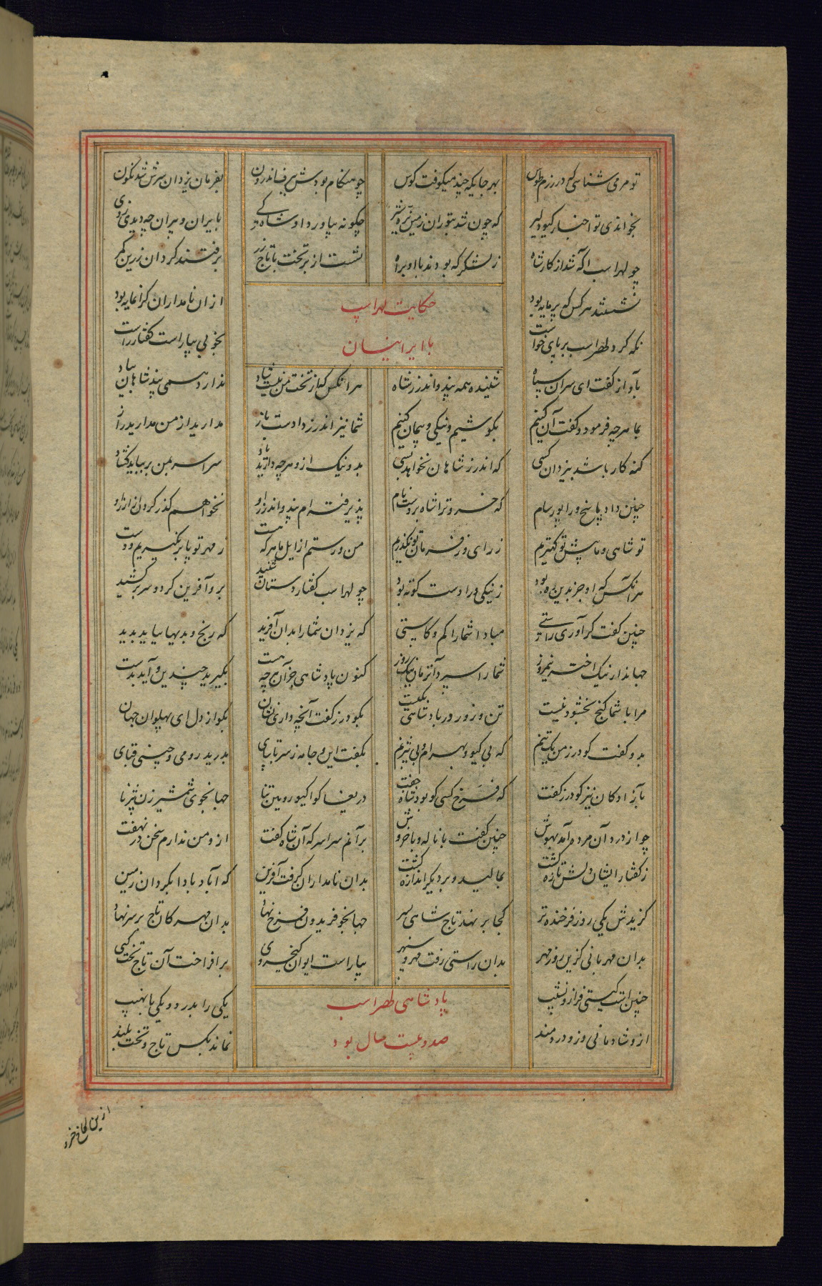 This is an illuminated and illustrated Safavid copy of the Shāhnāmah (Book of kings) by Firdawsī (d. 411 or 416 AH / 1020-5 CE), dated 1028 AH / 1618-9 CE. The text, which is incomplete, begins with the preface (dībāchah), composed on the order of Bāysunghur. It is written in black nastaʿlīq script with chapter/section headings in red. The manuscript contains fourteen illustrations that appear to be later additions, perhaps dating to the 13th century A.H./ 19th century C.E., and may have been executed in India or Iran. The black leather binding is modern.