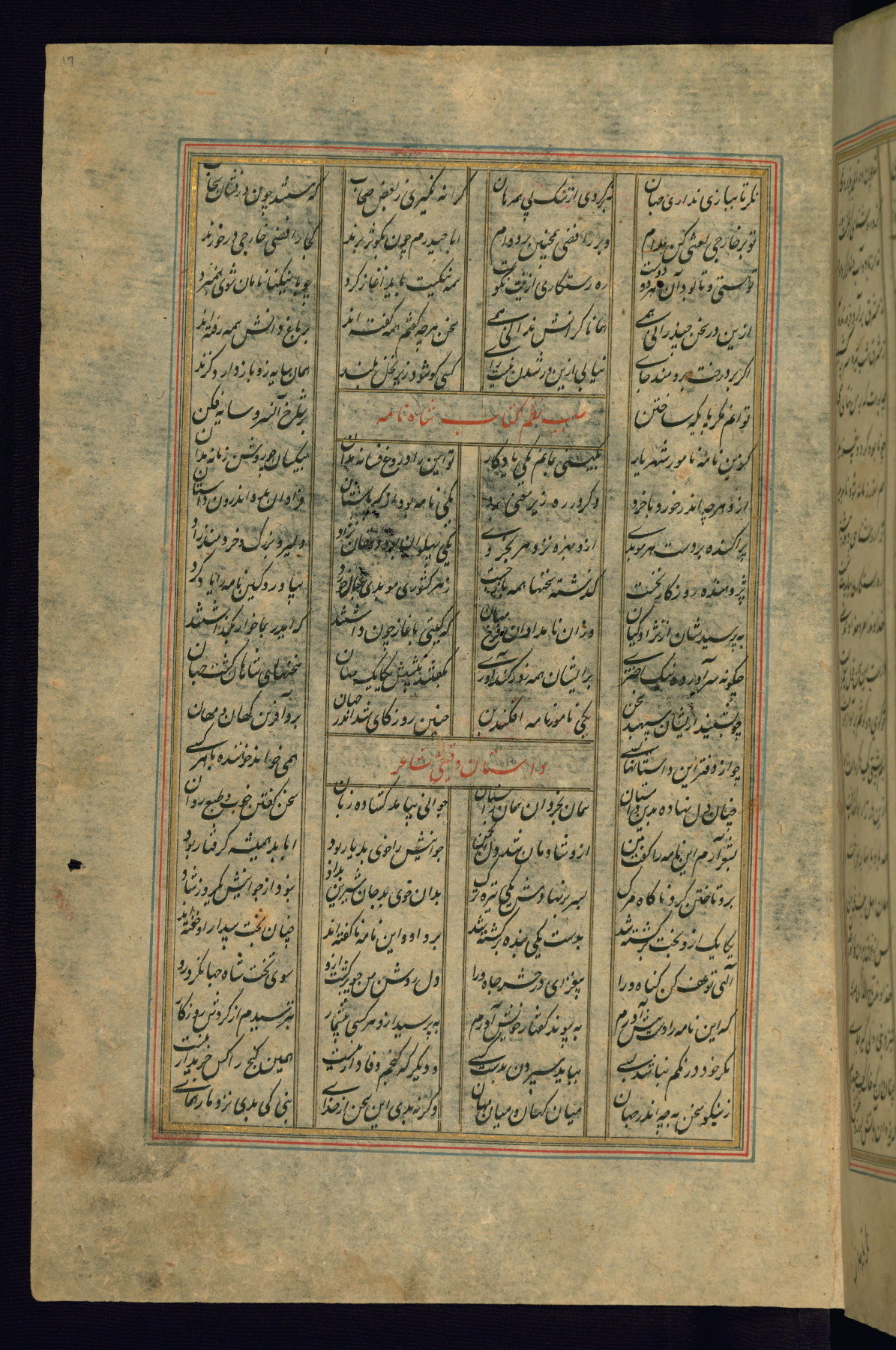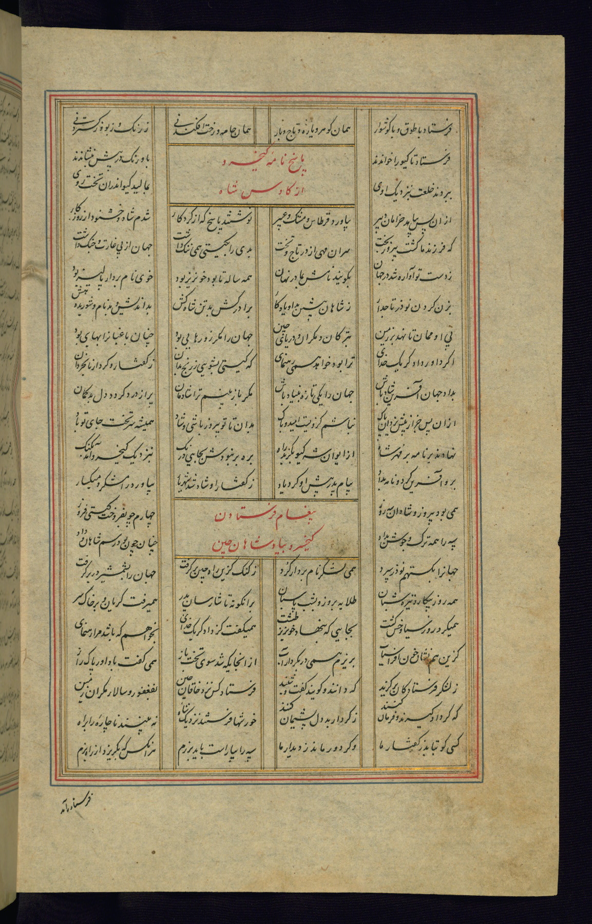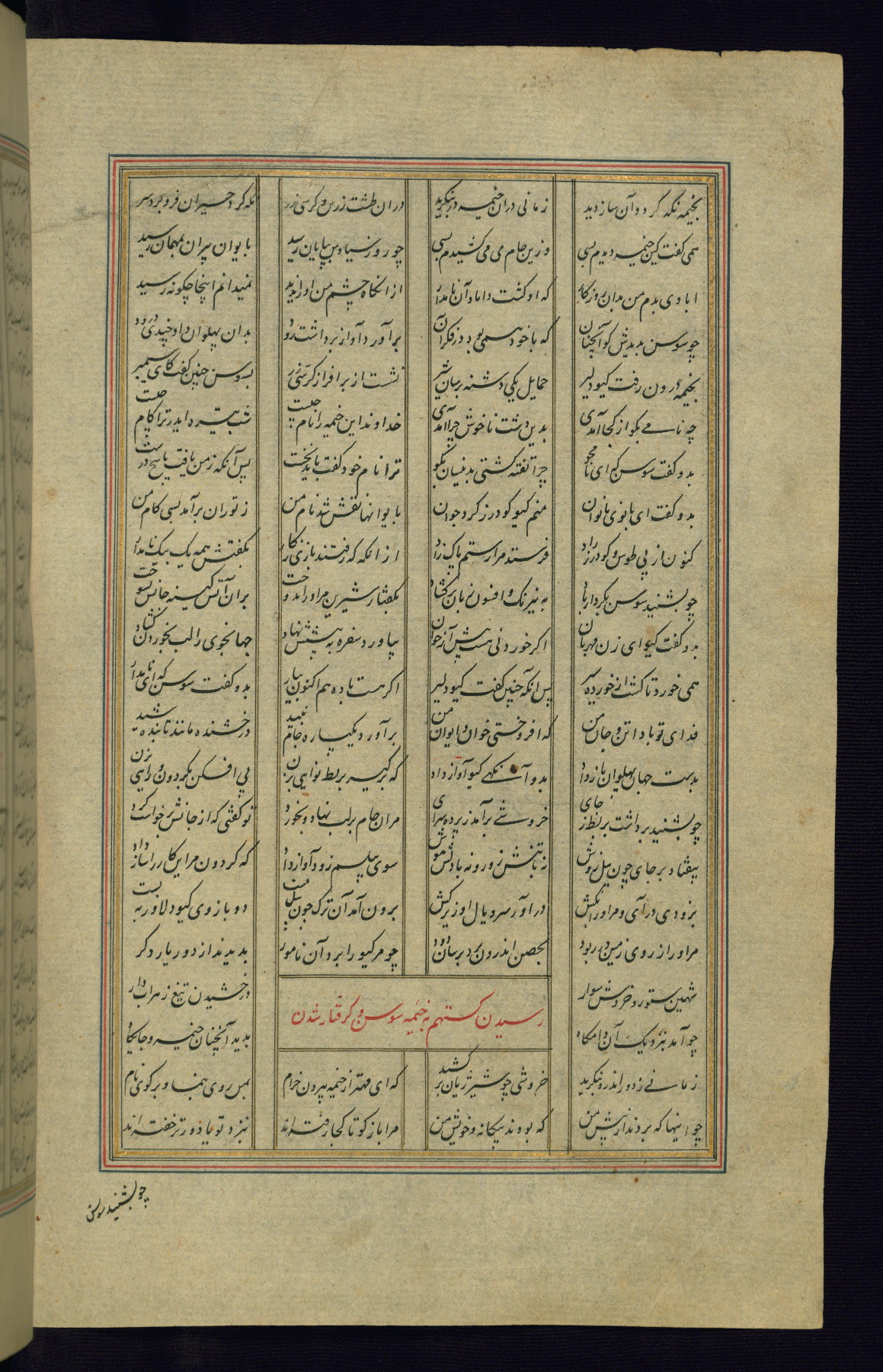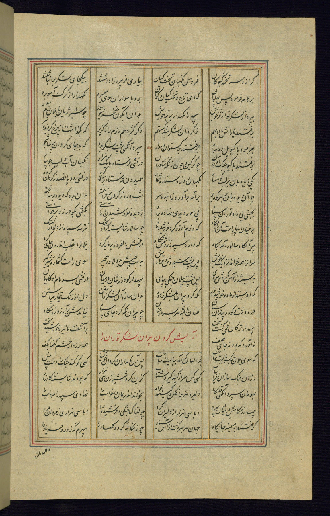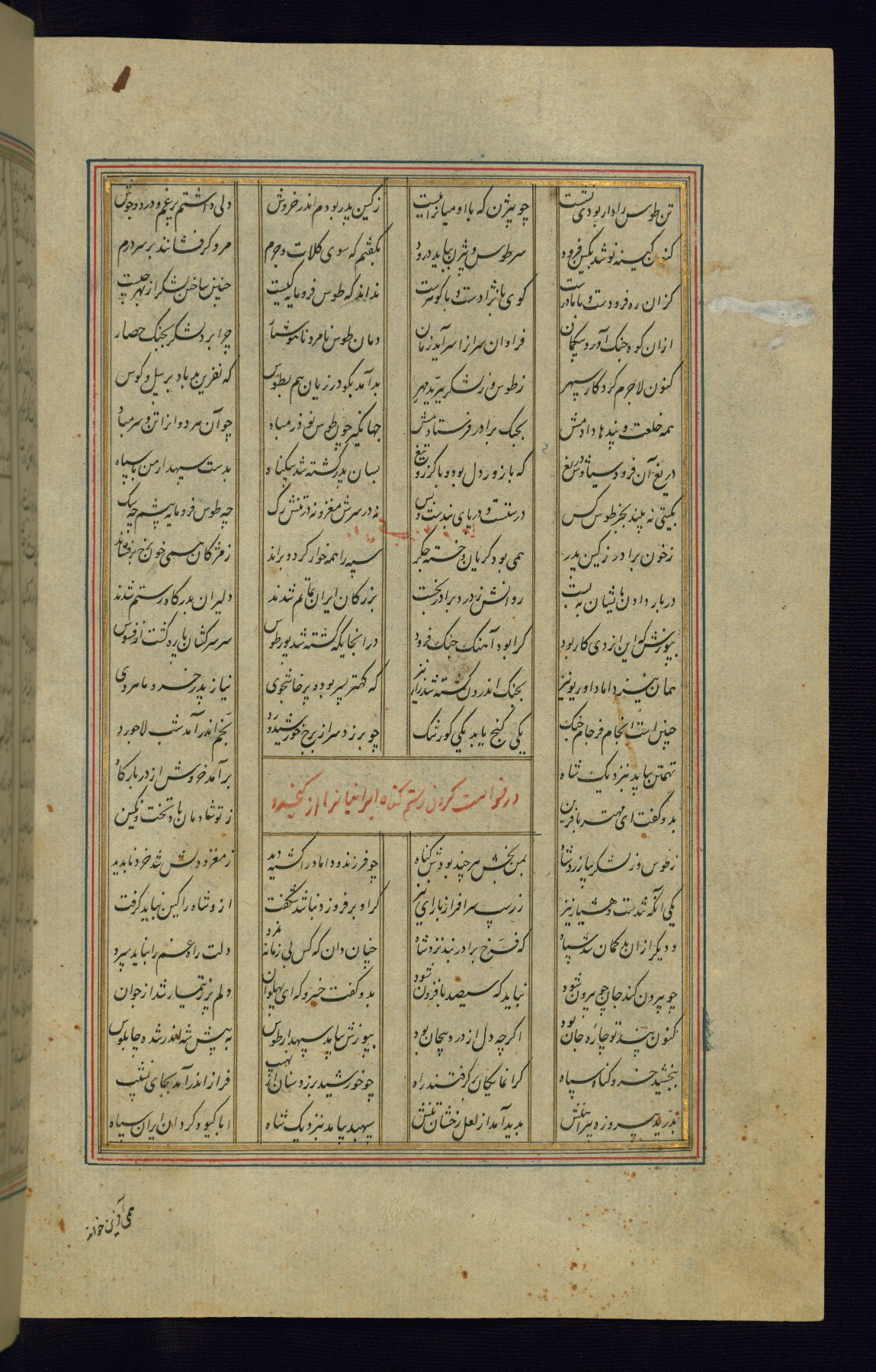 This is an illuminated and illustrated Safavid copy of the Shāhnāmah (Book of kings) by Firdawsī (d. 411 or 416 AH / 1020-5 CE), dated 1028 AH / 1618-9 CE. The text, which is incomplete, begins with the preface (dībāchah), composed on the order of Bāysunghur. It is written in black nastaʿlīq script with chapter/section headings in red. The manuscript contains fourteen illustrations that appear to be later additions, perhaps dating to the 13th century A.H./ 19th century C.E., and may have been executed in India or Iran. The black leather binding is modern.