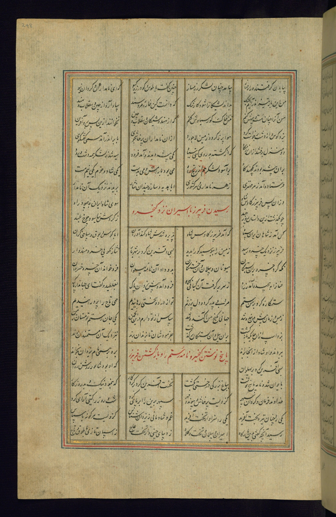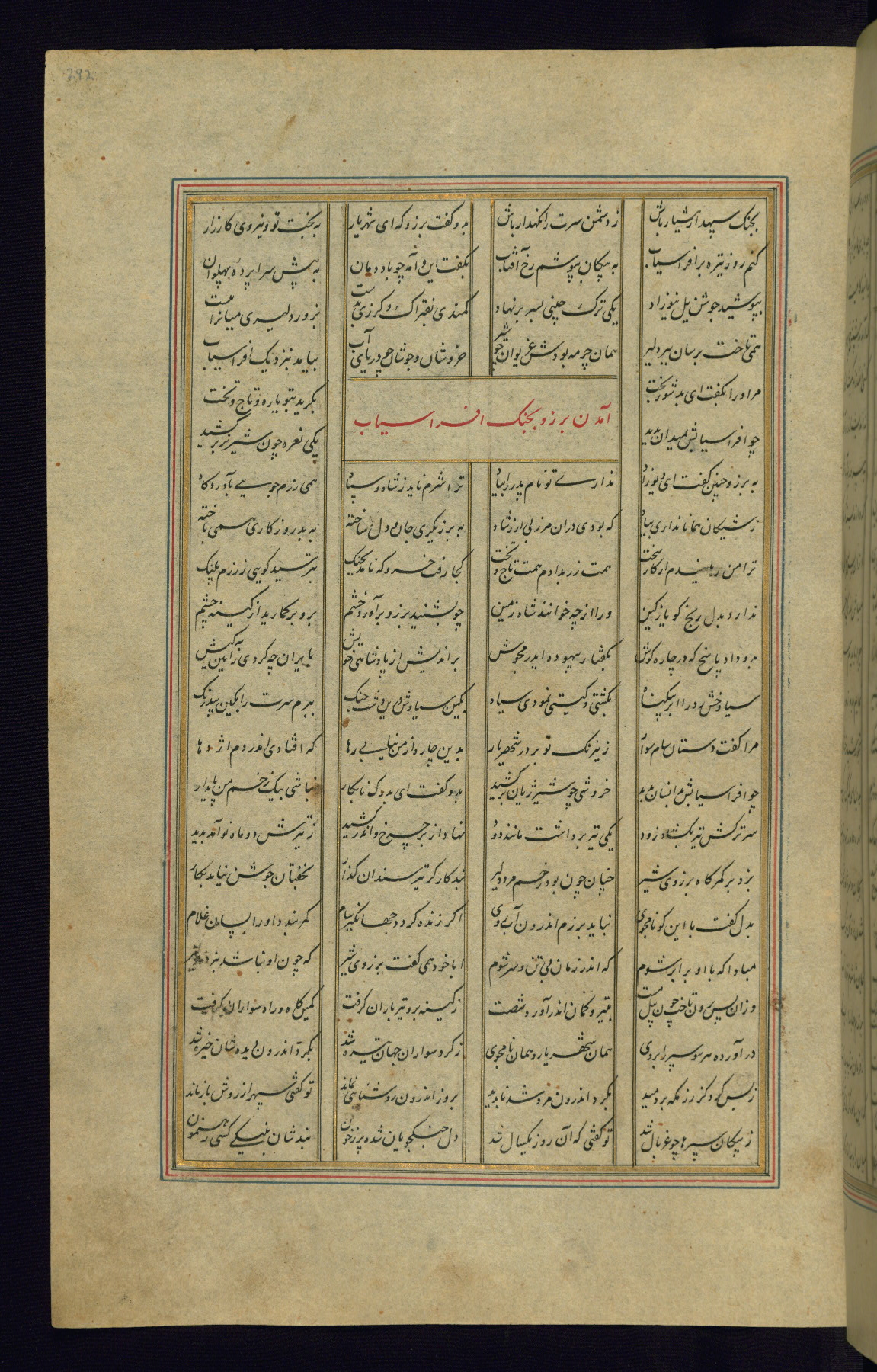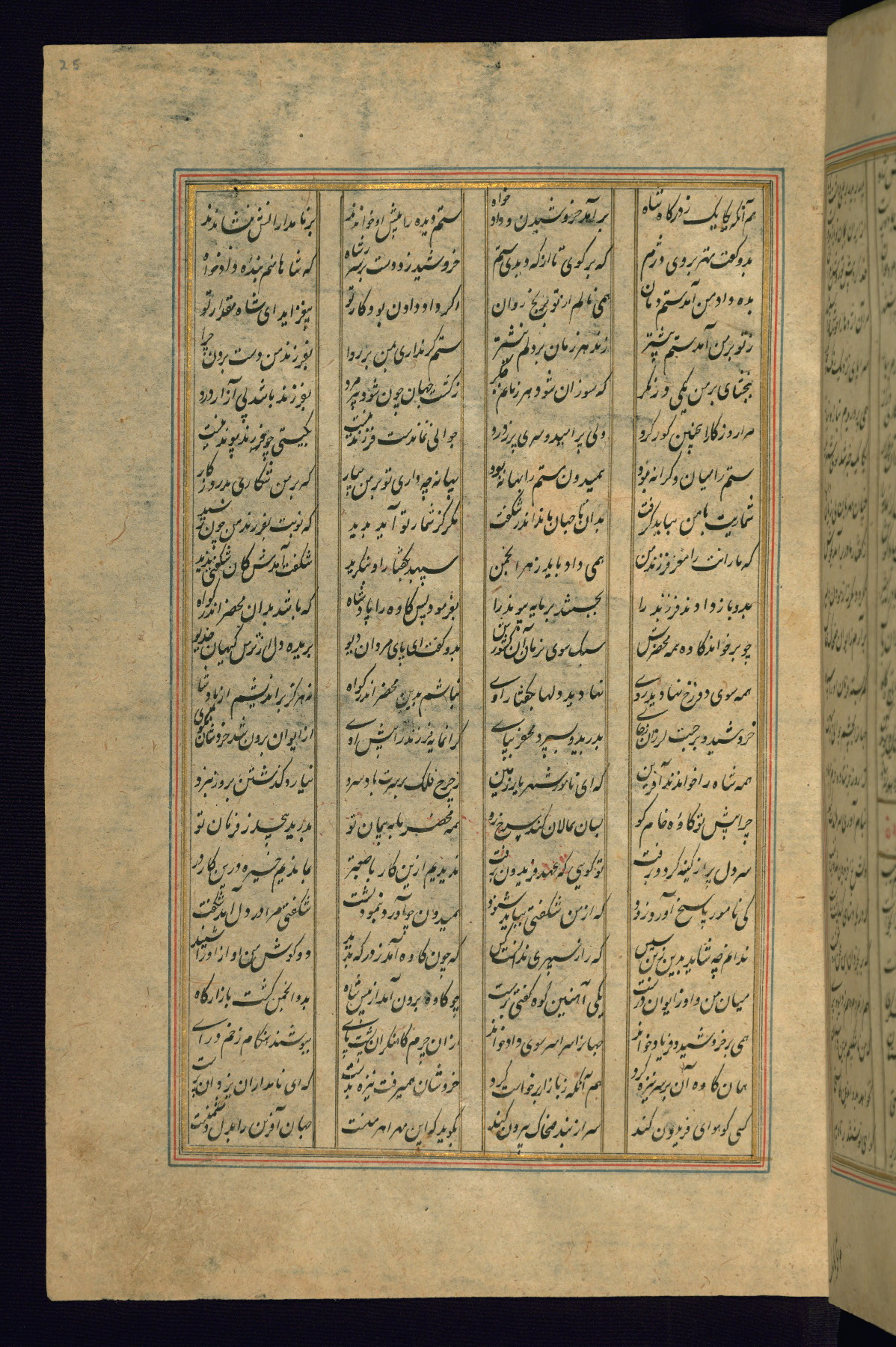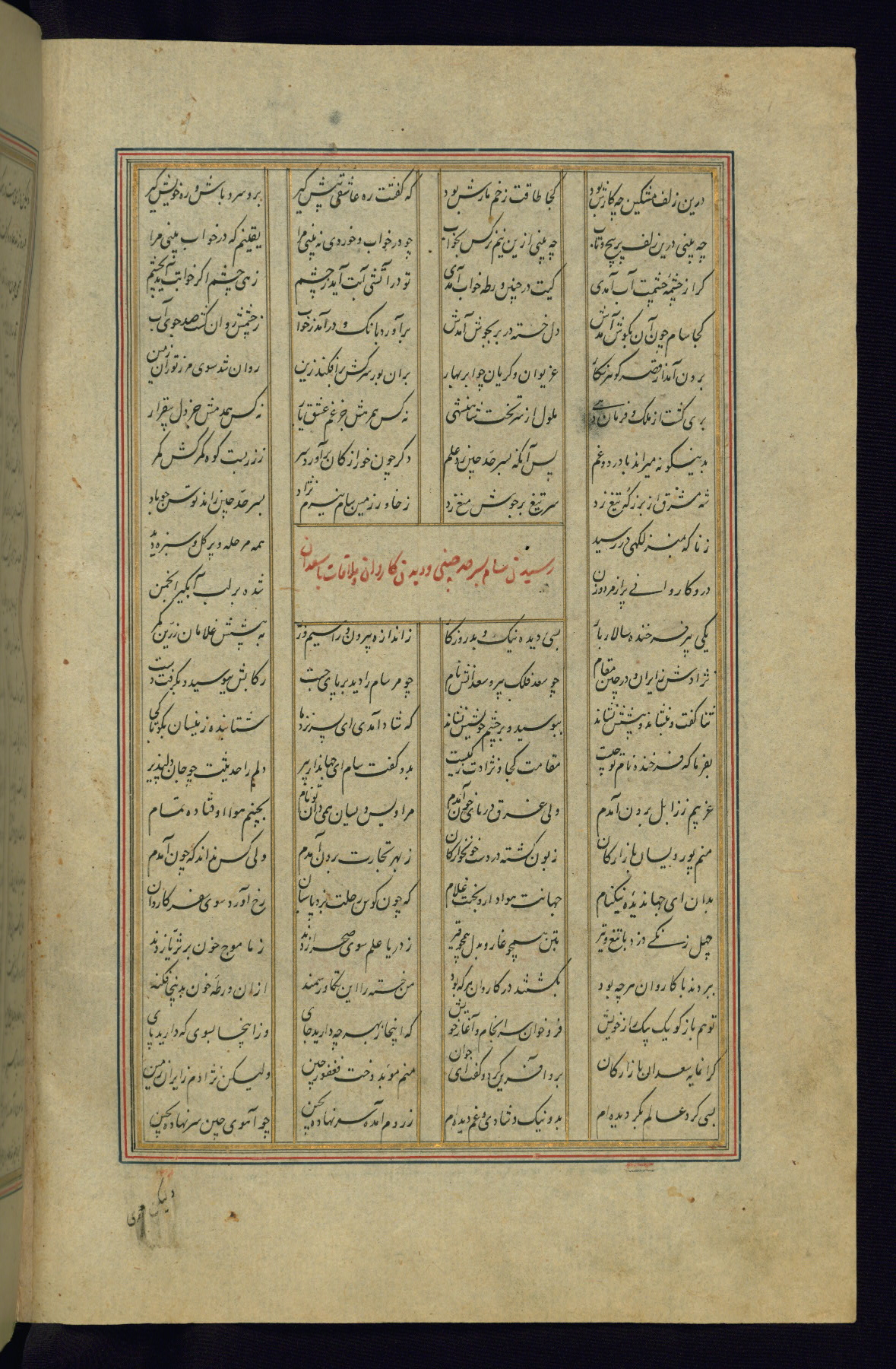 This is an illuminated and illustrated Safavid copy of the Shāhnāmah (Book of kings) by Firdawsī (d. 411 or 416 AH / 1020-5 CE), dated 1028 AH / 1618-9 CE. The text, which is incomplete, begins with the preface (dībāchah), composed on the order of Bāysunghur. It is written in black nastaʿlīq script with chapter/section headings in red. The manuscript contains fourteen illustrations that appear to be later additions, perhaps dating to the 13th century A.H./ 19th century C.E., and may have been executed in India or Iran. The black leather binding is modern.