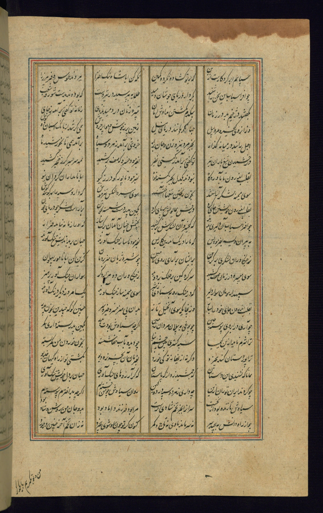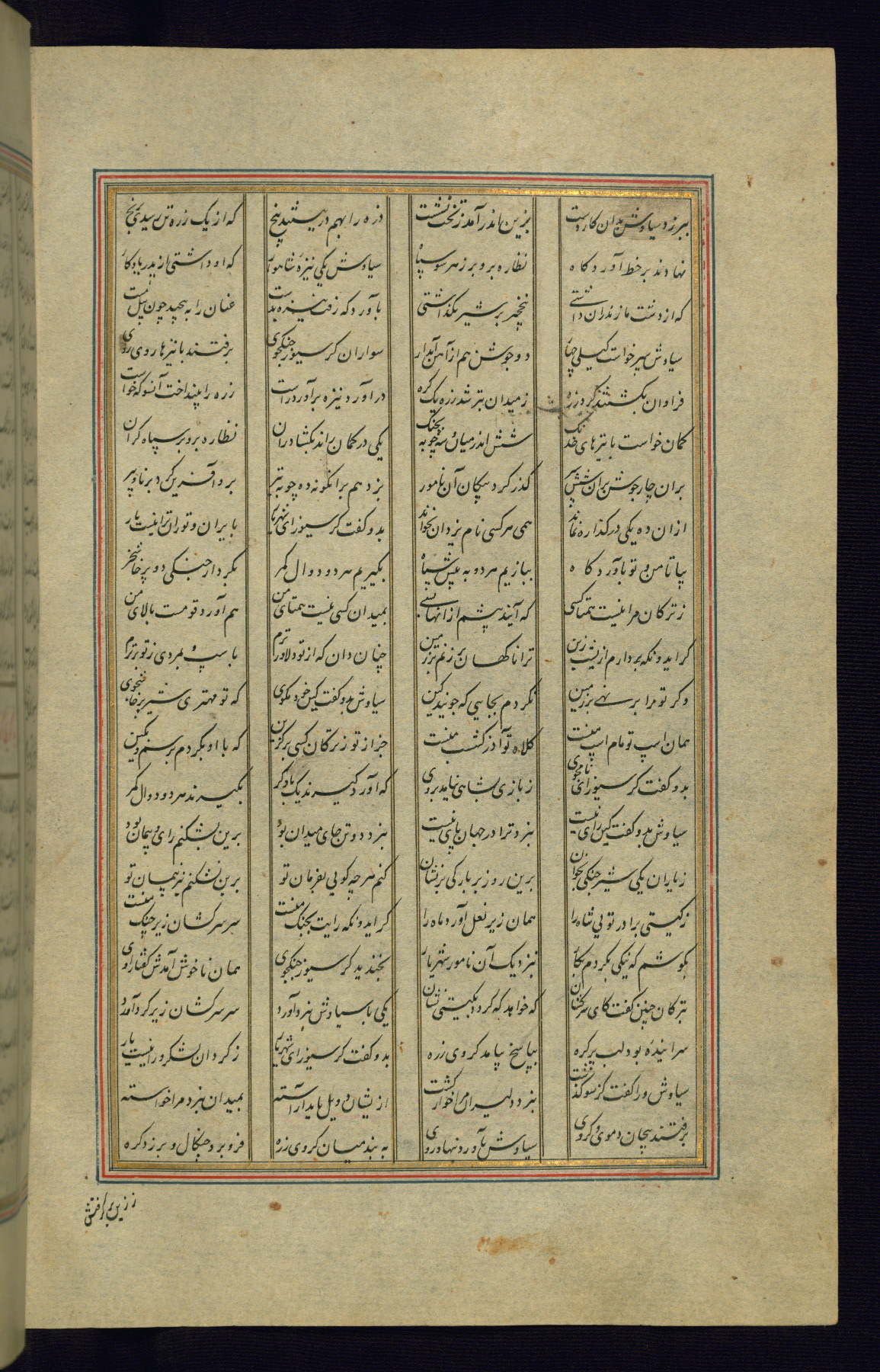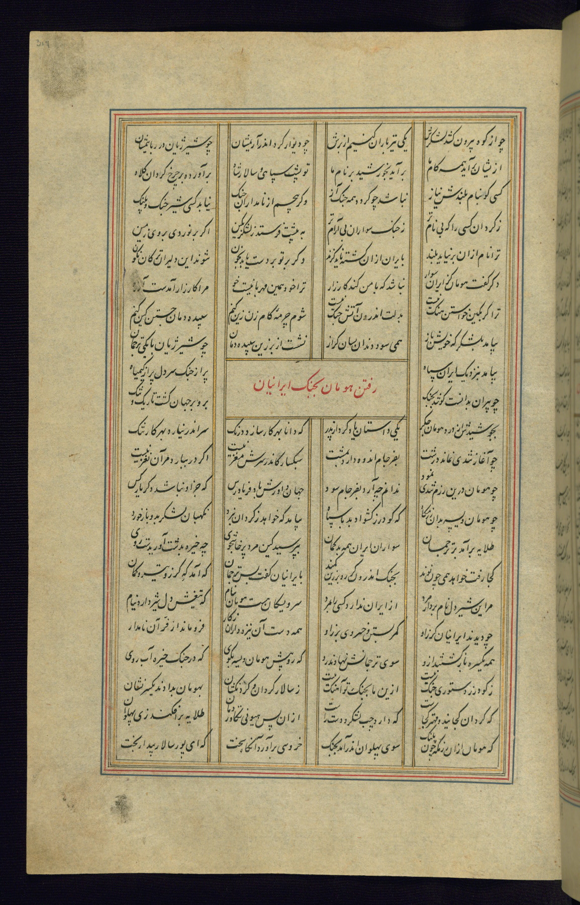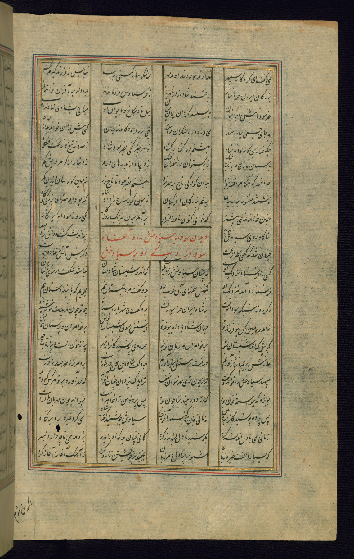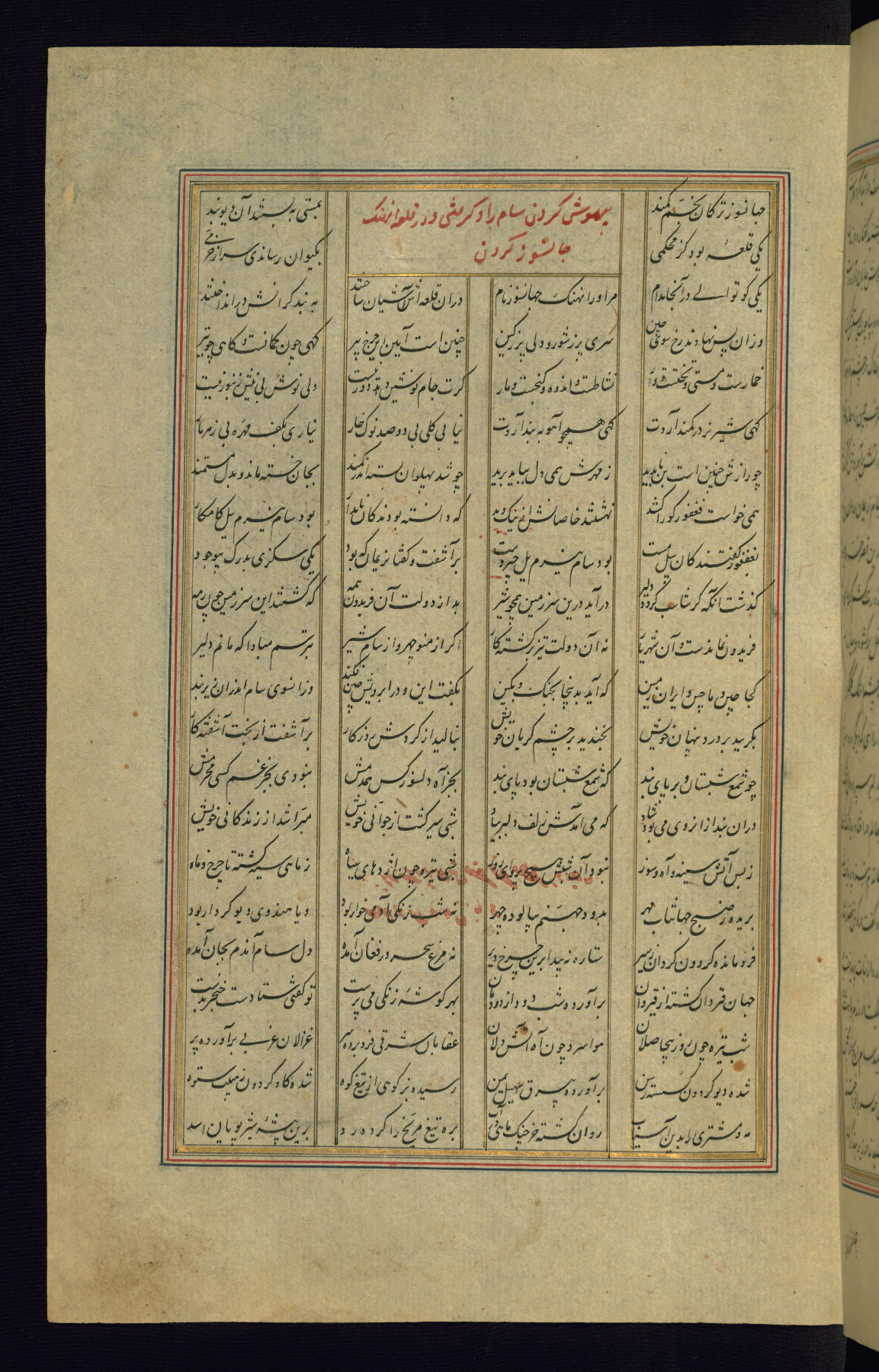 This is an illuminated and illustrated Safavid copy of the Shāhnāmah (Book of kings) by Firdawsī (d. 411 or 416 AH / 1020-5 CE), dated 1028 AH / 1618-9 CE. The text, which is incomplete, begins with the preface (dībāchah), composed on the order of Bāysunghur. It is written in black nastaʿlīq script with chapter/section headings in red. The manuscript contains fourteen illustrations that appear to be later additions, perhaps dating to the 13th century A.H./ 19th century C.E., and may have been executed in India or Iran. The black leather binding is modern.