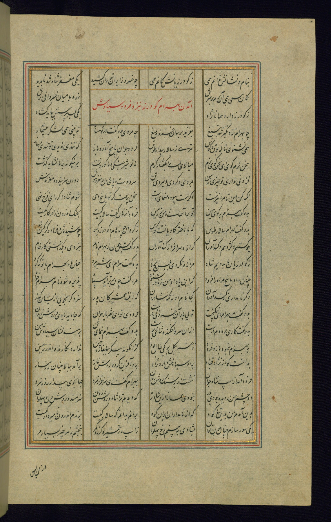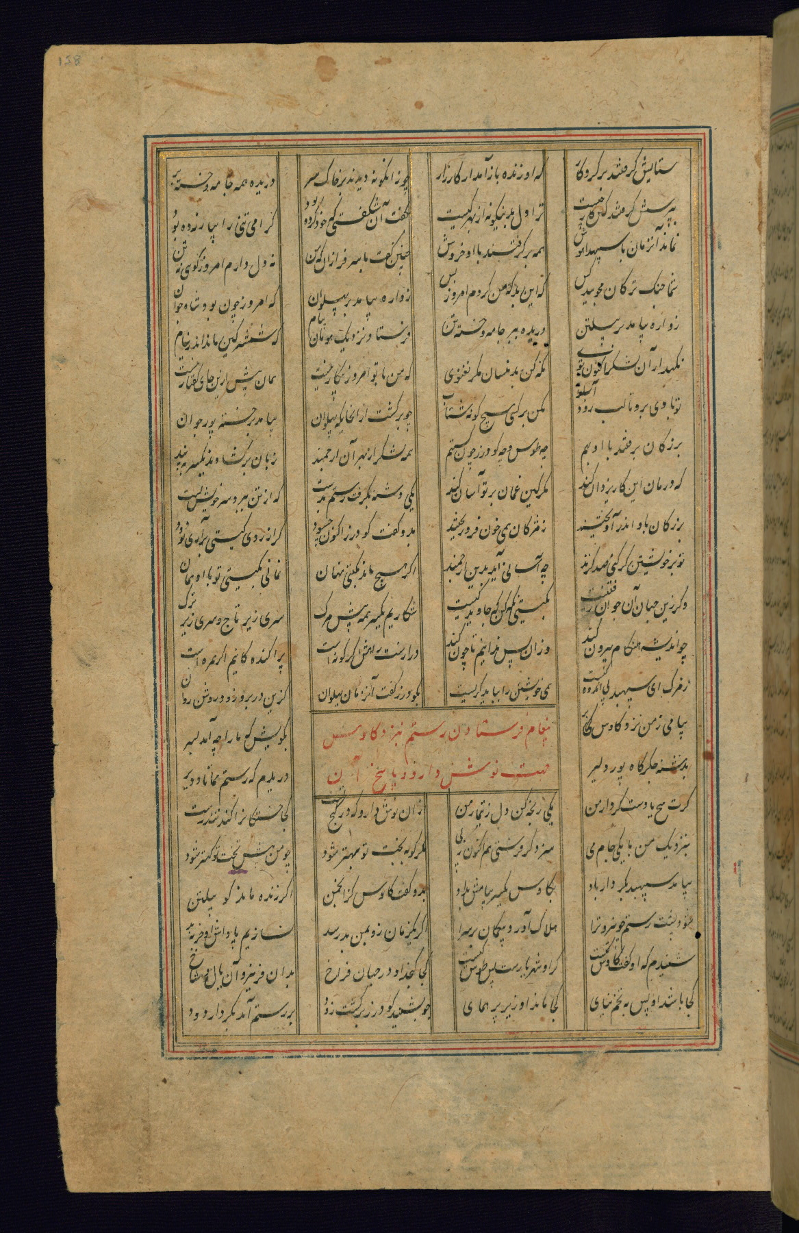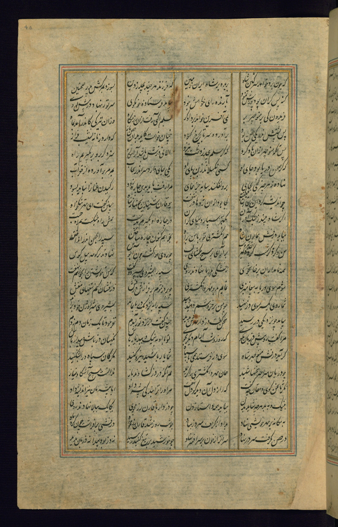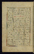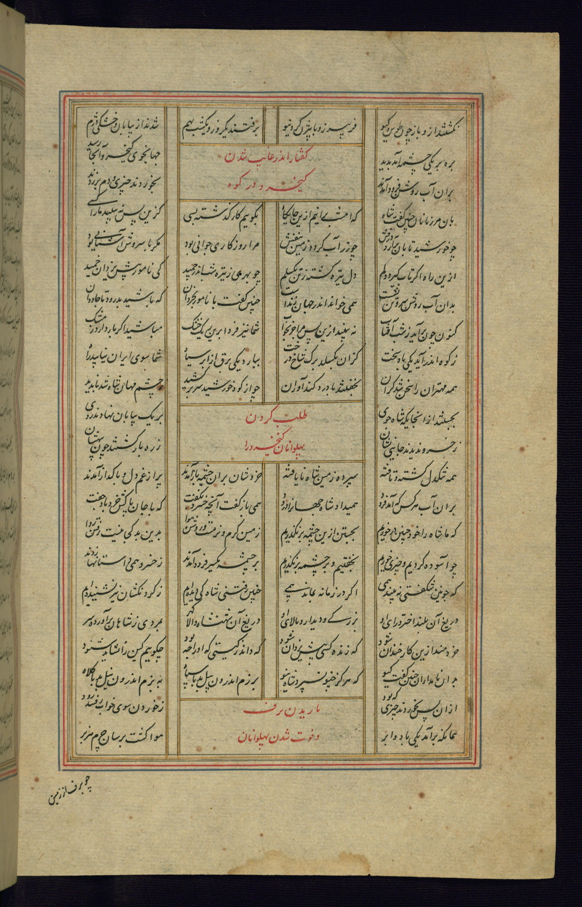 This is an illuminated and illustrated Safavid copy of the Shāhnāmah (Book of kings) by Firdawsī (d. 411 or 416 AH / 1020-5 CE), dated 1028 AH / 1618-9 CE. The text, which is incomplete, begins with the preface (dībāchah), composed on the order of Bāysunghur. It is written in black nastaʿlīq script with chapter/section headings in red. The manuscript contains fourteen illustrations that appear to be later additions, perhaps dating to the 13th century A.H./ 19th century C.E., and may have been executed in India or Iran. The black leather binding is modern.