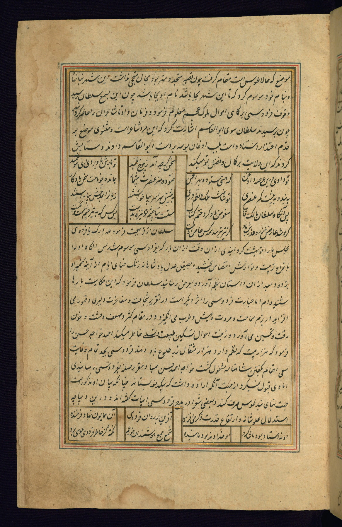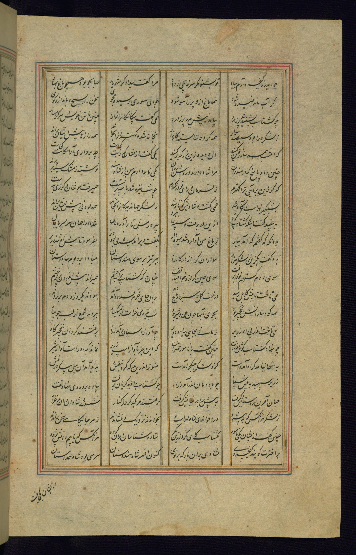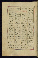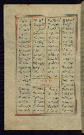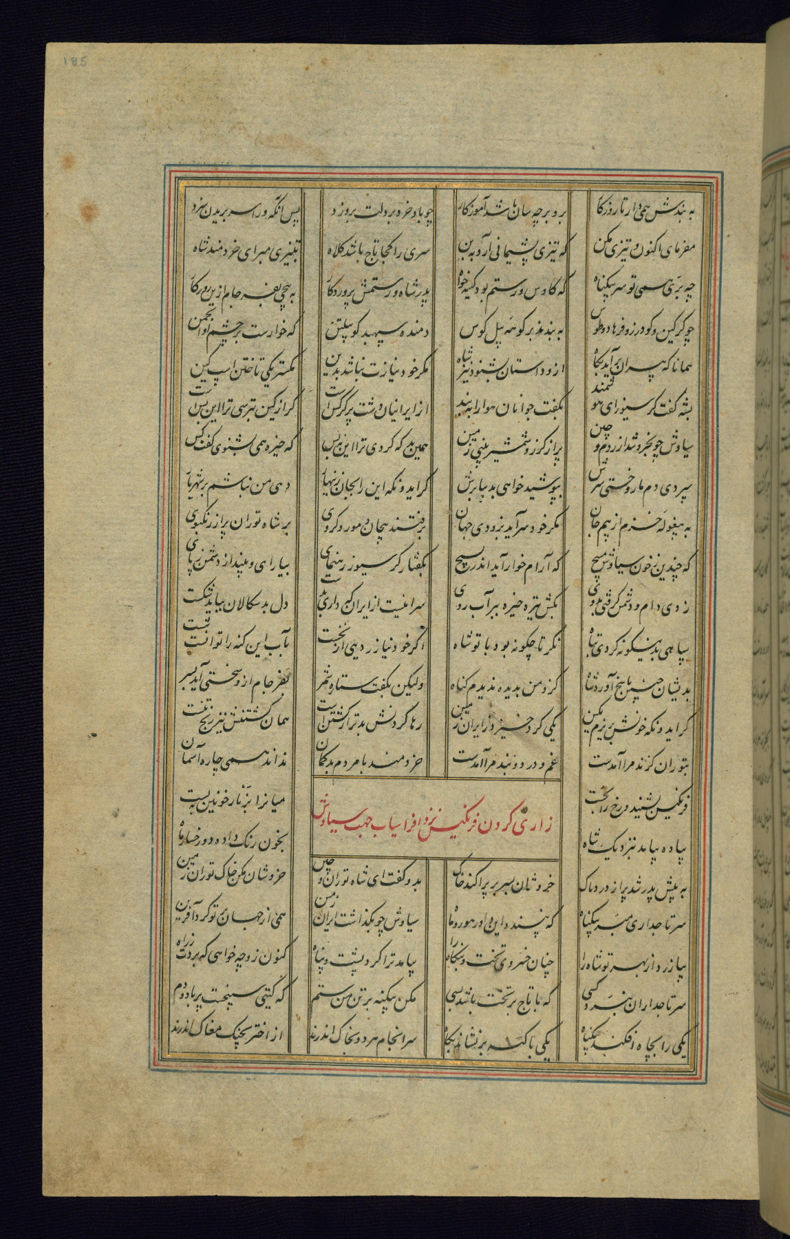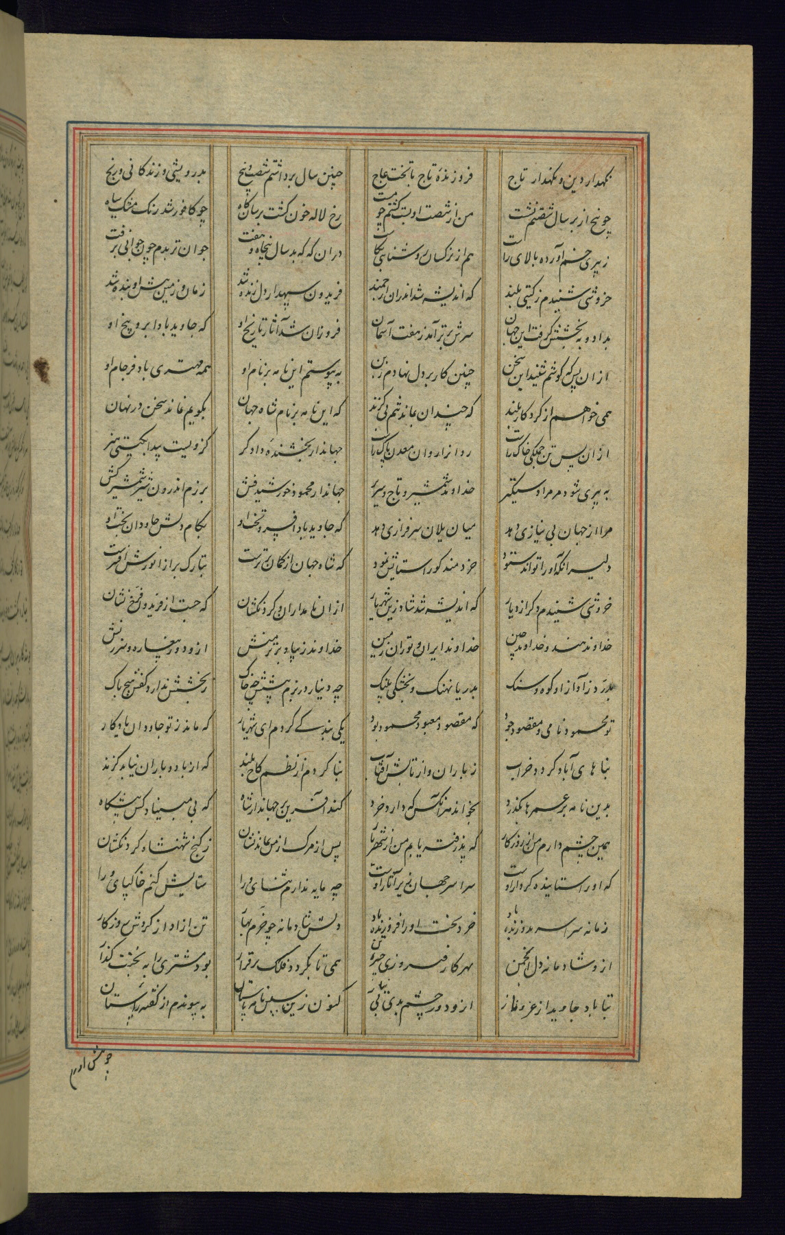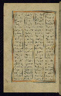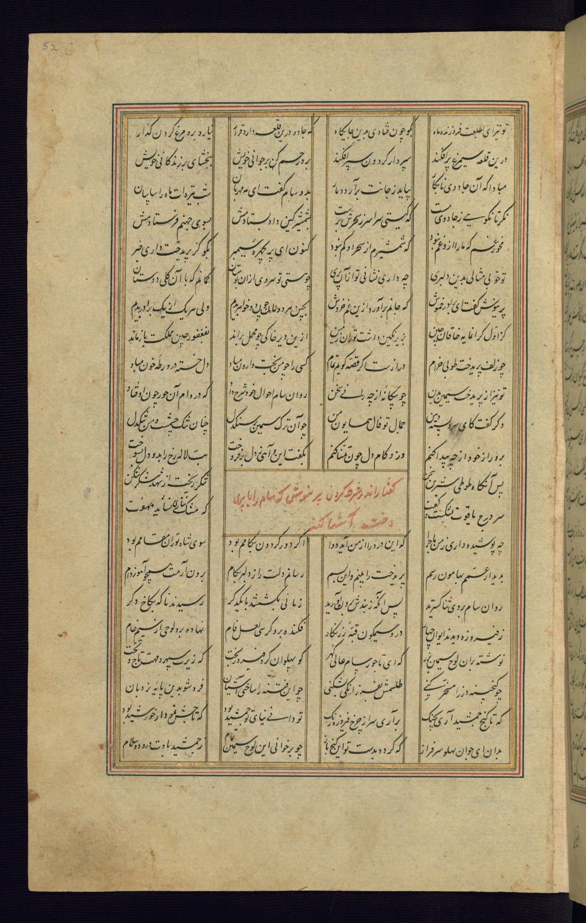 This is an illuminated and illustrated Safavid copy of the Shāhnāmah (Book of kings) by Firdawsī (d. 411 or 416 AH / 1020-5 CE), dated 1028 AH / 1618-9 CE. The text, which is incomplete, begins with the preface (dībāchah), composed on the order of Bāysunghur. It is written in black nastaʿlīq script with chapter/section headings in red. The manuscript contains fourteen illustrations that appear to be later additions, perhaps dating to the 13th century A.H./ 19th century C.E., and may have been executed in India or Iran. The black leather binding is modern.