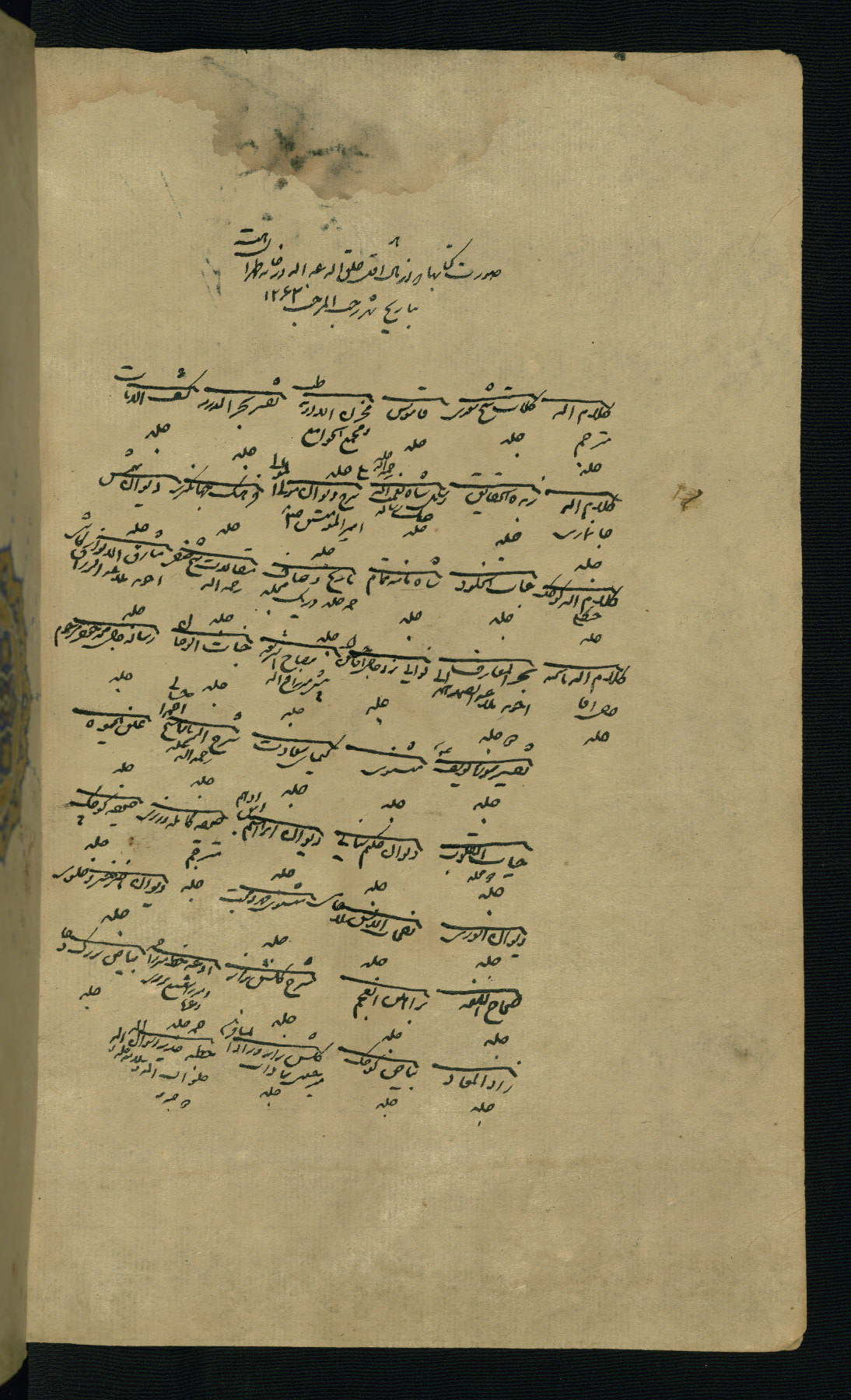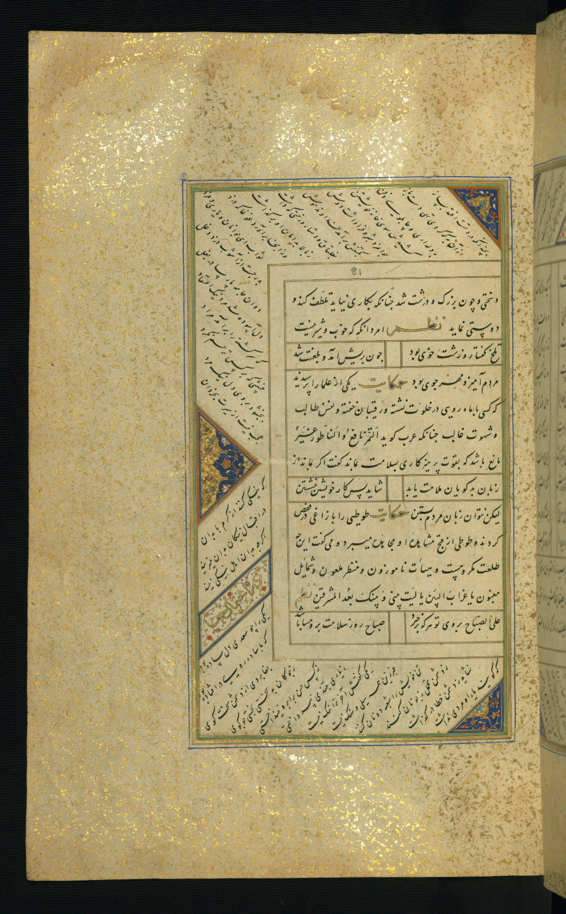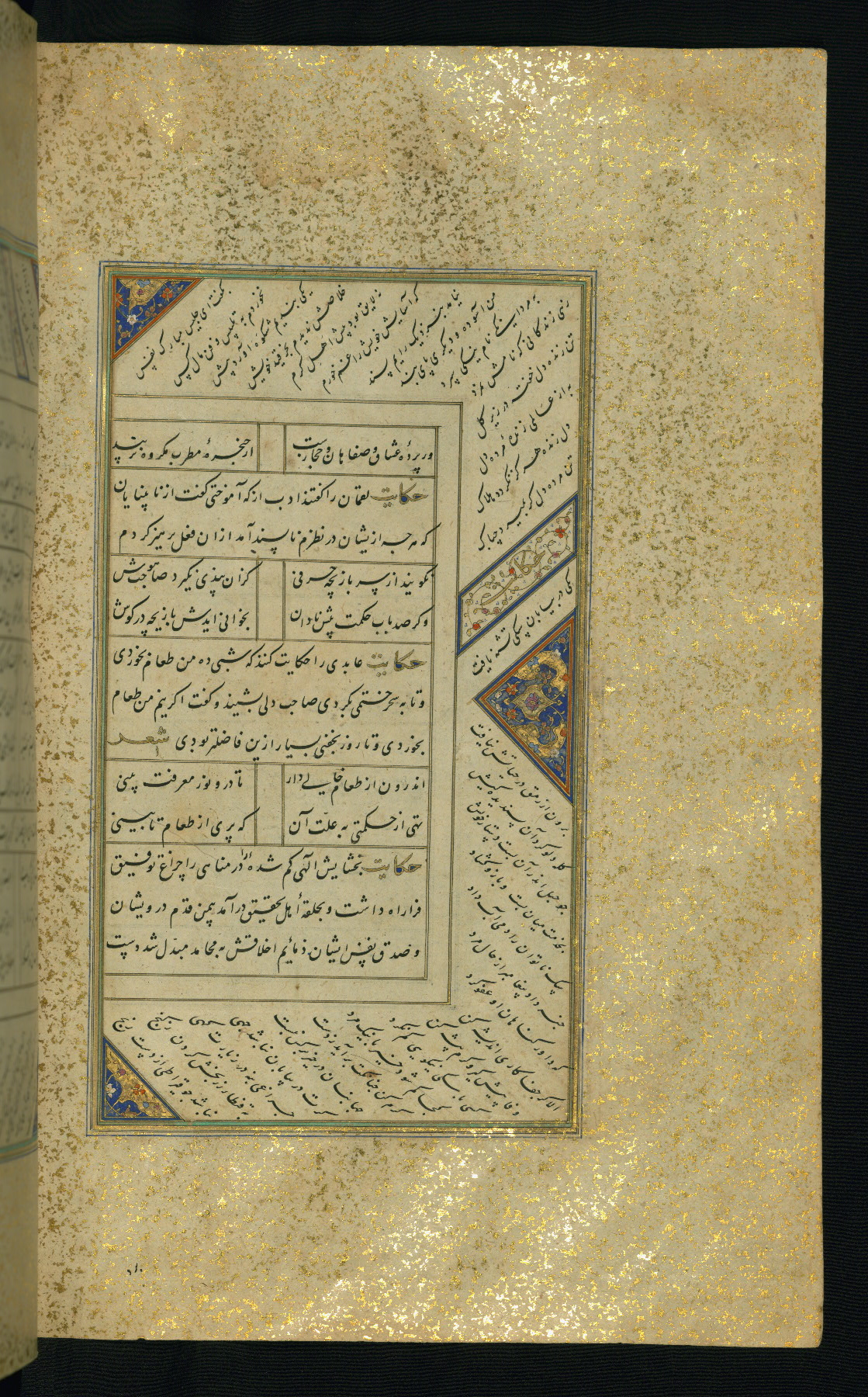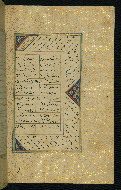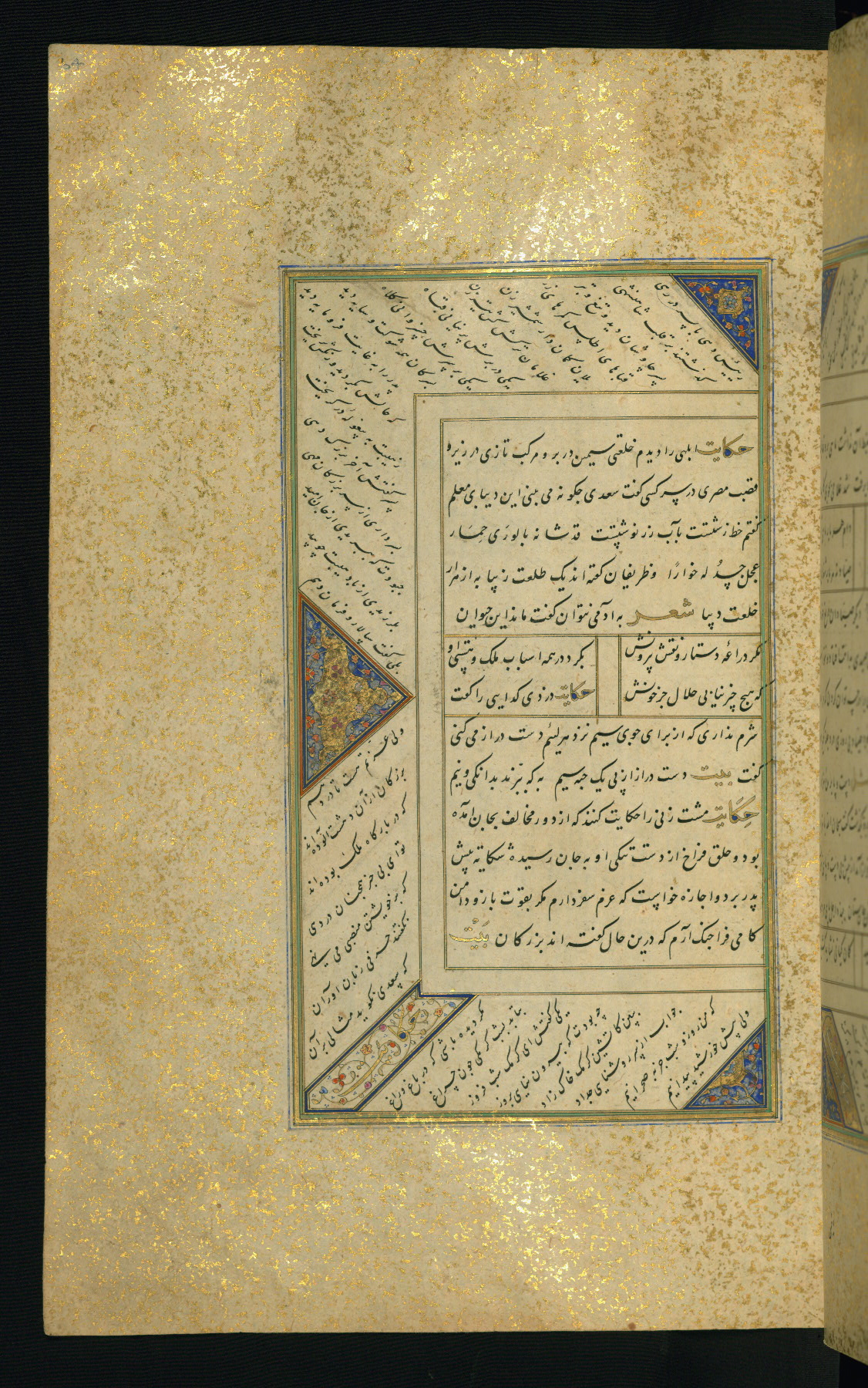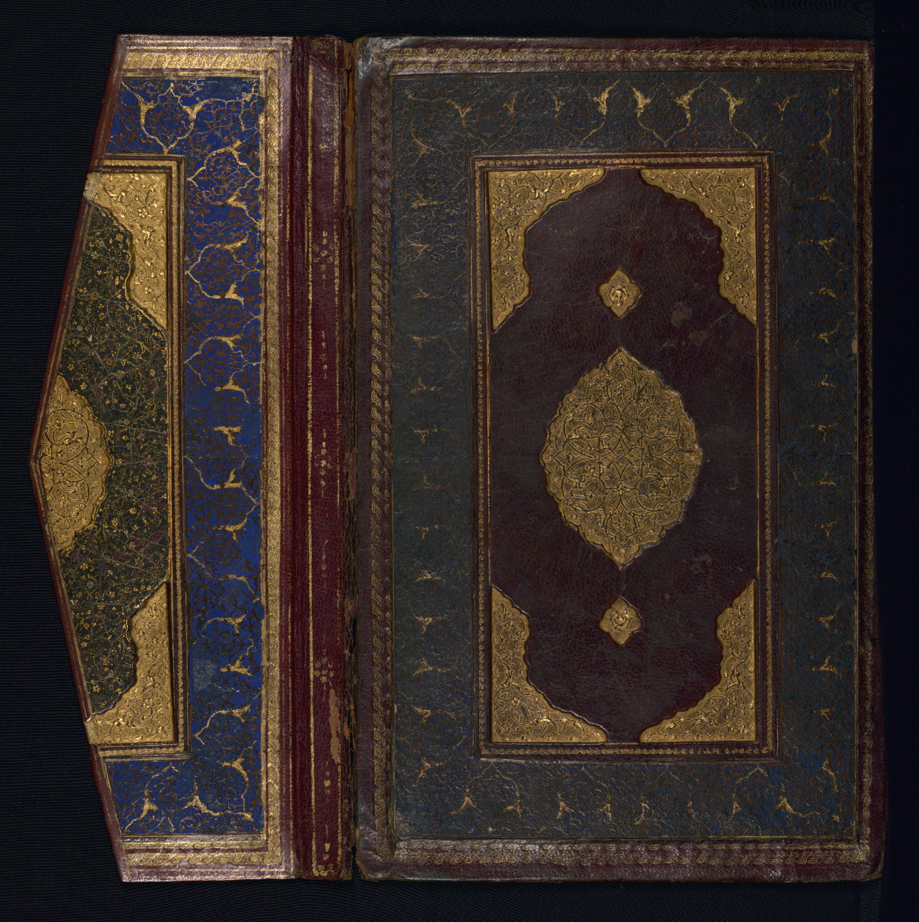 This is an illuminated and illustrated Safavid copy of the collected works (Kulliyāt) of Saʿdī (d. 691 AH / 1292 CE). It was written by ʿAbd Allāh ibn Shaykh Murshid al-Kātib in the tenth century AH / sixteenth CE. The manuscript opens with an illuminated medallion (fol. 2a), followed by a double-page illustrated frontispeice (fols. 2b-3a) and a double-page illuminated frontispiece (fols. 3b-4a). The text is illustrated with seven additional paintings (fols. 18a, 31b, 49b, 70b, 88a, 101a, and 106b). The brown leather binding is incorrectly bound with the flap appearing on the right side instead of the left.