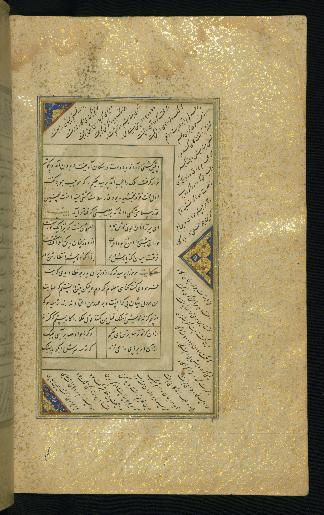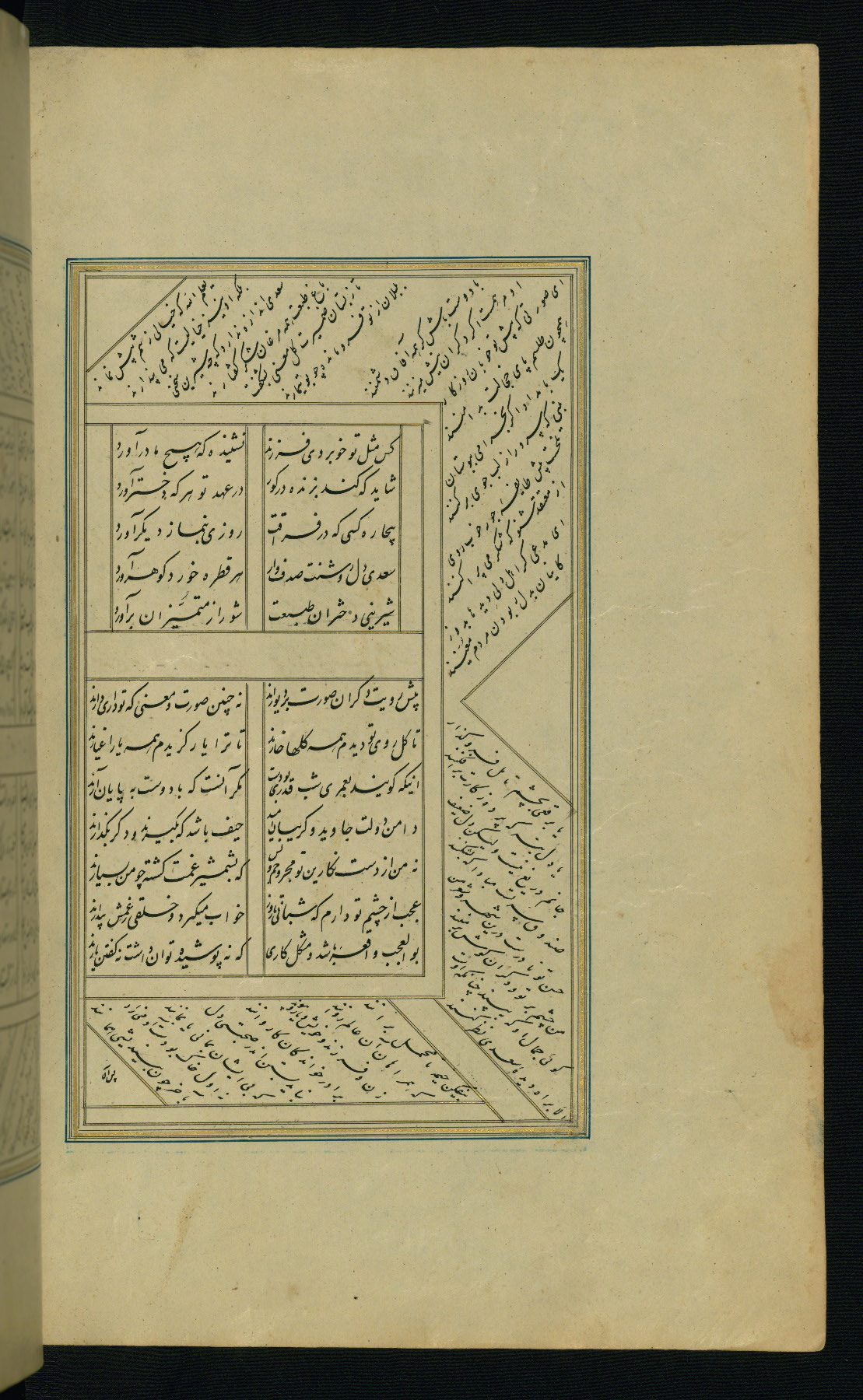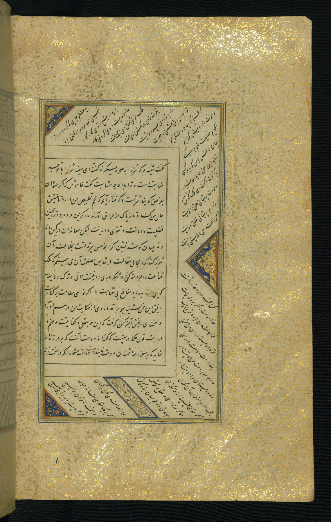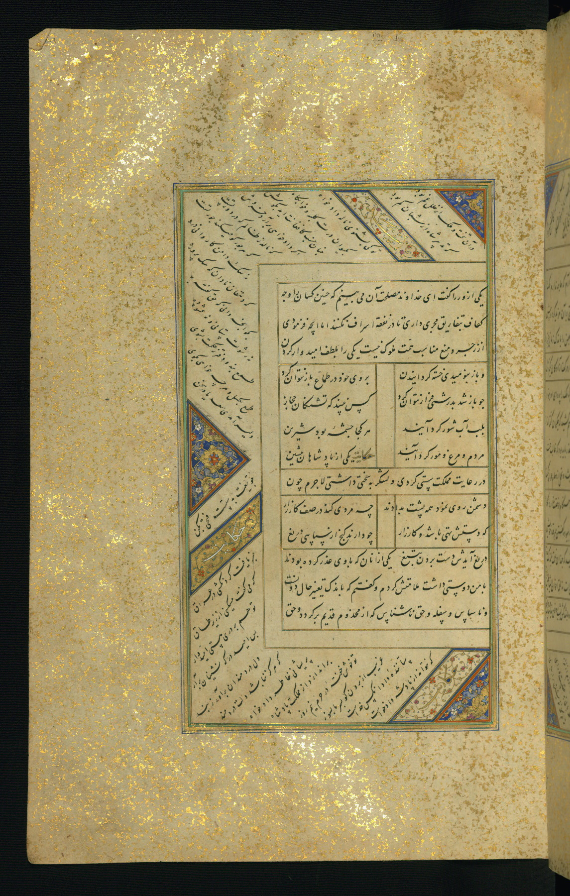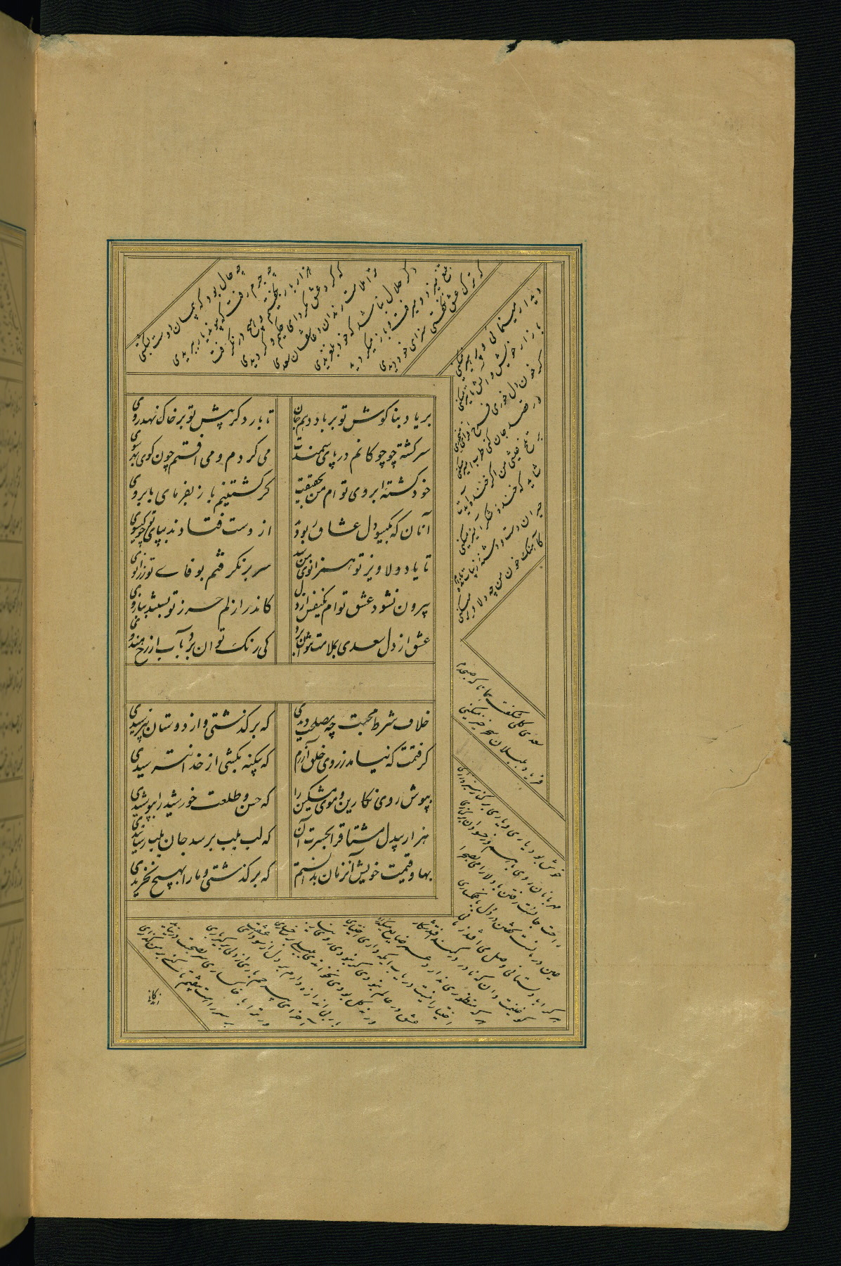 This is an illuminated and illustrated Safavid copy of the collected works (Kulliyāt) of Saʿdī (d. 691 AH / 1292 CE). It was written by ʿAbd Allāh ibn Shaykh Murshid al-Kātib in the tenth century AH / sixteenth CE. The manuscript opens with an illuminated medallion (fol. 2a), followed by a double-page illustrated frontispeice (fols. 2b-3a) and a double-page illuminated frontispiece (fols. 3b-4a). The text is illustrated with seven additional paintings (fols. 18a, 31b, 49b, 70b, 88a, 101a, and 106b). The brown leather binding is incorrectly bound with the flap appearing on the right side instead of the left.