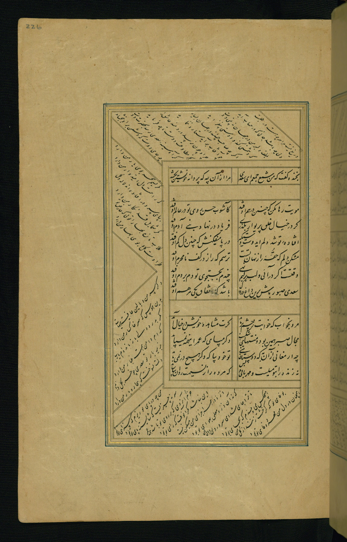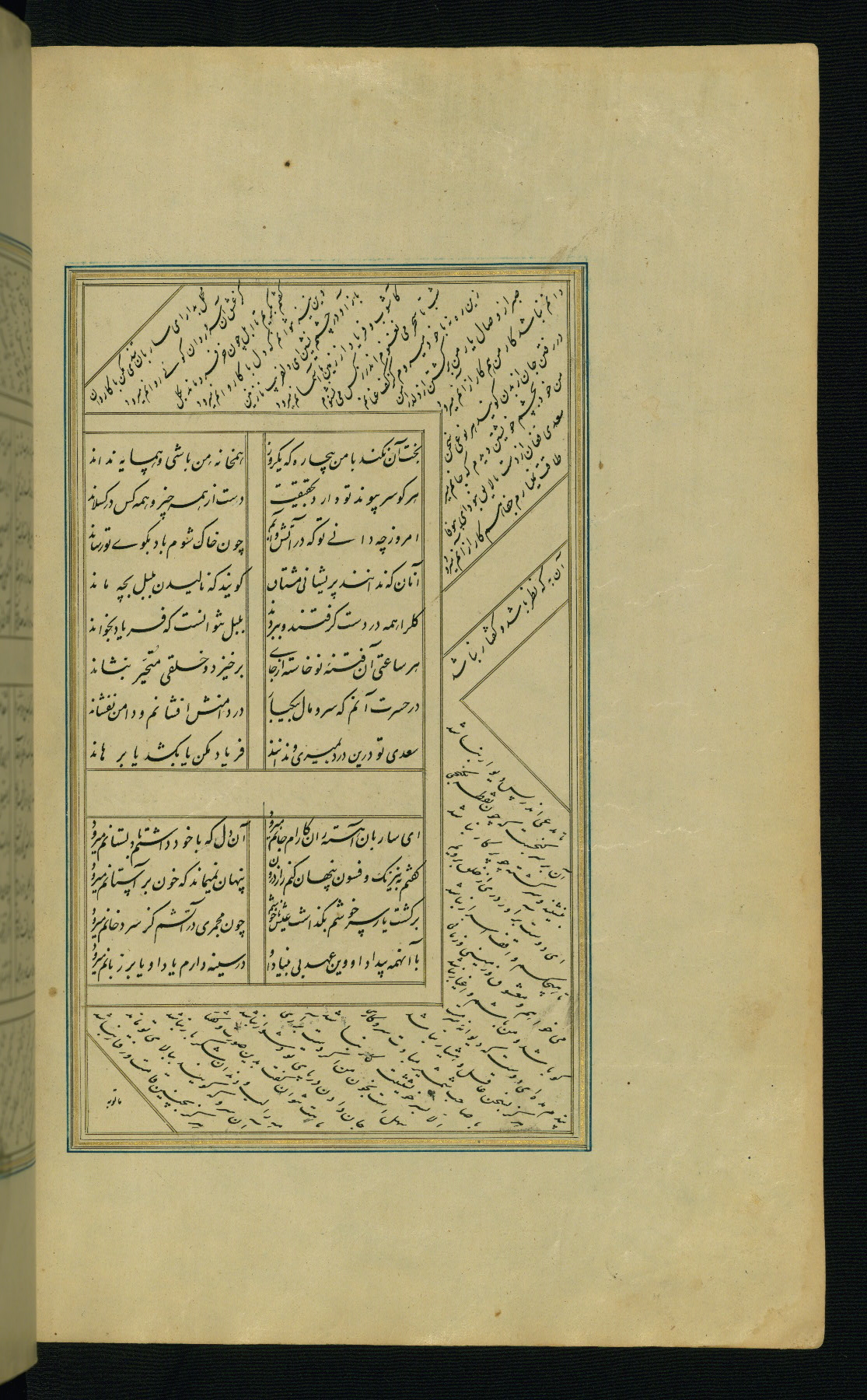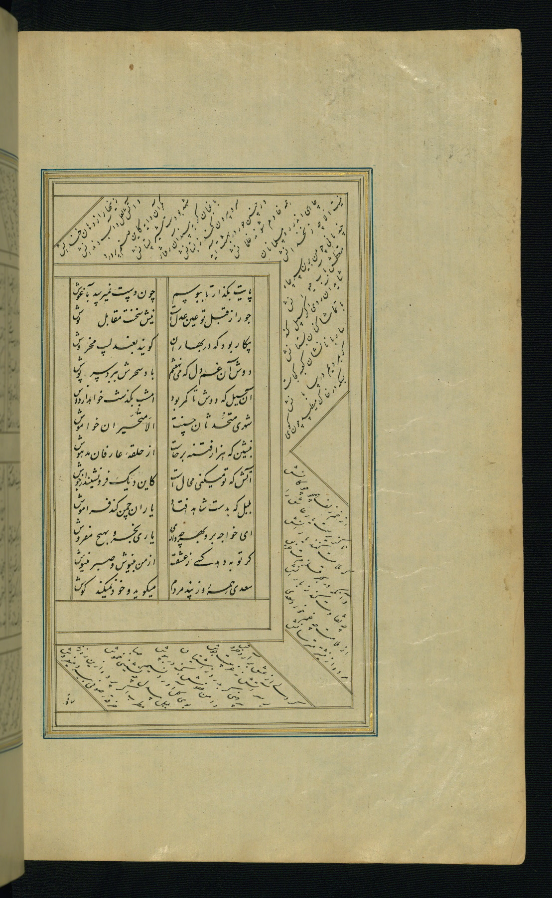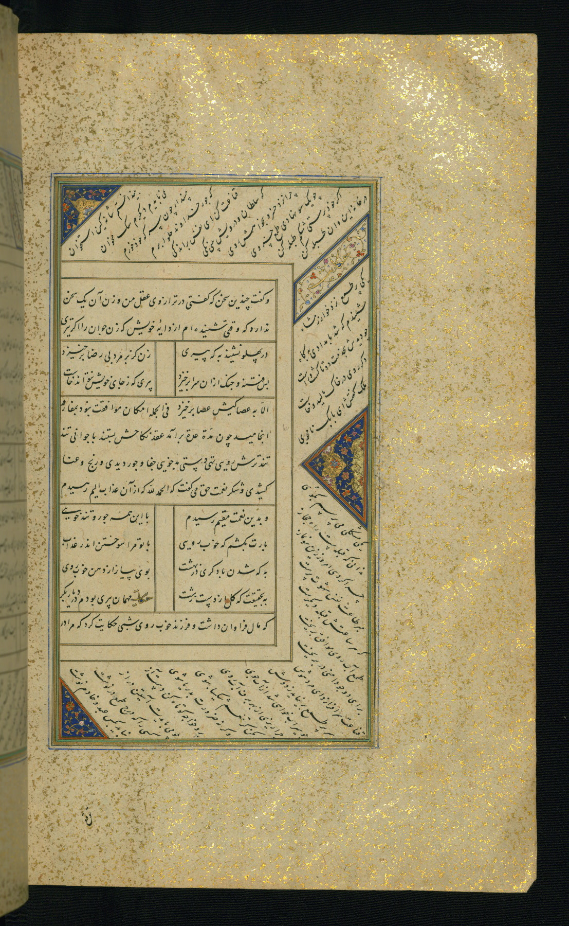 This is an illuminated and illustrated Safavid copy of the collected works (Kulliyāt) of Saʿdī (d. 691 AH / 1292 CE). It was written by ʿAbd Allāh ibn Shaykh Murshid al-Kātib in the tenth century AH / sixteenth CE. The manuscript opens with an illuminated medallion (fol. 2a), followed by a double-page illustrated frontispeice (fols. 2b-3a) and a double-page illuminated frontispiece (fols. 3b-4a). The text is illustrated with seven additional paintings (fols. 18a, 31b, 49b, 70b, 88a, 101a, and 106b). The brown leather binding is incorrectly bound with the flap appearing on the right side instead of the left.