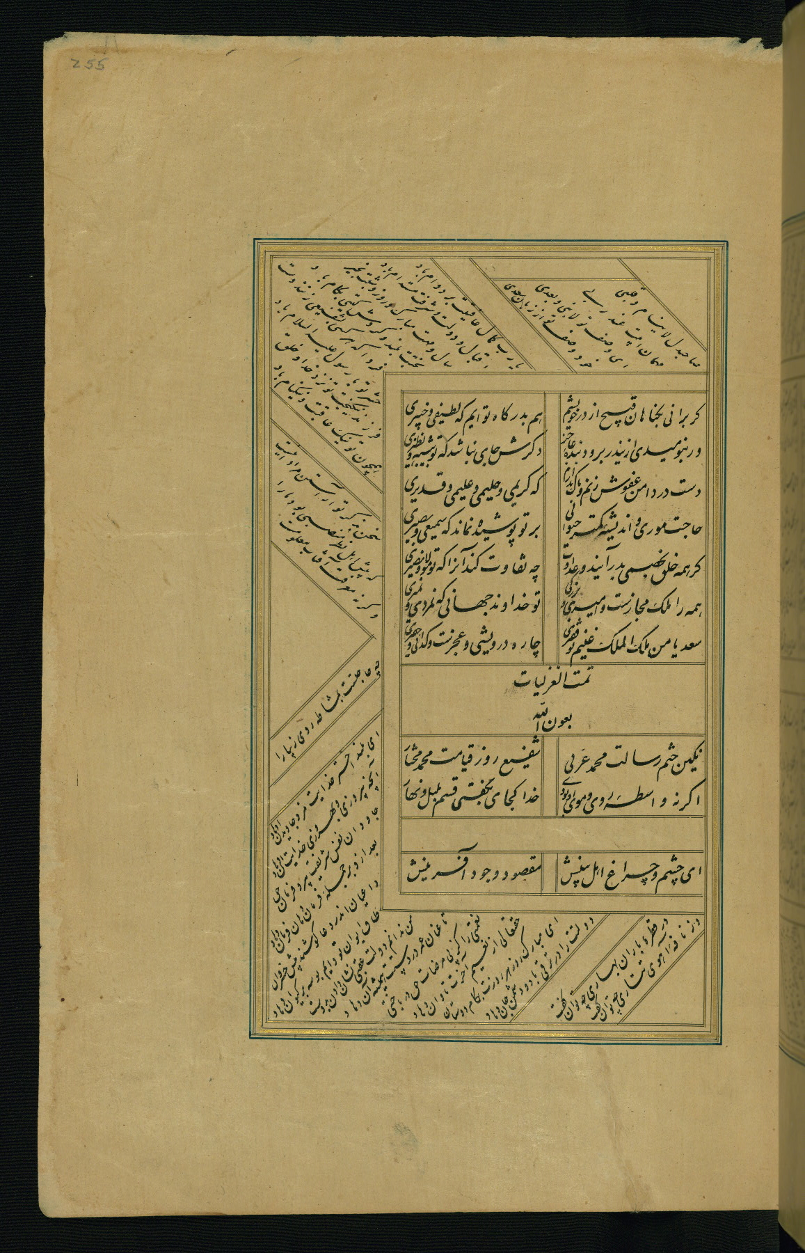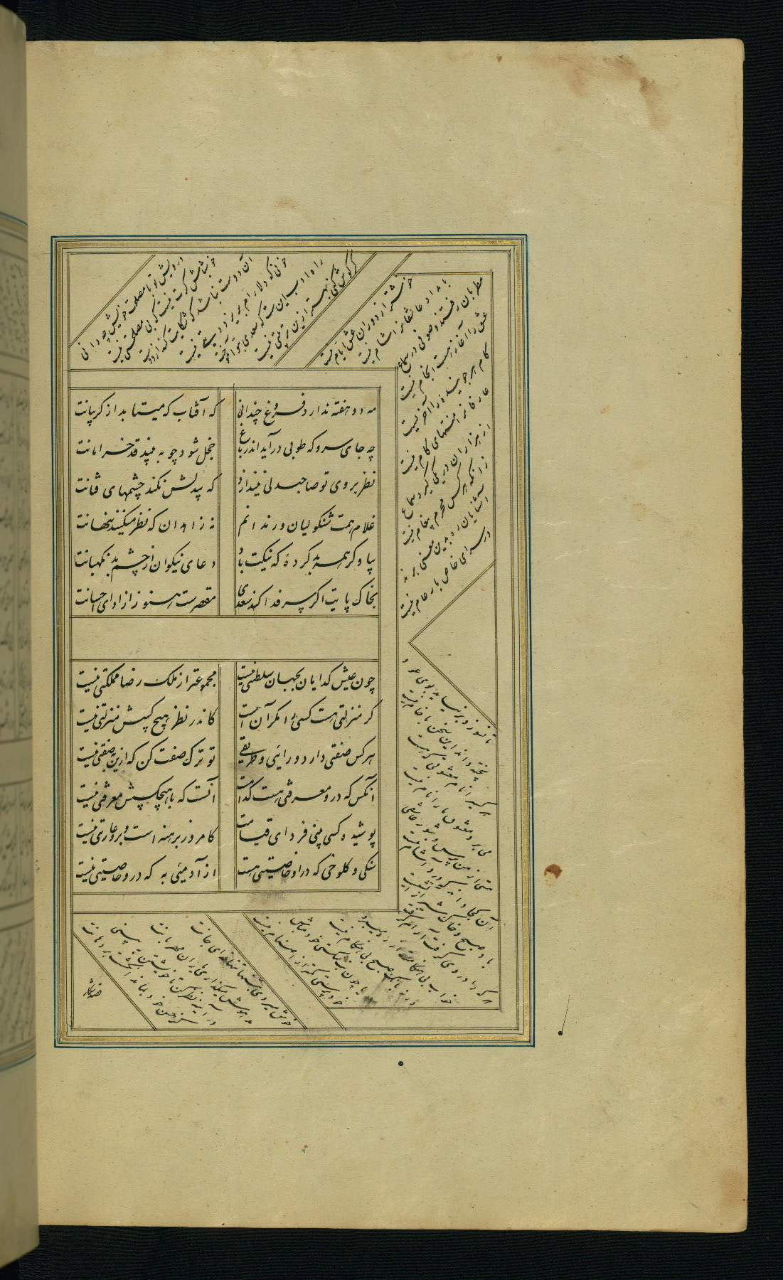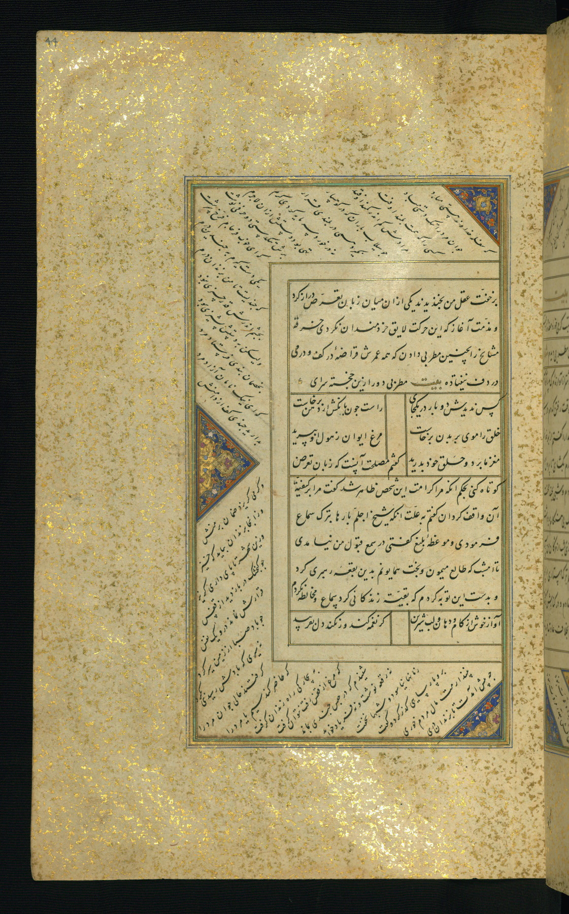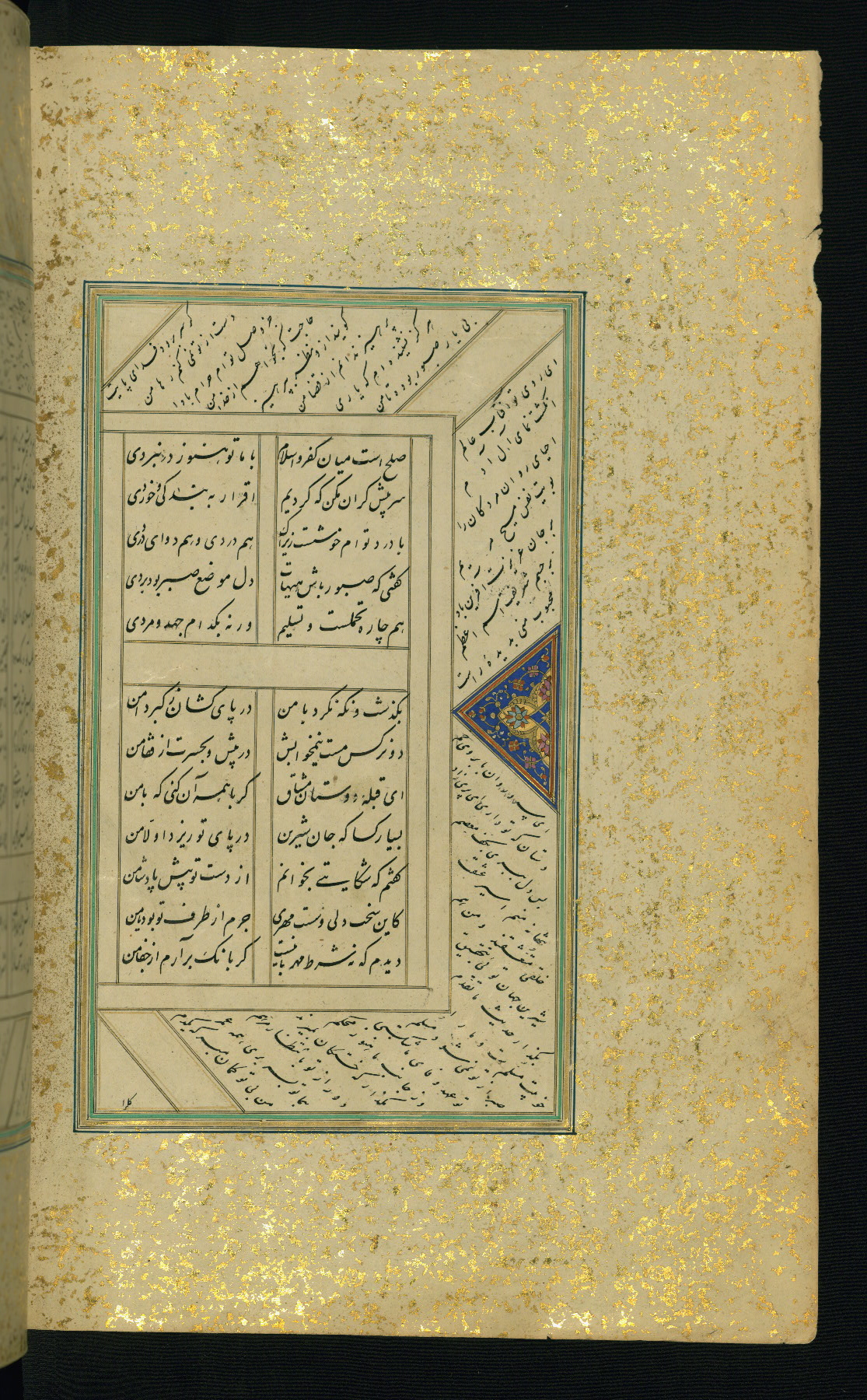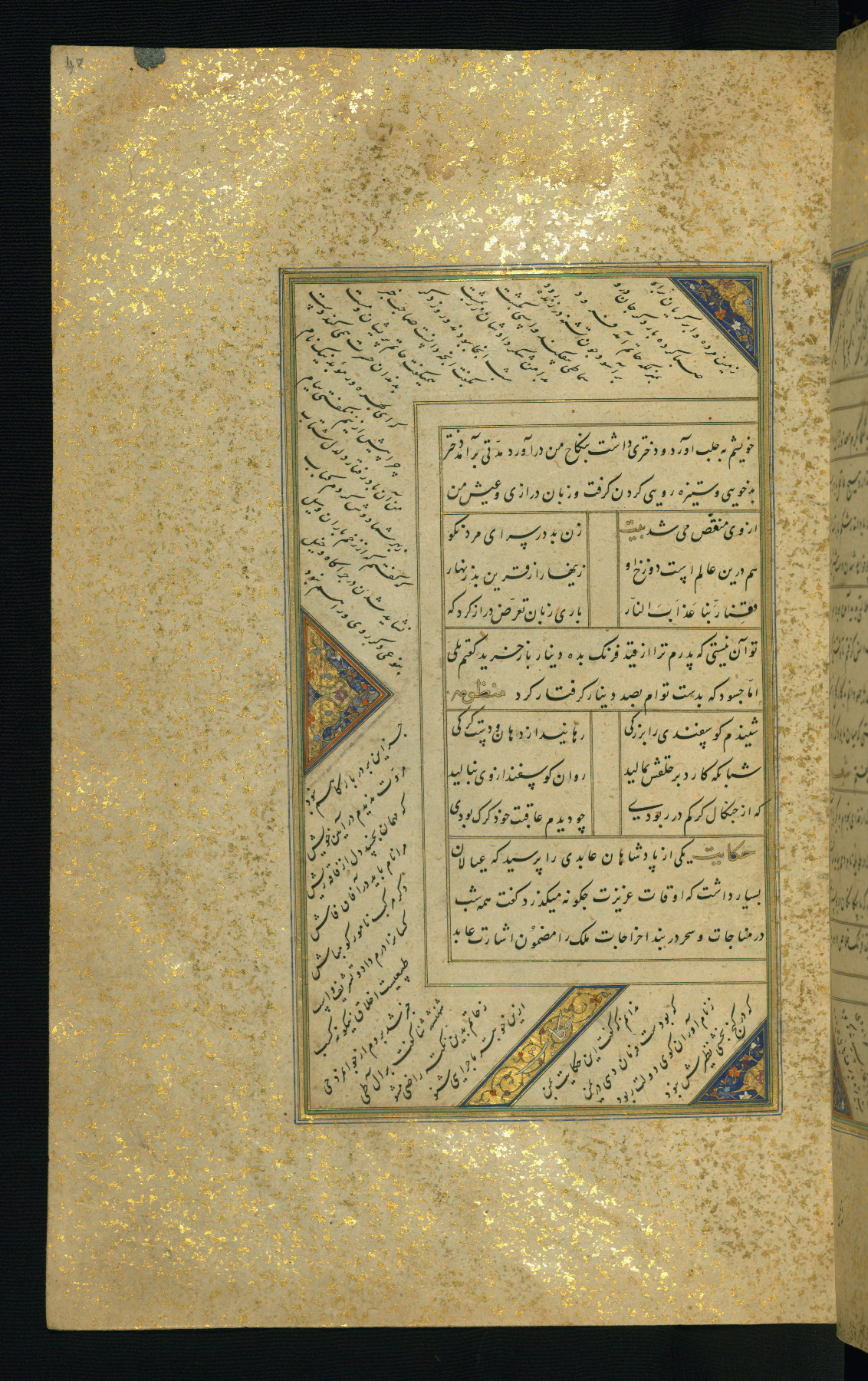 This is an illuminated and illustrated Safavid copy of the collected works (Kulliyāt) of Saʿdī (d. 691 AH / 1292 CE). It was written by ʿAbd Allāh ibn Shaykh Murshid al-Kātib in the tenth century AH / sixteenth CE. The manuscript opens with an illuminated medallion (fol. 2a), followed by a double-page illustrated frontispeice (fols. 2b-3a) and a double-page illuminated frontispiece (fols. 3b-4a). The text is illustrated with seven additional paintings (fols. 18a, 31b, 49b, 70b, 88a, 101a, and 106b). The brown leather binding is incorrectly bound with the flap appearing on the right side instead of the left.
